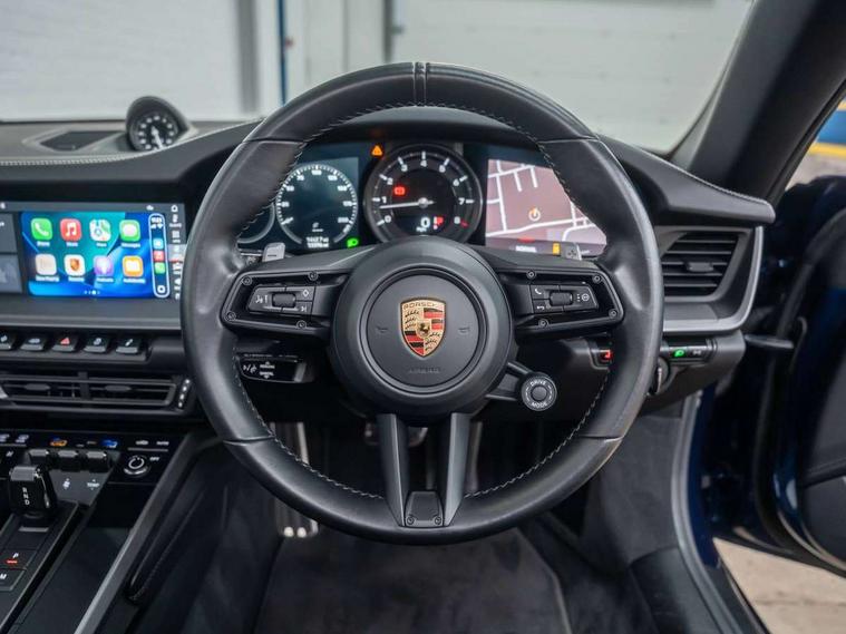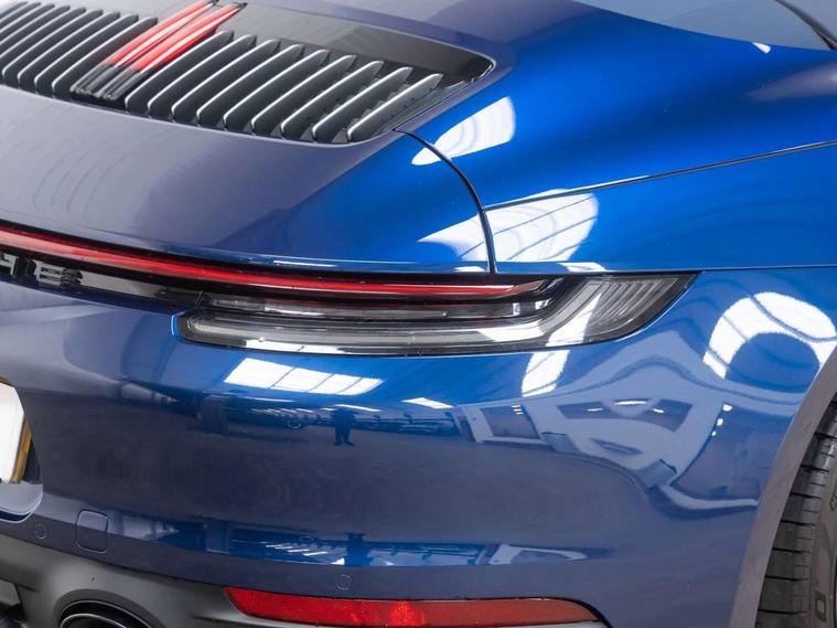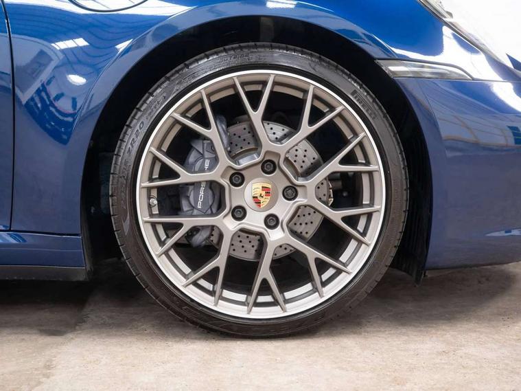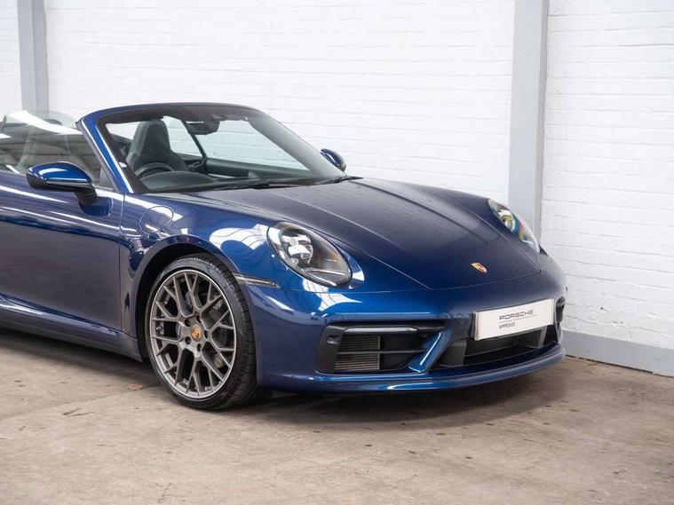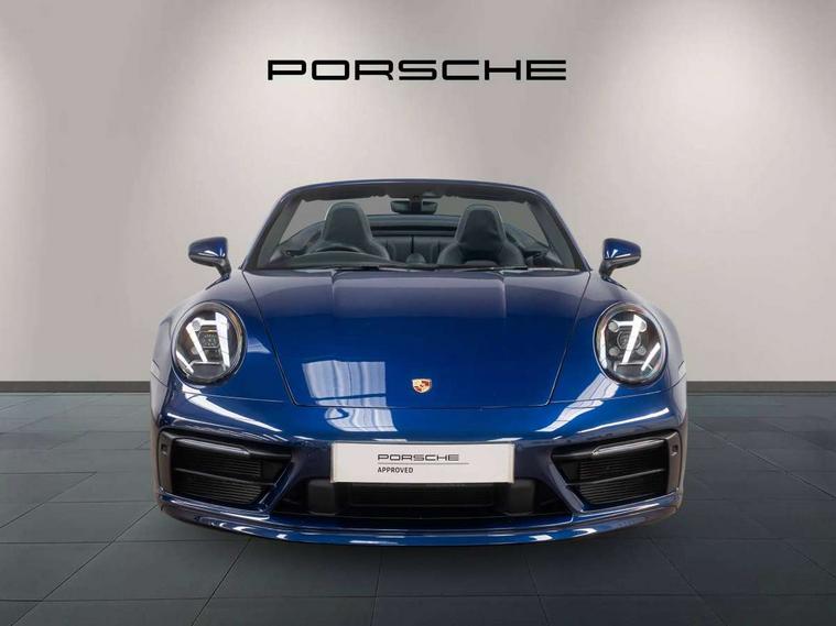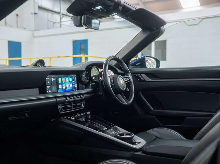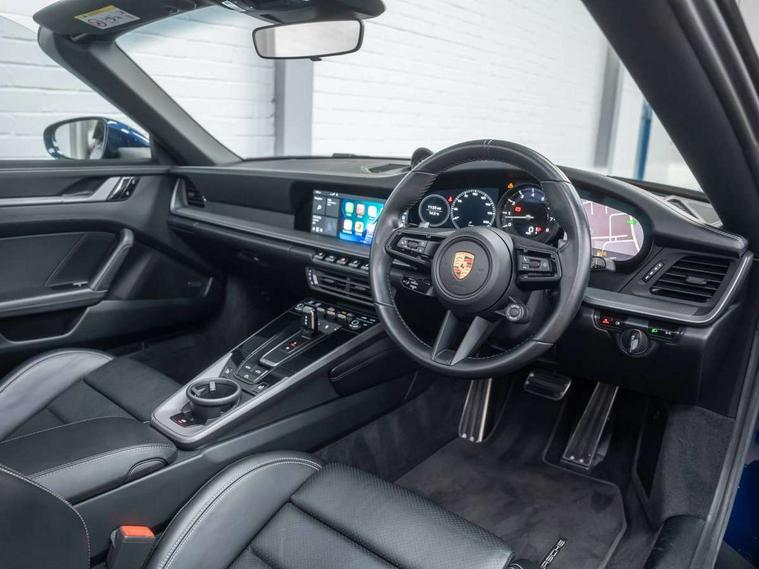 10.9 inch centre display, Automatic start/stop system, Digital display for selected gear in rev counter, eCall emergency system, Instrument cluster with central analogue rev counter and two 7-inch TFT displays, Porsche Communication Management (PCM) including online navigation module, mobile phone preparation, audio interfaces and voice control system, Porsche connect plus, Apple carplay, LTE telephone module with Sim card reader, wireless internet access and other Porsche connect services, Porsche WET Mode, Service indicator, Stationary management with HOLD function, Trip computer, Warn and Brake Assist with intergrated front cameras, 8 Speed Porsche Doppelkupplung (PDK), All wheel drive with map controlled multi plate clutch Porsche Traction Management (PTM), Aluminium block and cylinder heads, Direct fuel injection (DFI), Expansion intake manifold, Four valve per cylinder, Integrated dry-sump lubrication with an on-demand oil pump, McPherson-strut suspension with anti-roll bar at front, Multi-link suspension with anti-roll bar at rear, Porsche Active Suspension Management (PASM), Porsche Stability Management (PSM), ABS with extended brake functions, Twin turbocharger intercooled, Two gasoline particulate filter, Two three-way catalytic converters and on-board diagnostics for monitoring emission control system, VarioCam Plus variable valve timing and switchable valve lift, Water cooled with thermal management, DAB Digital radio, Two USB charging and connectivity ports in the front centre console storage compartment, "PORSCHE" lettering integrated in taillight strip, Auto deploying rear spoiler, Automatic headlight activation including welcome home lighting, Body coloured bumpers, Electrically adjustable heated exterior mirrors on door waist rails, aspherical on driver's side, Engine compartment cover grille with vertical slats in silver colour (high-gloss), Fully automatic fabric roof, electrically operated rigid glass rear screen, operable approx 30 mph and convenient operation by key remote, Green tinted heat insulating glass, Heated rear windscreen, Integral electrically powered wind deflector, Intelligent lightweight body in Aluminium/Steel composite construction, LED auxiliary light units in the front end with position lights, direction indicators and side indicators, Power windows with one touch operation and door seal protection, Retractable door handles, Side air intakes at front with active cooling flaps and air blades, Taillight strip including integral parking lights and rear driving lights, Trims on sideskirts in black, Windscreen washer system with aero wiper blades and washer jets, 12V socket in front passenger footwell, 2+2 seater with rear engine, Clothes hooks on seat backrests, Front and rear head restraints, Heated front seats, Hood lining in black fabric, ISOFIX child seat mounting points on front passenger seat, Luggage compartment at front, One individual cupholder (passenger side) and one individual cupholder in centre console, Particle/pollen filter with active carbon filter, PDK gear selector with automatic mode, manual gear selection via shift paddles on the steering wheel, Split folding rear seats, SPORT button to activate dynamic driving settings for engine and transmission, Storage compartments in each doors, Two zone auto climate control with separate temperature settings for driver/front passenger, automatic air recirculation mode incl air quality sensor, 3 point inertia reel seatbelts, 4 piston aluminium monobloc fixed + brake calipers at front and rear + brake calipers with black finish, Auto deploying roll over protection system, Brake discs with 330mm diameter at front and rear, internally vented and cross-drilled, Electric parking brake, Electromechanical power brake, Full size two stage airbags for driver and front passenger, Porsche side impact protection system (POSIP) includes side impact protection in doors, head/thorax airbags for driver and front passenger, Tyre pressure monitoring system, Engine immobiliser with remote central locking and alarm system with radar based interior surveillance, Porsche vehicle tracking system (PVTS Plus),