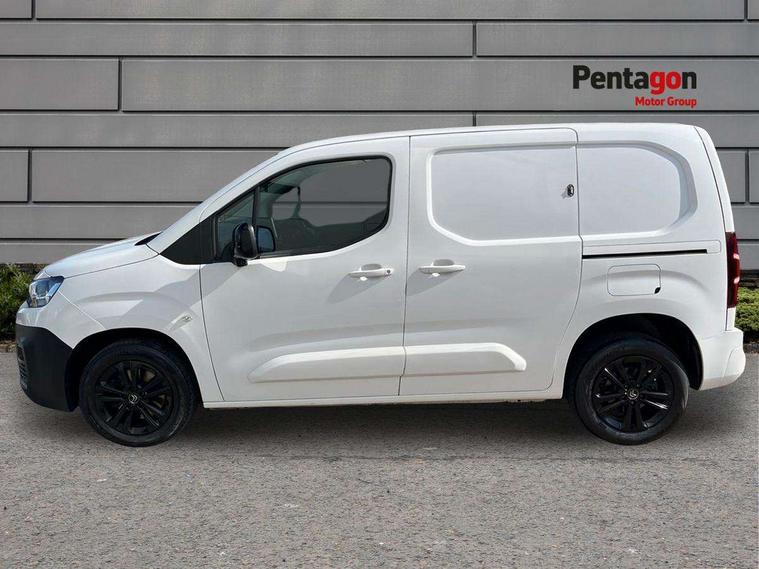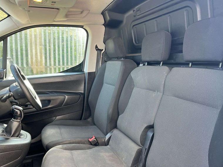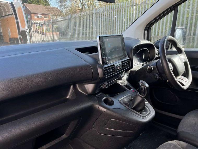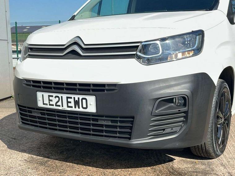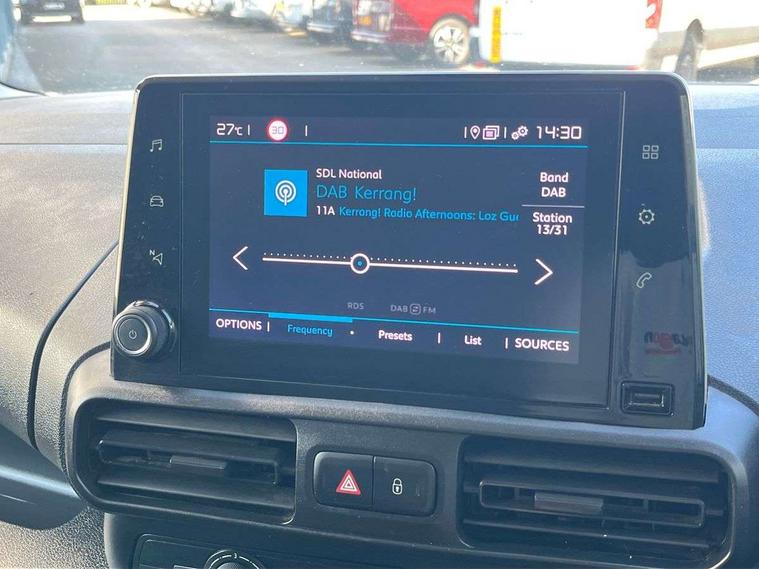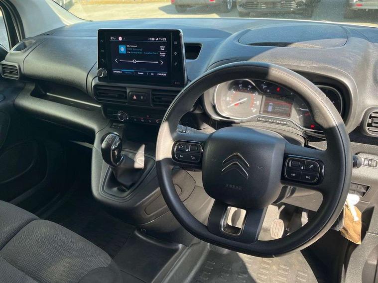 Citroen connect box with emergency and assistance system, Citroen connect navigation with 8" colour touchscreen, DAB radio, bluetooth with handsfree, USB socket and Aux-in jack, Cruise control with programmable speed limiter, Electric power assisted steering with height and reach adjustable steering wheel, Lockable fuel cap, Multi-function trip computer, Rev counter with maintenance and gear efficiency indicators (GEI), Surround Rear Vision - Front and rear parking sensors with passenger side and rear camera providing tri-function visibility via 5" screen, Tyre pressure monitor, Apple Carplay/Android Auto, 180 degree opening unglazed asymmetric rear doors, Acoustic laminated windscreen with sound insulating front windows, Additional acoustic insulation providing benchmark cabin refinement, Electric front windows with one touch operation, Electrically adjustable door mirrors, Electrically folding door mirrors with temperature sensor, Front fog lights, High level third brake light, Nearside side sliding door, Visible VIN at windscreen base, 12 volt socket in dashboard, 6 floor mounted load securing rings, 6 way adjustable driver seat with lumbar support and under seat storage, Comfort driver's seat, Cup holders for driver and passenger on either side of the dashboard, Curitiba cloth upholstery, Extenso modular folding passenger bench seat with pivoting writing table, storage under central seat, load through hatch and load protection cover, Front door pockets with 1.5L bottle holder, Hard plastic floor protection in cabin, Multi function steering wheel, Overhead storage shelf in cabin, Topbox storage compartment, Look pack with body coloured door mirrors - Berlingo, Visibility pack with Magic wash - Berlingo, Automatic activation of hazard warning lights on major deceleration, Door opening warning and audible lights on warning, Driver seatbelt unfastened warning, Driver's airbag, Dashboard mounted central locking push button and auto locking above 7mph, Perimetric and volumetric thatcham category 1 approved alarm with tilt sensor, Remote central locking with deadlocking, selective cab and load area locking via 3 button plip remote control key, Thatcham approved rolling code transponder immobiliser, Automatic electronic parking brake, Electronic Stability Control and ABS with hill start assist, EBA and EBFD, 16" Starlit alloy wheels, Full size steel spare wheel,