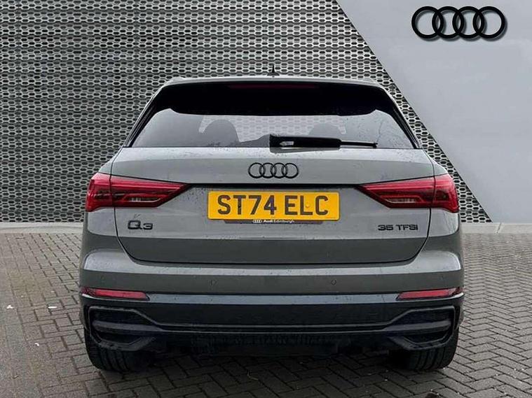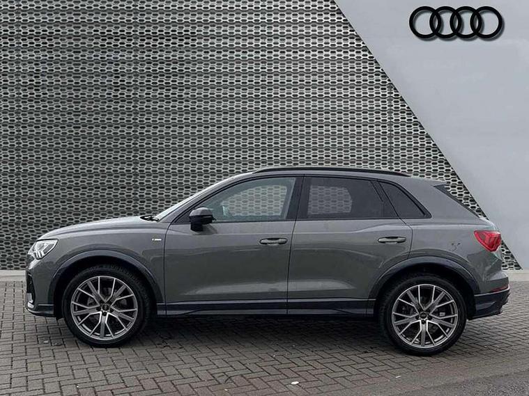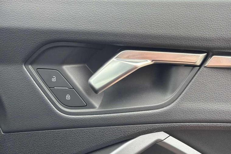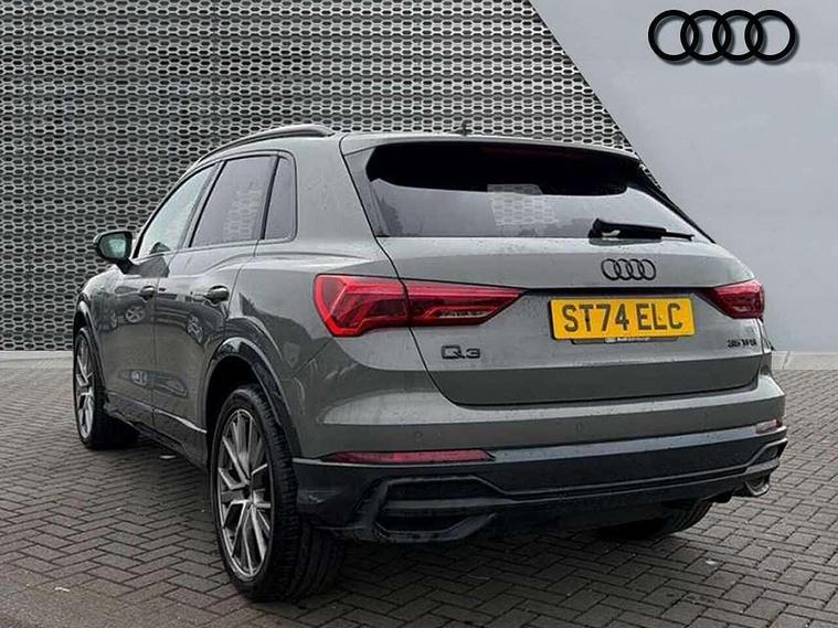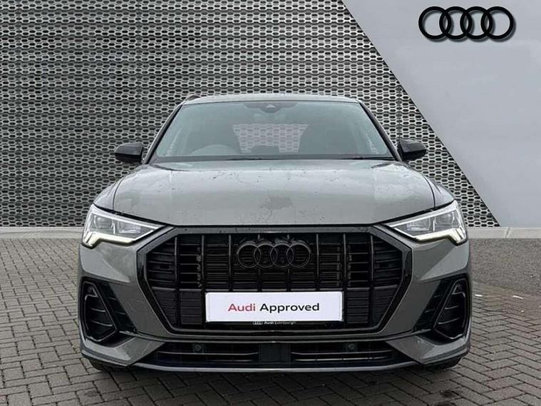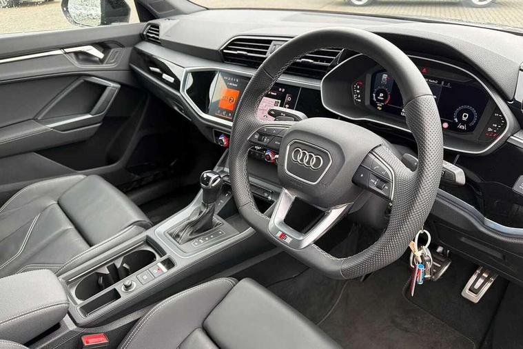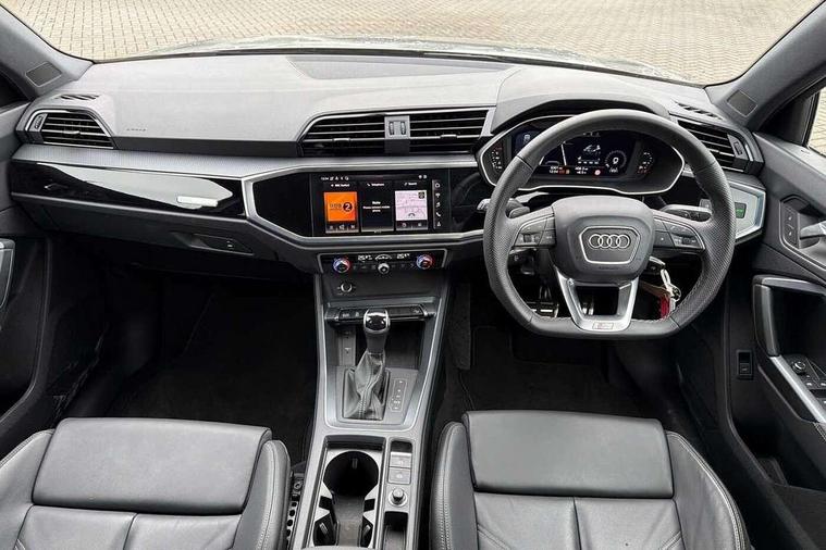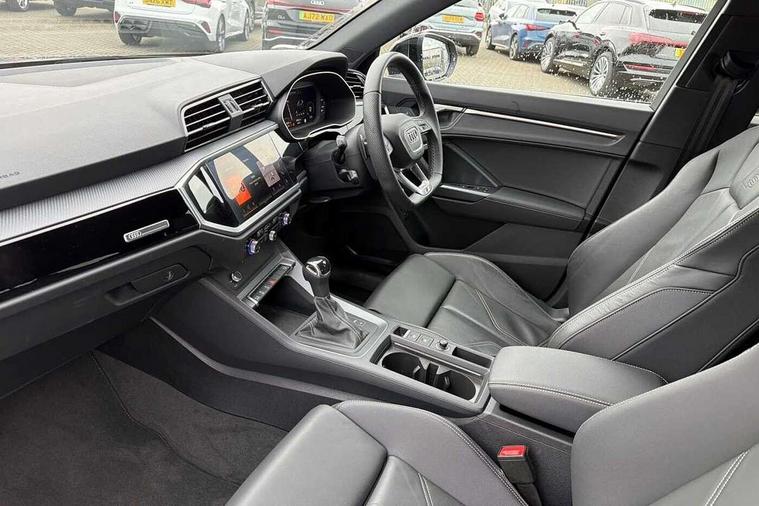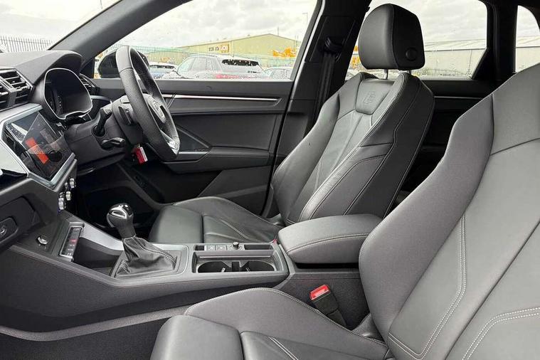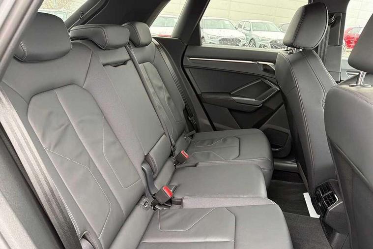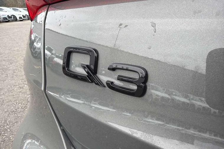 Amazon alexa Integration, Audi connect safety and service, Audi drive select, Audi lane departure warning, Audi smartphone interface includes wireless Apple carplay/Android Auto, Audi Virtual Cockpit - 10.25" display, Bluetooth interface, Camera based traffic sign recognition, Distraction and Fatigue warning, Legal emergency call, MMI Navigation Plus with high resolution 10.1 inch touchscreen colour display, Power operated tailgate, Progressive steering, Service interval indicator, Start stop system with recuperation, Voice control system with natural language interaction, Sports suspension, 2 USB-C ports with charge and data functions, 6 passive loudspeakers, DAB digital radio module, Acoustic windscreen, Audi Beam uses LEDs to project the Audi logo onto the ground as you exit your Q3, Auto dimming door mirrors, Auto dimming frameless rear view mirror, Black roof rails, Electrically folding, adjustable and heated door mirrors with integrated LED side indicators and kerb view function for passenger side, Front and rear electric windows, Front fog lights, Grille vertical bars in aluminium silver/Matt, High gloss black finish B and C pillars, LED Dynamic rear indicators, LED headlights with LED daytime running lights, LED rear lights, LED third brake light, Privacy glass dark tinted rear and rear-side windows (from B-pillar backwards), Rain and light sensors, Rear diffuser grille in grained matt black, Rear diffuser strip in matt anthracite black, Rear side wing doors, Rear wiper, S line bumpers in contrasting Manhattan grey, Variable front intermittent wipers, 12V socket in rear centre console, 3 seat bench in 2nd row, 40:20:40 folding with manual adjustment for 60:40 forwards/backwards position and backrest angle, Adjustable rear seat bench/backrest with centre armrest and cupholder, Black cloth headlining, Dual zone electronic climate control, Electric lumbar support, Front and rear black floor mats with contrast stitching in rock grey, Front and rear headrests, Front centre armrest, Height and reach adjustable steering wheel, Illuminated door sill trims with S logo, ISOFIX child seat mounting for front passenger with airbag deactivation and outer rear seat including top tether attachment point for outer rear seats, Manual front seats with height adjustment, Perforated leather gearknob, Single front passenger seat, Stainless steel luggage compartment sill finisher, Stainless steel pedals, Twin leather upholstery with front sport seats + S embossing, Black styling pack - Q3, Non smoking pack - Q3, 3x3 point rear seatbelts, 6 airbags - Driver, front passenger, curtain and side windows, Audi pre-sense front with pedestrain and cyclist recognition, Electrically operated child locks on rear doors, Electromechanical parking brake, Electronic stabilisation control including ABS, ASR and EDL, Front seatbelt reminder, Hill descent control, Hill hold assist, Pre sense basic, Seatbelt monitoring, Tyre pressure warning, Warning triangle and first aid kit, Anti theft alarm, Anti theft wheel bolts, Immobiliser, Remote central locking, Aluminium look interior elements, Detail dashboard around MMI touch colour display in glass look, black with surround in aluminium look, Leatherette door armrest, Piano black inlay,