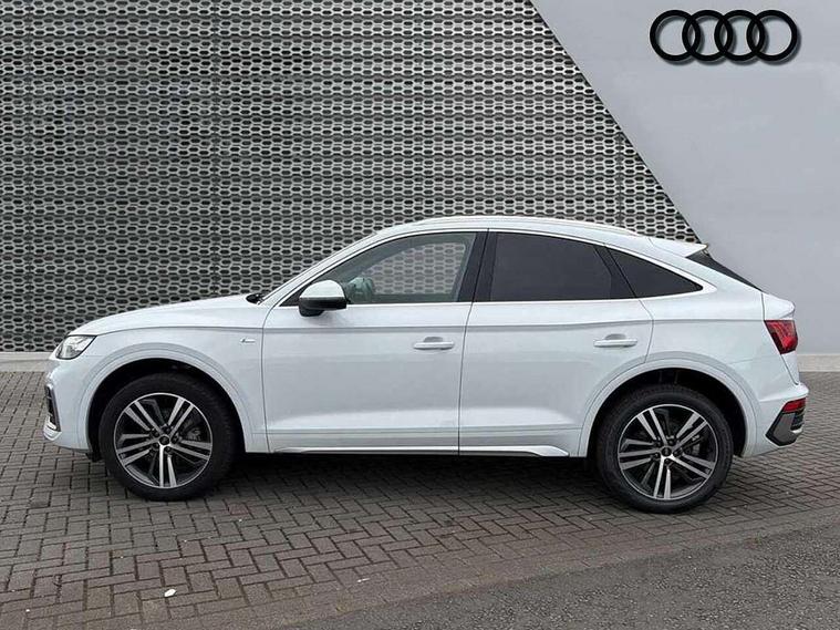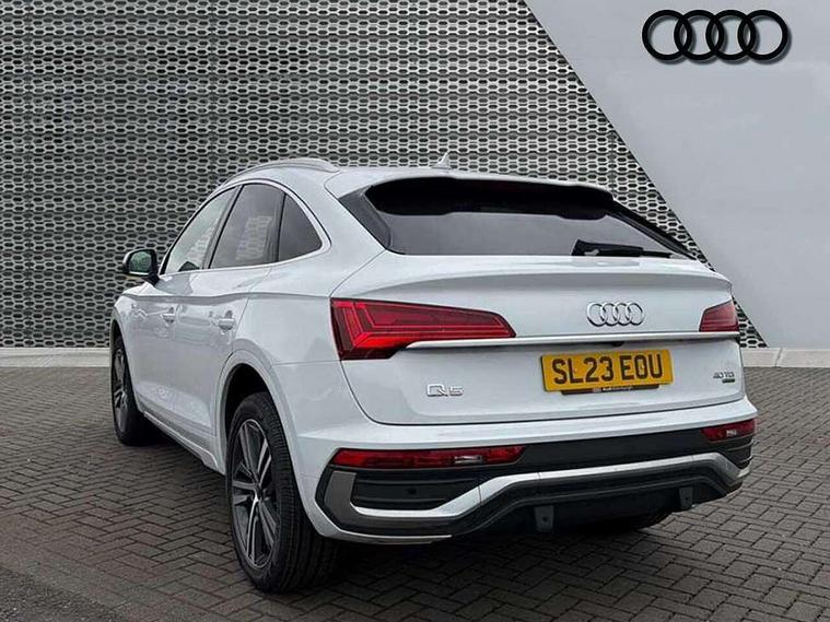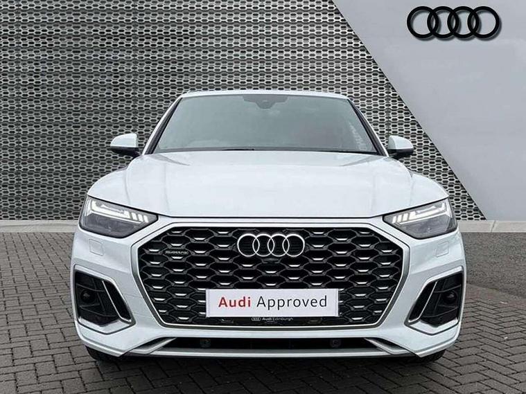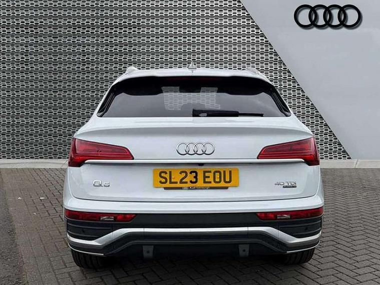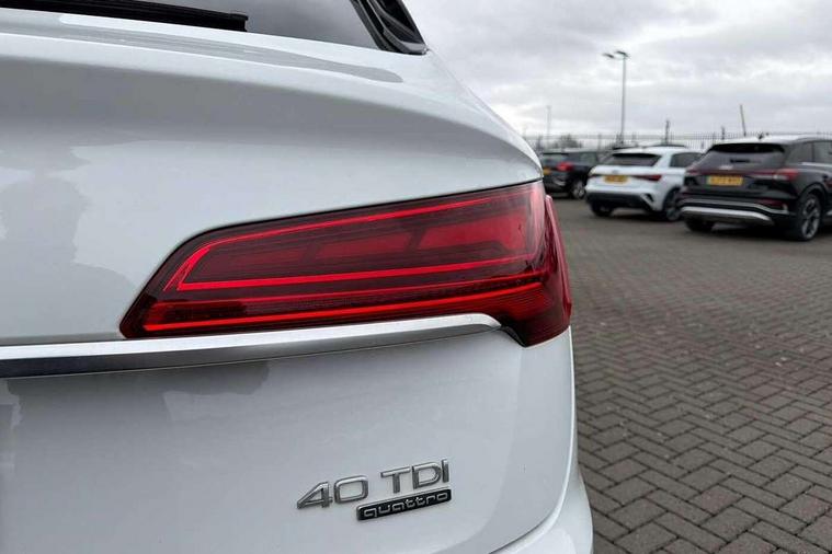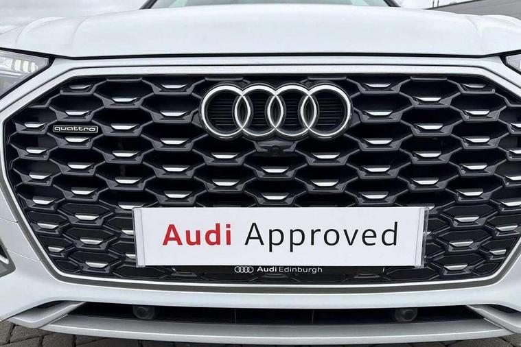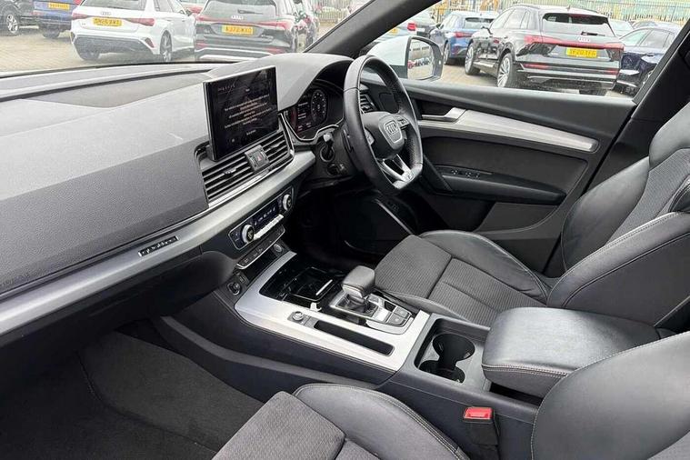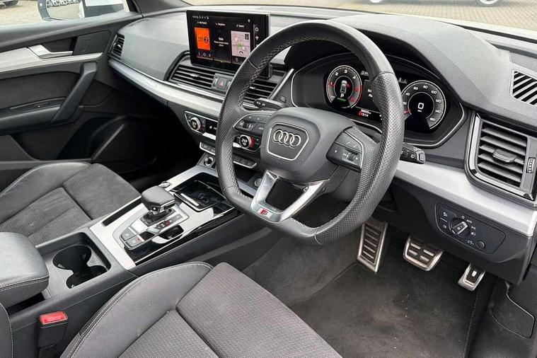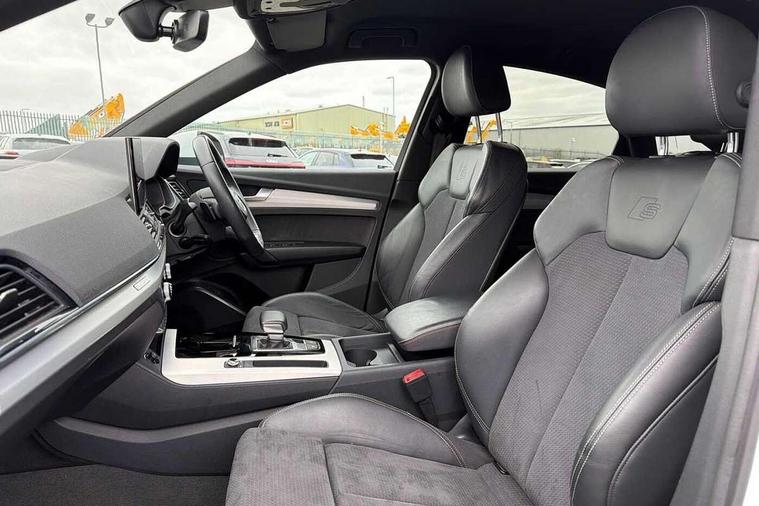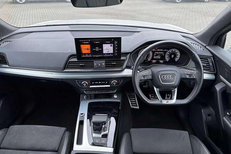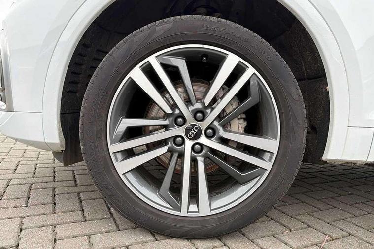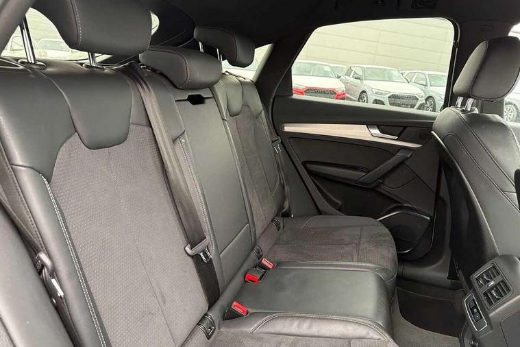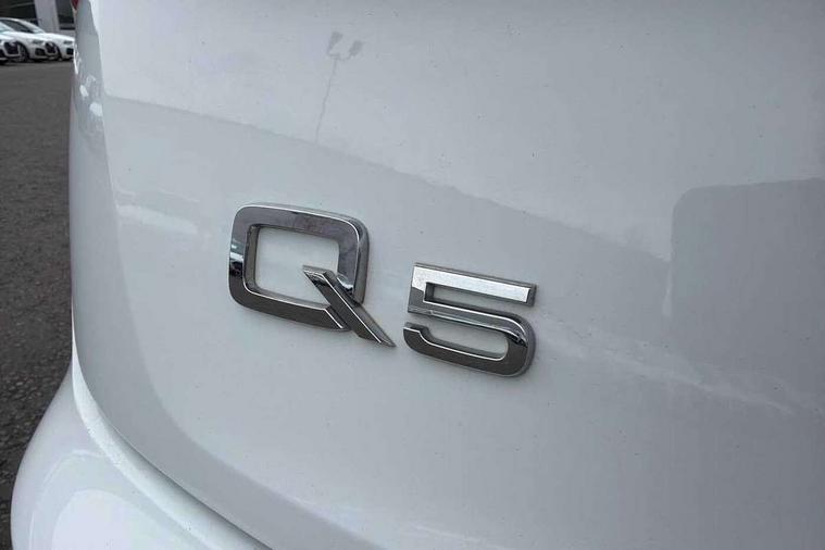 Acoustic front and rear parking sensor, Audi connect safety and service (e-call), Audi connect with Amazon Alexa Integration, Audi drive select, Audi virtual cockpit plus with 12.3" screen and three different layout designs, Audi wireless smartphone interface, Automatic start-stop system with coasting functionality and efficiency programme, Bluetooth interface, Electro - mechanical power assisted steering, MMI navigation plus with 10.1" touch screen, Power tailgate, Reversing camera, Service interval indicator, Voice control system with Audi hotword activation "Hey Audi", Diesel particulate filter, Quattro on demand, S line sports suspension, 2 x USB charging port with aux input socket, 8 loudspeakers, DAB Digital radio, Acoustic windscreen, Aluminium roof rails, Audi matrix LED headlights with dynamic front and rear indicators, Auto dimming door mirrors, Auto dimming frameless rear view mirror, Automatic headlight adjustment, Automatic headlights and windscreen wipers, Body colour door mirrors, Body colour rear diffuser with matt aluminium silver surrounds, Body colour underbody protection, Chrome plated exhaust trims, Daytime running lights, Door sills in Selenite silver, Electric adjustable/heated/folding door mirrors, Front air inlet surrounds in aluminium, Front and rear electric windows, Front radiator grille in honeycomb design, Headlight washers, High level LED brake light, Lower bumpers painted in contrast Manhattan grey, Rear chrome trim strip below lights, Rear privacy glass and rear side windows, Rear side wing doors, Rear wiper, Roof bars, S Line badges on the front wings, S Line front and rear bumpers, S Line rear spoiler, S Line side skirts, 3 rear headrests, 3 spoke leather multifunction steering wheel with S badging perforated leather grips, 40:20:40 split folding 3 rear bench seat in 2nd row with rear centre armrest, Black cloth headlining, Comfort front centre armrest, Contrast stitching on seats, steering wheel and gear lever gaiter, Deluxe 3 zone electronic climate control, Front head restraints, Front/rear floor mats, Gear lever in black leather, Heated front seats, Height/reach adjustable steering column, Illuminated door sill trims with S logo, Manual seat adjustment with 4-way electric lumbar support, Removable luggage compartment floor, Single front passenger seat, Stainless steel pedals, Sunvisors with vanity mirrors, Trunk roller cover, High gloss pack - Q5, LED interior light pack - Q5, 3 point seatbelts on all seats, 6 airbags - Driver, front passenger, curtain and side airbags, Electrically operated child locks on rear doors, Electromechanical parking brake, Electronic stabilisation control including ABS, ASR and EDL, First aid kit with warning triangle and vests, Front passenger airbag deactivation, Hill descent control, Hill hold assist, ISOFIX child seat mounting for front passenger seat and ISOFIX child seat mounting with Top Tether for outer rear seats, Multi collision brake assist, Pop-up bonnet for pedestrian protection, Pre sense city, Seat belt force limiter, Seatbelt monitoring, Tyre pressure warning, Anti theft alarm, Anti-theft wheel bolts, Keyless Go access/ignition system, Remote central locking, Air vents inserts and centre console in gloss black, Matt brushed aluminium inlays,