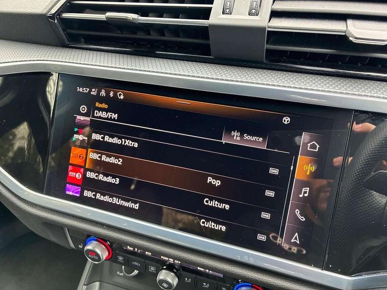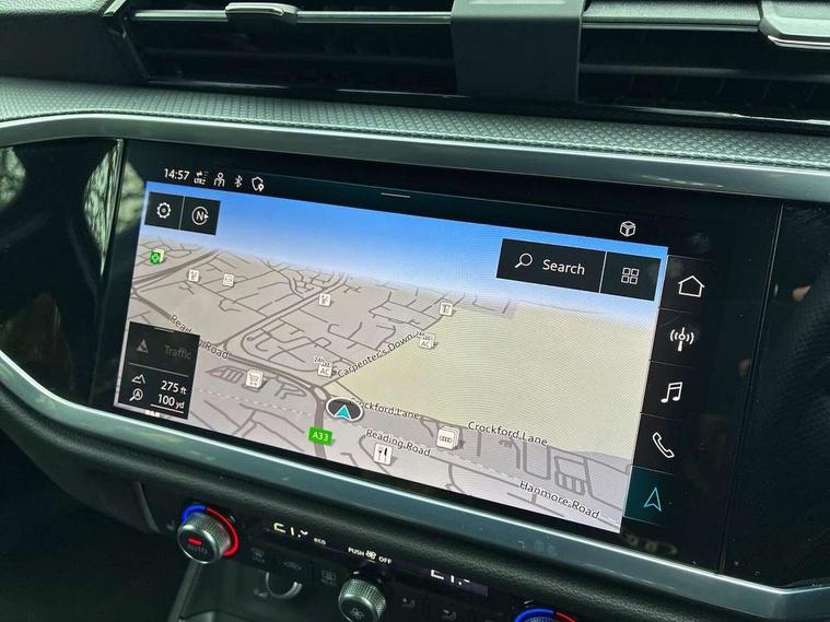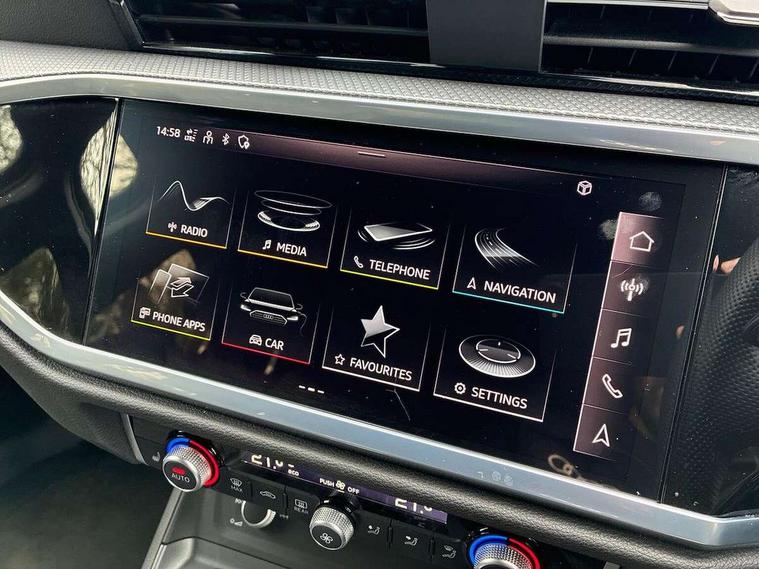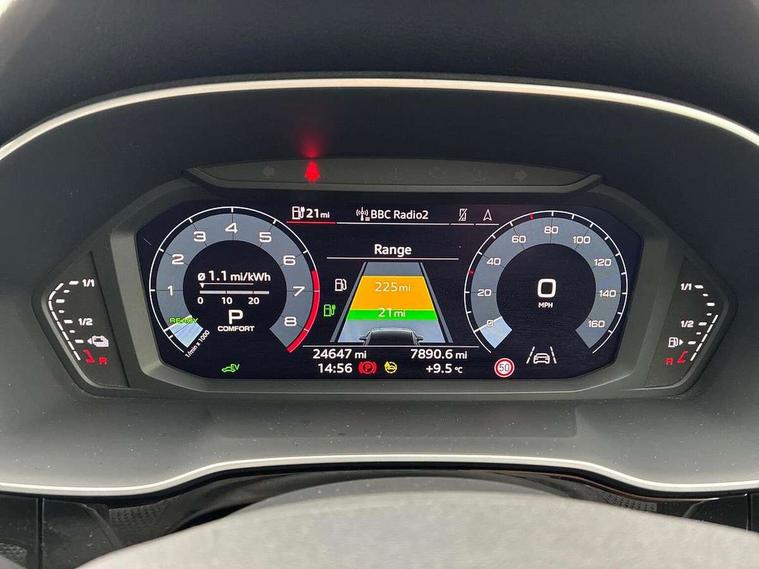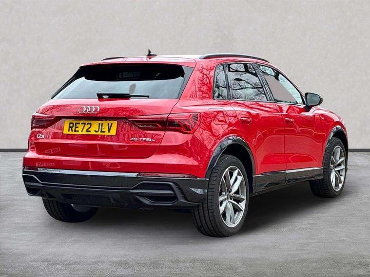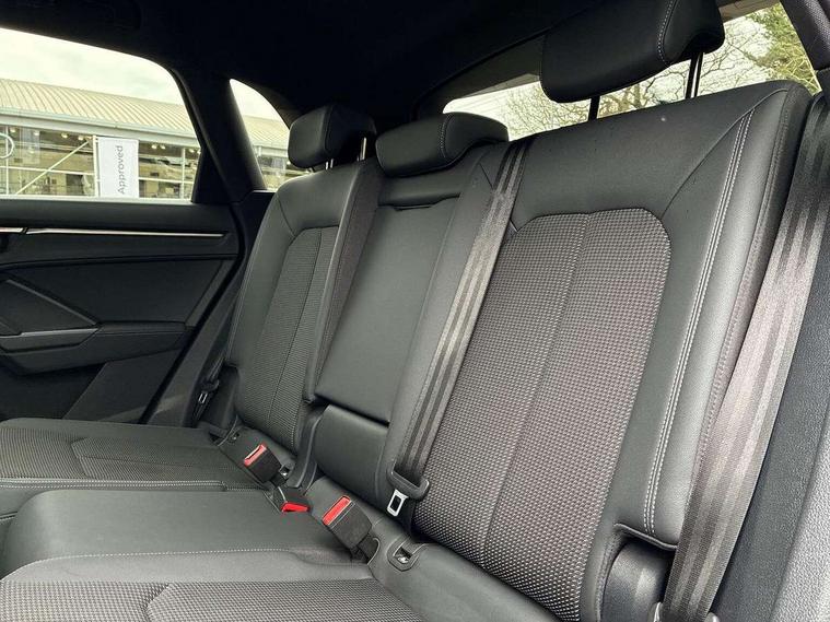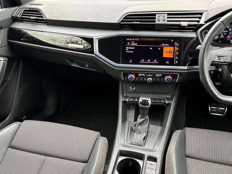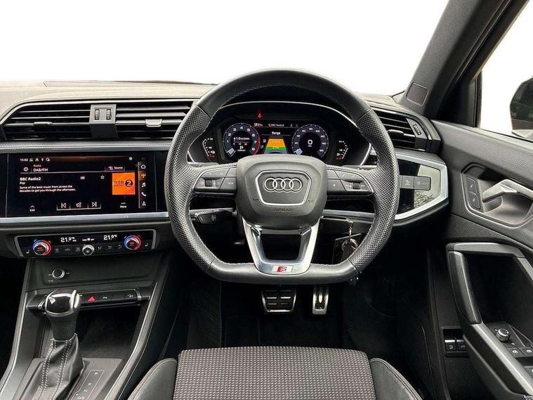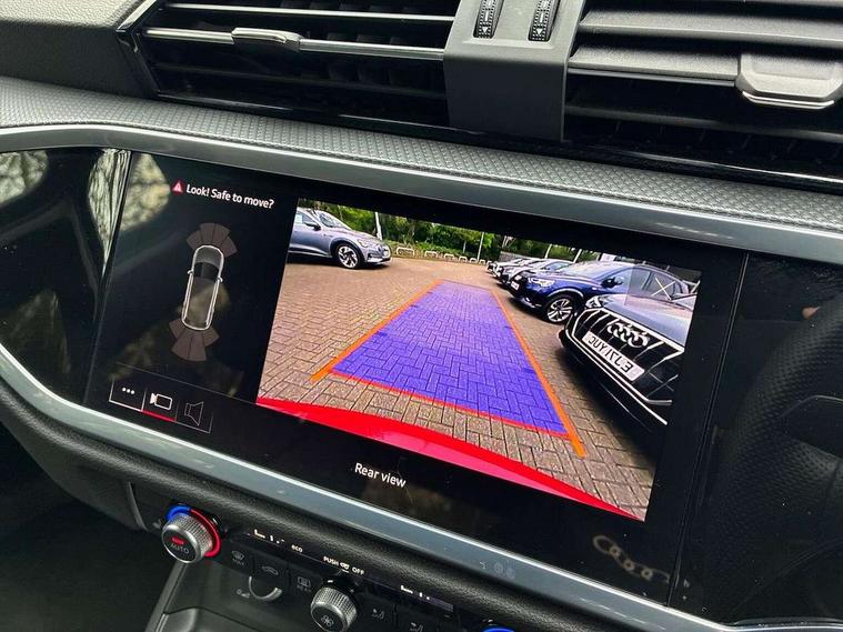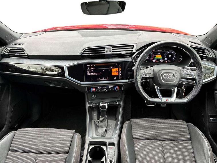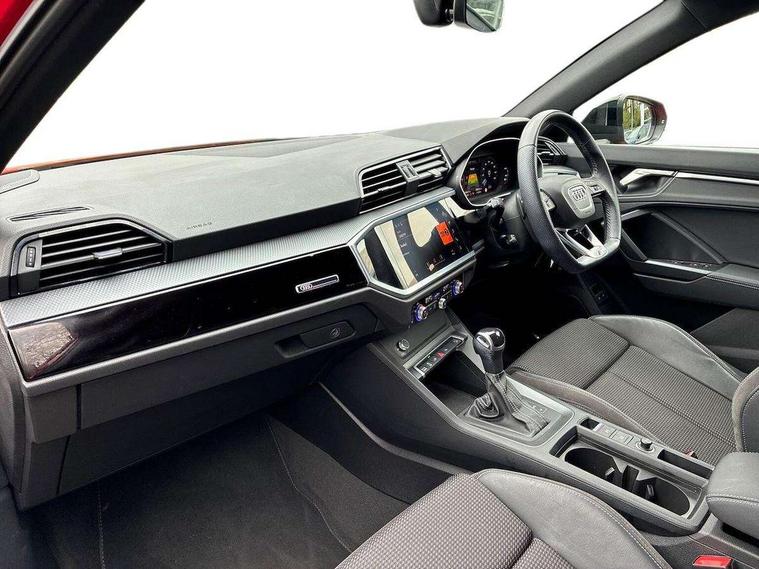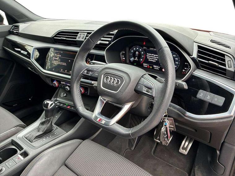 Amazon alexa Integration, Audi drive select, Audi lane departure warning, Audi smartphone interface includes wireless Apple carplay/Android Auto, Audi Virtual Cockpit - 10.25" display, Bluetooth interface, Camera based traffic sign recognition, Legal emergency call, MMI Navigation Plus with high resolution 10.1 inch touchscreen colour display, Power operated tailgate, Progressive steering, Service interval indicator, Start stop system with recuperation, Voice control system with natural language interaction, 3 pin 10 amp domestic charging cable, 3.6 kw On-board charger, Type 2 mode 3 32 amp charging cable, Type 2 socket for AC charging, 2 USB-C ports with charge and data functions, 6 passive loudspeakers, DAB digital radio module, Acoustic windscreen, Auto dimming frameless rear view mirror, Black roof rails, Electrically folding, adjustable and heated door mirrors with integrated LED side indicators and kerb view function for passenger side, Front and rear electric windows, Front fog lights, Grille vertical bars in aluminium silver/Matt, High gloss black finish B and C pillars, LED Dynamic rear indicators, LED headlights with LED daytime running lights, LED rear lights, LED third brake light, Privacy glass dark tinted rear and rear-side windows (from B-pillar backwards), Rain and light sensors, Rear diffuser grille in grained matt black, Rear diffuser strip in matt titanium black, Rear side wing doors, Rear wiper, S line bumpers in contrasting Manhattan grey, Variable front intermittent wipers, 12V socket in rear centre console, 3 seat bench in 2nd row, 40:20:40 folding with manual adjustment for 60:40 forwards/backwards position and backrest angle, Adjustable rear seat bench/backrest with centre armrest and cupholder, Black cloth headlining, Dual zone electronic climate control, Front and rear black floor mats with contrast stitching in rock grey, Front and rear headrests, Front and rear roof module including reading lights, Front centre armrest, Glove compartment lighting, Height and reach adjustable steering wheel, Illuminated door sill trims with S logo, ISOFIX child seat mounting for front passenger with airbag deactivation and outer rear seat including top tether attachment point for outer rear seats, Luggage compartment light, Manual front seats with height adjustment, Perforated leather gearknob, Single front passenger seat, Stainless steel luggage compartment sill finisher, Stainless steel pedals, Tool kit, Ambient lighting pack - Q3, Black styling pack - Q3, Non smoking pack - Q3, 3x3 point rear seatbelts, 6 airbags - Driver, front passenger, curtain and side windows, Audi pre-sense front with pedestrain and cyclist recognition, Electrically operated child locks on rear doors, Electromechanical parking brake, Electronic stabilisation control including ABS, ASR and EDL, Front seatbelt reminder, Hill descent control, Hill hold assist, Pre sense basic, Seatbelt monitoring, Tyre pressure warning, Warning triangle and first aid kit, Anti theft alarm, Anti theft wheel bolts, Immobiliser, Remote central locking, Detail dashboard around MMI touch colour display in glass look, black with surround in aluminium look, Leatherette door armrest, Piano black inlay, Tyre repair kit,