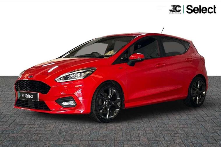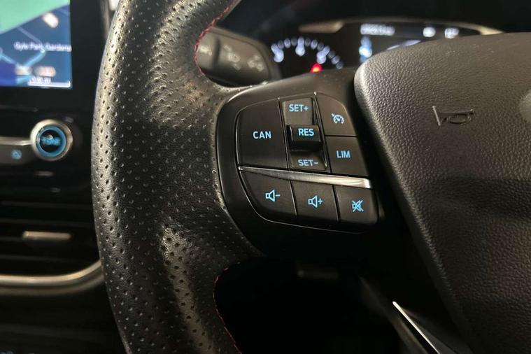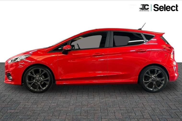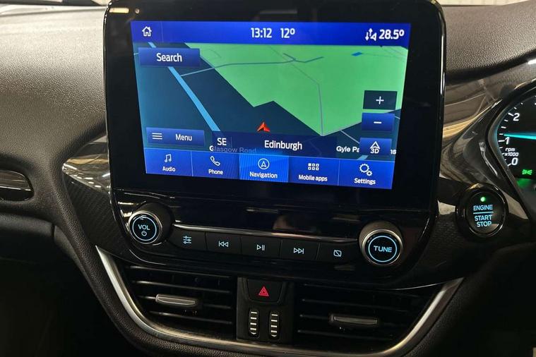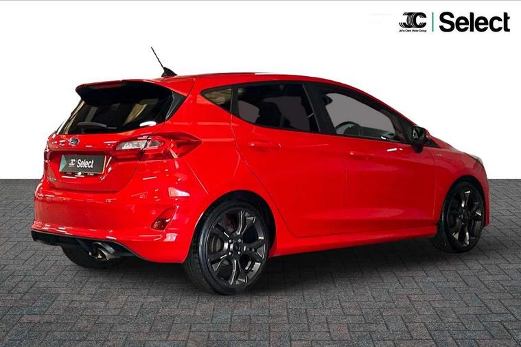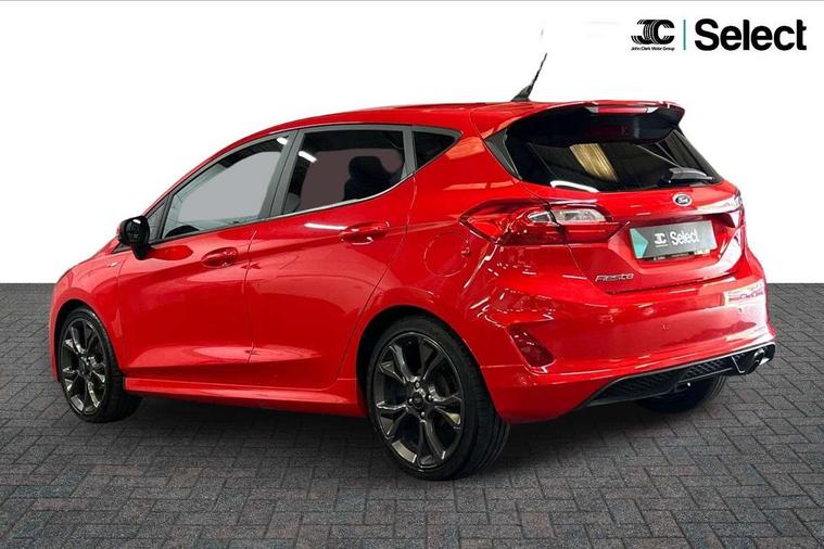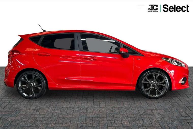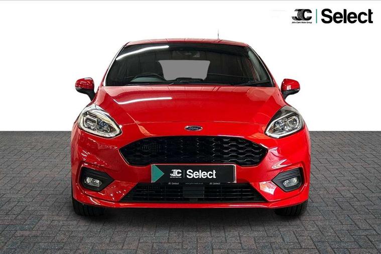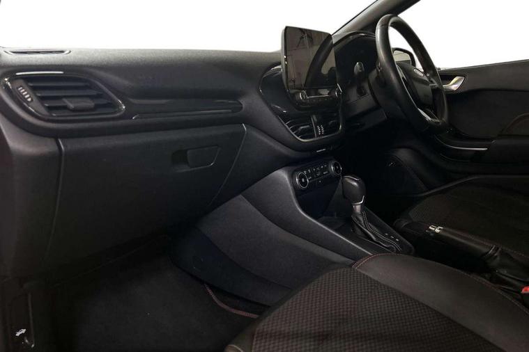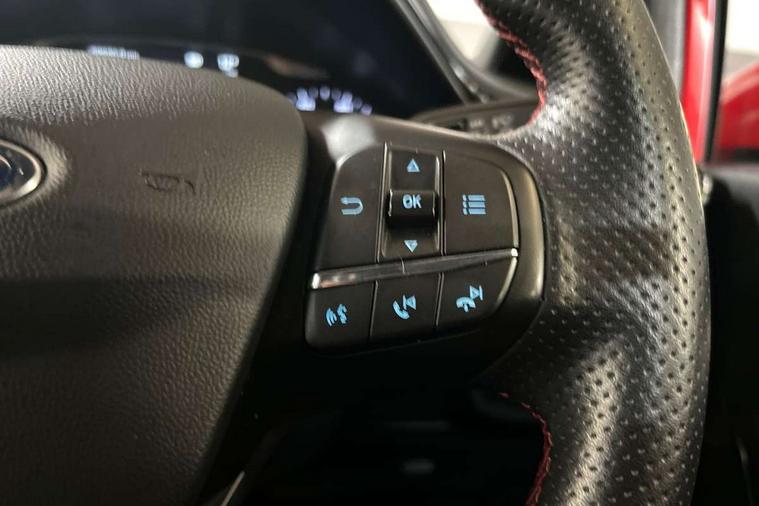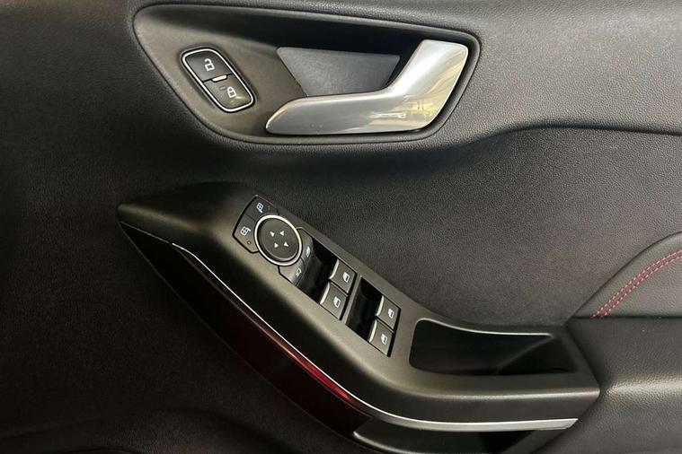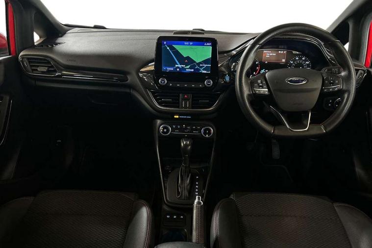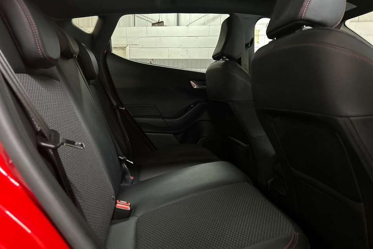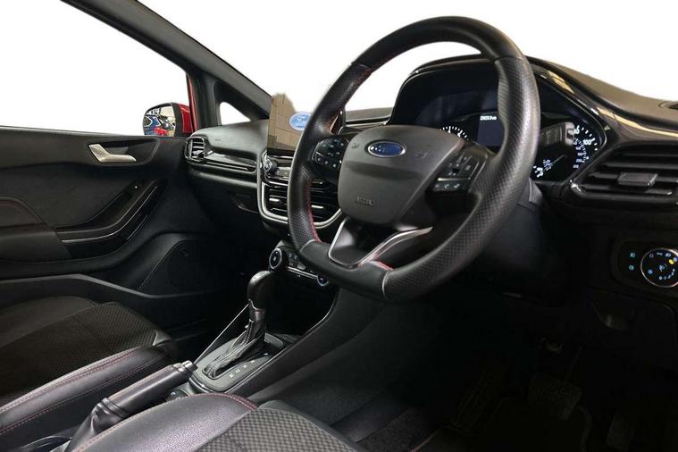 4.2" TFT instrument cluster screen, Bluetooth system, Electric power steering, Ford easy fuel, Rear parking distance sensors, Traffic sign recognition, Trip computer, Wireless charging, Sports suspension, 2 USB ports, Auxiliary input socket, B&O Premium audio system with 8" touchscreen, 10 speakers, 360 degree sound system, Ford SYNC 3 navigation system and Ford pass connect, DAB Digital radio, Steering wheel mounted controls, Auto high beam, Body colour bumpers, Body colour door handles, Body colour large rear spoiler, Body coloured electrically operated and heated door mirrors with side indicators, Cornering front fog lights, Electric front windows/one touch facility, Electric rear windows, LED Night signature to rear lights, Power foldable door mirrors with puddle lights, Quickclear heated windscreen, Rain sensing wipers and auto dimming rear view mirror, Rear privacy glass, Rear wiper, Unique ST-Line upper grille & full bodystyling kit with ST-Line wing badges, 12V Accessory socket in centre console, 3 spoke flat bottomed leather steering wheel, 60/40 split folding rear seat, Adjustable head restraints, Black headlining, Boot carpet, Centre console with armrest and illuminated cupholders, Chrome inner door handles, Drivers and Passenger lumbar support, EATC - Electronic Auto Temperature control, Footwell illumination, Front floor mats, Front map reading lights, Front seat and rear pockets, Height adjustable driver's seat, Height adjustable passenger seat, Illuminated glovebox, LED ambient lighting, Load area light, Overhead console with sunglasses holder, Pollen filter, Rake/reach adjustable steering wheel, Sensico leather steering wheel/gear knob/handbrake, Sports front seats, NCAP Pack - Fiesta, ST-Line X Trim Pack - Fiesta, 3 point seatbelts on all rear seats, ABS+EBA, Curtain airbags, Driver and passenger airbags, Drivers knee airbag, Electronic stability control with hill start assist, Front passenger airbag deactivation, Front side airbags, Seatbelt warning, Two tone horn, Tyre pressure monitoring system, Ford keyfree system with Keyless entry and keyless start, MyKey system, Remote central locking & engine immobiliser, Thatcham Cat.1 alarm, 18" 5 spoke alloy wheels with rock metallic machined finish,