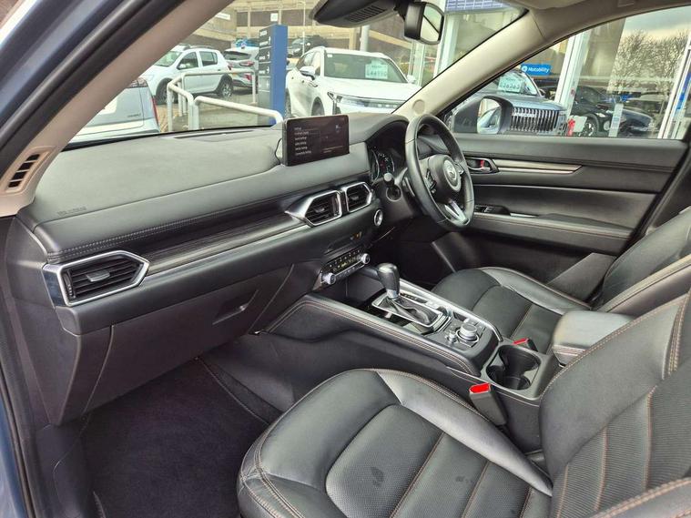 10.25" display with Mazda Connect infotainment, 7" colour TFT display, Advanced blind spot monitoring, Apple car play/Android Auto, Bluetooth connectivity with voice control, Collision prevention assist, Connected services, Cruising Traffic Support, Drive mode selector, Electric power steering, Emergency stop signalling system, Engine start/stop button, Forward collision warning, Front and rear parking sensors, Integrated navigation system, Intelligent speed assist, Lane departure warning system, Lane keep assist, Radar cruise control with Stop and Go, Reversing camera, Service indicator, Traffic sign recognition (TSR), Trip computer, Windscreen projected colour active driving display (HUD) with memory, i-stop, 2 USB sockets in rear, 2x USB sockets in front, 6 speakers, AM/FM radio, Bluetooth audio streaming, DAB Digital radio, Multimedia Commander including separate volume dial, Steering wheel mounted audio controls, Adaptive front lighting system, Auto dimming rear view mirror, Automatic headlights, Black inlay dashboard panel, Body colour door mirrors, Body colour roof spoiler, Body coloured front and rear black lower bumper mouldings, Bright finish signature wing, Coming/leaving home lighting function, Door mirror integrated indicators, Dual chrome tailpipes, Dusk sensitive headlamps, Electric front/rear windows with one touch auto up/down, Front grille in gloss black finish, Gloss black B and C pillars garnish, High beam assist, Intermittent rear wash/wipe, LED auto levelling, LED daytime running lights, LED front fog lights, LED Headlights, LED third brake light, Power folding and heated door mirrors, Power tilt/slide sunroof, Privacy glass (rear side windows only), Rain sensing front wipers, Rear side wing doors, Satin black side mouldings, Scuff plates, Shark fin antenna, Signature LED rear combination lights, Vinyl with wood grain metal inlay door trim panel, Windscreen wiper de-icer, 12v electrical power outlet, 3 seat bench in 2nd row, 3 stage heated front seats, 40:20:40 Karakuri fold-flat seat system, 6 way electric adjustable passenger seat, 8 way electric driver seat with lumbar support + memory, Cargo room flat floor board with waterproof undertray, Driver seat power slide, recline and height adjustment, Driver, Front passenger and two rear grab handles with coat hooks, Driver/passenger front seatback pockets, Driver/passenger sunvisors + illuminated vanity mirrors (drivers with ticket holder), Dual zone climate control, Folding centre armrest with 2 cup holders, Front and rear door pockets, Front centre storage with two cupholders, Front passenger seat power slide, recline and height adjustment, Heated steering wheel, Humidity sensor, Illuminated glovebox, Interior dome light with integral spotlight, ISOFIX child seat anchorage points attached on outer rear seats, Karakuri tonneau cover, Leather upholstery, Leather wrapped steering wheel and gear knob, Light roof lining, Luggage compartment LED lighting, Luggage compartment power outlet, Paddle shifts, Rear air vents, Rear headrests, Rear seat recline, Roof mounted sunglasses holder, Single front passenger seat, Three height adjustable head restraints, Tilt/height adjustable steering wheel, White interior LED illumination lighting, 3 point front seatbelts with pre-tensioners, 3 rear 3 point seatbelts, ABS, Advanced Smart City Brake Support - SCBS, Child locks on rear doors, Driver and front passenger side airbags, DSTC-Dynamic Stability and Traction Control, Dual front airbags, Electronic brake force distribution, Electronic parking brake with auto hold, ESP, Front and rear curtain airbags, Front passenger airbag deactivation, G-Vectoring control, Hill hold assist, Seatbelt reminder front and rear, Single stage passenger airbags, Smart brake support with forward obstruction warning, Tyre pressure monitoring system, Automatic door locking when moving off, Deadlock, Immobiliser, Power door locks, Remote central locking, Smart keyless entry, Thatcham Cat.1 alarm, 19" diamond cut black alloy wheels, Tyre repair kit,