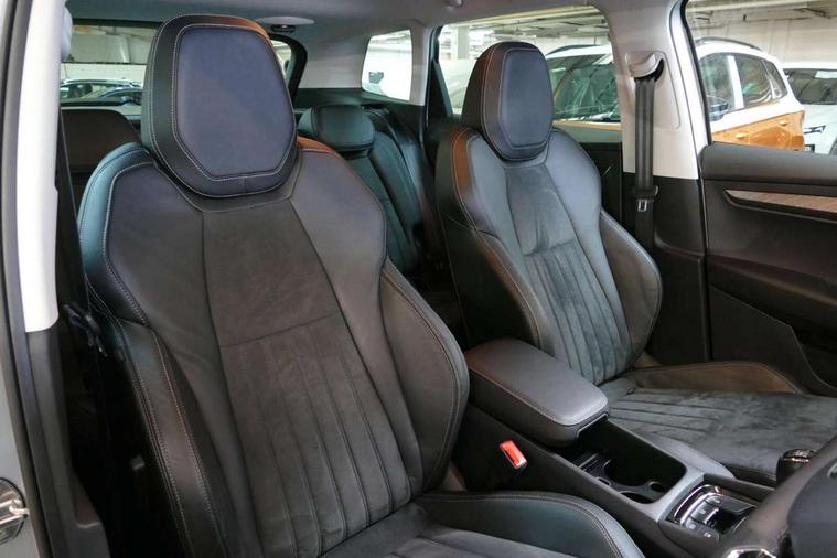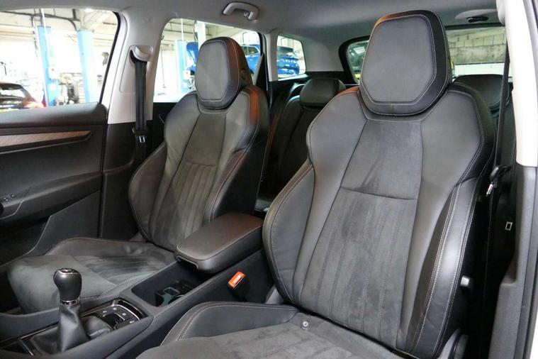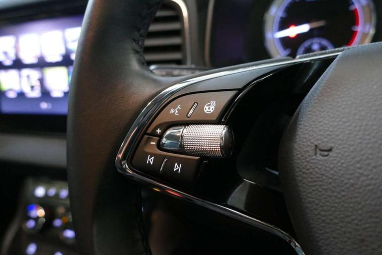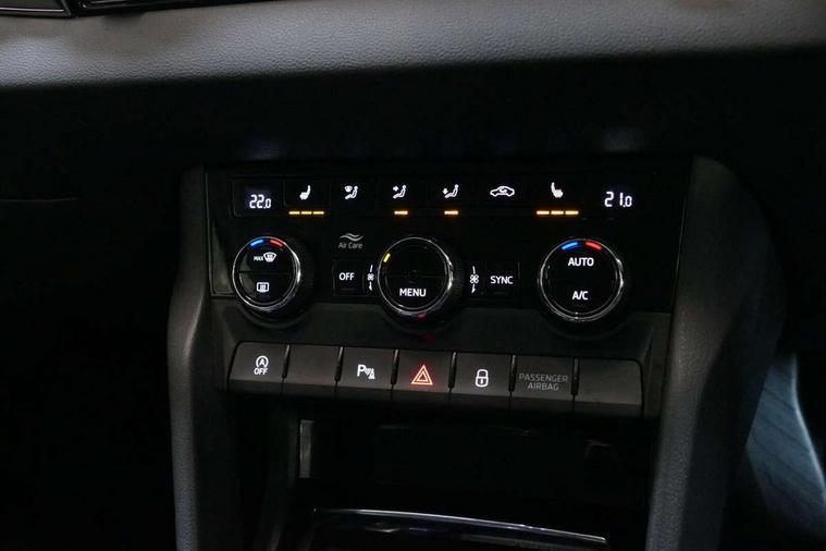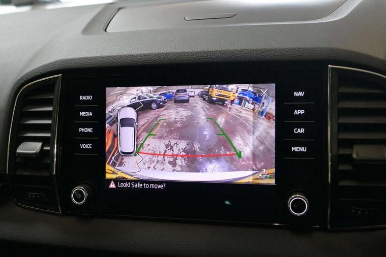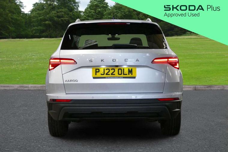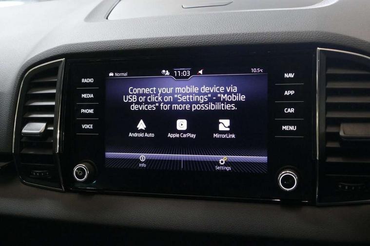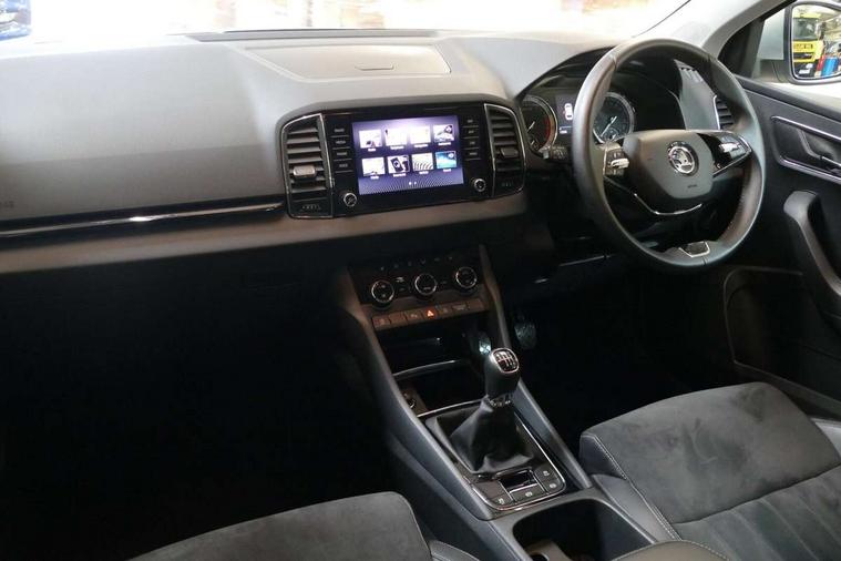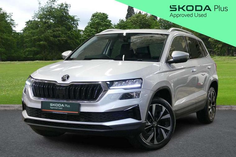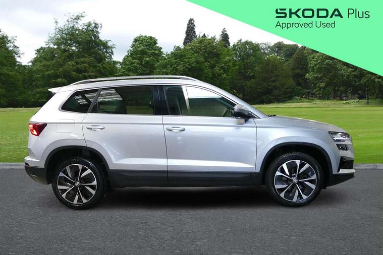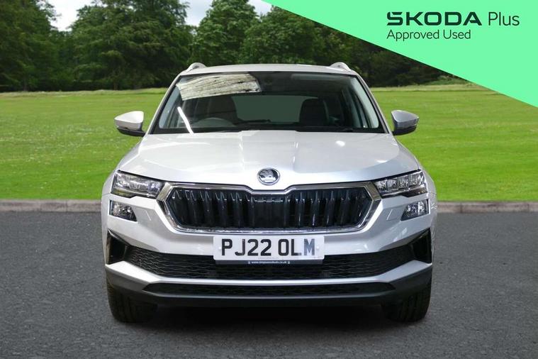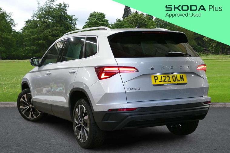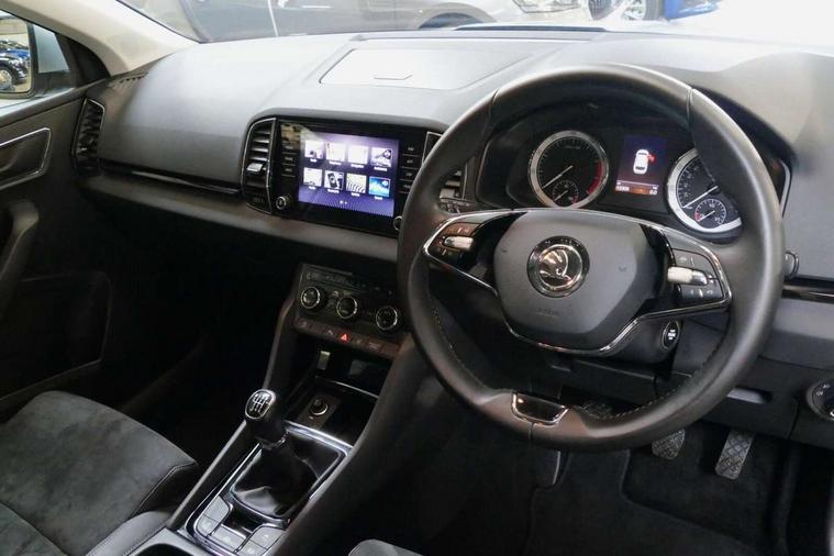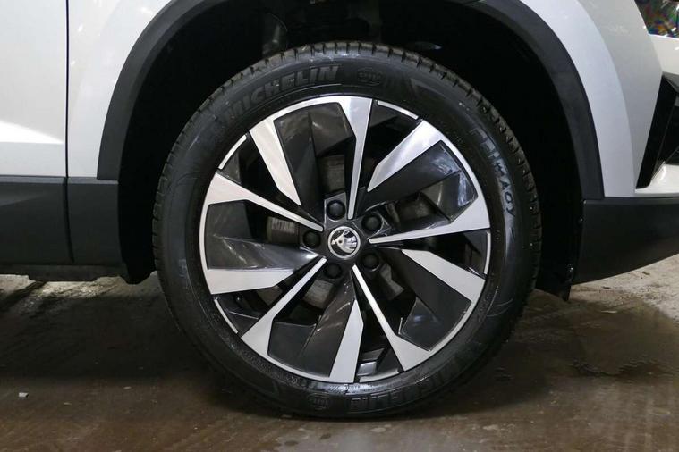 Care connect, Drive mode selector, Driver fatigue sensor, Electro-mechanical PAS, Emergency services call system, Multifunction colour trip computer, Outside temperature gauge, Service interval indicator, SmartLink wireless for Apple and wired for Android, Start/stop system with regenerative braking, USB C Port x 2 in front centre console, 8 Speakers, DAB radio with Bluetooth, USB connection, Acoustic glass, Aero front windscreen wipers with intermittent function, Auto dimming rear view mirror with light and rain sensors, Automatic headlight control system, Black electric window control buttons, Body colour door mirrors and handles, Body coloured bumpers, Electric front and rear windows with child proof lock, Electrically adjustable heated folding and auto dimming door mirrors, Heated rear windscreen, LED daytime running lights, LED Headlights, LED rear lights with high functionality welcome effect and dynamic indicators, Light assistant (coming/leaving home/tunnel light), Privacy glass, Rear side wing doors, Rear spoiler, Rear wiper, Safety reflectors on front doors, Third brake light, 1.5 litre bottle holders in driver and front passenger door panels, 12V socket in boot, 12v socket in front centre armrest with storage compartment and rear air vents, 2 Folding hooks and nets in boot, 2 spoke leather heated multifunction steering wheel, 2 x Tablet holder, 3 rear height adjustable headrests, 3 seat bench in 2nd row, 4 foldable roof handles with rear coat hooks, Black floor carpet, Chrome inner door handles, Decorative door sills with KAROQ badging, Double sided boot floor, Foldable hooks in the boot, Folding tables on the front seat backrests, Front head restraints, Height adjustable driver and passenger seat, Height adjustable front three point seats belts with tensioners, Height/reach adjust steering wheel, Ice scraper, Illuminated and cooled glovebox, Illuminated luggage compartment, Isofix child seat preparation for front passenger seat, Isofix child seat preparation outer rear, Manual lumbar support for front seats, Pen holder, Pollen filter, Rear boot cover, Rear reading lights, Retractable parcel shelf attachable to tailgate, Rubbish bin door, Safety vest holder, Single front passenger seat, Storage box in upper central dashboard closed, Sunvisors with illuminated vanity mirrors, Textile floor mats, Umbrella under passenger seat, VarioFlex seats with standard rear seat release, Chrome roof rails + chrome pack - Karoq, Parking pack - Karoq, Airbags - Front side, head, knee and curtain, Automatic door unlocking in case of crash, Automatic fuel cut off in case of crash, Child locks on rear doors, Driver airbag, Electronic parking brake with auto hold function, Emergency rear braking signal, ESC including ABS, MSR, ASR, EDS, HBA, DSR, RBS, MKB and traction control, Front assist radar scanning of the space in front of the car with automatic braking, Hill hold control, Passenger airbag with switch-off function, Pedestrian monitor, Seatbelt reminder signalisation and pretensioner for all seats, Three point seatbelts rear, Two tone horn, Tyre pressure display, Tyre pressure monitor, Alarm with interior monitoring, back up horn and tilt sensor with safe function, Electronic engine immobiliser, Keyless entry and start/stop system with SAFE system, Remote central locking with 2 remote folding keys, Chrome framed air vents, 18" Miran alloy wheels in black, Anti-theft wheel bolts protection, Storage on wheel cover,
