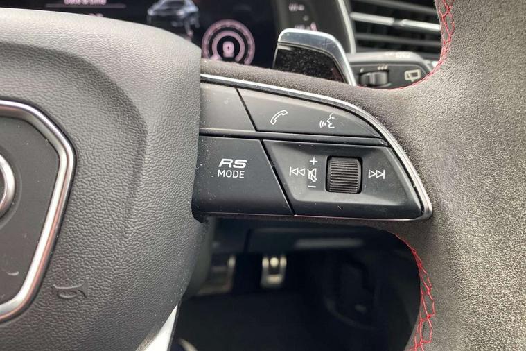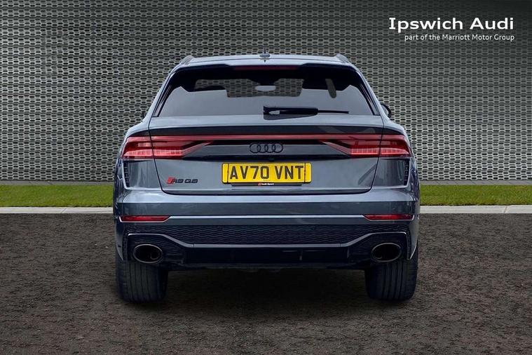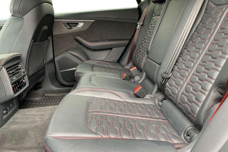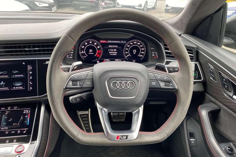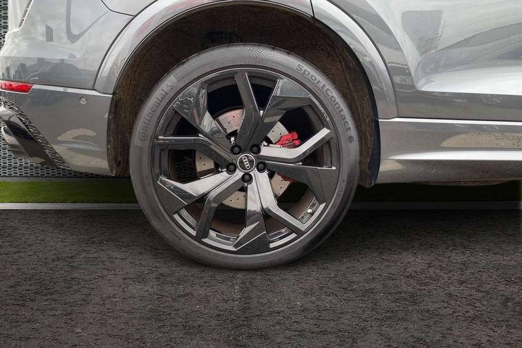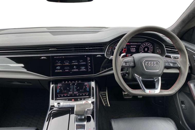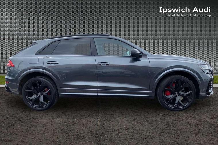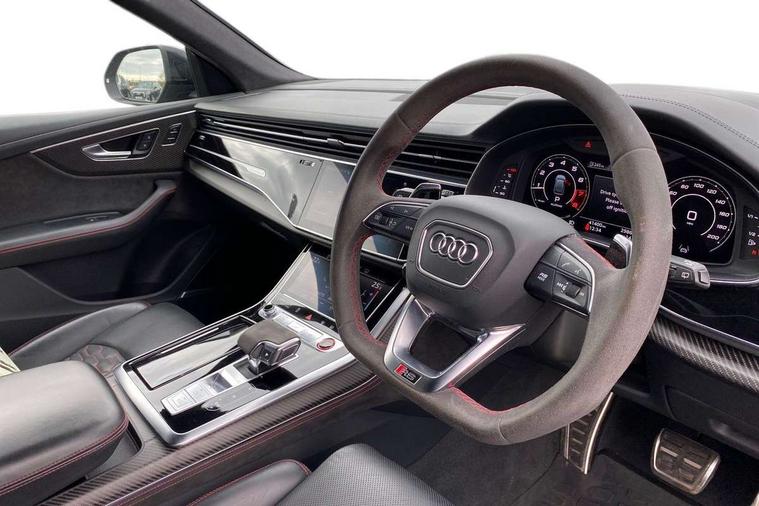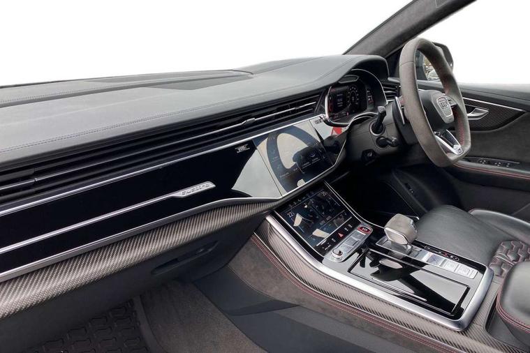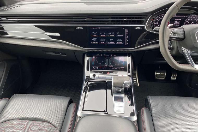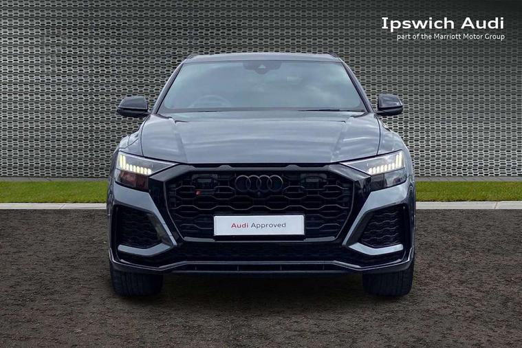 Air quality package - RS Q8, City assist pack - Q8, Comfort and sound pack - RS SQ8, Multi-coloured extended LED interior lighting pack - RS Q8, RS specific styling pack - RS Q8, Titanium black styling pack - RS Q8, Tour pack - Q8, 23" x 10.5J 5 Y spoke rotor design Audi sport alloy wheels in gloss anthracite black with diamond finish, Tyre repair kit, Advanced key, Anti theft alarm with tow away protection, Anti-theft wheel bolts and wheel loosening detection, Immobiliser, Audi music interface with 2 USB ports with charge and data functions, Audi music interface with 2 USB ports with charge and data functions in the rear, Aux-in socket, DAB Digital radio, 3 point seatbelts on all seats, Audi pre sense front, Driver and front passenger, front side and curtain airbags, Electromechanical parking brake, Electronic Stability Control (ESC) including ABS, ASR and EDL, Hill descent control, Hill hold assist, Predictive pedestrian protection, Seatbelt monitoring, Tyre pressure loss indicator, Warning triangle and first aid kit, Adaptive windscreen wipers with integrated washer jets, Audi Beam uses LEDs to project Vorsprung logo, Audi HD Matrix LED headlights in RS specific design with dynamic front and rear indicators, Auto dimming frameless rear view mirror, Electric front+rear windows, Electric panoramic glass sunroof, Electrically adjustable/heated/folding/dimming door mirrors with kerb view includes integrated LED indications + kerb view function for passenger side, Gloss black finish for exterior Audi rings and RS Q8 logo, Headlight washers, Heat insulating glass in windshield, Illuminated door sill trims with RS logo, LED signature daytime running lights, Privacy glass - dark tinted rear and rear side windows from B-pillar backwards, Rain and light sensors, Rear wiper, RS badges on front wings, RS coming/leaving home animations in front and rear, RS manhattan grey front spoiler lip and rear diffuser insert, RS specific bumpers in full body colour paint finish, RS sport exhaust system with black exhaust tips, 4 zone automatic climate control, 4-way lumbar support for front seats, 40:20:40 split folding rear bench seat, Black Alcantara headlining, Comfort front centre armrest, Double sun visor with illuminated vanity mirror on driver and passenger side extendable, Driver and front passenger seat memory function for electrically adjustable front seats, Electric adjustable steering column with memory functionality, Electric sunblind for the rear side windows and manual sunblind for the rear window, Front and rear head restraints, ISOFIX child seat mounting for front passenger seat and 2 outer rear seats with top tether child seat mounting for all 3 rear seats, Luggage compartment sill protection in stainless steel, Massage and ventilation function for front seats, Perforated Valcona leather upholstery + RS front super sports seats + honeycomb pattern with RS embossed logo, Rear seat bench plus, Stainless steel pedals, Tool kit, 10.1" and 8.6" Dual colour touchscreens, All wheel steering, Audi connect safety and service (e-call), Audi phone box with wireless charging, Audi smartphone interface with wireless Apple CarPlay, Audi virtual cockpit - 12.3" high resolution LCD display with fully customisable instrument cluster and RS specific menus and options, Automatic start/stop system, Electro-mechanical PAS, Head up Display, MMI navigation plus with MMI touch, Natural voice recognition, On board computer, Operating buttons in black, glass look with haptic feedback, Power door closure, Power operated tailgate, RS Audi drive select, Service interval indicator, 48V Mild hybrid technology, Electromechanical active roll stabilisation, Quattro all wheel drive with sport differential, RS specific Adaptive air suspension,