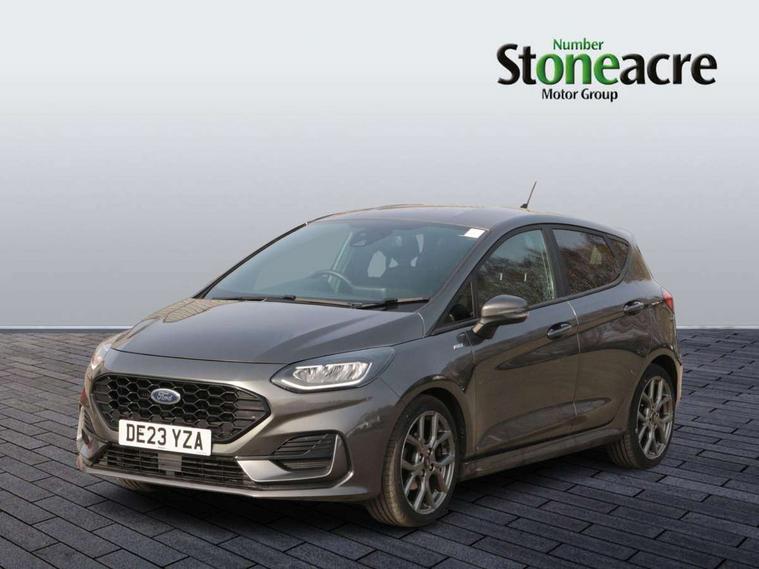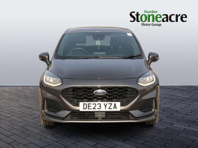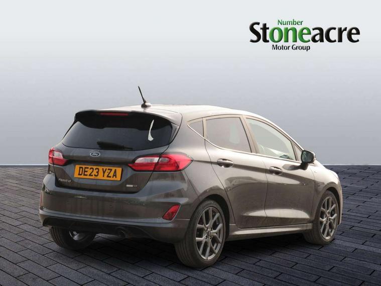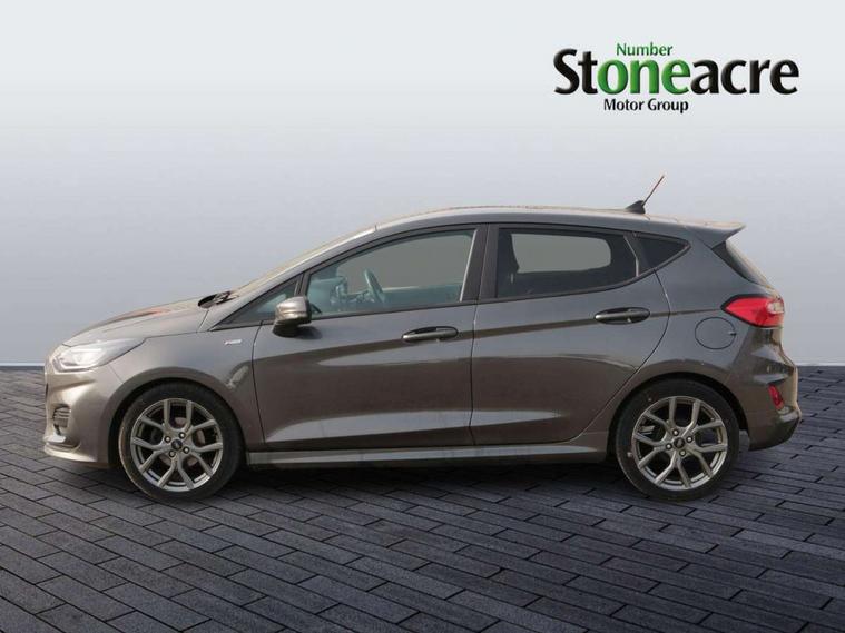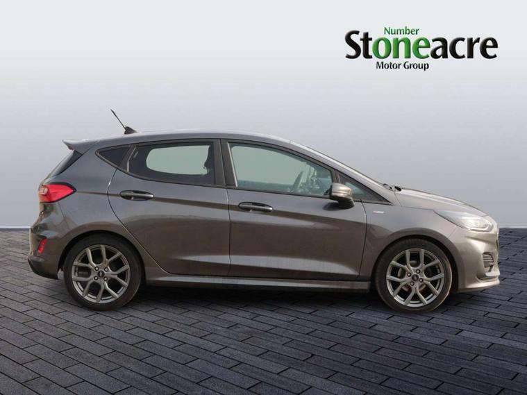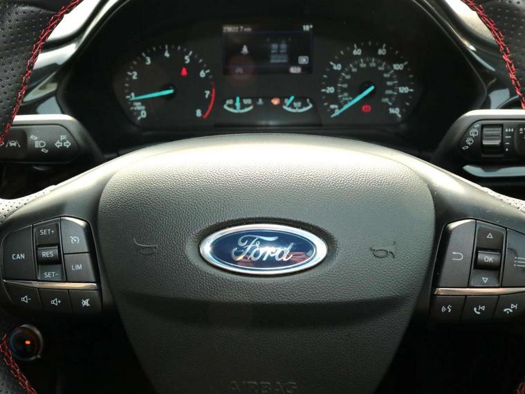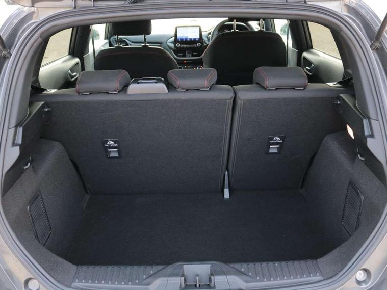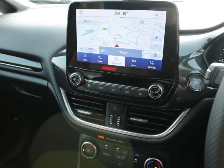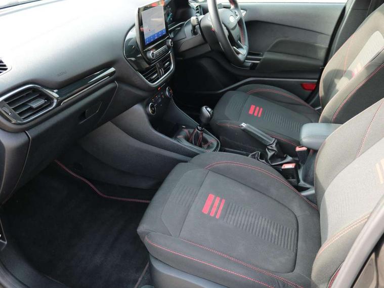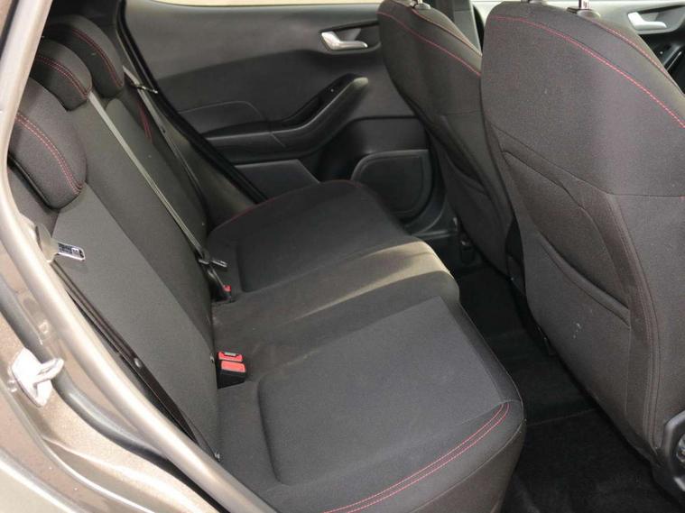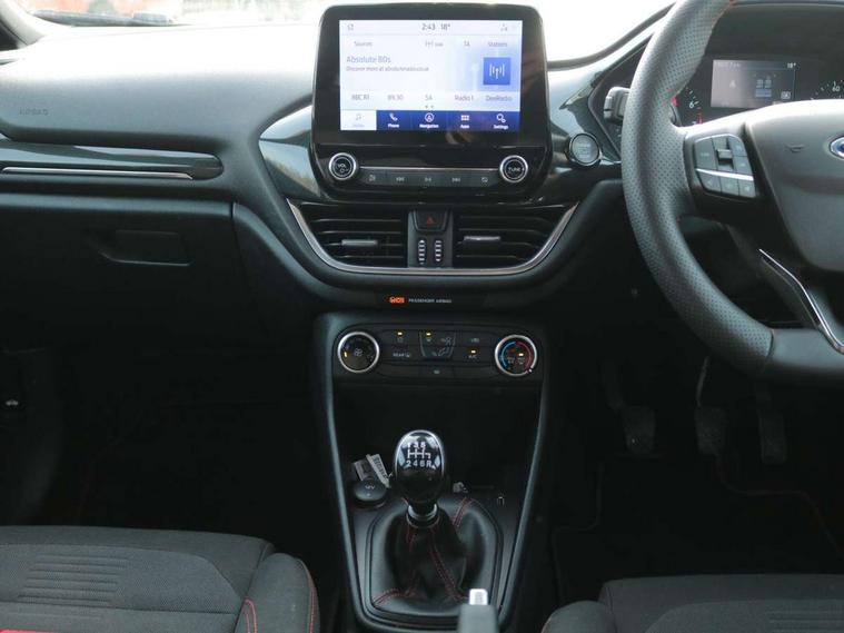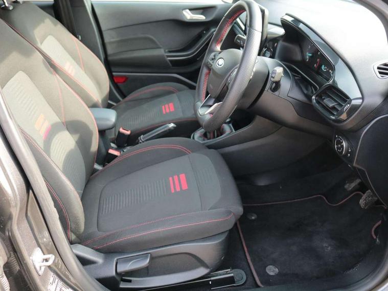 Bluetooth system, Electric power steering, Ford easy fuel, Ford SYNC 3 Navigation system incl 8" touchscreen, 7 speakers, FordPass connect, Apple carplay, android auto, voice control and emergency assistance, Rear parking distance sensors, Selectable drive modes (Normal, Sport, Track), Trip computer, Sports suspension, 2 USB ports, Auxiliary input socket, DAB Digital radio, Steering wheel mounted controls, Body colour bumpers, Body colour door handles, Body colour large rear spoiler, Body coloured electrically operated and heated door mirrors with side indicators, Cornering front fog lights, Electric front windows/one touch facility, Electric rear windows, LED Night signature to rear lights, Quickclear heated windscreen, Rain sensing wipers and auto dimming rear view mirror, Rear privacy glass, Rear wiper, Unique ST-Line upper grille & full bodystyling kit with ST-Line wing badges, 3 spoke flat bottomed leather steering wheel, 60/40 split folding rear seat, Adjustable head restraints, Black headlining, Boot carpet, Centre console with opening armrest, 2x cupholders, 12v and USB, Chrome inner door handles, Cloth upholstery, Footwell illumination, Front floor mats in velour, Front map reading lights, Front seat and rear pockets, Illuminated glovebox, Leather gaiter, Load area light, Manual 2 way passenger seat adjust, Manual 4-way driver seat adjust, Manual air conditioning, Overhead console with sunglasses holder, Pollen filter, Rake/reach adjustable steering wheel, Sensico wrapped steering wheel, Sports front seats, NCAP Pack - Fiesta, 3 point seatbelts on all rear seats, ABS+EBA, Curtain airbags, Driver and passenger airbags, Drivers knee airbag, Electronic stability control with hill start assist, Front passenger airbag deactivation, Front side airbags, Seatbelt warning, Two tone horn, Tyre pressure monitoring system, Keyless start with 'Ford Power' starter button, MyKey system, Remote central locking & engine immobiliser, Thatcham Cat.1 alarm, 17" 5 spoke alloy wheels with rock metallic finish,