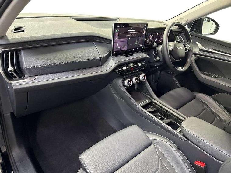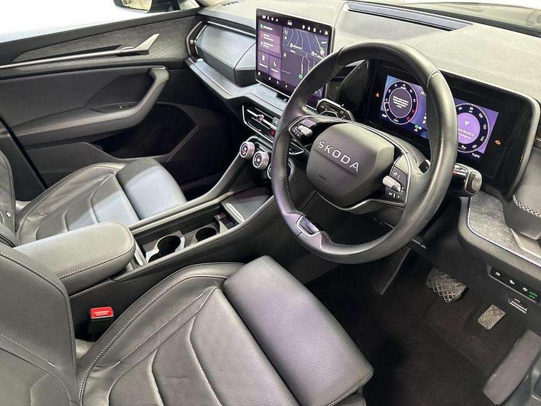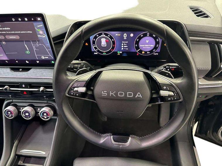 13" satellite navigation touchscreen display, Blind spot detection with door exit warning, Bluetooth system, ChatGPT functionality, Driver alert - Fatigue and drowsiness monitor, Dry display cleaner, Emergency call, Front and rear parking sensors, Front cross traffic assist, Lane assist, PAS, Rear traffic assist, Tailgate unlocking from outside, Traffic sign recognition, USB C Port x 2 in front centre console, Virtual Cockpit - 10.25" digital display, Voice control system, Wireless charging for two smartphones (15W) with cooling function, Wireless SmartLink for Apple CarPlay and Android Auto, Stop/start function, 2x USB-C in the rear, DAB Digital radio, Aero front windscreen wipers with intermittent function, Auto dimming rear view mirror, AWL (all weather lighting) and all weather light with cornering function, Black wheel arch surrounds, Body colour bumpers, Body colour door mirrors and handles, Cornering light and poor weather light, Electric folding /adjustable/separted heated/folding door mirrors, auto dimming with boarding sports and memory function, Electric front and rear windows, Exterior black decorative trims, Heat insulating glass in windshield, Heated rear window, Ice scraper in fuel tank cap, Invisible tailpipe, LED daytime running lights, LED third brake light in rear spoiler, Light assistant with automatic headlight control and coming home feature, Logo projection in door mirrors, Privacy glass, Rear roof spoiler, Rear side wing doors, Rear window wiper, Red decorative strip between rear LED lights, Safety reflectors on front and rear doors, Unique dark chrome design logo on alloy wheels, Window control switches with black trim, Windscreen wipers with rain sensor, Without engine designation, 1.5l bottle holder points in all door, 1x centre rear reading light, 2 seat bench in 3rd row, 3 configurable smart dials with 32mm coloured display, 3 seat bench in 2nd row, 4 foldable roof handles with rear coat hooks, Ambient interior lighting - Dashboard, front-door stowage compartments, front and rear door panels and footwell lighting, Automatic gear selector on steering column, Chrome interior door handles, Driver/front passenger reading lights, Fabric headlining, Fixed bench 40:60:40 split folding backrests, Front and rear floor mats, Front centre armrest with jumbo box storage compartment, cup holder and 12V socket, Height adjustable front headrests, Isofix child seat fittings in outer middle row rear seats and front passenger with top tether, Manually adjustable steering column, Pollen filter, Rear centre armrest with cupholders, Rear seat boot backrest release, Single front passenger seat, Skoda lettering on steering wheel, Storage pocket including mobile phone pockets on the backs of the front seats, Sunvisors with illuminated vanity mirrors, Three rear height adjustable headrests, Ticket holder on A Pillar, Tri zone climate control, Umbrella in door panel x1 made from sustainable materials, Upper and lower glovebox with card holder and coin compartment, USB C port by rear view mirror for charging only (15W), Exterior styling pack - Kodiaq, Auto door release and activation of warning lights in the event of an accident, Driver and front passenger airbag with knee airbag and front passenger airbag deactivation, Electric child locks, Electronic parking brake, ESC (incl. ABS+EMD+MSR+ASR+EDL+HBA+DSR+RBS+ESBS+MCB+TSA+XDS), Front assist with braking reaction to vehicles, pedestrians and cyclists, Front disc brakes, Fuel cut off safety device, Height adjustable front 3 point seatbelts + pretensioners, Hill hold assist, Junction assist with automatic emergency braking, Rear disc brakes, Safety vest holder in door, Seat belt reminder for all seats, Three point rear seat belts, Two tone horn, Tyre pressure monitor, Anti-theft wheel bolts, Immobiliser, Remote central locking with 2 keys,