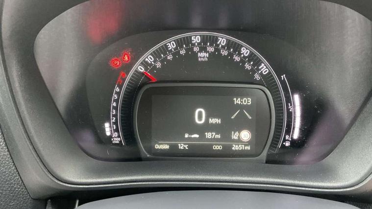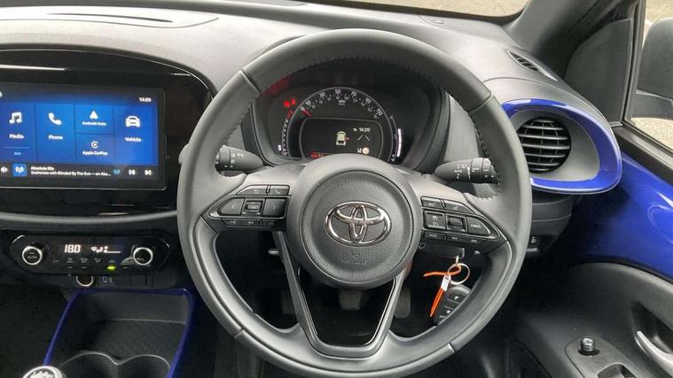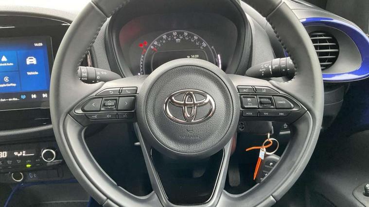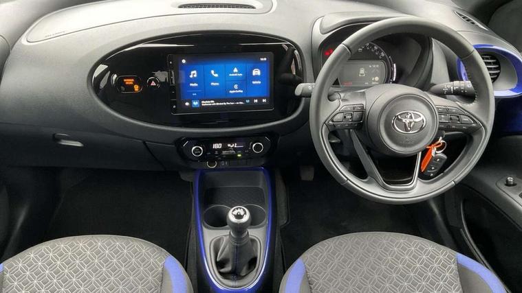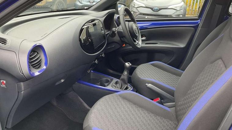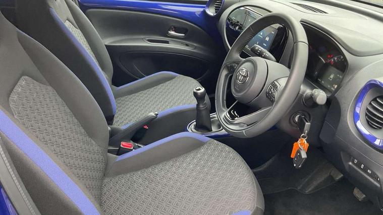 4.2" TFT colour screen, Adjustable speed limiter, Analogue speedometer, Bluetooth connectivity, Digital tachograph, Driver attention alert system, eCall emergency call system, Electric power steering, Intersection turn assist, Key reminder warning, Noise reduction kit, Pre collision system with emergency steering assist, Reversing camera with static guide lines, Smart phone integration with Apple car play/Android Auto, Speed limit display, Start and stop, Vehicle Stability Control (VSC), 4 speakers, 9" HD multimedia display touch screen with Toyota smart connect, DAB digital audio broadcast, USB connector, Auto headlights, Auto wipers, Automatic headlights cut-off, Bicycle towing hook, Black contrast roof, Black side protection mouldings, Black wheel arch mouldings, Body colour door handles, Body coloured front bumper, Boot door scuff plate, Eclipse black rear bumper, Electric heated door mirrors, Follow me home headlights, Front fog lights, Front power windows, Gloss black door mirrors, Gloss black upper front grille, Headlight cut-off reminder, LED daytime running lights, LED front light guide, LED High mounted stop lamp, Manual day/night rear view mirror, Manual headlight levelling, Pagoda roof, Power adjustable door mirrors, Power back door, Privacy glass, Projector halogen headlights, Rain sensor, Rear combination lights LED bulb type, Rear side wing doors, Rear windscreen defogger, Rear windscreen wiper, Short antenna, Variable intermittent windscreen wipers, 12v power outlet - front, 2 seat bench in 2nd row, 3 spoke leather steering wheel, 50/50 split folding rear seat, Adhesive roof headlining, Adjustable speed limiter switch on steering wheel, Audio and telephone switches on steering wheel, Auto air conditioning, Black insert on steering wheel, Black roof lining, Boot light, Centre room light, Chrome interior door handles, Chrome surround on air conditioning buttons, Clean air filter, Console box storage in body color, Fabric upholstery, Floor mats, Front and rear cup holders, Front head rest deco art, Front head restraints, Height adjustable driver seat, Intelligent adaptive cruise control switch on steering wheel, ISOFIX child restraint system on rear seats, Lane departure alert switch on steering wheel, Leather gearshift knob, Manual tilt steering wheel, Manually reclining and sliding driver seat, Manually reclining and sliding front passenger seat, Multimedia switches on steering wheel, Pollen filter, Rear door pockets, Rear head restraints, Satin silver insert on gear shift knob, Single compartment glovebox with lights, Single front passenger seat, Soft tonneau cover, Sun visors with mirror on driver and passenger side, Voice recognition switch on steering wheel, Toyota safety sense pack - Aygo X, Anti lock braking system + Electronic brake force distribution, Child safety door lock, Emergency brake light signal (EBS), Hill start assist control (HAC), Passenger airbag on/off switch, Seat belt reminder for front and rear seats, Supplement restraints system (SRS) - 6 airbags, Traction control, Tyre pressure warning system, Immobiliser, Remote power door locks, Black wheel centre caps, Tyre repair kit,