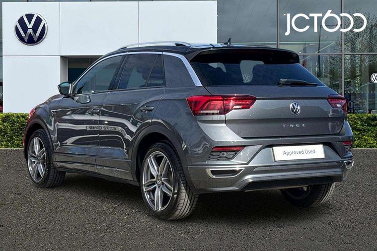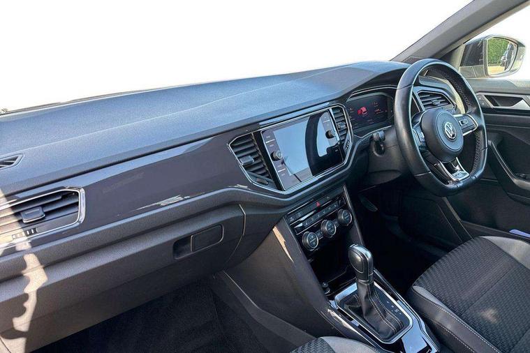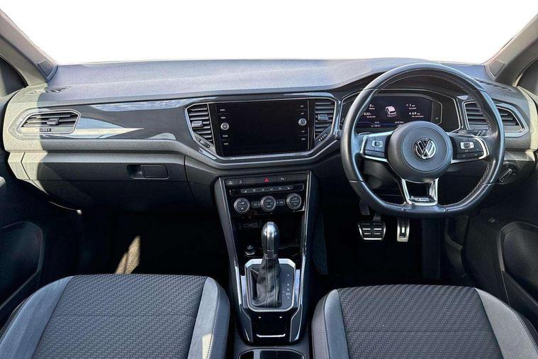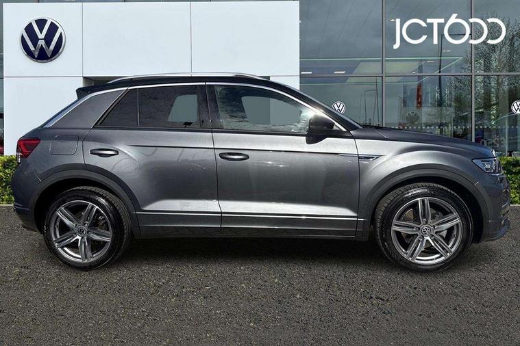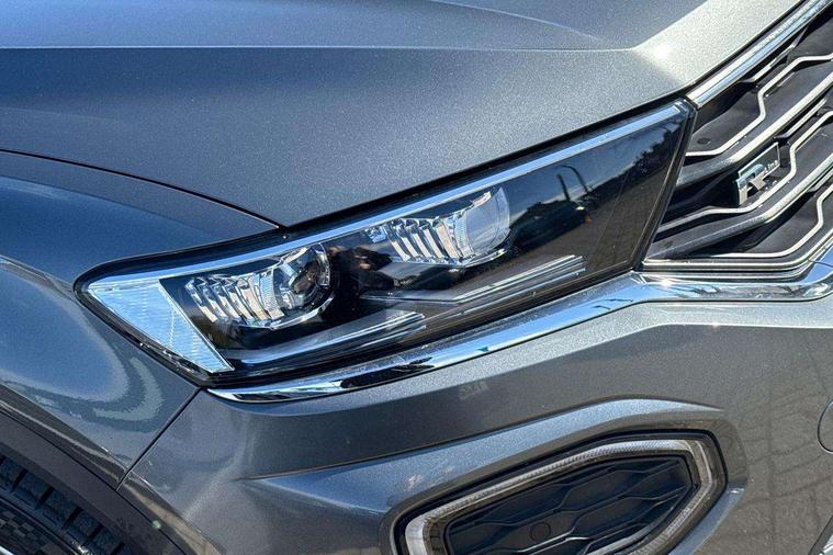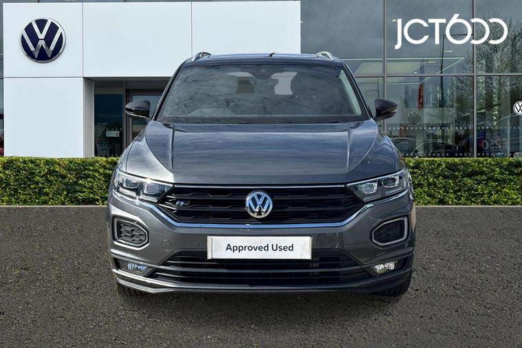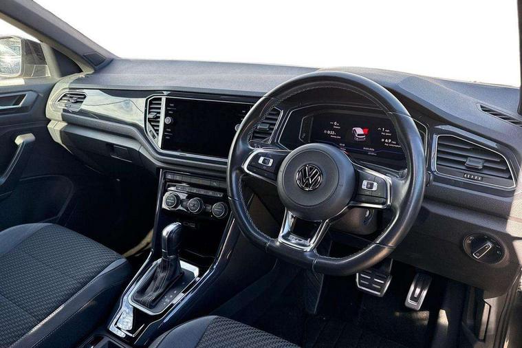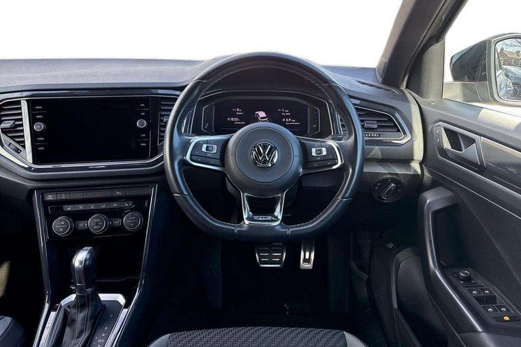 2 USB connection charging sockets, Active Info Display, 10.3" high resolution TFT dash display screen with customised information, Adaptive cruise control, App-Connect, Automatic start/stop system, Bluetooth telephone and audio connection for compatible devices, Car information display, Car-Net Security and Service, Discover navigation, 8" touch screen navigation/infotainment system with Car-Net, European map, CD/radio, 2D/3D map and speed limiter, Driver alert system with audible and visual fatigue detection system, Driver profile selection, Front assist, radar sensor controlled distance monitor, city emergency braking + predictive pedestrian protection, Lane assist, Multifunction computer with visual gear change recommendation for fuel consumption, Progressive power assisted steering, Service interval indicator, Think blue trainer driver tips and journey analysis, Voice activation, Warning sound and light for doors and tailgate open, Warning sound and light for front seatbelts unfastened, Battery regeneration during braking, Misfuel prevention device for diesel engine, Bluetooth - Simultaneous pairing of 2 compatible mobile devices, DAB Digital radio, Dynamic navigation based on TMC+, Multi device interface (MDI) with USB connection, Music playback - MP3, WMA and AAC files, Premium USB cable in choice of either Apple or Android smartphone compatibility, SD card slot, SMS functionality - read, compose and send SMS messages using touch-screen display, Three route options - Fast, Short, Eco, Title and cover art display, Auto dimming interior rear view mirror, Automatic hazard lights activation under emergency braking, Black grained lower door protectors, Black grained wheel arches, Body colour door handles, Body colour rear roof spoiler, Chrome effect left and right trapezoid exhaust tailpipe fascia surround, Chrome trim on upper and lower radiator grille, Door mirror integrated indicators, Dusk sensor, Electrically foldable, adjustable and heated door mirrors with puddle lights and reverse activated kerb-view adjustment on passenger's door mirror, Front and rear electric windows, Front fog lights with static cornering function, Front windscreen wiper with intermittent wipe and 4 position delay, Fully galvanised body, Heated rear window, High level 3rd brake light, LED darkened rear light clusters, LED rear number plate lights, Manual coming/automatic leaving home lighting function, Rain sensor, Rear tinted glass from B-pillar backwards approx 65% tinted, Rear windscreen washer and wiper with interval delay, 12V socket in centre console storage area, 2 LED front and rear reading lights, 3 rear head restraints, 4 load lashing points in luggage compartment, Aluminium pedals, Ambient lighting in front footwell and light strips below trim in front doors, Black decorative sleeve on gear handles, Black roof lining and sun visors, Carbon flag cloth upholstery, Climate control - 2 zone electronic air conditioning with automatic air recirculation and allergy filter, Drawer under drivers seat, Front + rear carpet mats, Front centre armrest with storage compartment, longitudinal and height adjustable and two rear air vents, Front cupholders x 2, Front footwell illumination, Front seat back storage pockets, Front sport seats, Glovebox, Height adjustable front seats, Height/reach adjust steering wheel, Illuminated vanity mirrors, Instrument lighting, white adjustable panel illumination, Interior light delay, Isofix easy fit child seat preparation for 2 outer rear seats, Load through provision with single cup holder when folded down, Luggage compartment cover, removable, Luggage compartment lighting, R Line badge, Split folding rear seat backrests with centre armrest, Storage compartment in left and right luggage area, Storage compartment in rear doors, Storage compartments in driver and front passenger doors, Three spoke multi function leather trimmed steering wheel and gear knob including paddle shift, Unique R Line door sill protectors, R line styling pack - T-Roc, Winter pack - T-Roc, 3 rear three point seatbelts, ABS, Driver and front passenger safety-optimised head restraints, Electronic parking brake with auto hold, ESC with EDL, ASR, EDTC and trailer stabilisation function, Front and rear curtain airbags, driver and front passenger airbags with passenger deactivation switch and front side impact airbags, Rigid safety cell with front and rear crumple zones, Three point height adjust front seatbelts + pretensioners, Tyre pressure loss indicator, Ventilated front and rear disc brakes, Volkswagen roadside assistance, Alarm with remote central locking and interior protection, Electronic engine immobiliser, Remote central locking with 2 remote folding keys, Shadow steel decorative inserts in dash and door panel, 19" Suzuka alloy wheels with low rolling resistance tyres and anti wheel bolts, Steel space saver spare wheel,