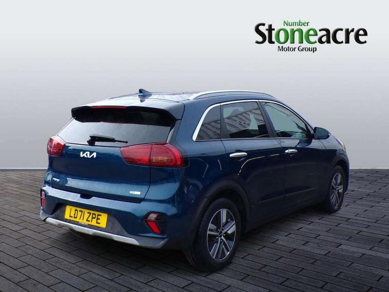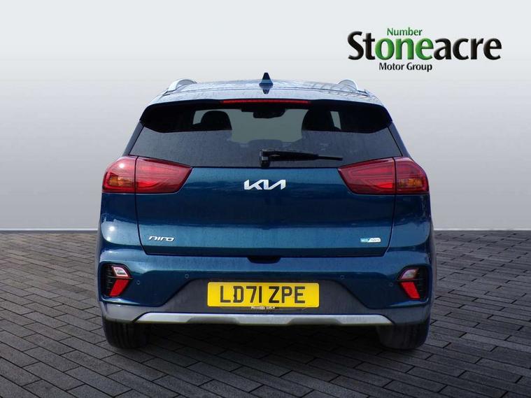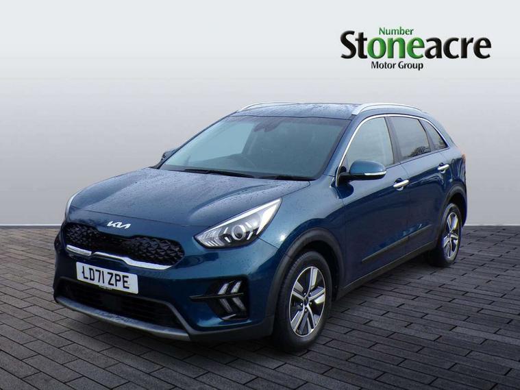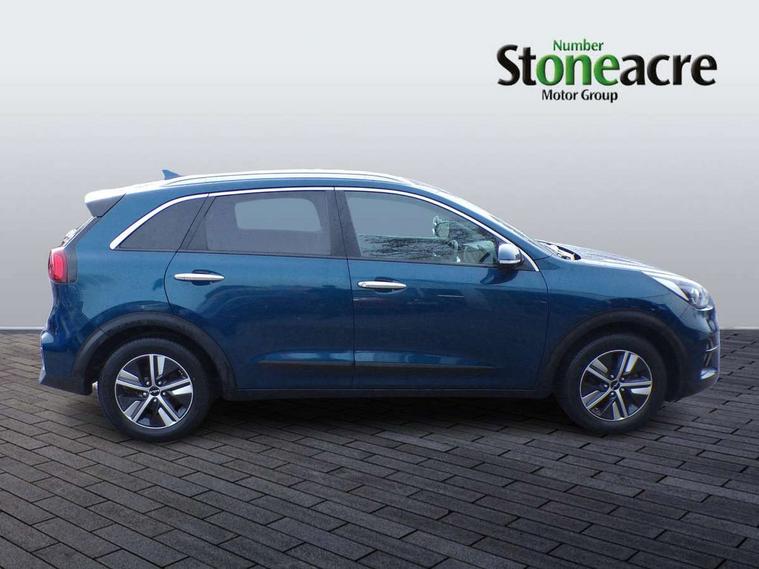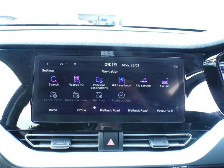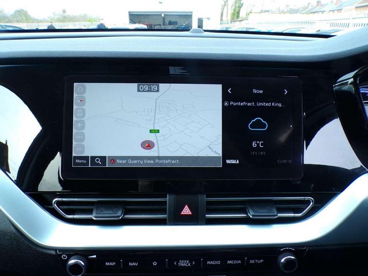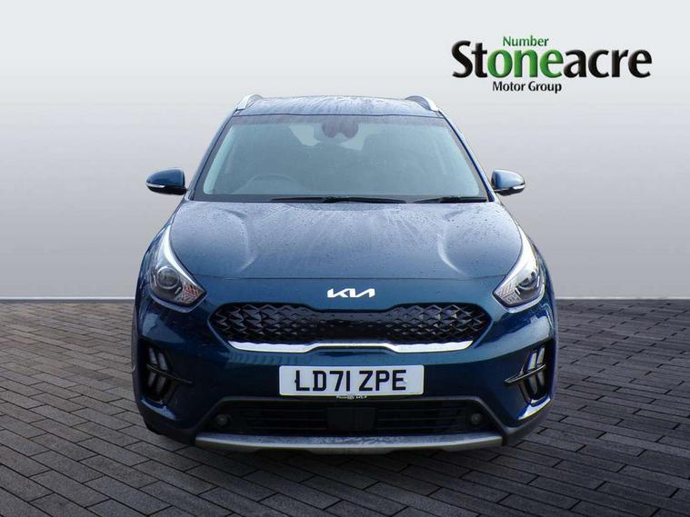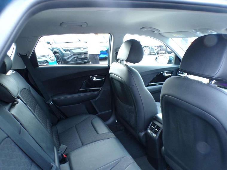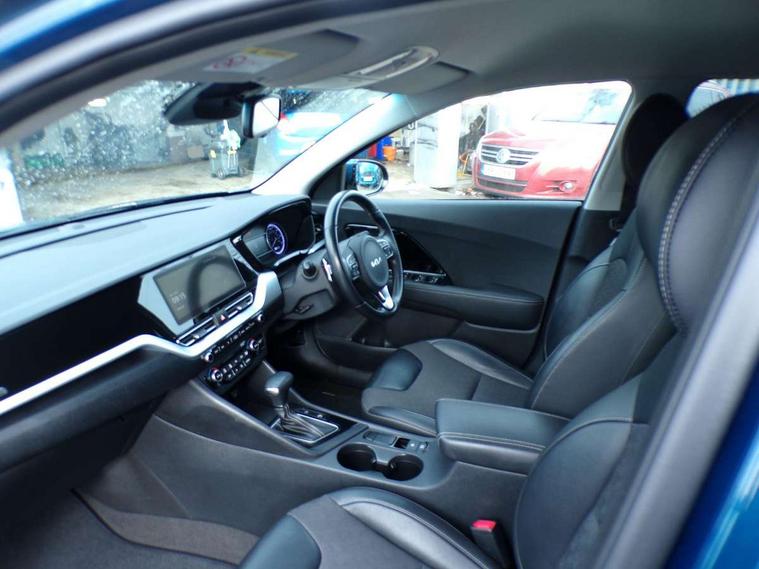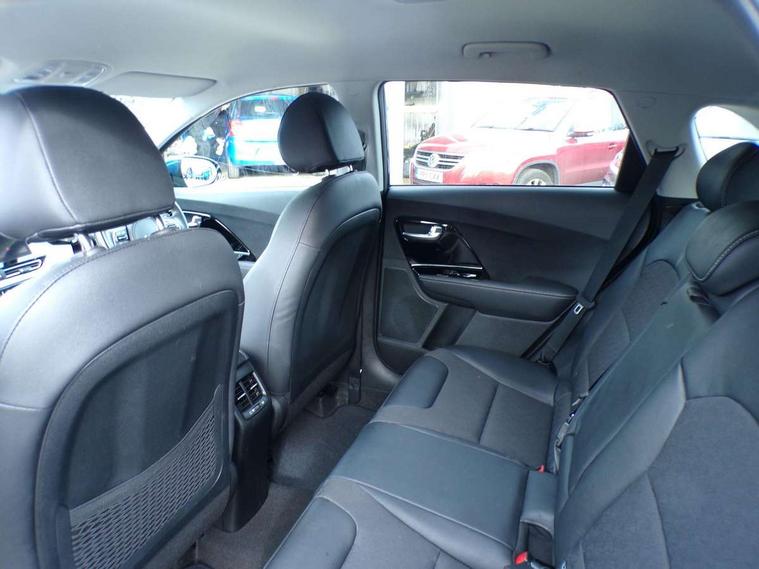 10.25" Touch screen satellite navigation with european mapping and traffic messaging channel, Adaptive smart cruise control function (SCC) with stop and go, Apple car play/Android Auto with voice control, Digital clock, Drive mode selector, Driver attention warning, Emergency stop signalling system, Forward collision avoidance assist, Kia connected services featuring TomTom live, Lane Following Assist (LFA), Lane keep assist, Motor driven power steering, Rear parking sensors, Reversing camera, Speed limiter, Trip computer with distance/fuel consumption/average speed, UVO connect, 'Shark fin' mobile antenna, 4.2" supervision cluster with TFT colour display, 6 speakers, Bluetooth with music streaming, DAB Radio with MP3, Steering wheel mounted controls, USB connection located in centre console, USB port, All round electric windows with drivers auto up/down function, Auto dimming rear view mirror, Automatic defog system, Automatic headlight control system, Black beltline mouldings, Black side sills, Black wheel arch mouldings, Body colour bumpers, Body coloured/high gloss door mirrors, Chrome door handles, Driver's side wide angle mirror, Electrically folding/adjustable/heated door mirrors with LED indicators, Front fog lights, LED daytime running lights, LED rear combination lights, Manual headlight levelling, Matt black radiator grille, Privacy glass - Rear windows and tailgate, Projector headlamps, Rain sensing front wipers, Rear spoiler, Rear wiper, Roof rails, Solar glass, Waistline black paint, Welcome and follow-me home light functionality, 3 x passenger assist grips, 60/40 split/folding 2nd row of seats, All-round height adjustable headrests, Bulb type overhead console lamp with sunglasses case, Centre console storage box, Centre room lamp, Cloth/leather upholstery, Cupholders in rear armrest, Driver's seat height adjuster, Driver/passenger sunvisors with illuminated vanity mirrors, Dual zone automatic air conditioning, Front and rear door storage, Front/rear centre armrests, Headlining in Light grey, High gloss black lower console trim, High gloss black steering wheel trim, Illuminated ignition key hole, Interior door lock/unlock function, ISOFIX Child seat top tethers and anchor fixings, Leather trimmed door armrests, Leather trimmed steering wheel, Leather trimmed steering wheel and gearshift, Luggage area lamp, Luggage area load cover, Luggage net with hooks, Paddle shifts, Passenger seat height adjuster, Satin finish inner door handles, Seatback pocket - front passenger, Tilt/telescopic adjustable steering wheel, Under floor storage box, Ventiliation ducts to rear compartment, Towing pack - Niro, 3 point seatbelts on all seats, ABS, Automatic unlocking of doors in case of impact, Drivers knee airbag, Electric parking brake with auto hold function, Electronic stability control, Front passenger airbag cut-off switch, Height adjustable front seatbelts, Hill start assist control (HAC), Traction control, Twin curtain airbags with roll over sensor, Twin front and side airbags, Tyre pressure monitoring system, Alarm system and engine immobiliser, Deadlocks, Locking wheel nuts, Remote central door locking with fold away key, Speed sensitive auto door locking, Visible vehicle identification number, High gloss black centre fascia, High gloss black door inserts, 16" alloy wheels, Tyre mobility kit,