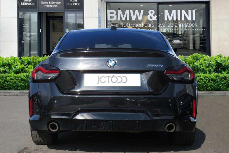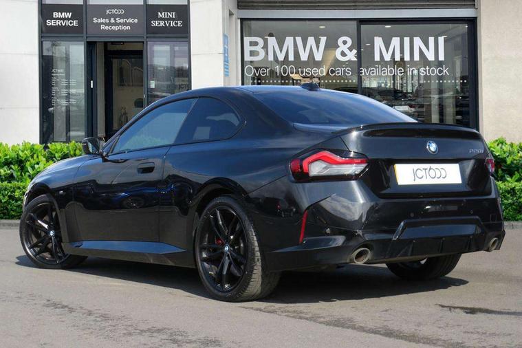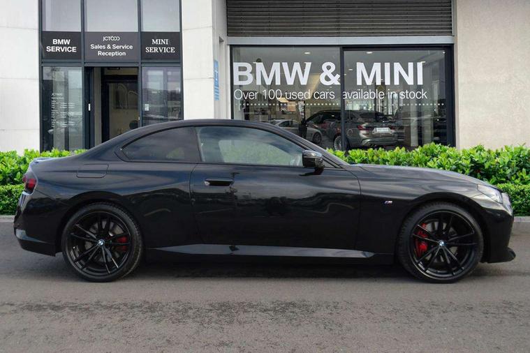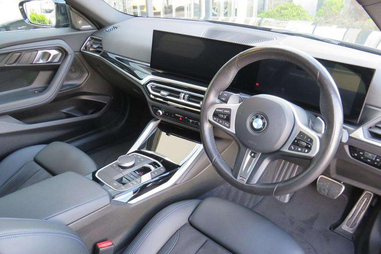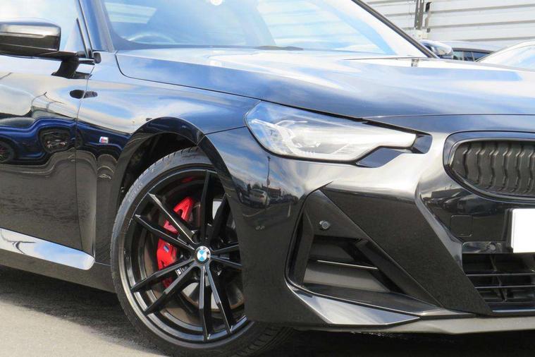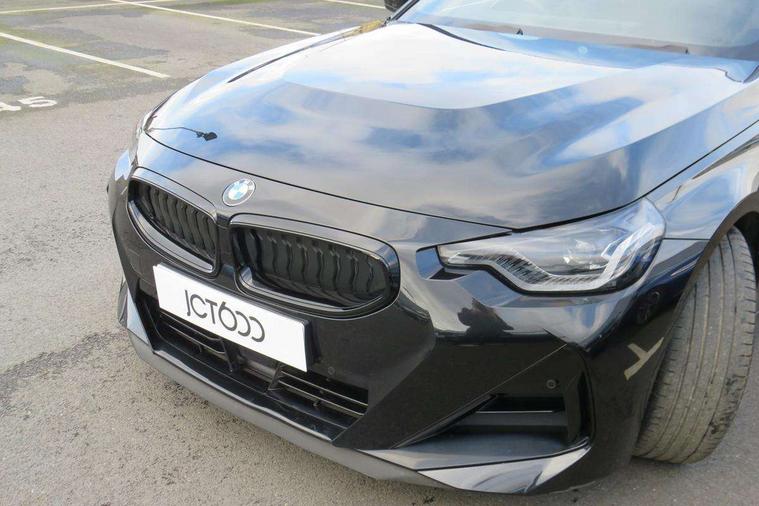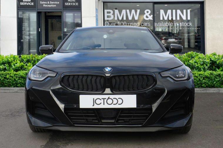2 USB connections for charging and transferring data, 4G LTE connectivity with hard wired 4G network sim card, Attentiveness assist, Bluetooth with USB, BMW ConnectedDrive online services, BMW Intelligent Personal Assistant, BMW operating system 8 with variable, configurable widgets display information in real time, BMW Teleservices, Check Control warning system for monitoring of lights and door/luggage compartment open warning, Direct selection buttons, Drive off assistant, Eco pro mode, Electric power steering, Front and rear parking sensors, Front/rear Parking distance control, iDrive controller with turn and press function, Integrated owners handbook, Intelligent functions, Live cockpit plus with nav function 12.3" instrument cluster and 14.9" centre display, Oil sensor for level and grade, Optimum shift indicator, Personal Profile, Touch operation on control display, Variable sport steering, Widescreen multi-media display, WiFi interface for wireless connection of mobile terminal devices, Aluminium lightweight construction, Balancer shaft, BMW TwinPower Turbo four-cylinder petrol engine, Double VANOS, Drive performance control with ECO PRO comfort + sport mode, Electronic differential lock, High precision injection, M sport suspension, Petrol Particulate Filter, Sport automatic steptronic transmission with gearshift paddles, manual gearshift time display, launch control, coasting idle ECO PRO/COMFORT modes, Twin scroll turbocharger with Valvetronic, DAB tuner, Acoustic windscreen wipers for reduced driving noise, Adaptive LED Headlights, Automatic windscreen wipers and automatic headlight, Automatically dimming rear view mirror, Body colour door handles flush with door surface, Body colour door mirrors, Body colour front and rear bumpers, Daytime running lights, Electric windows - front and rear, with open/close fingertip control and trap release, Exhaust tailpipes x2 - 90mm in left and right, Fading support, Front and rear bumper system with replaceable deformation elements, Front door sill finishers in black plastic with BMW designation, Front windscreen wipers with integrated washer jets, Green tinted heat protection glazing, High beam assistant, High gloss black sill, bumper trim sides and diffuser insert, High gloss shadowline exterior trim in mirror triangle cover, mirror cover panel, mirror bezel and window border, High level third brake light, Indicators integrated int mirror housing, LED registration plate light, LED technology rear tail lights, brake lights and turn indicators, Lightweight engineering, Model designation on right side of tailgate, One piece kidney grille with hight gloss chrome surround, Rear boot, Rear fog lights, Reversing light in rear light cluster, Shark fin antenna, Single part LED rear lights with smoked glass components, Trailer stabilisation logic, Visible VIN plate, 12V power socket in front centre console with blanking plug, 2 cupholders in front centre console, 2 zone automatic air conditioning, Ambient lighting, Compartment in front of cupholder, Conditioned based service, Driver seat backrest width adjustment, Front and rear side armrests integrated into door trim, Front armrest, Front door pockets, Front head restraints, Front sport seats, Heated front seats, Illuminated glove compartment with separate small compartment, M headliner Anthracite, M sport leather steering wheel, Manually adjustment steering wheel column, Rear seat backrest with manual 40:20:40 split folding, Rear seat centre foldable armrest with integrated cup holder, Single front passenger seat, Storage compartment between rear seats, Storage tray and compartment with cover in centre console, Sun visors with vanity mirrors and insert tab, Through loading system with 40/20/40 split folding 2 rear seat in 2nd row, Two folding rear seat headrests, Velour floor mats, Additional storage compartment pack without USB - 2 Series Coupe, Connected pack professional - 2 Series Coupe, Interior and exterior mirror pack - 2 Series Coupe, M Sport exterior styling aerodynamics pack - 2 Series Coupe, 2 tone horn, Anti lock braking system (ABS) with cornering brake control, Automatic Stability Control (ASC), BMW emergency call, Brake drying, Child seat ISOFIX attachment for the two outer rear seats, Crash sensor activating of airbags, Unlocking doors, hazard warning lights, interior light, safety battery terminal, Deactivation of fuel pump in the event of a crash, Driver and front passenger airbags, Driver and front passenger side airbags, integrated in the door side seat backrest bolsters for all seat variants, Dynamic brake control, Dynamic stability control + (DSC+), Dynamic Traction Control - DTC, Electrically operated hand brake including automatic hold function and automatic release when driving off, Front and rear disc brakes, Head airbags for all 4 outer seats, Manual deactivation of front passenger airbag, Seat belt security check for driver and front passenger, Seatbelt warning, Side impact protection, Three point seat belts on 4 seats including front belt stopper, pyrotechnic belt tensioners and belt force limiters, Tyre pressure sensor, Warning triangle and first aid kit, Alarm system (Thatcham 1) with remote control and electronic engine immobiliser, Central locking switch for all doors, fuel filler cap and luggage compartment, Deadlocking function system to all doors, Drive away locking system on all doors and luggage compartment, Locking wheel bolts, Start/Stop button (illuminated) in centre console with keyless engine start and Auto Start-Stop deactivation button, Two remote control key with integrated key - one button for open and close doors/fuel flap/tailgate and separate button for unlock luggage compartment, BMW mobility tyre sealing system, Electrically powered 12V compressor, Reduced rolling resistance tyres,