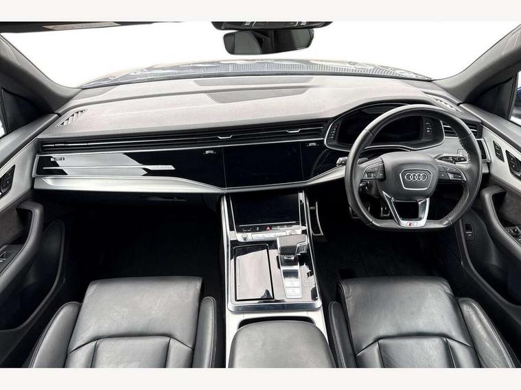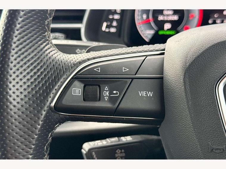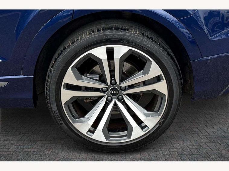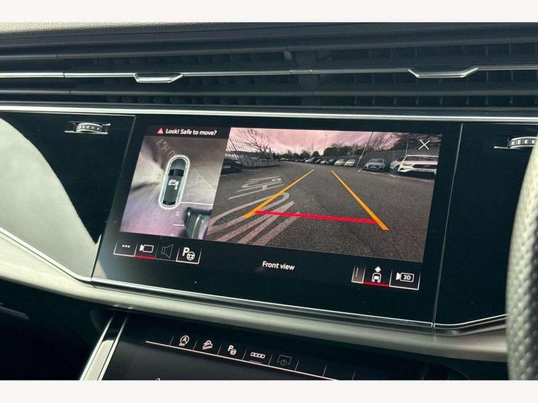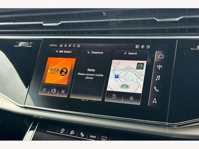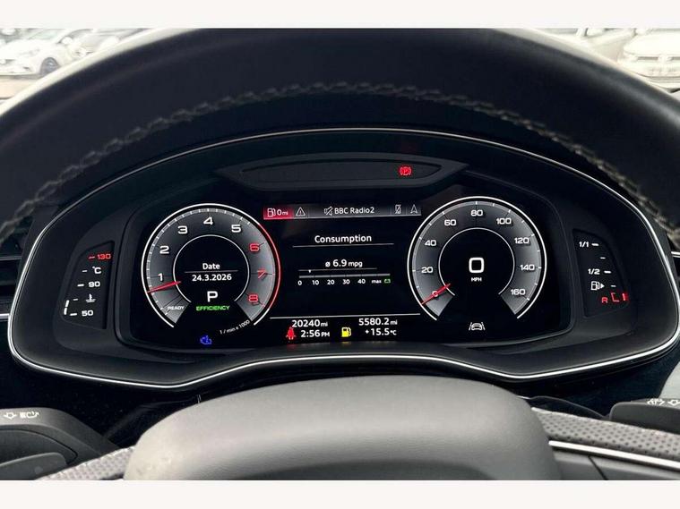 10.1" and 8.6" Dual colour touchscreens, Audi connect safety and service (e-call), Audi connect with Amazon Alexa Integration, Audi drive select, Audi parking system plus includes 360 degree display with front and rear sensors, Audi virtual cockpit - 12.3" high resolution LCD display with fully customisable instrument cluster, Automatic start/stop system, Electro-mechanical PAS, Low washer fluid indicator, MMI - Multi Media Interface control system, MMI navigation plus with MMI touch, Natural voice recognition, On board computer, Operating buttons in black, glass look with haptic feedback, Power operated tailgate, Rear view camera, Service interval indicator, Smartphone interface includes wireless Apple carplay/Android Auto, 48V Mild hybrid technology, 85 litre fuel tank, Adaptive sport air suspension, Quattro all wheel drive with self locking centre differential, Audi music interface with 2 USB ports with charge and data functions, Audi sound system with 6 channel amplifier, 180 watt amplifying capacity and 10 loudspeakers including subwoofer, Aux-in socket, DAB Digital radio, 3rd brake light, Acoustic windscreen, Aluminium window trim, Audi HD Matrix LED headlights with dynamic front and rear indicators, Auto dimming frameless rear view mirror, Body colour door mirrors, Coming/leaving home lighting function, Electric front+rear windows, Electrically folding auto dimming/adjustable/heated door mirrors with memory function, LED side indicators and kerb view function for passenger side, Headlight washers, Heat insulating glass in windshield, Illuminated door sill trims with S line logo, LED signature daytime running lights, Platinum grey front spoiler lip and diffuser insert with honeycomb grille in black, Privacy glass - dark tinted rear and rear side windows from B-pillar backwards, Rain and light sensors, Rear side wing doors, Rear wiper, S line badges on front wings, S Line body styling, S line bumpers in full body colour paint finish, S line roof spoiler, S Line side skirts, S line side ventilation grille, 2 zone automatic climate control, 3 bench rear seats in 2nd row, 4-way lumbar support for front seats, 40:20:40 split folding rear bench seat, Black cloth headlining, Comfort front centre armrest, Driver seat memory function, Electrically adjustable front seats, Front head restraints, Front/rear floor mats, Heated front seats, ISOFIX child seat mounting for front passenger seat and 2 outer rear seats with top tether child seat mounting for all 3 rear seats, LED interior ambient lighting, Luggage compartment sill protection in stainless steel, Rear centre armrest with 2 cupholders, Rear headrests, Single front passenger seat, Stainless steel pedals, Sunvisors with illuminated vanity mirrors, 3 point seatbelts on all seats, Audi pre sense front, Child locks on rear doors, Driver and front passenger, front side and curtain airbags, Electromechanical parking brake, Electronic Stability Control (ESC) including ABS, ASR and EDL, Front passenger airbag deactivation, Hill descent control, Hill hold assist, Predictive pedestrian protection, Seatbelt monitoring, Traction control, Tyre pressure loss indicator, Warning triangle and first aid kit, Anti theft alarm with tow away protection, Anti-theft wheel bolts and wheel loosening detection, Immobiliser, Keyless go with remote central locking, Dark matt brushed aluminium inlay, Tool kit, Tyre repair kit,