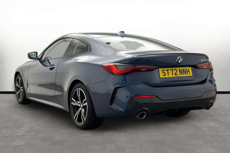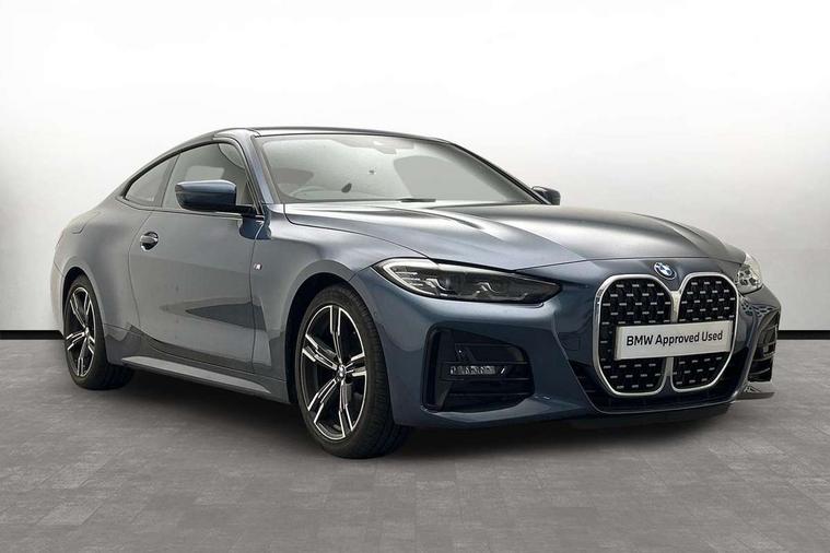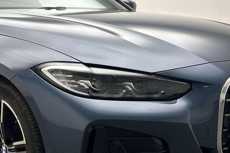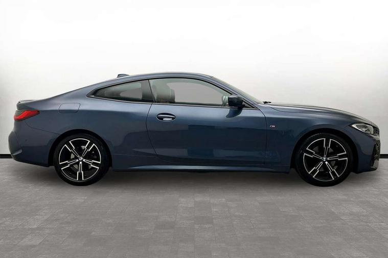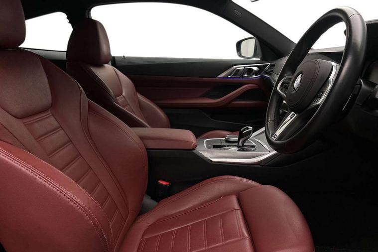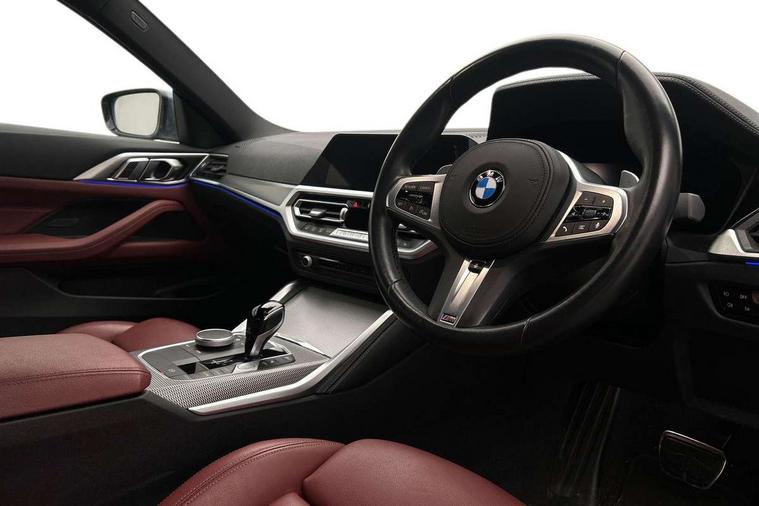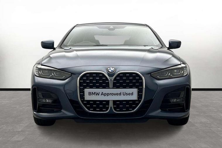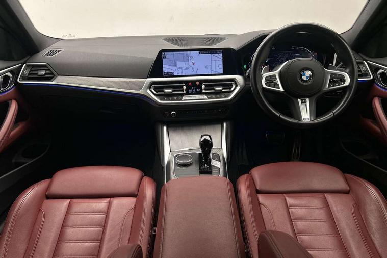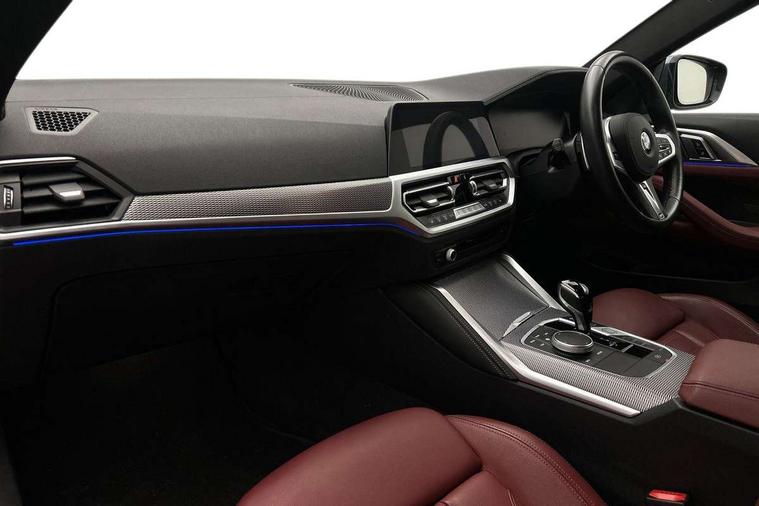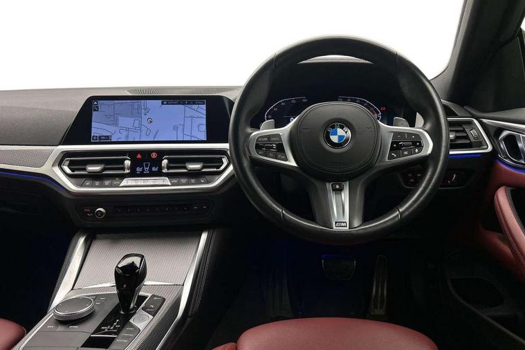 Active guard plus, Attentiveness assist, Auto start-stop, BMW ConnectedDrive online services, BMW iDrive controller on centre console, BMW Live Cockpit Professional Nav with 12.3" instrument display + 10.25" display, Intelligent Voice Assist, BMW OS 7, HDD, 2USB, 4G LTE connect, BMW service history, BMW Teleservices, Brake pad wear indicator in front and rear, Check Control warning system for monitoring of lights and door/luggage compartment open warning, Condition based service, Cruise control with speed limit function, Electric power steering with Servotronic steering optimised at all speed ranges, Gearshift time display in manual mode, Instrument cluster with speedometer with mph readout, tachometer, fuel gauge and oil temperature gauge, Integrated owners handbook, Oil sensor for level and grade, warning by check control system, On board computer - average speed, fuel consumption, outside temp display with acoustic warning, clock/date, service interval, odometer/trip meter, Optimum shift indicator, Run flat indicator, Shifting point display, Touch control functionality for BMW Live Cockpit Professional Nav, Variable sport steering, 8 speed automatic steptronic transmission with gearshift paddles, Balanced 50/50 weight distribution, Double joint spring strut front axle, Double VANOS, Drive performance control - ECO PRO, comfort and sport modes, Electronic differential lock control (EDLC), High precision injection, Low centre of gravity, M sport suspension, Petrol Particulate Filter, Stroke dependent dampers, VALVETRONIC engine management, 2x USB Type C ports in front centre console for charging and data transfer, 2x USB Type C ports in rear centre console for charging, DAB tuner, Electronic service booklet, Acoustic glazing, Automatic headlight beam throw control with load dependent regulating reaction, dynamic compensation of braking dive and acceleration squat, Automatic windscreen wipers and automatic headlight, Automatically dimming electrochromatic rear view mirror, BMW emblem on engine compartment lid and tailgate, BMW kidney grille with mesh grille front side of the nuggets in matt aluminium and frame in chrome high gloss, Body colour fuel filler flap, Body colour roof fin, Brushed aluminium inserts in the front door sill finishers with BMW designation, Door sill strips, Dynamic brake lights, Electric windows - front and rear, with open/close fingertip control, anti trap facility and comfort closing function all round, Exterior mirrors - electrically folding with anti-dazzle, Fading support, Follow me home headlights, Front and rear bumper system, Front apron plastic in body colour, Green tinted heat protection glazing, High gloss shadow line exterior trim, Illuminated bow type door handles in body colour drivers side with door lock, Interior rear view electrochromatic mirror with automatic anti dazzle function, LED daytime running lights, LED front fog lights, LED front indicators, Licence plate panel integrated into front bumper and tailgate, Lightweight engineering, M designation on front side panels, left and right, M rear boot spoiler, Model designation on right side of tailgate, One piece front bumper cover including towing eye cover in body colour, Preparation for high beam assistant, Rear boot, Reversing light, Side frame decorative moulding black matt, Two part LED tailights in L-shape with components in smoked glass, brake light, LED turn indicator and rear fog light, Visible exhaust tailpipe finisher, Visible VIN plate, Welcome lights in interior and door handle area, Widened track and increased camber values for max transverse dynamics, agility and steering precision, Window recess cover black high gloss, Windscreen wipers with integrated heated washing jets, 12V power socket in front centre console, 2 front cupholder in centre console with clamping elements and matt black inlay, 2 Rear seat headrests, 2 seat bench in second row, 3 spoke M sport leather multifunction steering wheel, 3 zone automatic air conditioning, 4 pieces lashing eyelets in luggage compartment, 40:20:40 split folding rear seat and rear centre armrest with two cupholders, Anthracite headlining, Armrest integrated in front and rear door trim + front centre console armrest, BMW ID, Driver seat backrest width adjustment, Four grab handles integrated in roof lining, Front and rear door pockets, Front and rear reading lights, Front sport seats, Heated driver and front passenger seats, Height adjustable front headrests, Height adjustable mechanically and infinitely variable steering column, Illuminated armrest storage compartment, Illuminated glove compartment with separate small compartment, Make-up mirror lights, Single front passenger seat, Storage compartment in rear centre console, Sunvisors with illuminated vanity mirrors and ticket pocket, Toolkit located in luggage compartment, Velour front floor mats, Vernasca leather upholstery, Ambient lighting pack - 4 Series, Connected professional pack - 4 Series, M sport exterior styling pack - 4 Series, 2 x 3-point rear seatbelts, Battery safety cut-off, BMW emergency call, Brake energy regeneration, Braking pre-tensioning, Child seat ISOFIX attachment for the two outer rear seats, Coasting in idle in ECO PRO mode, Cornering brake control (CBC), Crash sensor activating of airbags, Unlocking doors, hazard warning lights, interior light, safety battery terminal, Driver and front passenger side airbags, integrated in the door side seat backrest bolsters for all seat variants, Driver/Front Passenger airbags, Dry braking, Dynamic brake control, Dynamic stability control + (DSC+) - Anti-lock Braking System (ABS) with brake assist and cornering brake control + Automatic Stability Control (ASC), Dynamic Traction Control - DTC, Electric parking brake including automatic hold function and automatic release of the parking brake when driving off, Front and rear ventilated brake disc, Front passenger manual airbag deactivation, Head airbags for all 4 outer seats, Hil
