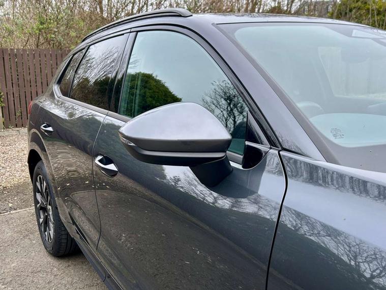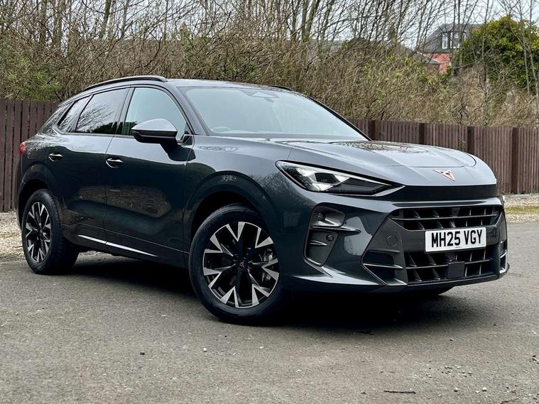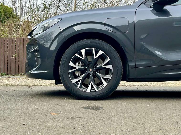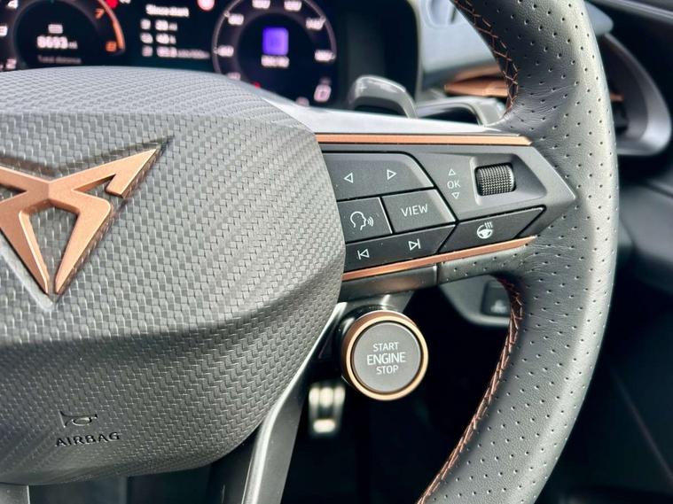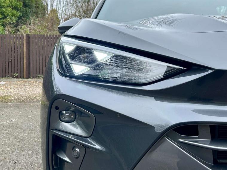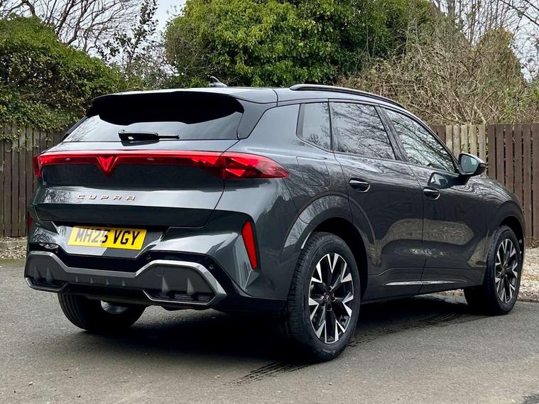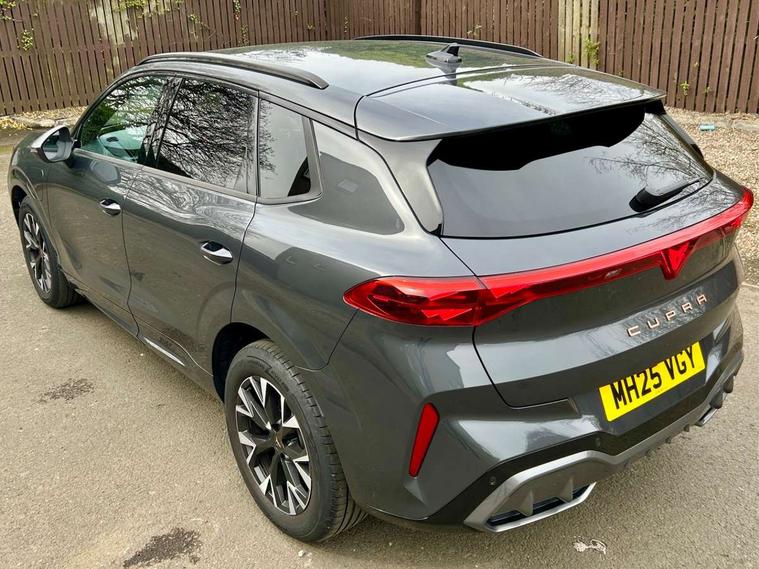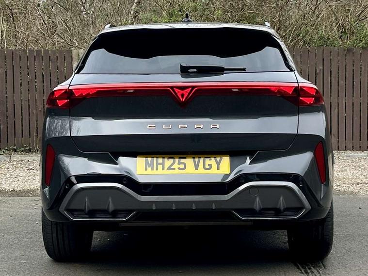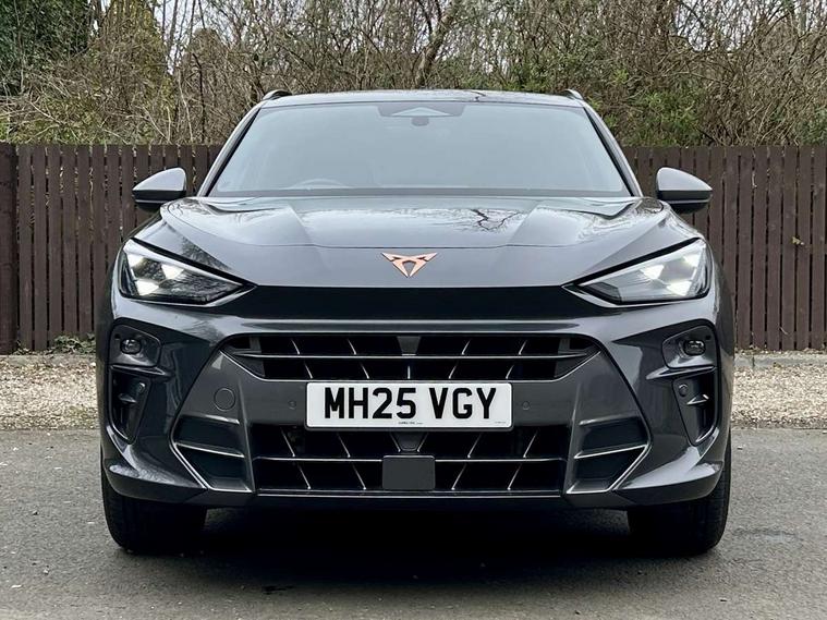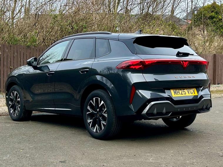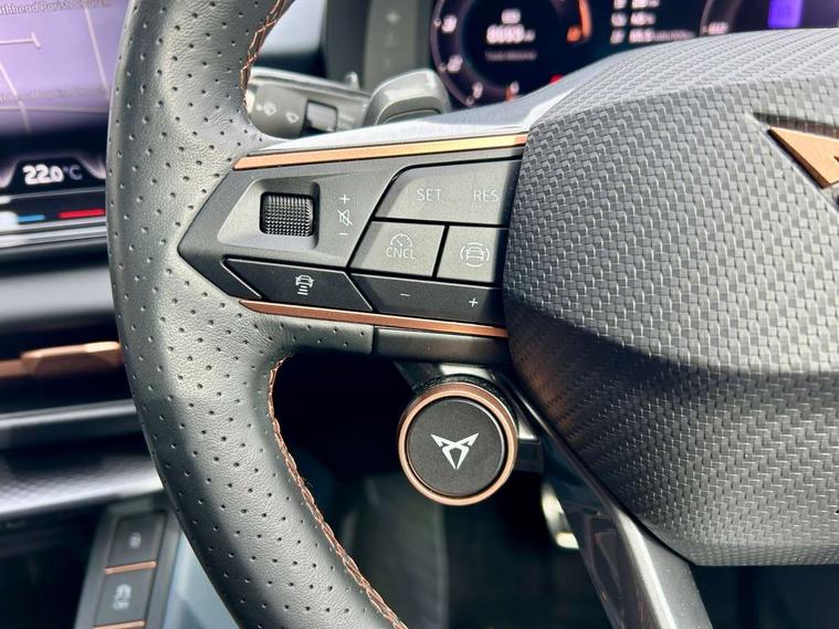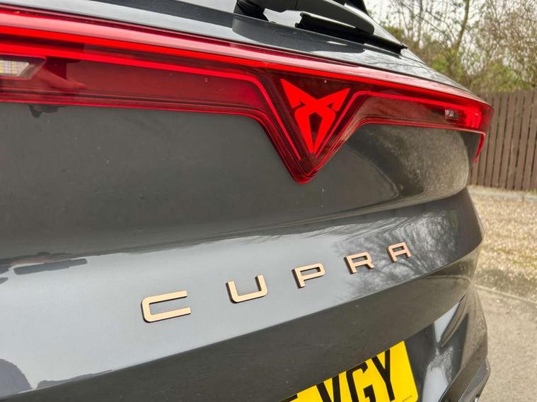10.25" digital cockpit, Adaptive cruise control with follow-to-stop and speed limiter, Advanced driver alert system, Driving profile selection and conventional shock absorber, Dynamic road sign display, E-call, Electric tailgate with virtual pedal, Emergency steering support with turn assist, Front and rear parking sensors, Front assist (Forward collision warning with automatic braking) with multifunction camera and front cross traffic assist, Lane assist, Media system with Nav - 12.9" touch display, voice control, full link phone (wired/wireless), DAB and Steering wheel mounted controls, Rear view camera, Speed sensitive power steering, Start/stop system with regenerative braking, Wireless phone charger, 10 amp mode 2 charging cable, 16 amp mode 3 charging cable, 8+1 Speakers, Auto dimming rear view mirror, Black roof rails, CUPRA 3D rear lights with ceremony & swiping indicator and illuminated logo, Dark tinted rear windows, Daytime running lights with automatic headlight control and Coming and Leaving home function, Dynamic headlight range control, Electric front/rear windows, Electrically adjustable, heated and folding door mirrors, Front fog lamps with cornering function, Heat reflecting windscreen, LED headlamps with signature "CUPRA LED", Rain sensing wipers, Rear fog light on one side, back up light on both sides, Rear side wing doors, Rear wash/wipe, Third brake light, Welcome lights (within exterior mirror housing), 3 seat bench in 2nd row, Black roof lining, Cloth upholstery, Cupra sports pedals, Driver and passenger seat with manual height and lumbar adjustment, Four x USB Type C ports (2 in front and 2 in rear), Front and rear head restraints, Front and rear reading lights X 4, Front centre armrest, Heated leather wrapped multi function sports steering wheel with tiptronic, Illuminated interior front door sills, Interior ambient lighting, Isofix, Operating voltage 12V, Single front passenger seat, Sunvisors with illuminated mirror, Three zone climate control with control panel in rear, Unsplit rear seat bench, split folding backrest, with centre armrest, Variable luggage/load compartment floor, 3 point seatbelts on all rear seats, Brake control system - ESC and brake booster, Child proof door locks, Driver and front passenger airbags, Electronic parking brake, Front and rear disc brakes, Front interaction airbag, Front passenger airbag deactivation switch, Front side airbags with curtain airbags, Tyre pressure monitoring system, Visual and acoustic seat belt reminder, electric contact in front and rear, Anti theft alarm, Keyless locking and starting system with keyless access, Locking wheel bolts, Black decorative trims, Chrome interior detailing, 18" Atomic alloy wheels, Breakdown kit, Tool kit,