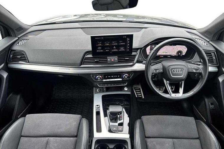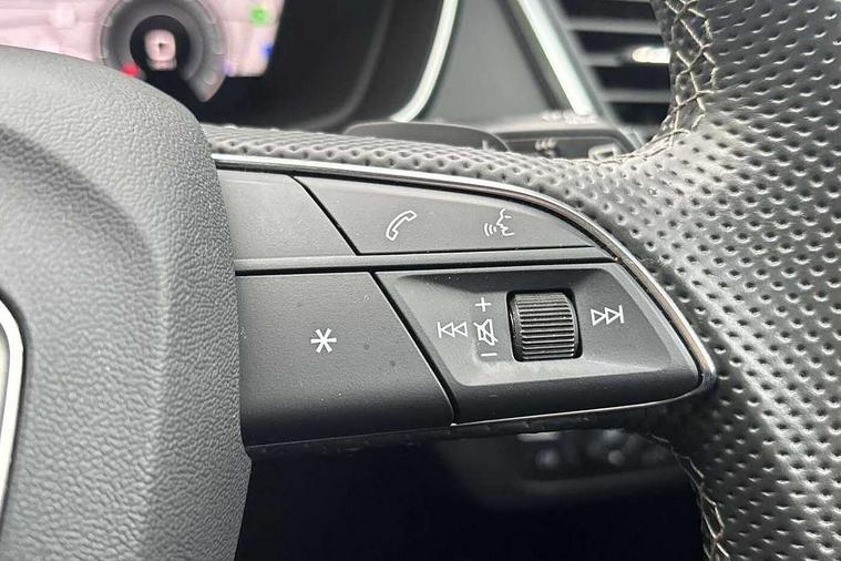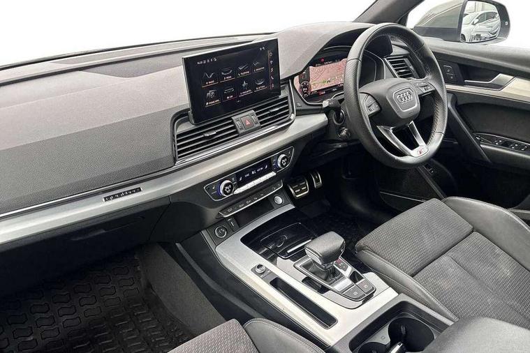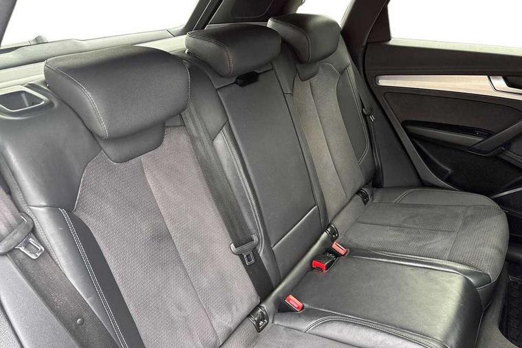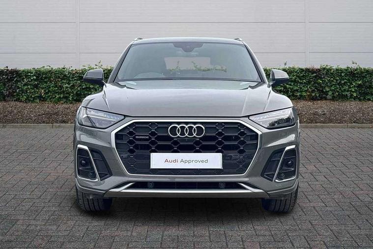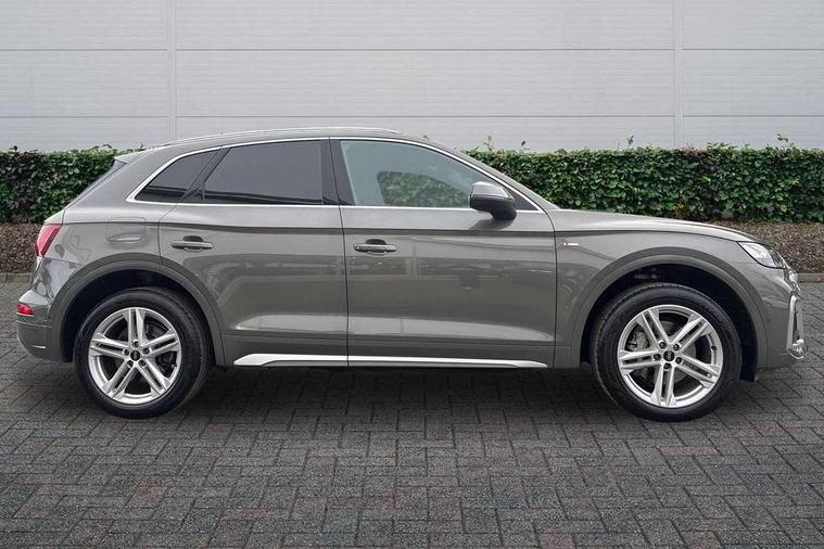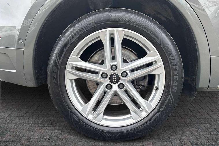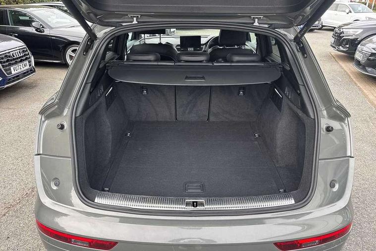 Acoustic front and rear parking sensor, Audi connect safety and service (e-call), Audi connect with Amazon Alexa Integration, Audi drive select, Audi virtual cockpit plus with 12.3" screen and three different layout designs, Audi wireless smartphone interface, Automatic start-stop system with coasting functionality and efficiency programme, Bluetooth interface, Electro - mechanical power assisted steering, MMI navigation plus with 10.1" touch screen, Power tailgate, Reversing camera, Service interval indicator, Voice control system with Audi hotword activation "Hey Audi", Diesel particulate filter, Quattro on demand, S line sports suspension, 2 x USB charging port with aux input socket, 8 loudspeakers, DAB Digital radio, Acoustic windscreen, Aluminium roof rails, Audi matrix LED headlights with dynamic front and rear indicators, Auto dimming door mirrors, Auto dimming frameless rear view mirror, Automatic headlight adjustment, Automatic headlights and windscreen wipers, Body colour bumpers, Body colour door mirrors, Body colour rear diffuser with matt aluminium silver surrounds, Body colour underbody protection, Chrome plated exhaust trims, Daytime running lights, Door sills in Selenite silver, Electric adjustable/heated/folding door mirrors, Front air inlet surrounds in aluminium, Front and rear electric windows, Front radiator grille in honeycomb design, Headlight washers, High level LED brake light, Lower bumpers painted in contrast Manhattan grey, Rear chrome trim strip below lights, Rear privacy glass and rear side windows, Rear side wing doors, Rear wiper, Roof bars, S Line badges on the front wings, S Line front and rear bumpers, S Line rear spoiler, S Line side skirts, 3 rear headrests, 3 spoke leather multifunction steering wheel with S badging perforated leather grips, 40:20:40 split folding 3 rear bench seat in 2nd row with rear centre armrest, Black cloth headlining, Comfort front centre armrest, Contrast stitching on seats, steering wheel and gear lever gaiter, Deluxe 3 zone electronic climate control, Front/rear floor mats, Gear lever in black leather, Heated front seats, Height adjustable front head restraints, Height/reach adjustable steering column, Illuminated door sill trims with S logo, Luggage compartment cover, Manual seat adjustment with 4-way electric lumbar support, Removable luggage compartment floor, Single front passenger seat, Stainless steel pedals, Sunvisors with vanity mirrors, High gloss pack - Q5, LED interior light pack - Q5, 3 point seatbelts on all seats, 6 airbags - Driver, front passenger, curtain and side airbags, Electrically operated child locks on rear doors, Electromechanical parking brake, Electronic stabilisation control including ABS, ASR and EDL, First aid kit with warning triangle and vests, Front passenger airbag deactivation, Hill descent control, Hill hold assist, ISOFIX child seat mounting for front passenger seat and ISOFIX child seat mounting with Top Tether for outer rear seats, Multi collision brake assist, Pop-up bonnet for pedestrian protection, Pre sense city, Seat belt force limiter, Seatbelt monitoring, Tyre pressure warning, Anti theft alarm, Anti-theft wheel bolts, Keyless Go access/ignition system, Remote central locking, Air vents inserts and centre console in gloss black, Matt brushed aluminium inlays,