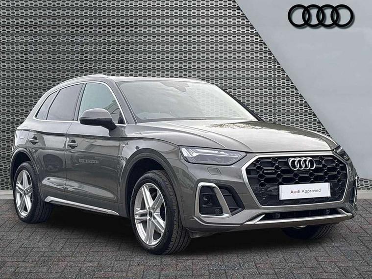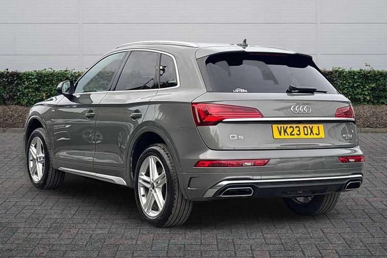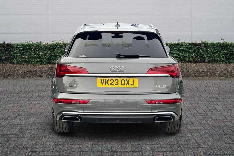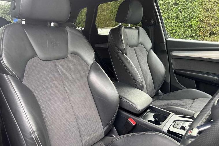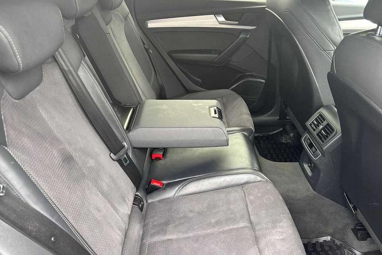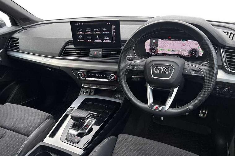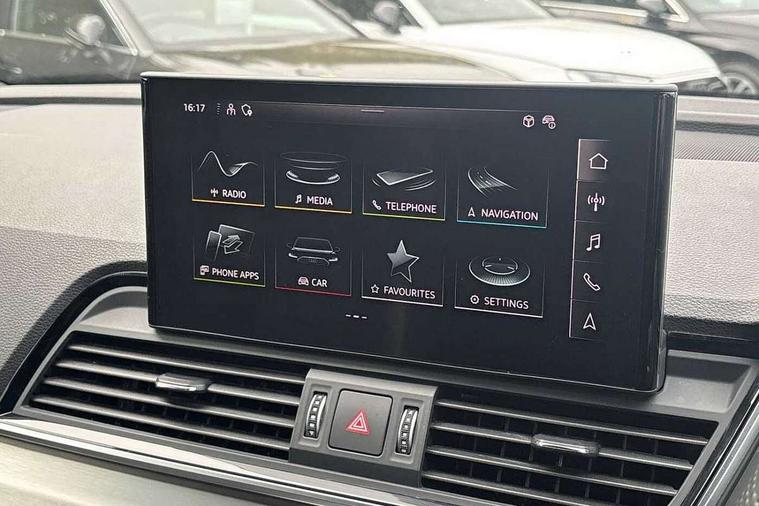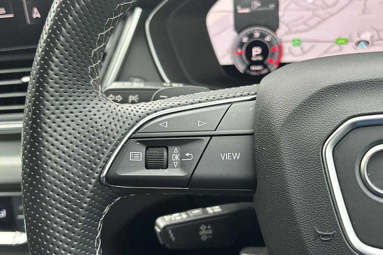 Acoustic front and rear parking sensor, Audi connect safety and service (e-call), Audi connect with Amazon Alexa Integration, Audi drive select, Audi virtual cockpit plus with 12.3" screen and three different layout designs, Audi wireless smartphone interface, Automatic start-stop system with coasting functionality and efficiency programme, Bluetooth interface, Electro - mechanical power assisted steering, MMI navigation plus with 10.1" touch screen, Power tailgate, Reversing camera, Service interval indicator, Voice control system with Audi hotword activation "Hey Audi", Diesel particulate filter, Quattro on demand, S line sports suspension, 2 x USB charging port with aux input socket, 8 loudspeakers, DAB Digital radio, Acoustic windscreen, Aluminium roof rails, Audi matrix LED headlights with dynamic front and rear indicators, Auto dimming door mirrors, Auto dimming frameless rear view mirror, Automatic headlight adjustment, Automatic headlights and windscreen wipers, Body colour bumpers, Body colour door mirrors, Body colour rear diffuser with matt aluminium silver surrounds, Body colour underbody protection, Chrome plated exhaust trims, Daytime running lights, Door sills in Selenite silver, Electric adjustable/heated/folding door mirrors, Front air inlet surrounds in aluminium, Front and rear electric windows, Front radiator grille in honeycomb design, Headlight washers, High level LED brake light, Lower bumpers painted in contrast Manhattan grey, Rear chrome trim strip below lights, Rear privacy glass and rear side windows, Rear side wing doors, Rear wiper, Roof bars, S Line badges on the front wings, S Line front and rear bumpers, S Line rear spoiler, S Line side skirts, 3 rear headrests, 3 spoke leather multifunction steering wheel with S badging perforated leather grips, 40:20:40 split folding 3 rear bench seat in 2nd row with rear centre armrest, Black cloth headlining, Comfort front centre armrest, Contrast stitching on seats, steering wheel and gear lever gaiter, Deluxe 3 zone electronic climate control, Front/rear floor mats, Gear lever in black leather, Heated front seats, Height adjustable front head restraints, Height/reach adjustable steering column, Illuminated door sill trims with S logo, Luggage compartment cover, Manual seat adjustment with 4-way electric lumbar support, Removable luggage compartment floor, Single front passenger seat, Stainless steel pedals, Sunvisors with vanity mirrors, High gloss pack - Q5, LED interior light pack - Q5, 3 point seatbelts on all seats, 6 airbags - Driver, front passenger, curtain and side airbags, Electrically operated child locks on rear doors, Electromechanical parking brake, Electronic stabilisation control including ABS, ASR and EDL, First aid kit with warning triangle and vests, Front passenger airbag deactivation, Hill descent control, Hill hold assist, ISOFIX child seat mounting for front passenger seat and ISOFIX child seat mounting with Top Tether for outer rear seats, Multi collision brake assist, Pop-up bonnet for pedestrian protection, Pre sense city, Seat belt force limiter, Seatbelt monitoring, Tyre pressure warning, Anti theft alarm, Anti-theft wheel bolts, Keyless Go access/ignition system, Remote central locking, Air vents inserts and centre console in gloss black, Matt brushed aluminium inlays,