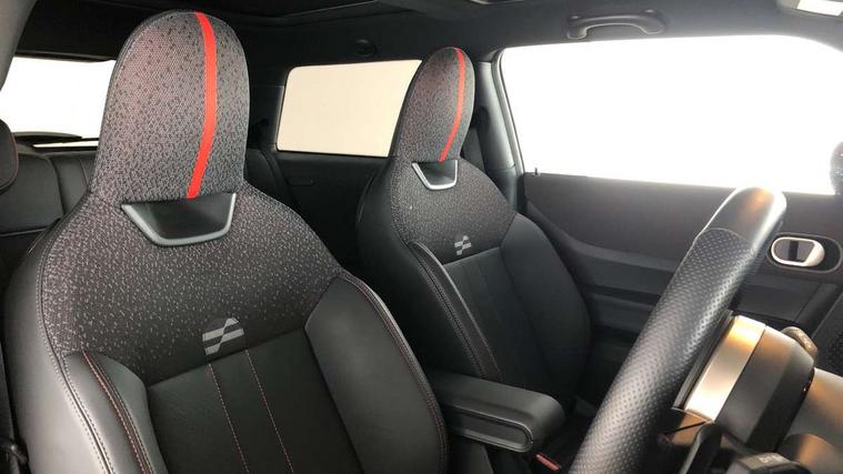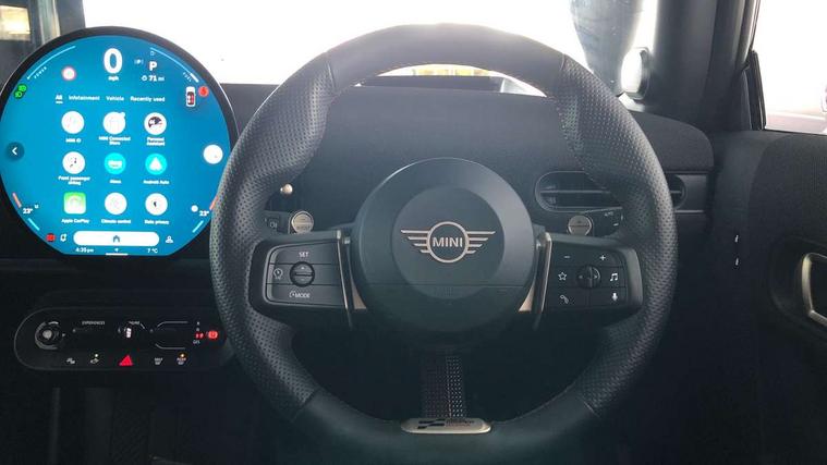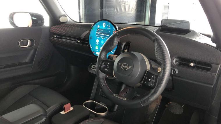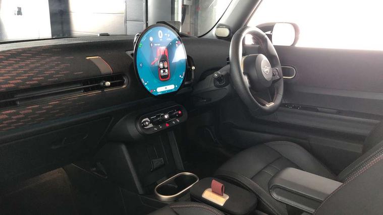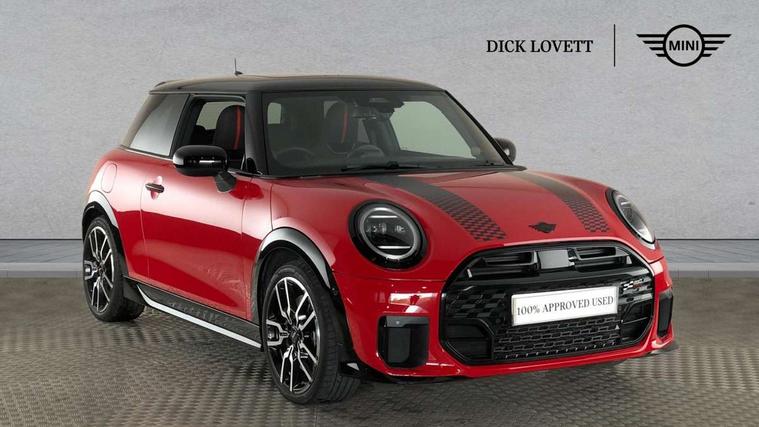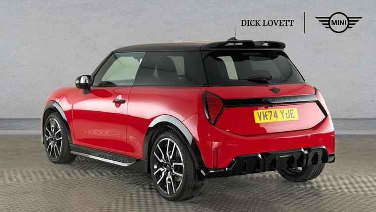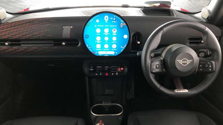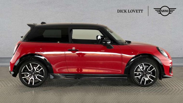 Central toggle bar, Circular OLED Screen, Compatible mobile phone bluetooth with audio streaming, Cruise control, Digital instrument cluster, Electro-mechanical speed dependant steering assistance, Emergency call service, MINI Experience Modes, Mini navigation system, On board computer, Service interval indicator, 7 speed steptronic sport transmission with double clutch, Adaptive suspension, DAB Digital radio, Personal eSim, Adaptable light signatures, Auto headlights, Electric adjustable heated door mirrors, Electric front windows, Front and rear apron, Heated rear window, Heated windscreen washer jets, High gloss black wheel arches, High gloss hexagonal patterned grille surround, JCW body kit, LED daytime running lights, LED indicator lights, LED rear lights, Rain sensor window wipers, Rear fog lights, Rear roof spoiler with airblades, Rear window wiper, 2 seat bench in second row, 2 zone automatic air conditioning, 60/40 rear seat bench, Ambient lighting, Black lower band in high gloss, Cupholders, Dark headliner, Floor mats, Front and rear head restraints, Front compact armrest, Heated steering wheel, Height adjustable passenger seat, Lidded storage box in Black/Red knit, Luggage compartment lighting, Partially perforated vescin steering wheel with red accent, black/red decorative strap, Single front passenger seat, Steering wheel paddle shift, Sunvisors with vanity mirrors, Vescin/Cord upholstery, Driving assistant pack - Cooper Hatchback, Level 1 pack - Mini Hatchback, Park assistant pack - Cooper Hatchback, 3 point seatbelts on all four seats, 6 Airbags - front, side, head and seat belt tensioners, Acoustic pedestrian protection, Anti-lock braking system (ABS), Brake caliper in Black with JCW badge, DSC - Dynamic Stability Control, Electronic parking brake, Front and rear disc brakes, Front ISOFIX (iSize), Front passenger airbag deactivation, JCW Sport Brakes, Traction control, Tyre pressure monitoring system, Alarm, Immobiliser, Remote central locking, Black/Red decorative dash strap, JCW Black/Red dashboard knit, Tyre repair kit,