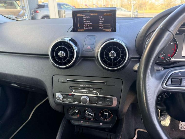 Audi drive select, Electro-mechanical PAS, Low washer fluid indicator, Service interval indicator, Voice control system, Additional SD card reader, Audi music interface, Bluetooth audio streaming, DAB Digital radio, Adaptive brake lights, Electric adjustable door mirrors, Electric front windows, Electric rear windows, Front fog lights, Heat insulating glass, Heated door mirrors, Heated rear windscreen, Rear wiper, 12V Accessory socket in centre console, 3 spoke leather multifunction sports steering wheel, Adjustable rear head restraints, Cupholders in centre console, Door sills trims with aluminium inlays, Front floor mats, Front head restraints, Front sports seats, Height adjustable front seats, Illuminated glovebox, Isofix attachments on outer rear seats, Jack and tool kit, Leather handbrake, Lumbar adjustment for front seats, Rake/reach adjustable steering wheel, Split folding rear seats, ABS/EBD, Brake assist function, Driver and passenger side airbags, Driver/Front Passenger airbags, EDL, ESP with ASR, First aid kit, Front and rear seatbelt reminder, Front passenger airbag deactivation, Head airbags, Height adjustable front seatbelts, Tyre pressure monitor, Warning triangle, Locking wheel bolts, Remote control central locking, Thatcham category 1 alarm + immobiliser, Tyre repair kit,