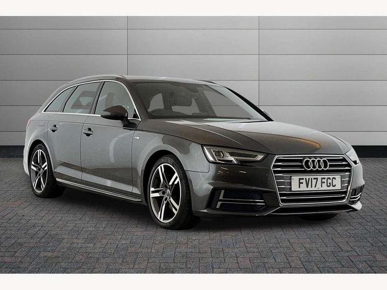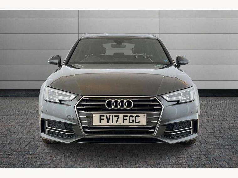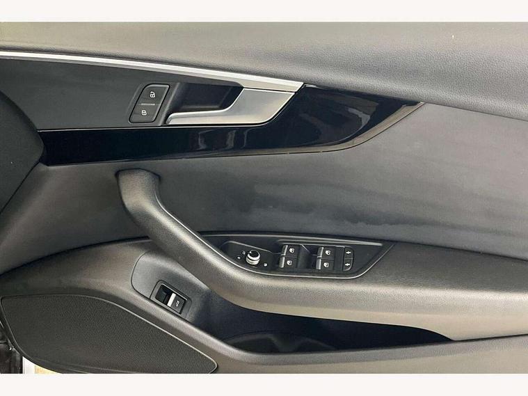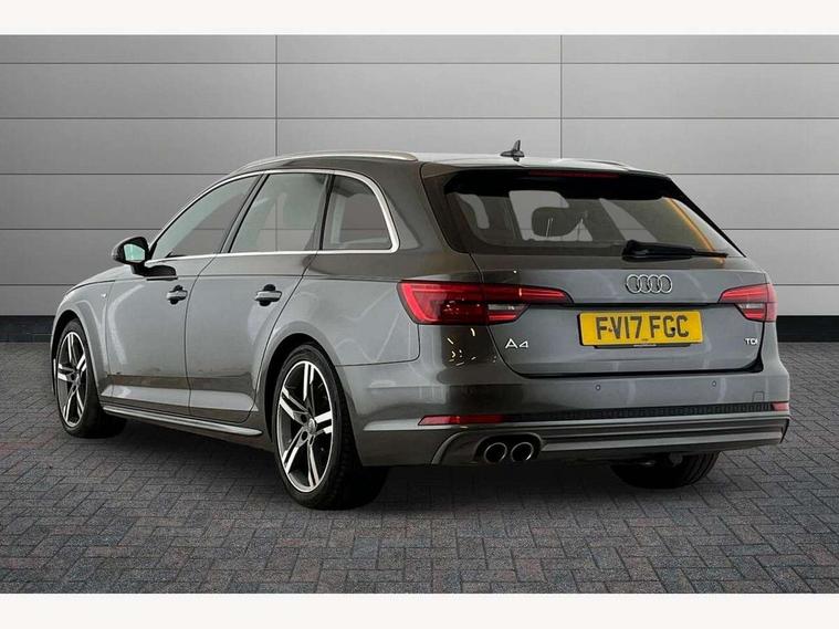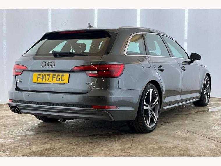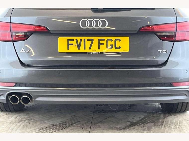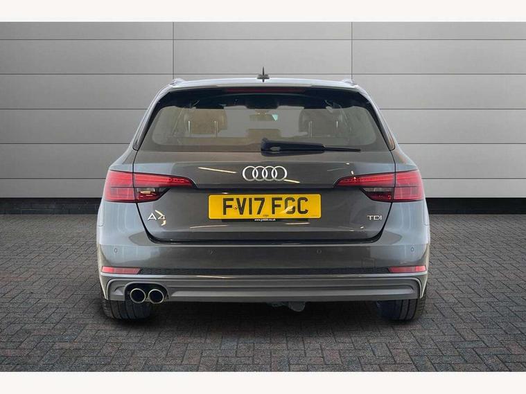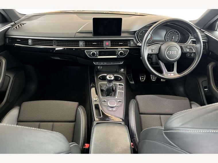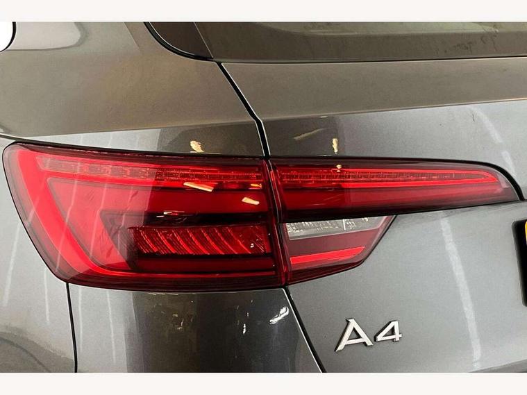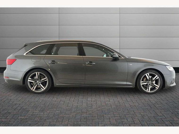 Audi drive select, Audi Pre sense collision avoidance, Audi smartphone interface, Electro-mechanical PAS, Power boot opening and closing, Service interval indicator, Stop/start button, Voice control system, 2 USB ports, Aux input, DAB digital radio module, MMI radio plus with CD player, Acoustic windscreen, Air inlets in titan black with two horizontal inlays in chrome, Auto dimming rear view mirror, Automatic headlights + automatic windscreen wipers, Body colour bumpers, Chrome door handles, Chrome rolled exhaust, Electric adjustable heated door mirrors, Electric front windows, Electric rear windows, Headlight range control, LED daytime running lights, LED indicators in door mirrors, Rear diffuser in Twilight grey matt, Rear wiper, Roof spoiler, 3 zone climate control, Black cloth headlining, Front centre armrest with 12v socket, Front sport seats, Front/rear floor mats, Illuminated door sill finishers, Isofix child seat preparation for front passenger/outer rear seats inc passenger airbag deactivation, Jack and tool kit, Perforated leather gearknob, Reach + rake adjustable steering column, Rear headrests, Retractable load area cover, Split folding rear seats, Stainless steel foot rest, Stainless steel pedals, Sunvisors with vanity mirrors, Top tether anchor plate for isofix child seat, S line exterior styling pack - A4 Avant, 3 point seatbelts on all rear seats, ABS/EBD, Adaptive driver and front passenger airbags, Electromechanical parking brake, ESP, First aid kit, Front head airbags, Front seatbelt pretensioners + load limiters, Front side airbags, Multi-Collision braking, Seatbelt warning, Traction control, Tyre pressure monitoring system, Warning triangle, Keyless start, Locking wheel bolts, Remote central locking, Thatcham category 1 alarm + immobiliser,