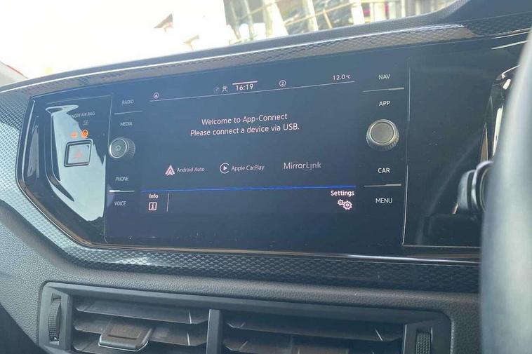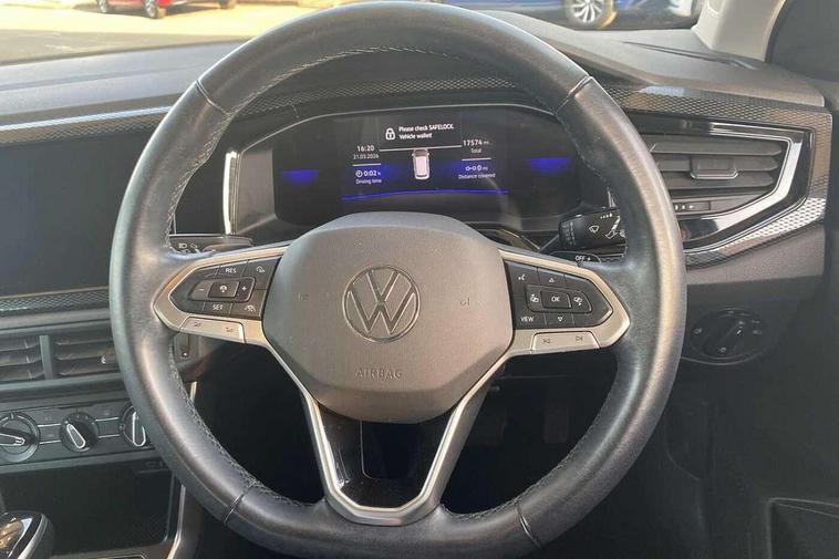Adaptive cruise control with follow-to-stop and speed limiter, Bluetooth mobile phone interface, Driver alert system, Emergency call service, Front assist system, Power assisted speed sensitive steering, Preparation for We connect and We connect plus, Speedo and rev counter, electronic odometer, trip, service interval display and fuel gauge, Standard rear axle, Travel Assist - Lane keeping system and traffic jam assist, Travel assist including emergency assist, Trip computer, Warning signal and warning light for front and rear seatbelts not fastened, Washer fluid level indicator, Wireless app connect, Front wheel drive, Rear shock absorpion, Start-stop system with battery regeneration (recuperation - energy recovery during braking), DAB Digital radio, Diversity antenna for FM reception, Front and rear 6 speakers, Automatic dimming interior rear view mirror, Body colour bumpers, Body colour door handles, Body colour door mirrors, Electric front windows, Heat insulating darkened glass in side and rear windows, Heat insulating glass windscreen, Power folding adjustable/heated exterior mirrors and front passenger exterior mirror lowering function, Rain sensor, Rear electric windows, Rear fog light, Rear side wing doors, Rear windscreen washer and wiper with interval delay, Third brake light, 12V power socket in centre console, 2 front and 2 rear reading lights, 2 USB-C ports in the front, 2 USB-C charging sockets on the center console in the rear, 3 rear head restraints, 60/40 split folding rear seat and rear seat bench not split, Chrome plated radiator grille inserts, air vent surrounds and light switch surrounds, Door and side trim panel, Driver and front passenger seat height adjustment, Driver/passenger sunvisors with illuminated vanity mirrors, Front centre armrest, Front seat backrest storage pockets, Front standard seats, Handbrake lever handle in leather, Hartley/Thomas cloth upholstery, Headliner in recycled material, Isofix child seat preparation easy-fit (for two outer rear seats, and front passenger seat) compatible with I-size, Leather trimmed gear knob, Luggage compartment cover, Luggage compartment floor, Luggage compartment lighting, Single front passenger seat, Standard pedal cluster, Three spoke leather wrapped multifunction steering wheel with shifting paddles, Light and vision pack - Polo, 3 point height adj front seatbelts + pretensioners, 3x3 point rear seatbelts, ABS, Driver and front passenger airbag with front passenger airbag deactivation, Drivers and front passengers safety optimised head restraints, ESC (Electronic stability control) + EDL (Electronic Differntial lock) and ASR (Traction control), Extended and predictive pedestrian/ cyclist protection, Front curtain and side airbags with center airbag, Front disc brakes, Hill hold control, Manual child lock in rear doors, Rear drum brakes, Single tone horn, Tyre pressure loss indicator, Alarm with interior protection, Anti-theft alarm system with interior monitoring, backup horn, and towing protection, Anti-theft wheel bolts, Electronic engine immobiliser, Lava stone black gloss/matt decorative inserts in dash and front door panels, Low rolling resistance tyres,