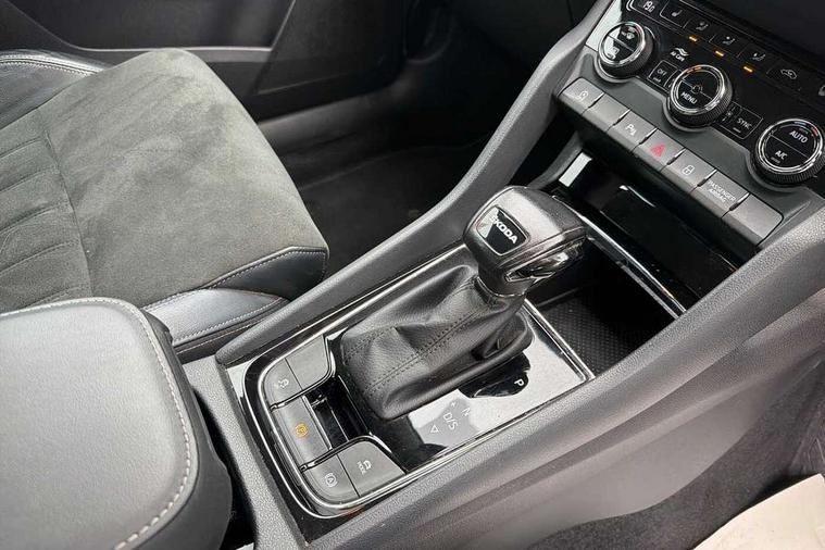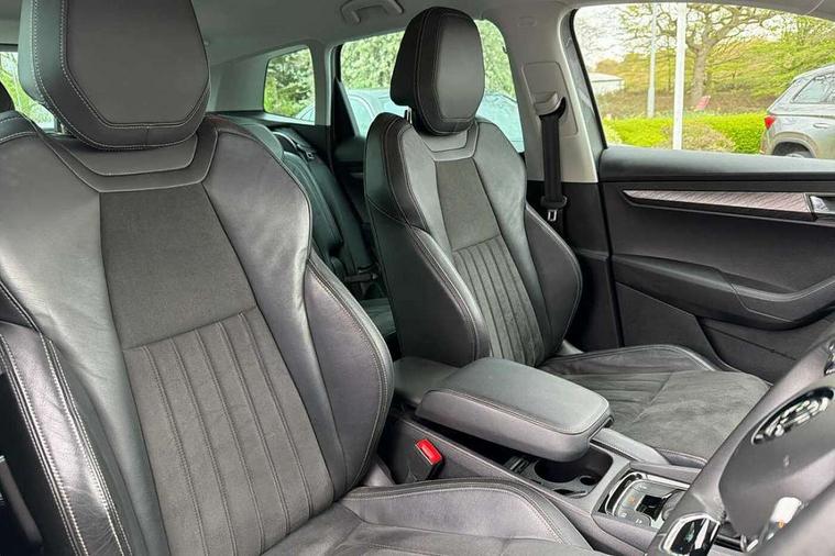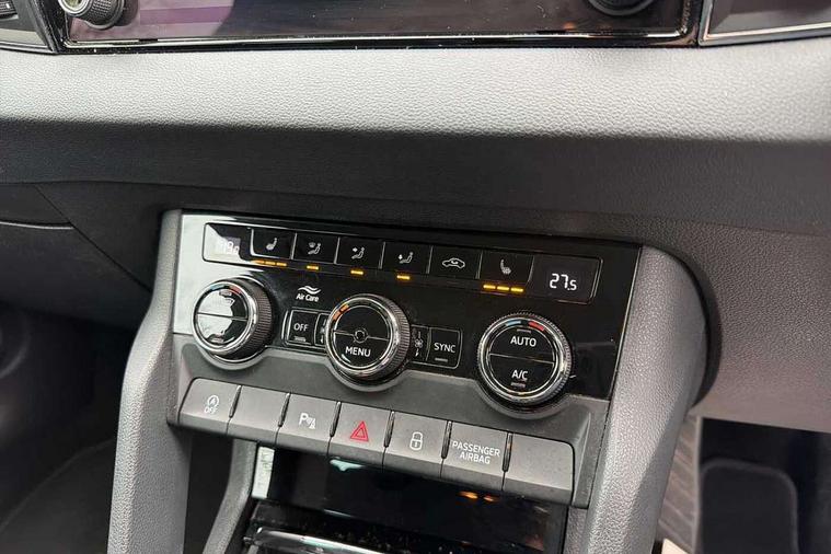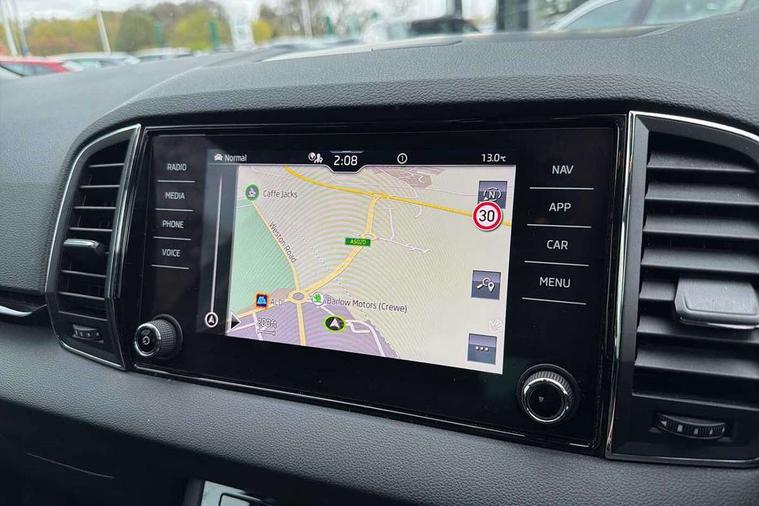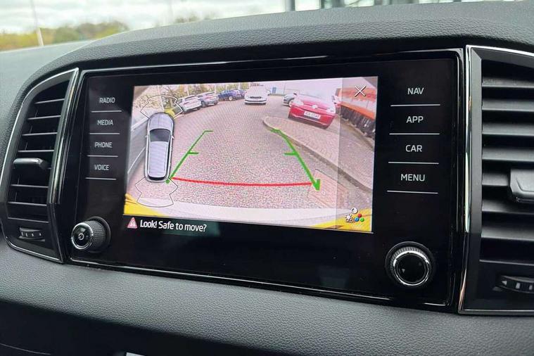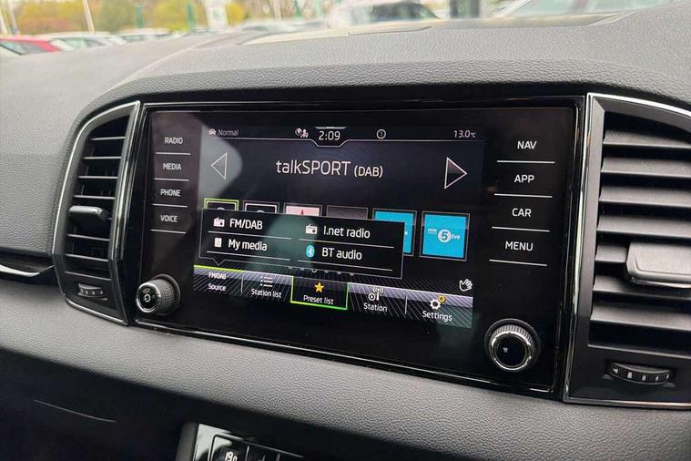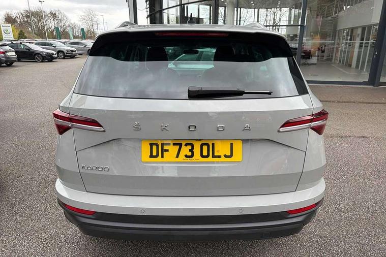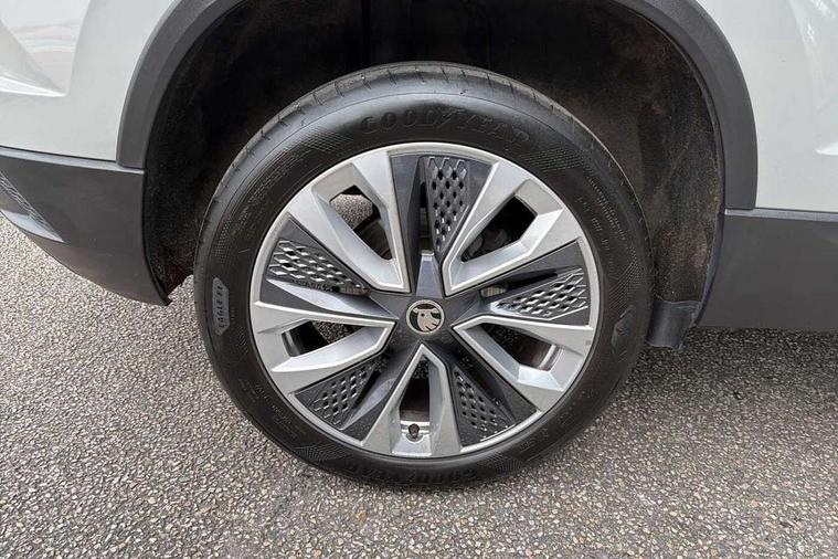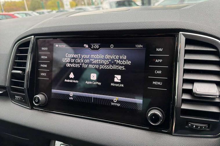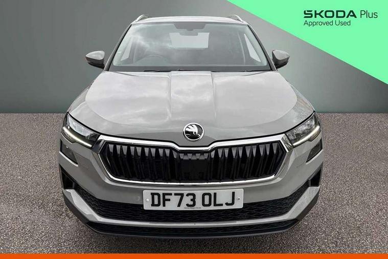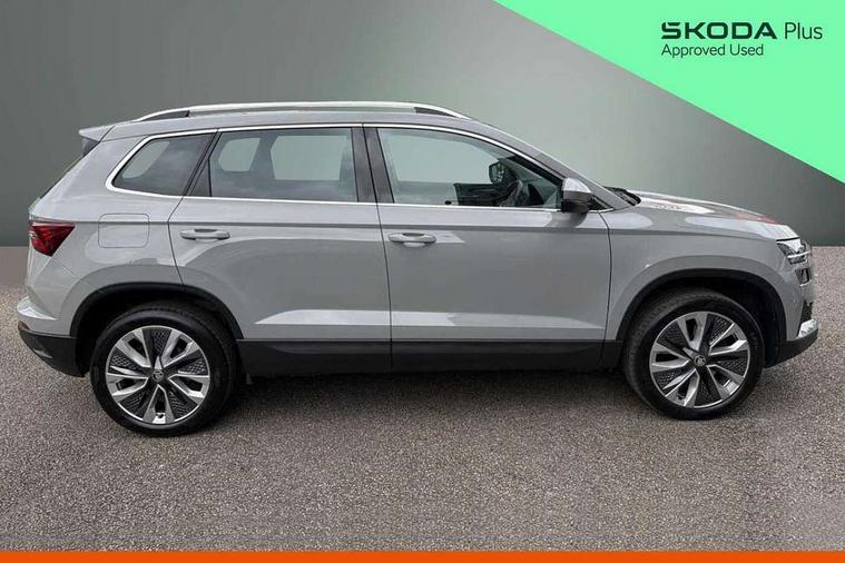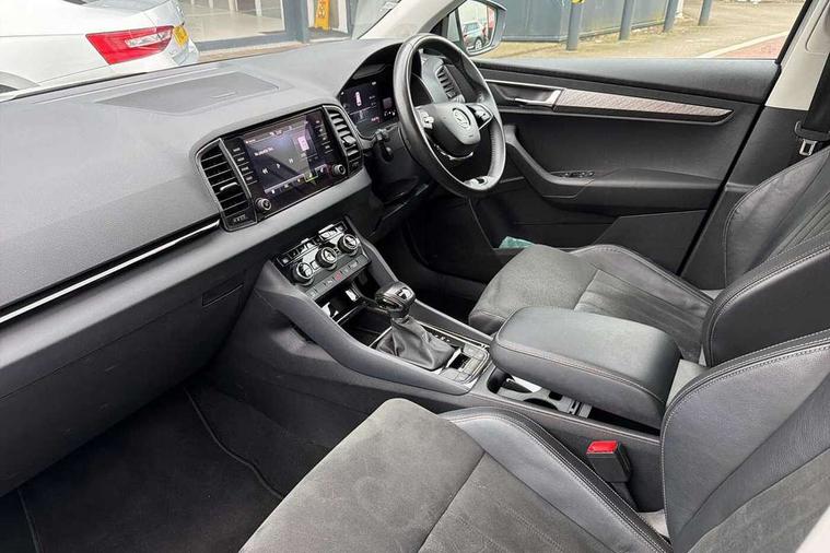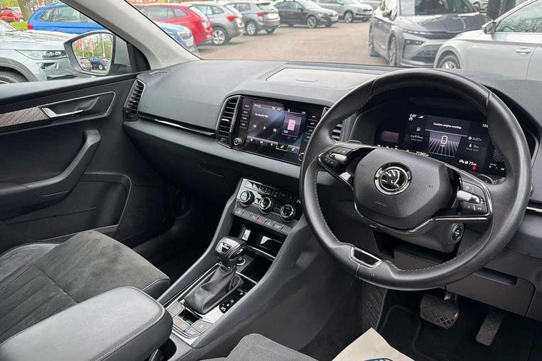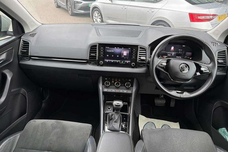 8" Digital display, Care connect, Driver fatigue sensor, Emergency services call system, Outside temperature gauge, Service interval indicator, SmartLink wireless for Apple and wired for Android, Start/stop system with regenerative braking, USB C Port x 2 in front centre console, 8 Speakers, DAB radio with Bluetooth, USB connection, Acoustic glass, Aero front windscreen wipers with intermittent function, Auto dimming rear view mirror with light and rain sensors, Black electric window control buttons, Body colour door mirrors and handles, Dynamic headlight range control with cornering light function, Electric front and rear windows with child proof lock, Heated rear windscreen, LED daytime running lights, LED rear lights with high functionality welcome effect and dynamic indicators, Light assistant (coming/leaving home/tunnel light), Plastic scuff plates, Privacy glass, Rear side wing doors, Rear spoiler, Rear window wiper with washer system and intermittent control, Safety reflectors on front doors, 1.5 litre bottle holders in driver and front passenger door panels, 12V socket in boot, 12v socket in front centre armrest with storage compartment and rear air vents, 2 spoke leather heated multifunction steering wheel with DSG paddles, 2 x Tablet holder, 3 rear height adjustable headrests, 3 seat bench in 2nd row, 4 foldable roof handles with rear coat hooks, Black floor carpet, Chrome inner door handles, Double sided boot floor, Foldable hooks in the boot, Front head restraints, Height adjustable front three point seats belts with tensioners, Height/reach adjust steering wheel, Ice scraper, Illuminated glovebox, Illuminated luggage compartment, Isofix child seat preparation for front passenger seat, Isofix child seat preparation outer rear, Manual lumbar support for front seats, Pen holder, Pollen filter, Rear boot cover, Rear reading lights, Rubbish bin door, Safety vest holder, Single front passenger seat, Storage box in upper central dashboard closed, Sunvisors with illuminated vanity mirrors, Textile floor mats, Ticket holder, VarioFlex seats with standard rear seat release, Boot pack - Karoq, Design Pack - Karoq, Parking pack - Karoq, Automatic door unlocking in case of crash, Automatic fuel cut off in case of crash, Child locks on rear doors, Driver airbag, Electronic parking brake with auto hold function, Emergency rear braking signal, ESC including ABS, MSR, ASR, EDS, HBA, DSR, RBS, MKB and traction control, Front side airbags, Hill hold control, Knee airbags, Passenger airbag with switch-off function, Pedestrian monitor, Seatbelt reminder signalisation and pretensioner for all seats, Three point seatbelts rear, Two tone horn, Tyre pressure display, Tyre pressure monitor, Alarm with interior monitoring, back up horn and tilt sensor with safe function, Electronic engine immobiliser, Keyless entry and start/stop, Remote central locking with 2 remote folding keys, Chrome framed air vents, 18" Miran alloy wheels in black, Anti-theft wheel bolts protection, Tool kit,