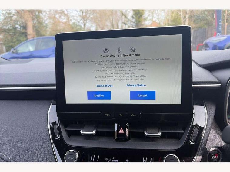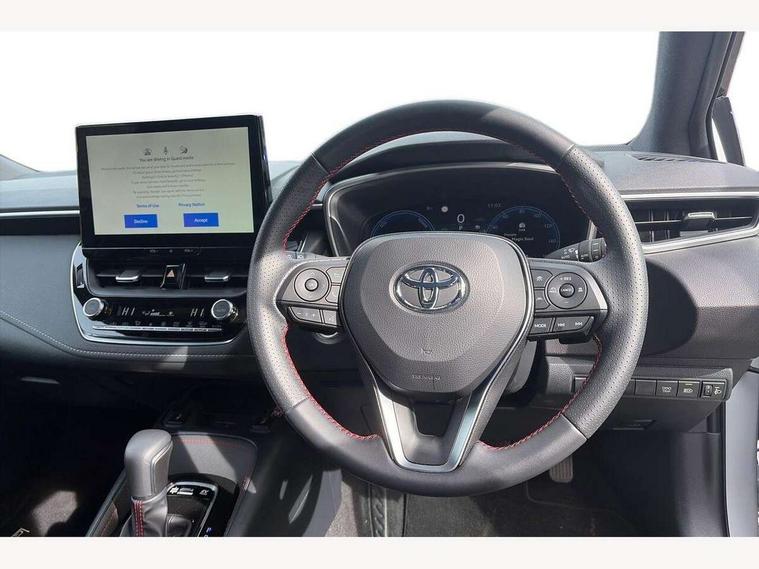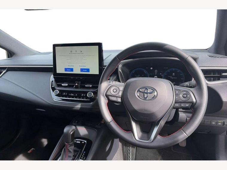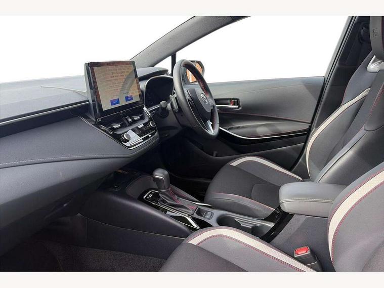 10.5" Multimedia display screen, Bluetooth telephone connectivity, Connected car functionality upgrade, tracker, remote status and e-care, Drive mode select (Eco, Normal), E-call, Electrically assisted power steering, EV drive indicator, Front and rear parking sensors, Full Digital 12.3" TFT Digital Combimeter, Intelligent clearance sonar, Key reminder warning, Lane Departure Alert (LDA) switch on steering wheel, Memory on adjustable speed limiter, MyT connected services, Proactive driving assist (PDA), Reversing camera, Smart entry and push button start with GR Logo, Smartphone integration with Apple CarPlay and wired android auto, Tailgate, Toyota remote services, Toyota smart connect navigation, Wireless charger, Gasoline particulate filter, Vehicle Stability Control (VSC), 6 speakers, AM/FM radio, DAB Digital radio, Front USB-C in centre console, Front USB-C in dashboard, Smart voice assist/ Voice recognition, USB and Aux in connectors + 12V front outlet, Anti-jam protection on power windows, Auto up and down function on all power windows, Automatic folding mirrors, Automatic headlights with high beam assist, Black centre and side air vents, Black toyota logo in front, Body coloured bumpers, Body coloured door mirrors, Body coloured outside door handles, Dark chrome lower grille, Electrochromatic mirror, Follow me home headlights, GR Sport dark chrome front mesh grille and black rear grille, GR Sport exclusive under guard, GR sport scuff plates, LED daytime running lights, LED dual beam projector headlights, LED front fog lights, LED High mounted stop light, LED rear combi lights with LED lightguide, Manual headlight levelling system, New grille pattern, Noise reduction layer on windscreen, Piano black diffuser, Power adjustable heated door mirrors, Power front windows, Power rear windows, Privacy glass with UV filter, Rain sensing wipers, Rear side wing doors, Rear window defogger, Rear window wiper, Reverse tilting door mirrors, Rocker and door lower moulding, Roof spoiler, Satin chrome insert on front air vents, Satin chrome insert on front door assist grips, Satin silver front spoiler, Shark fin antenna, Tailgate release with push button, Time adjustment on intermittent wiper, Turning signal integrated indicators in door mirrors, Unique lower skirt, Unique side rocker with black insert, UV-filter on driver and passenger windows, 2 Shopping bag hooks in luggage compartment, 3 rear headrests, 3 seat bench in 2nd row, 3 spoke steering wheel with satin insert and red stitching, 4 tie down hooks in luggage compartment, 60/40 split folding rear seat, Adaptive cruise control (ACC) switch on steering wheel, Adjustable speed limiter switch on steering wheel, Audio, multimedia and telephone switches on steering wheel, Black armrest on centre console box, Black gear shift console, Boot light, Boot underfloor storage, Centre room light, Driver and front passenger personal light, Driver and passenger assist grip, Driver and passenger seatback pockets, Driver and passenger sun visor with mirror and light, Dual zone automatic air conditioning with ECO mode switch, Electric lumbar support for passenger, Fabric/synthetic leather upholstery, Front and rear cup and bottle holders, Front door pockets, Front head restraints, Front passenger seat, Front sliding synthetic leather armrest, Gear knob, GR Sports seats with partial leather bolsters, Heated front seats, Illuminated entry system in room lamp, ISOFIX seat fixing (2 fixings on rear outer seats), Manual height adjustable for driver and front passenger seat, Manually tilt with sliding driver and front passenger seat, Nanoe-X air purifier, Paddle shifts, Parcel shelf, Pollen filter, Power adjustable lumbar support on driver seat, Power window switches with satin chrome inserts, Rear armrest with 2 cupholders, Rear passenger coat hooks (2), Red stitching on gear shift, Remote air conditioning, Satin chrome inside door handles, Satin chrome surround on speedometer, Sliding armrest on centre console box, Slow opening glovebox with lights, Textile floor mats, Tilt/telescopic steering column, Voice recognition switch on steering wheel, Whiplash Injury Lessening (WIL) feature (active headrest) for seats, White ambient lighting on open tray and front cup holder, Toyota safety sense 3 pack - Corolla, 3x3 point rear seatbelts, Adjustable driver and front passenger seat belt extender to top anchor point, Anti lock braking system + Electronic brake force distribution, Brake assist function, Child locks on rear doors, Downhill Assist Control (DAC), Electronic parking brake, Emergency brake light signal (EBS), Front passenger airbag on/off switch, Front seatbelt reminder, HAC - Hill start assist control, Rear seat belt reminder, Seatbelt pretensioners and force limiters, Supplemental restraint system (SRS) 7 airbags - dual driver, dual side curtain, side impact and driver knee airbags, Traction control, Tyre pressure warning system, Acoustic vehicle alert system (AVAS), Alarm with motion sensor and immobilizer, Power passenger window lock, Remote central locking + deadlocks, GR Sport interior and exterior styling, Satin chrome dash trim, Soft touch texture on upper dashboard, Stitching on lower dashboard, 18" 10 spoke black machined face alloy wheels, Tyre repair kit, Unique wheel finish with red wheel cap,