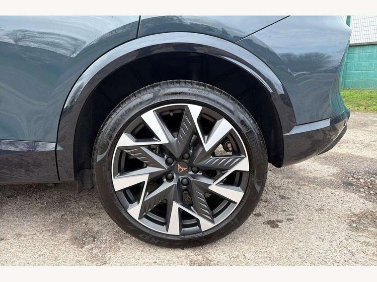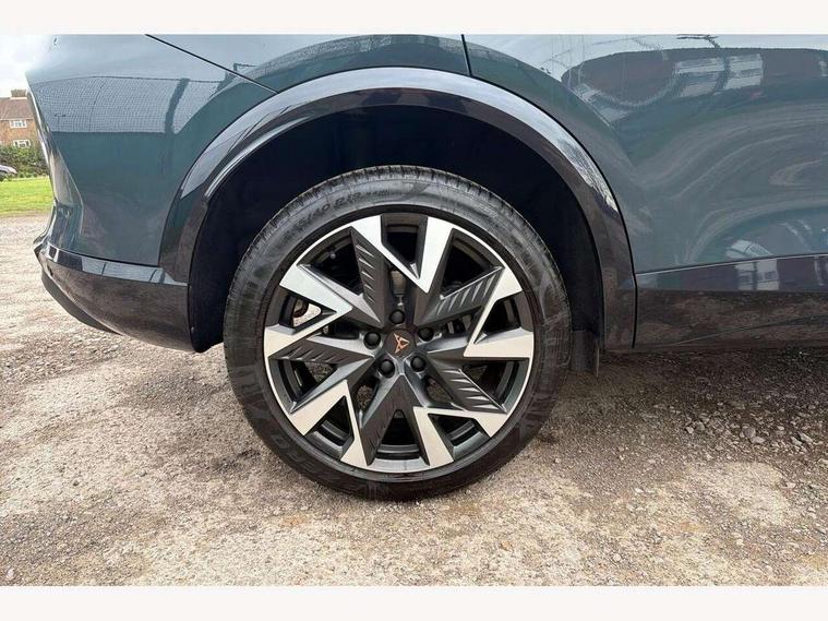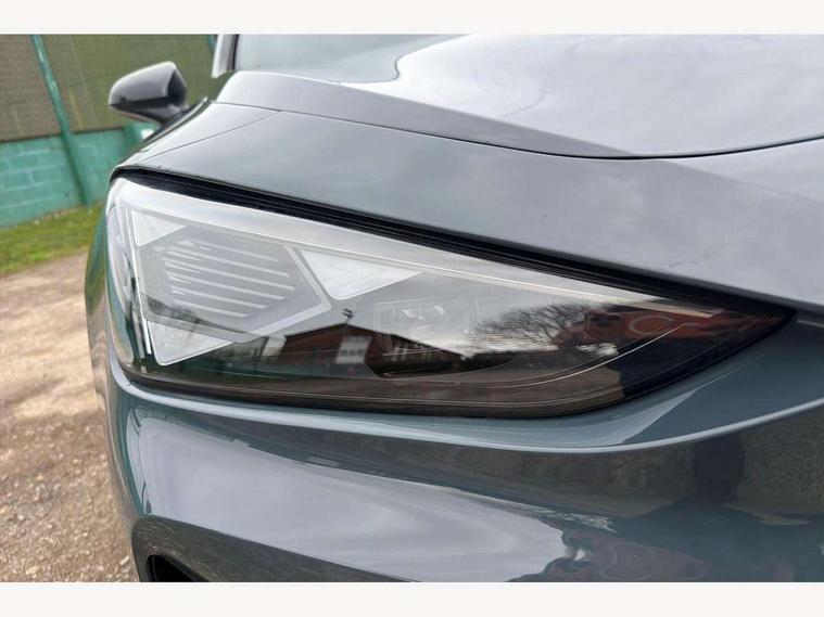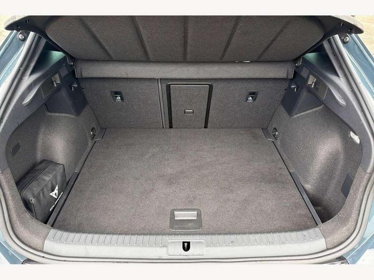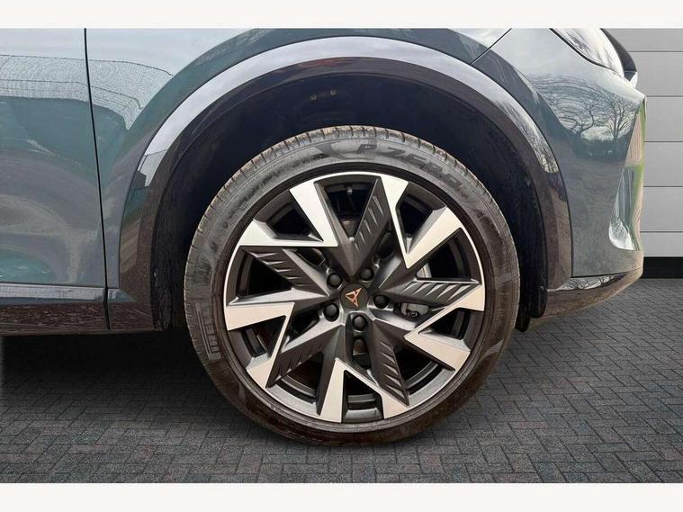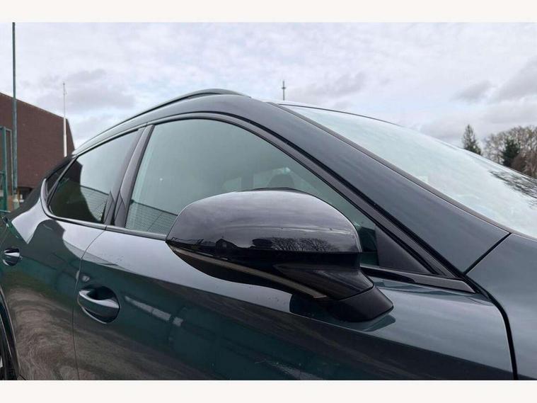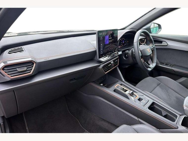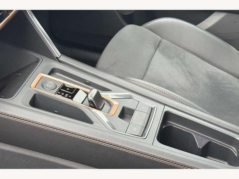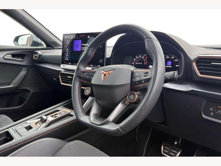 10.25" digital cockpit and configurable dashboard, Adaptive cruise control with follow-to-stop and speed limiter, Advanced driver alert system, Driving profile selection, Dynamic road sign display, Emergency steering support with turn assist, Forward collision warning with automatic braking, Front and rear parking sensors, Full link phone integration, Lane assist, Progressive steering, Rear view camera, RPM, trip computer, outside temp gauge, instrument light brightness, low fuel warning light, lights on reminder, gearshift indicator, Service interval indicator, Start/stop system with regenerative braking, Virtual pedal and electric tailgate, Voice control system, Wired Android Auto, Wireless apple carplay, Wireless phone charger, CUPRA sport suspension, Electronic locking differential and dynamic traction support, 2 front and 2 rear USB type C sockets, Media system with navigation, 12.9" touchscreen display, voice control, DAB, steering wheel mounted controls, Auto dimming rear view mirror, Body colour door handles, Body coloured bumpers, Dark grey wing mirror, Daytime running light with automatic headlight control and coming home feature, Door panel ambient lighting, Dynamic headlight range control, Electric front/rear windows, Electrically adjustable heated and folding door mirrors with memory function, Gloss black roof rails and window surrounds, High beam assist, LED 3rd brake light, LED front fog lamps with cornering function, LED Headlights, LED Taillights with dynamic indicator, Rain sensing wipers, Rear diffuser with black simulated exhaust pipes, Rear fog lights, Rear side wing doors, Rear wash/wipe, Tinted rear windows, Welcome lights (within exterior mirror housing), 12V socket, 2 front and 2 rear reading lights, 3 seat bench in 2nd row, 60/40 split rear bench seat with armrest and mechanical seat release, Black headlining, Black interior roof lining, Cupra sports pedals, Dust/pollen filter, Electrically adjustable driver's seat with memory and lumbar support, Front and rear head restraints, Front centre armrest, Heated front seats, Heated supersports multifunction leather steering wheel with satellite buttons and gear shift paddles, Height/reach adjust steering wheel, Illuminated aluminium doorsteps, Illuminated interior front door sills, Illuminated sunvisor with mirror, Isofix, Leather dashboard, door insert and side trim panel, LED smart wraparound lighting, PVC/Dinamica microfiber upholstery + bucket seats, Satellite steering wheel, Single front passenger seat, Storage pockets on rear of front seats, Three zone climate control with control panel in rear, Variable luggage/load compartment floor, 3 point seatbelts on all rear seats, ABS, Brake control system - ESC and brake booster, Child proof door locks, Driver and front passenger airbags with front passenger airbag de-activation, Electronic parking brake, Front and rear disc brakes, Front side curtain airbags, Hill hold control, Public e-call, Seat belt reminder for front and rear seats, Tyre pressure monitoring system, Anti theft alarm system, KESSY Advanced - Keyless start, keyless entry with SAFELOCK, Locking wheel bolts, Copper and aluminium interior detailing, 19" Sandstorm machined sport black and silver alloy wheels,