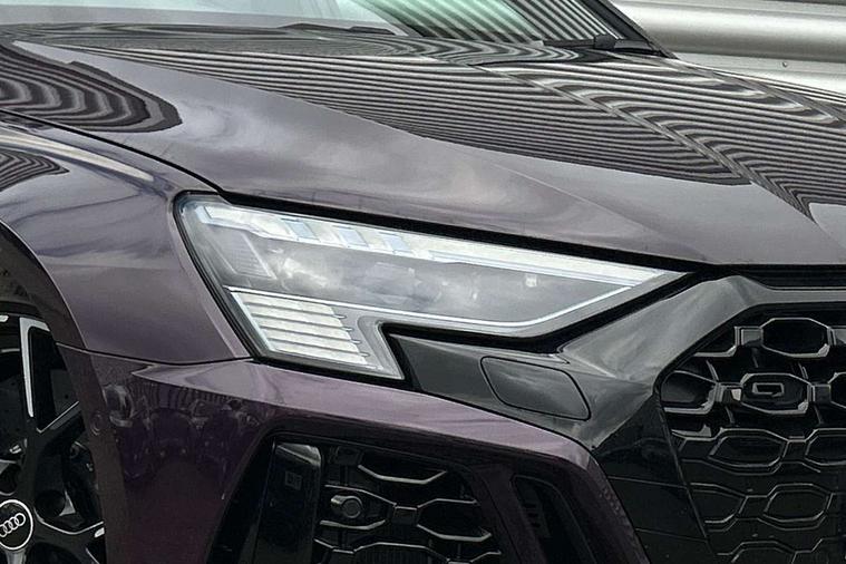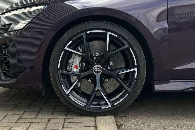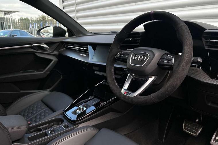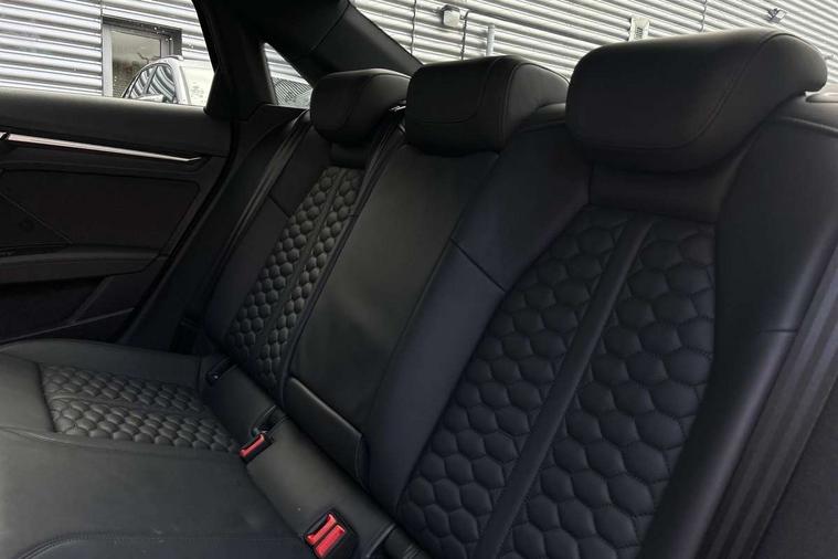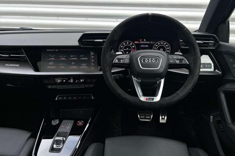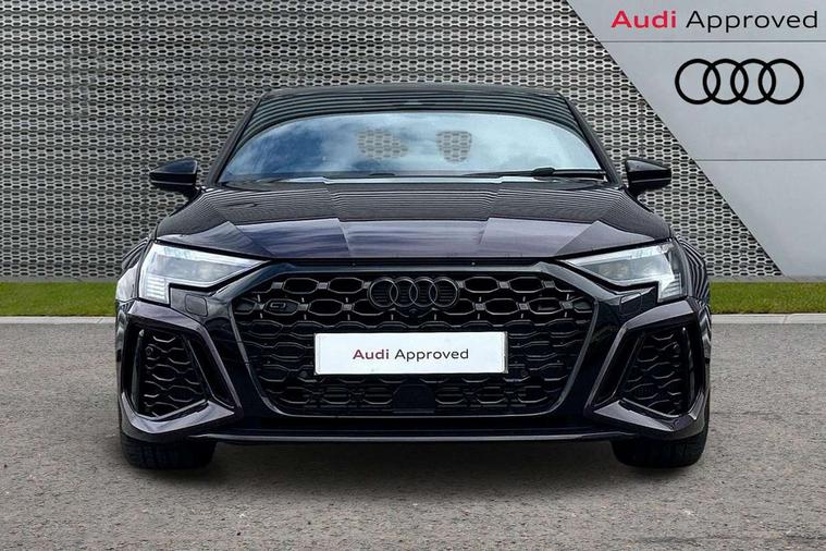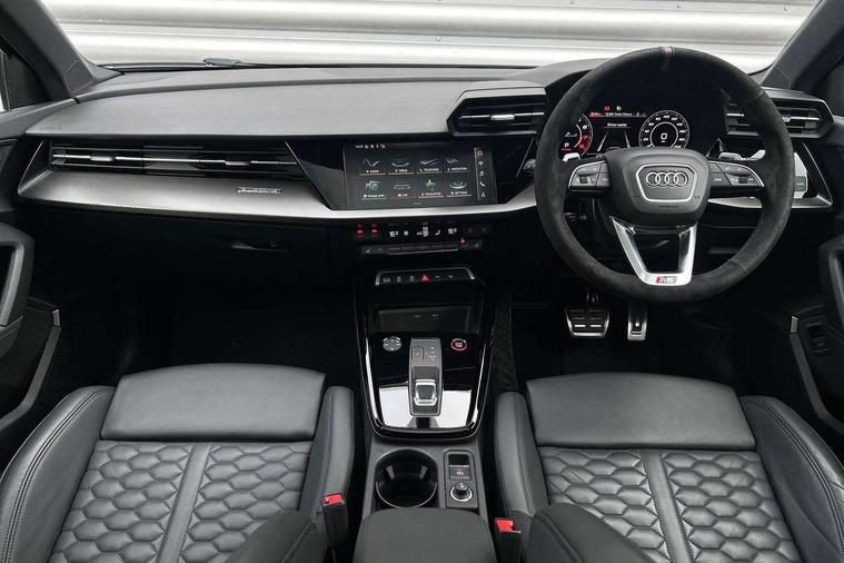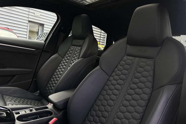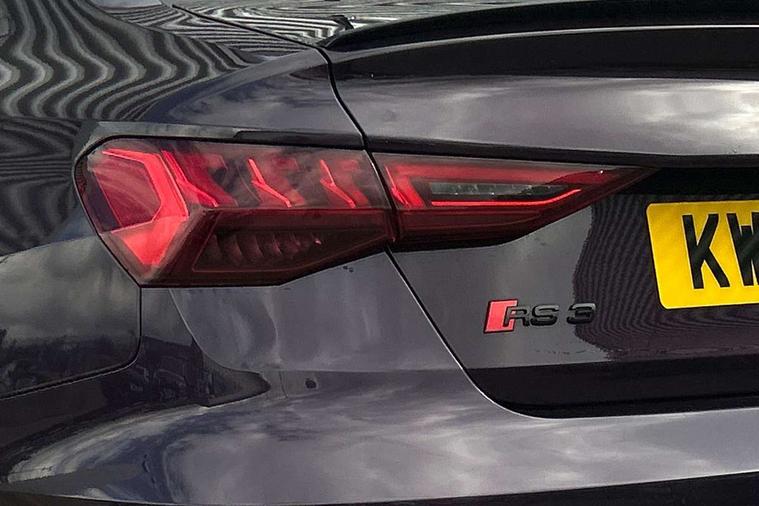 Audi smartphone interface, Audi virtual cockpit with RS specific display 12.3" full colour digital instrument cluster, Automatic start/stop system with recuperation, Bluetooth interface, Collision avoidance assistant, Emergency e-call, Head up Display, Lane departure warning system, Legal emergency call, Parking assist with parking system plus, Power operated tailgate - Luggage compartment lid opens electrically, Progressive power assisted steering, Reversing camera, Quattro permanent four wheel drive, Rear suspension, DAB Digital radio, 3rd brake light, Acoustic glass windscreen, Audi beam uses LEDs to project the Audi sport logo onto the ground as you exit your RS 3, Audi matrix LED headlights, LED rear lights, dynamic front and rear indicators and headlight cleaning system, Auto dimming rear view mirror, Black side skirts, Body colour roof, Carbon fibre engine cover, Electric adj heated/folding + auto dimming exterior mirrors with memory + LED indicator + auto kerb side function for passenger side exterior mirror, Front spoiler in high gloss black, Heat insulating glass windscreen, LED daytime running lights, Light and rain sensors, Panoramic glass sunroof, Privacy glass - dark tinted rear and rear side windows from B-pillar backwards, Rear boot, Rear side wing doors, RS exterior features in gloss black, RS sports exhaust system, 3 seat bench in 2nd row, 3 spoke leather multifunction steering wheel with gear shift paddles, 4 way lumbar support for front seats, 40/20/40 split folding rear seat bench, Black cloth headlining, Dual zone electronic climate control, Electrically adjustable front seats with memory function for driver's side, Front and rear headrests, Front centre armrest, Front sports seats RS embossed logo, Front/rear floor mats, Heated front seats, Honeycomb stitching and RS embossing, Illuminated door sill trims inlays in aluminium with RS 3 logo, RS emblems, Single front passenger seat, Stainless steel pedals and front footrest in black, Aluminium interior elements pack - RS3, Ambient lighting pack - RS3, Comfort and sound pack - RS3, Driver assistance pack with 3 spoke leather multi function steering wheel - RS3, MMI navigation plus with MMI touch - RS3, RS bodystyling - RS3, Storage Pack - RS3, 3x3 point rear seat belts, ABS/EBD, ASR, Audi pre sense front, Driver/Front Passenger airbags, EDL, ESC - Electronic Stability Control + traction control, Front passenger airbag deactivation, Front side airbags with head airbags and interaction airbag, Hill hold assist, Seat belt reminder with passenger presence detection in rear, Tyre pressure loss indicator, Warning triangle and first aid kit, Anti theft alarm, Anti-theft wheel bolts, Electronically operated child lock, Remote control central locking, Full decorative carbon trim, 19" 5 Y spoke black with graphic print alloy wheels, Tool kit, Tyre repair kit,