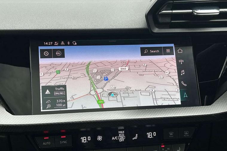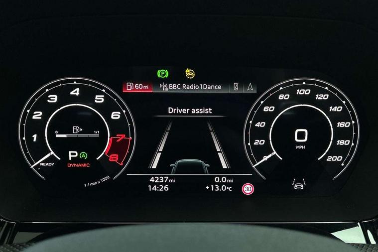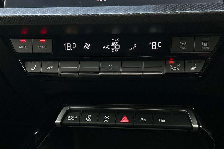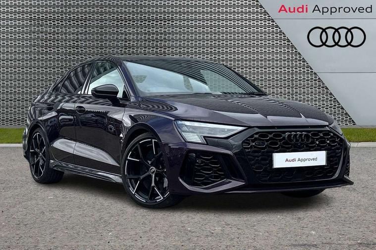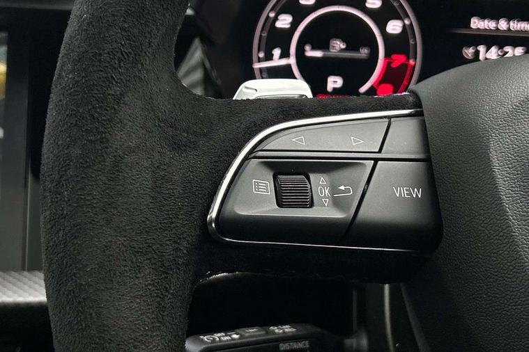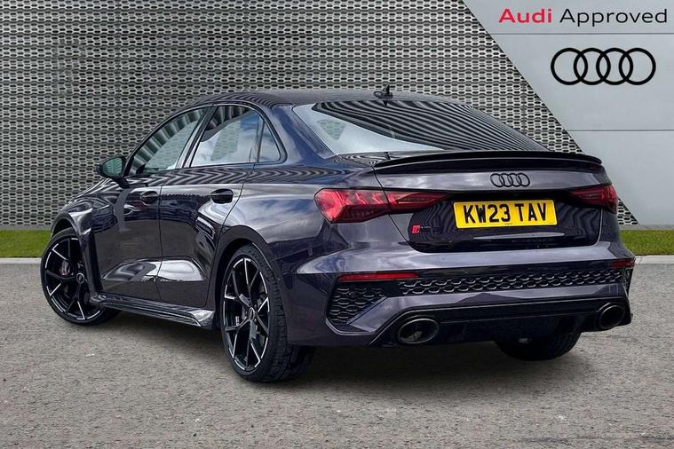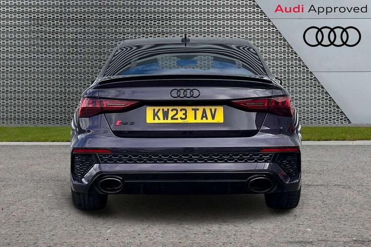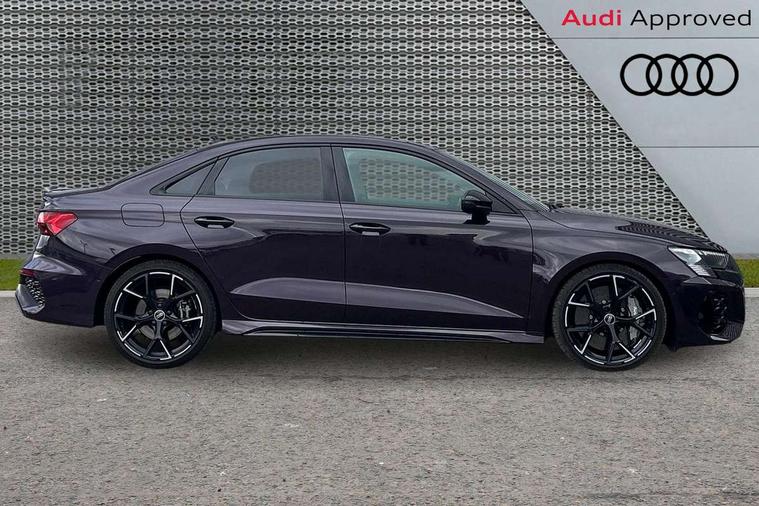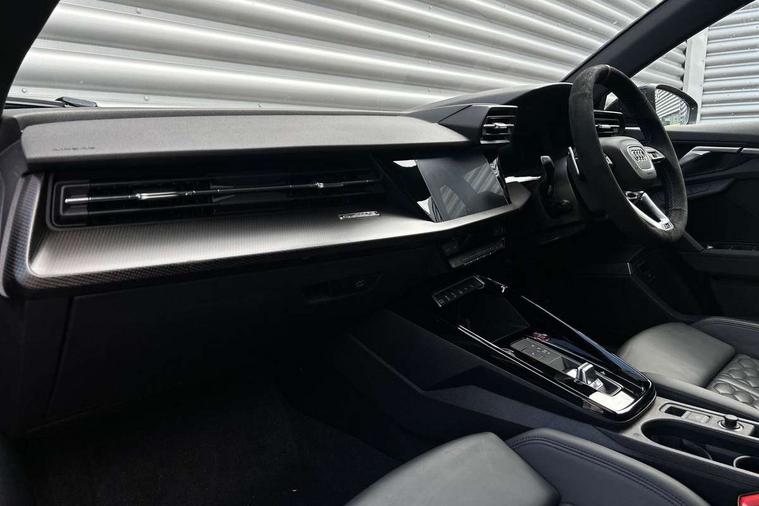 Audi smartphone interface, Audi virtual cockpit with RS specific display 12.3" full colour digital instrument cluster, Automatic start/stop system with recuperation, Bluetooth interface, Collision avoidance assistant, Emergency e-call, Head up Display, Lane departure warning system, Legal emergency call, Parking assist with parking system plus, Power operated tailgate - Luggage compartment lid opens electrically, Progressive power assisted steering, Reversing camera, Quattro permanent four wheel drive, Rear suspension, DAB Digital radio, 3rd brake light, Acoustic glass windscreen, Audi beam uses LEDs to project the Audi sport logo onto the ground as you exit your RS 3, Audi matrix LED headlights, LED rear lights, dynamic front and rear indicators and headlight cleaning system, Auto dimming rear view mirror, Black side skirts, Body colour roof, Carbon fibre engine cover, Electric adj heated/folding + auto dimming exterior mirrors with memory + LED indicator + auto kerb side function for passenger side exterior mirror, Front spoiler in high gloss black, Heat insulating glass windscreen, LED daytime running lights, Light and rain sensors, Panoramic glass sunroof, Privacy glass - dark tinted rear and rear side windows from B-pillar backwards, Rear boot, Rear side wing doors, RS exterior features in gloss black, RS sports exhaust system, 3 seat bench in 2nd row, 3 spoke leather multifunction steering wheel with gear shift paddles, 4 way lumbar support for front seats, 40/20/40 split folding rear seat bench, Black cloth headlining, Dual zone electronic climate control, Electrically adjustable front seats with memory function for driver's side, Front and rear headrests, Front centre armrest, Front sports seats RS embossed logo, Front/rear floor mats, Heated front seats, Honeycomb stitching and RS embossing, Illuminated door sill trims inlays in aluminium with RS 3 logo, RS emblems, Single front passenger seat, Stainless steel pedals and front footrest in black, Aluminium interior elements pack - RS3, Ambient lighting pack - RS3, Comfort and sound pack - RS3, Driver assistance pack with 3 spoke leather multi function steering wheel - RS3, MMI navigation plus with MMI touch - RS3, RS bodystyling - RS3, Storage Pack - RS3, 3x3 point rear seat belts, ABS/EBD, ASR, Audi pre sense front, Driver/Front Passenger airbags, EDL, ESC - Electronic Stability Control + traction control, Front passenger airbag deactivation, Front side airbags with head airbags and interaction airbag, Hill hold assist, Seat belt reminder with passenger presence detection in rear, Tyre pressure loss indicator, Warning triangle and first aid kit, Anti theft alarm, Anti-theft wheel bolts, Electronically operated child lock, Remote control central locking, Full decorative carbon trim, 19" 5 Y spoke black with graphic print alloy wheels, Tool kit, Tyre repair kit,