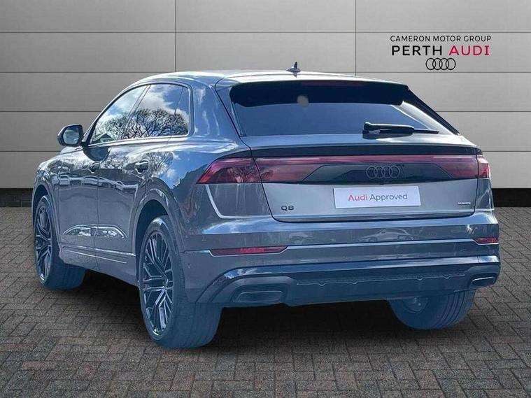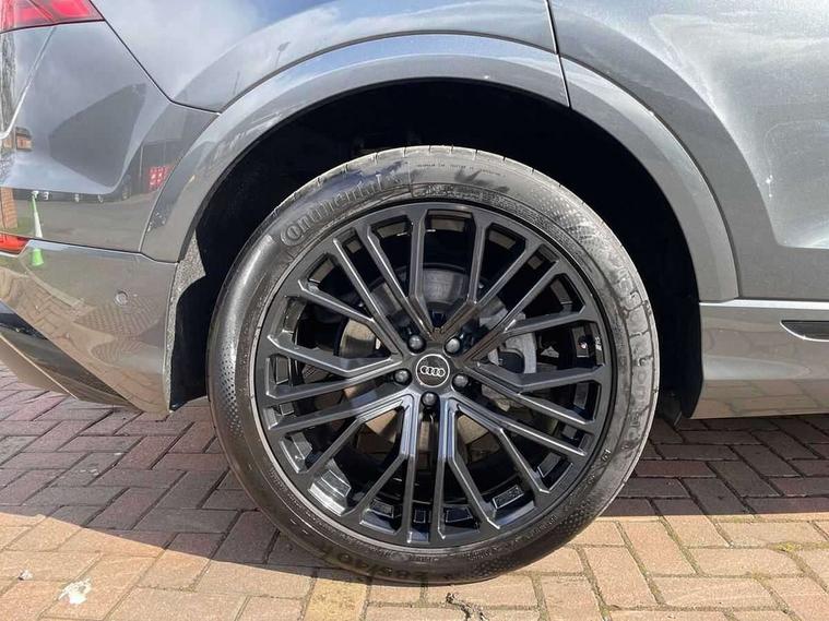 10.1" and 8.6" Dual colour touchscreens, Audi application store, Audi connect safety and service (e-call), Audi connect with Amazon Alexa Integration, Audi drive select, Audi parking system plus includes 360 degree display with front and rear sensors, Audi phone box light with wireless charging, Audi virtual cockpit - 12.3" high resolution LCD display with fully customisable instrument cluster, Automatic start/stop system, Bluetooth, Electro-mechanical PAS, Low washer fluid indicator, MMI navigation plus with MMI touch, Natural voice recognition, On board computer, Operating buttons in black, glass look with haptic feedback, Power operated tailgate, Rear view camera, Service interval indicator, Smartphone interface includes wireless Apple carplay/Android Auto, 48V Mild hybrid technology, Adaptive sport air suspension, Diesel particulate filter, Quattro all wheel drive with self locking centre differential, Audi music interface with 2 USB ports with charge and data functions, Audi sound system with 6 channel amplifier, 180 watt amplifying capacity and 10 loudspeakers including subwoofer, Aux-in socket, DAB Digital radio, 3rd brake light, Audi beam, Auto dimming frameless rear view mirror, Black exhaust tailpipes, Black single frame mask, Coming/leaving home lighting function, Electric front+rear windows, Electrically folding auto dimming/adjustable/heated door mirrors with memory function, LED side indicators and kerb view function for passenger side, Headlight washers, Heat insulating glass in windshield, LED rear light plus, LED signature daytime running lights, Loading edge protection in stainless steel, Matrix LED headlights with dynamic front and rear indicators, Platinum grey front spoiler lip and diffuser insert with honeycomb grille in black, Privacy glass - dark tinted rear and rear side windows from B-pillar backwards, Rain and light sensors, Rear side wing doors, Rear wiper, Singleframe grille surround in matte platinum grey, 2 zone automatic climate control, 3 bench rear seats in 2nd row, 4-way lumbar support for front seats, 40:20:40 split folding rear bench seat, Black cloth headlining, Comfort front centre armrest, Driver seat memory function, Electrically adjustable front seats, Front head restraints, Front/rear floor mats, Heated front seats, ISOFIX child seat mounting for front passenger seat and 2 outer rear seats with top tether child seat mounting for all 3 rear seats, LED interior ambient lighting, Luggage compartment sill protection in stainless steel, Rear centre armrest with 2 cupholders, Rear headrests, Seat cushion displaceable by 100mm in the ratio 60:40, Single front passenger seat, Stainless steel pedals, Sunvisors with illuminated vanity mirrors, Black styling pack plus - Q8, 3 point seatbelts on all seats, Audi pre sense front, Convenience key with safelock, Driver and front passenger, front side and curtain airbags, Electromechanical parking brake, Electronic Stability Control (ESC) including ABS, ASR and EDL, Front passenger airbag deactivation, Hill descent control, Hill hold assist, Predictive pedestrian protection, Seatbelt monitoring, Traction control, Tyre pressure loss indicator, Warning triangle and first aid kit, Anti theft alarm with tow away protection, Anti-theft wheel bolts and wheel loosening detection, Electronically operated child lock, Immobiliser, Keyless go with remote central locking, Polished oak trim with grey finish inlay, Tool kit, Tyre repair kit,