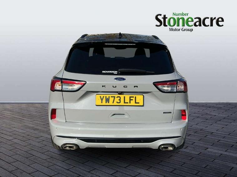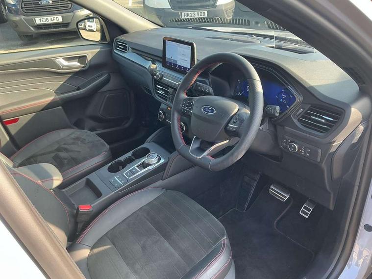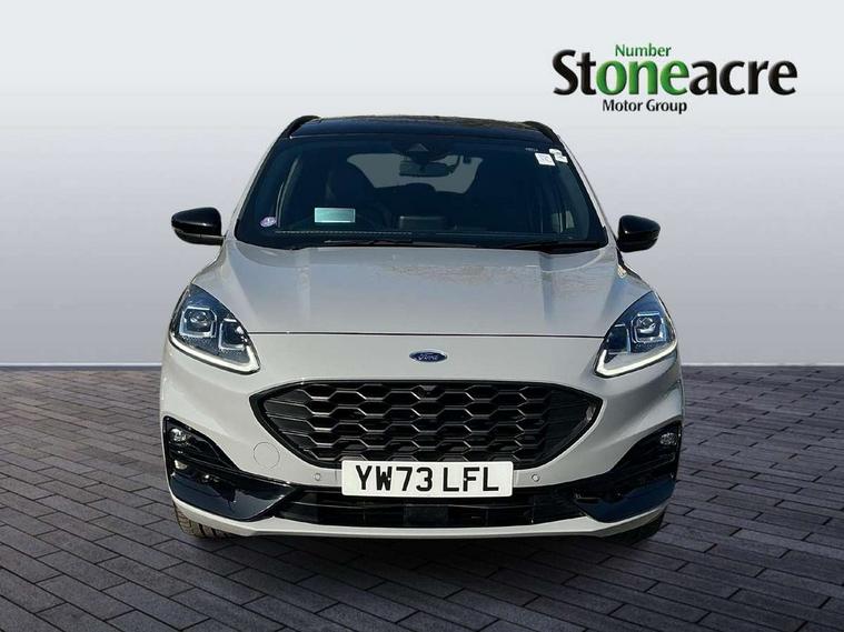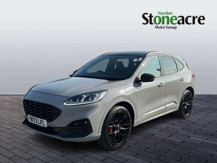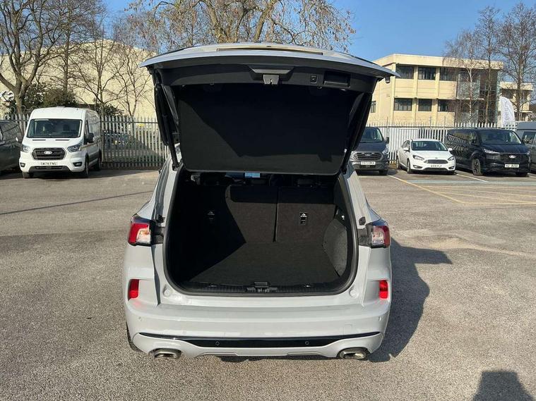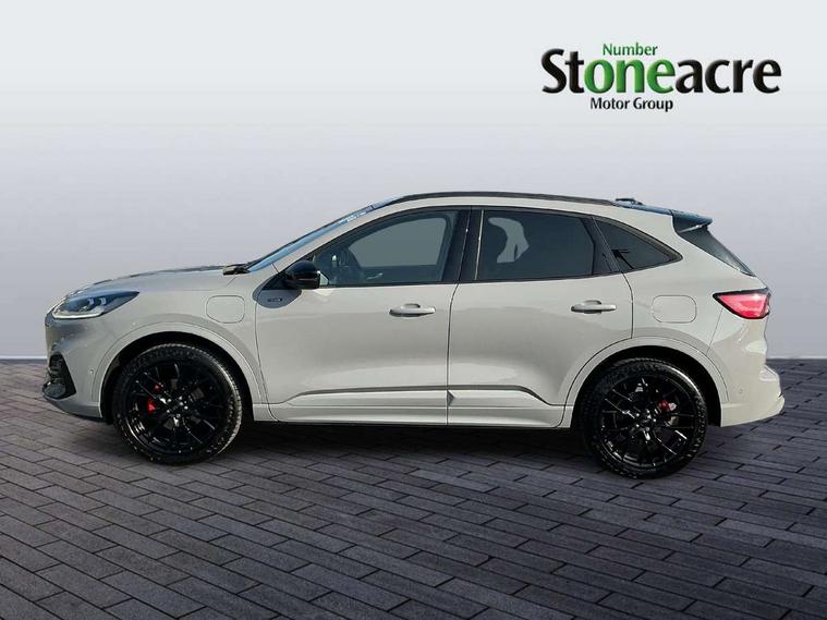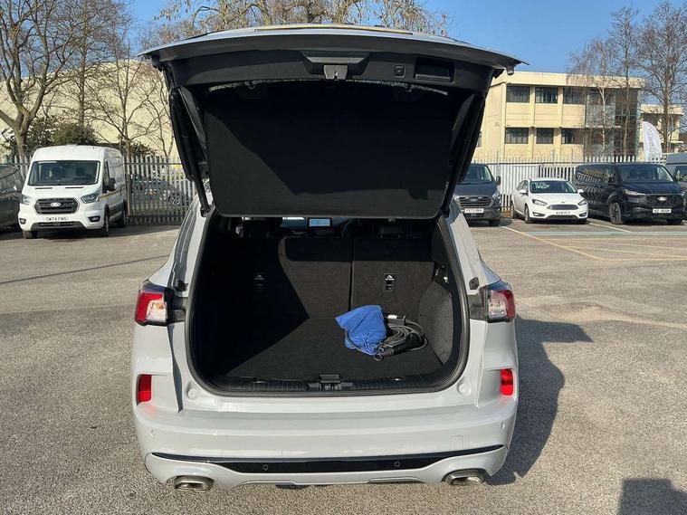 12.3" digital colour instrument cluster, Ford SYNC 3 with 8" TFT LCD touchscreen, App Link, andriod auto/apple carPlay, emergency assistance and navigation with Ford pass connect, Front and rear parking sensors, Hands free power tailgate, Lane keeping aid with lane departure warning, Power assist steering, Rear view camera, Selectable drive modes, 3-Pin Home charge cable (230V/16A Domestic socket), 3.7 kW monophase on board charger, Sports suspension, B&O premium audio system with 10 speakers and subwoofer, 2 USB ports, DAB radio/CD, Black roof rails, Exclusive paint, Large rear spoiler, LED daytime running lights, LED rear lights, Power folding heated door mirrors with puddle lights, Power front/rear windows with global close, Power opening panoramic roof, Quickclear heated windscreen, Rear privacy glass, Rear side wing doors, Rear wiper, Third brake light, 2nd row sliding seats with 60:40 split, Electronic automatic temperature control (EATC), Front and rear head restraints, Heated passenger and driver seats, Heated rear seats, Heated steering wheel, Partial premium touch Sensico with black cloth inserts and red stitching, Single front passenger seat, Driver assistance pack - Kuga with front camera system, Technology pack - Kuga with LED headlights, 3x3 point rear seatbelts, Electronic stability control (ESC) and ABS, Manual child proof rear door locks, Post collision braking, Pre collision assist with autonomous emergency braking, Red brake calipers, Keyless entry and Ford power start button (Keyless start),