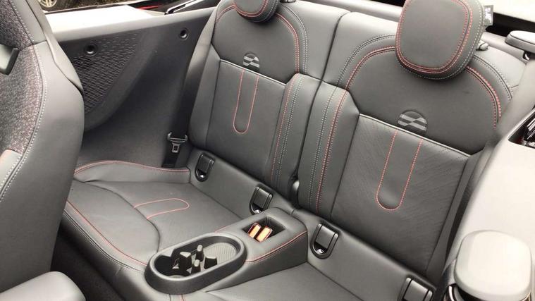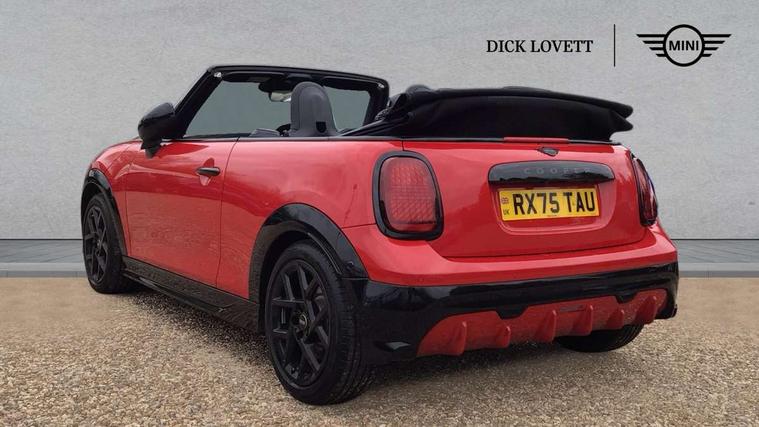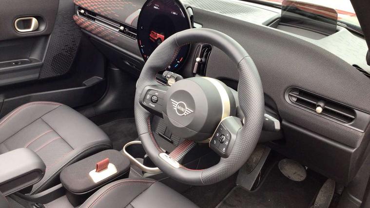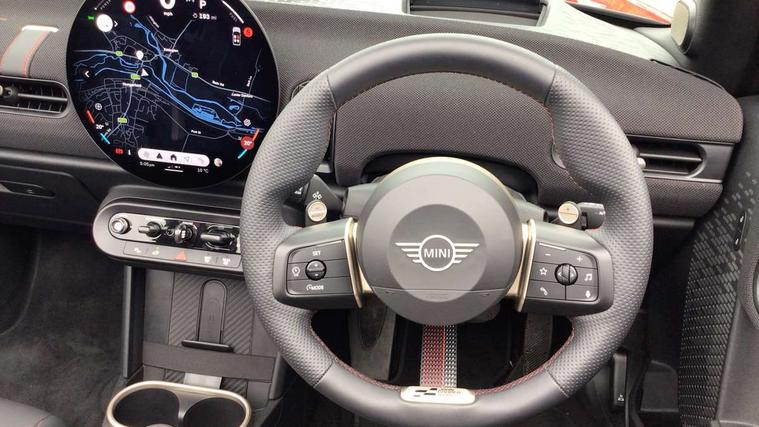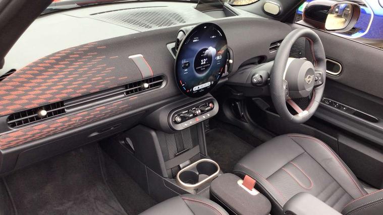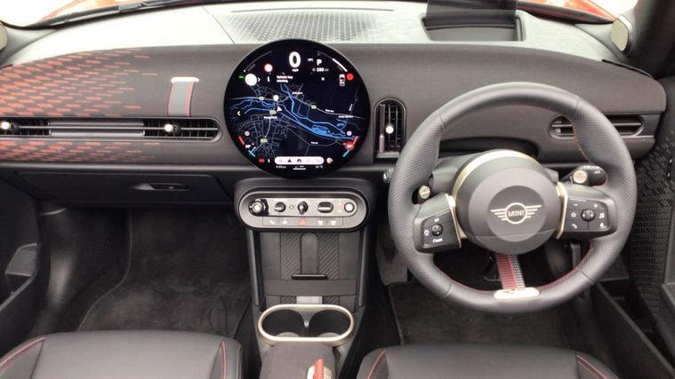 Always open timer, Central toggle bar, Circular OLED Screen, Compatible mobile phone bluetooth with audio streaming, Cruise control, Digital instrument cluster, e-Call (emergency call), MINI Experience Modes, Mini navigation system, On board computer, PAS, Service interval indicator, 7 speed steptronic transmission with double clutch, Adaptive suspension, DAB Digital radio, Personal eSim, Auto headlights, Electric front windows, Front and rear apron, High gloss hexagonal patterned grille surround, LED 3rd brake light, LED daytime running lights, LED Headlights, LED indicator lights, LED rear lights, Logos in Vibrant Silver, Rain sensor window wipers, Rear boot, Rear fog lights, Rear roof spoiler with airblades, Wind deflector, 2 seat bench in second row, 2 zone automatic air conditioning, 60/40 rear seat bench, Ambient lighting, Black lower band in high gloss, Floor mats, Front and rear head restraints, Front compact armrest, Heated steering wheel, Height adjustable passenger seat, Lidded storage box in Black/Red knit, Light headliner, Luggage compartment lighting, Partially perforated vescin steering wheel with red accent, black/red decorative strap, Single front passenger seat, Steering wheel paddle shift, Sunvisors with vanity mirrors, Driving assistant pack - Cooper Convertible, Park assistant pack - Cooper Convertible, 3 point seatbelts on all four seats, 6 Airbags - front, side, head and seat belt tensioners, Anti-lock braking system (ABS), Brake caliper in Black with JCW badge, DSC - Dynamic Stability Control, Electronic parking brake, Front and rear disc brakes, Front ISOFIX (iSize), Front passenger airbag deactivation, JCW Sport Brakes, Traction control, Tyre pressure monitoring system, Alarm, Immobiliser, Physical spare key (not digital), Remote central locking, Black/Red decorative dash strap, Tyre repair kit,