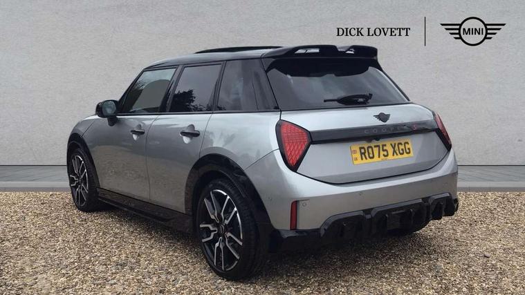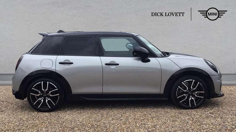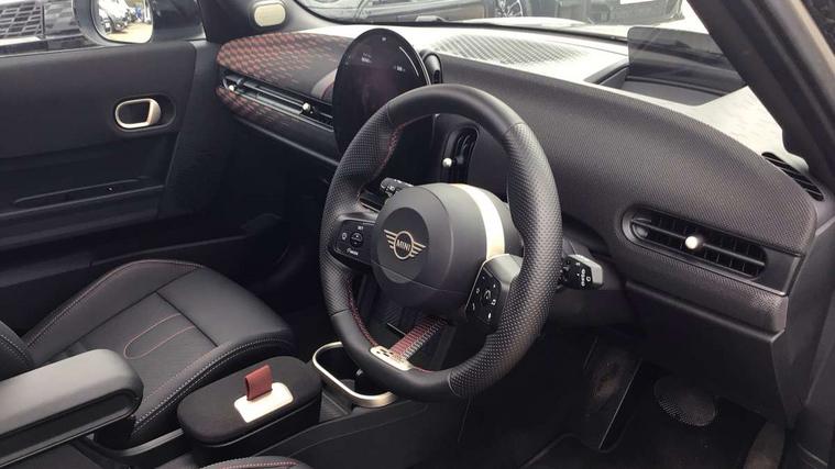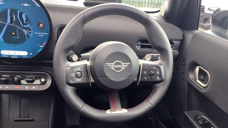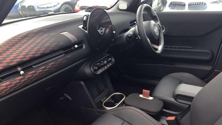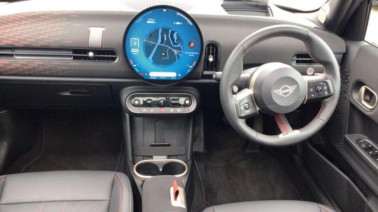 Central toggle bar, Circular OLED Screen, Compatible mobile phone bluetooth with audio streaming, Cruise control, Digital instrument cluster, Electro-mechanical speed dependant steering assistance, Emergency call service, Gaming controller with intelligent personal assistant voice update, MINI Experience Modes, Mini navigation system, On board computer, Service interval indicator, Tailgate, 7 speed sport transmission with double clutch, Adaptive suspension, DAB Digital radio, Front USB charger, Personal eSim, Rear USB charger, Adaptable light signatures, Auto headlights, Electric adjustable heated door mirrors, Electric front+rear windows, Front and rear apron, Heated rear window, Heated windscreen washer jets, High gloss hexagonal patterned grille surround, Jet black mirror caps, LED 3rd brake light, LED daytime running lights, LED indicator lights, LED rear lights, Rain sensor window wipers, Rear fog lights, Rear roof spoiler with airblades, Rear side wing doors, Rear window wiper, 2 zone automatic air conditioning, 3 seat bench in 2nd row, 60/40 rear seat bench, Ambient lighting, Black lower band in high gloss, Cupholders, Dark headliner, Floor mats, Front and rear head restraints, Front compact armrest, Heated steering wheel, Height adjustable passenger seat, Lidded storage box in Black/Red knit, Luggage compartment lighting, Partially perforated vescin steering wheel with red accent, black/red decorative strap, Single front passenger seat, Steering wheel paddle shift, Sunvisors with vanity mirrors, Driving assistant pack - Cooper Hatchback, Level 1 pack - Mini Hatchback, Park assistant pack - Cooper Hatchback, 3 point seatbelts on all five seats, 6 Airbags - front, side, head and seat belt tensioners, Anti-lock braking system (ABS), Brake caliper in Black with JCW badge, Child locks on rear doors, DSC - Dynamic Stability Control, Electronic parking brake, Front and rear disc brakes, Front ISOFIX (iSize), Front passenger airbag deactivation, JCW Sport Brakes, Traction control, Tyre pressure monitoring system, Alarm, Immobiliser, Remote central locking, Black/Red decorative dash strap, Tyre repair kit,