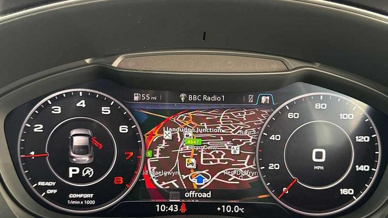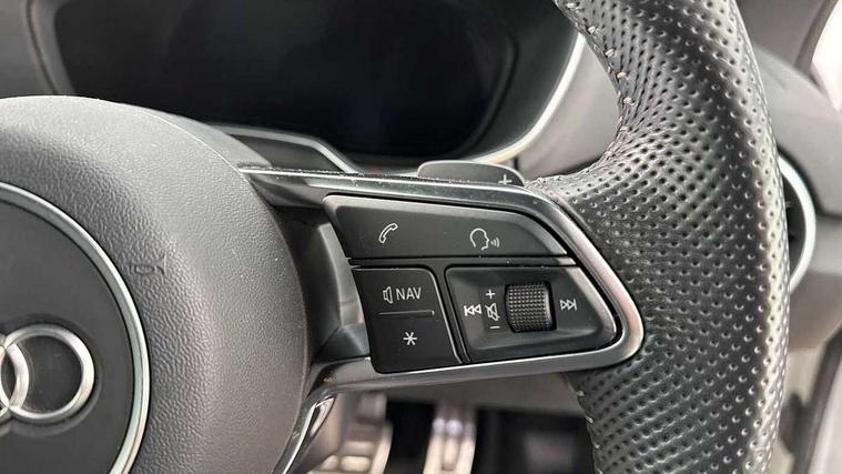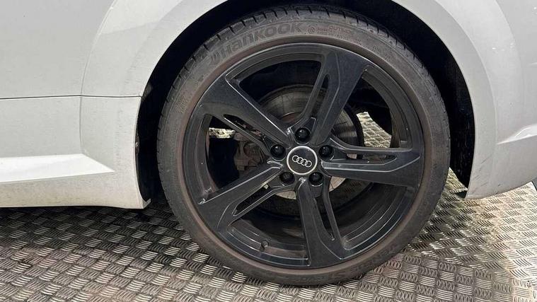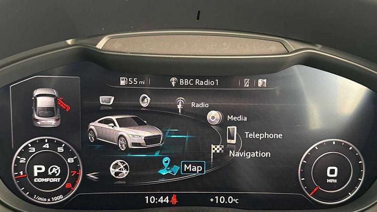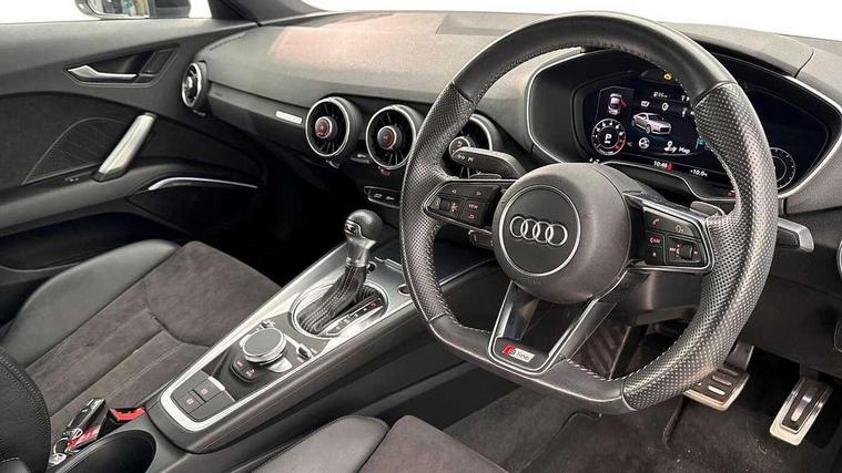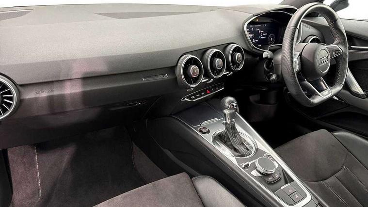 Audi drive select, Audi virtual cockpit - 12.3" high-resolution LCD display with fully customisable instrument cluster, Cruise control + speed limiter, MMI touch panel, Mobile phone preparation with bluetooth interface, Progressive power assisted steering, Service interval indicator, Audi music interface, Auxiliary input socket, Bluetooth audio streaming, DAB Digital radio, MMI Radio with CD player and SD/XC card slot, Auto headlight range control, Black door mirrors, Body colour bumpers, Electric front windows, Front fog lights, Green tinted heat insulating glass, High gloss black front grille, LED daytime running lights, Matt black radiator grille and number plate holder, Privacy glass, Rear diffuser, Retractable rear boot spoiler, S Line body styling, Sunband for windscreen, 3 spoke flat bottomed high multi-function leather sport steering wheel with gearshift paddles, Aluminium door sill trims, Black headlining, Electric lumbar support, Extended aluminium look with stainless steel pedals, Front centre armrest, Front head restraints, Front passenger seat isofix location point, Height/reach adjust steering wheel, ISOFIX on outer rear seats, Perforated leather gearknob, Split folding rear seat, Top tether anchor plate for isofix child seat, Auto dimming rear view mirror with light and rain sensors pack - TT, High gloss black styling pack - TT RS, Non smoking pack - TT/TT RS, 3 point front seat belts, ABS, ASR traction control, Curtain airbags, Driver/Front Passenger airbags, EDL traction control, Electromechanical parking brake, ESP, First aid kit, Front passenger airbag deactivation, Front side airbags, Head airbags, Seatbelt warning, Tyre pressure warning, Warning triangle, Anti theft alarm, Immobiliser, Keyless start, Locking wheel bolts, Remote central locking, Matt brushed aluminium inlays, Tyre repair kit,