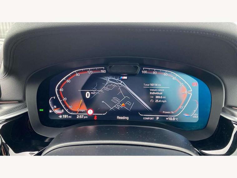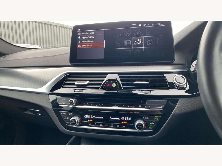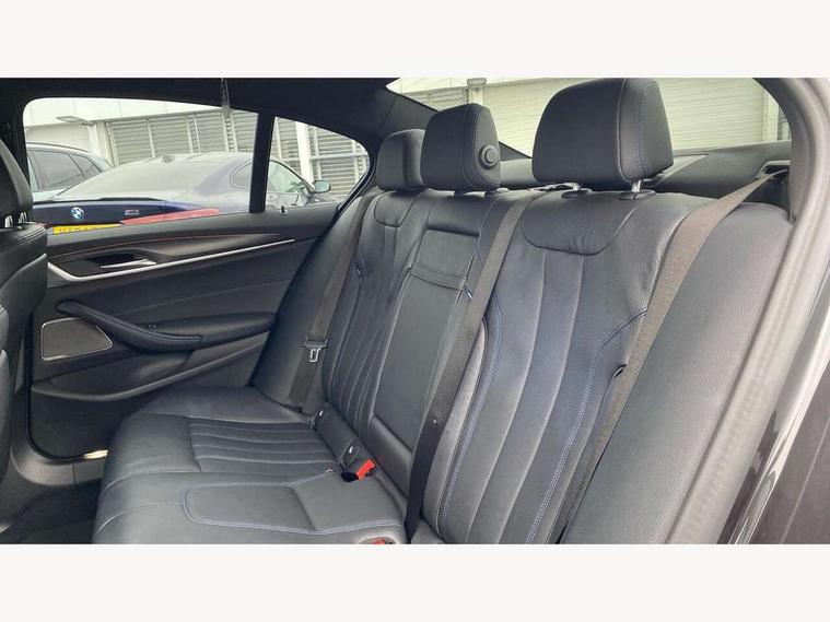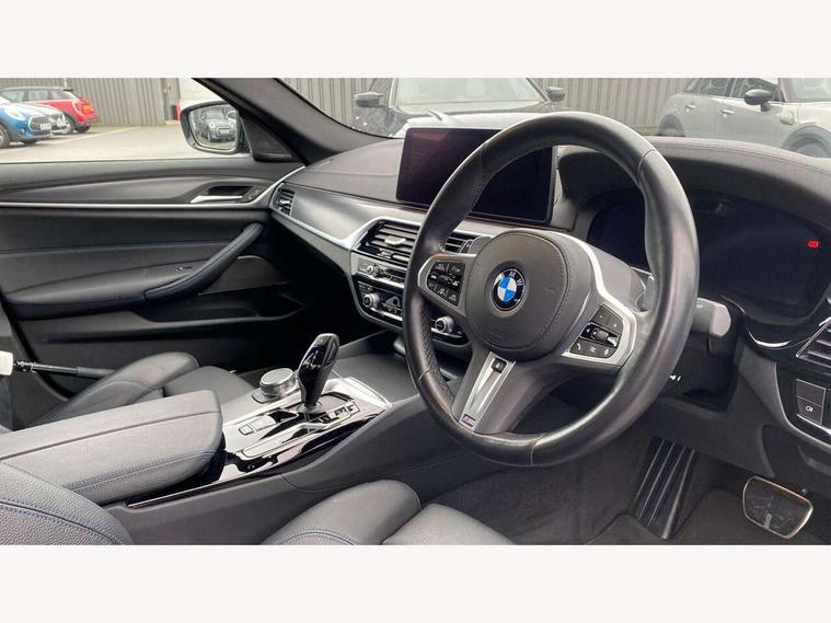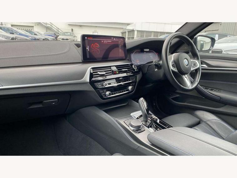 32GB hard disc drive (HDD) memory, Active Guard, Bluetooth connection, BMW ConnectedDrive online services, BMW Live Cockpit Professional sat nav system with 12.3" instrument display and high resolution control display, BMW Teleservices, Brake pad wear indicator, Cruise control with brake assist, Driving experience switch, eCall emergency call system, Electric Power Steering (EPS) with Servotronic, iDrive controller with shortcut buttons, Intelligent emergency call, Multifunctional instrument panel, Oil sensor for level and grade, On board computer inc. average speed, fuel consumption, liquid crystal Info display, journey computer, outside temperature display, personal profile, On-board diagnosis - OBD, Powered by Operating System 7.0, Service interval indicator, Speed limiting function, Stop/start button, 48V Mild hybrid technology, Drive performance control with ECO PRO comfort + sport mode, Engine cover with twin turbo designation, M sport suspension, Petrol Particulate Filter, Steptronic sport transmission with gearshift paddle switches on steering wheel, DAB Digital radio, Favourite buttons, Acoustic glazing, All round anti-corrosion system, Automatic windscreen wipers and automatic headlight, Automatically dimming rear view mirror, BMW Individual high gloss shadow line includes exterior mirror frame, window frame surround, B pillar finish, air breather in high gloss black, Body colour door handles, Body coloured bumpers, Door handle illumination, Dynamic brake lights with LED technology, Electric front and rear windows with fingertip open/close + anti-trap facility and comfort closing function, Electrically adjustable and heated exterior mirrors includes integrated direction indicators and automatic parking function, Folding exterior side mirror with auto- dimming, Follow me home headlight function, Heated windscreen washer jets, High gloss black active air stream kidney grille, LED daytime running lights, LED Headlights, LED third brake light, M designation on front side panels, left and right in chrome, M Sport exterior styling, Preparation for high beam assistant, Rear boot, Rear side wing doors, Trapezoidal visible exhaust tailpipes, 12V power socket in front and rear, 3 seat bench in 2nd row, Armrest - front and rear integrated door trim, centre console includes storage compartment, rear centre includes 2 cupholders, Child seat ISOFIX attachment with rear outer seats includes top tether, Cup holders (2 front and 2 rear), Front and rear footwell lights, Front reading lights, Height and length adjustable steering column and activation via lateral lever on the steering column, Lockable glove compartment with light, M door sill finishers, M specific pedals, M specific velour floor mats, Multifunction controls for leather steering wheel, Rear headrests, Single front passenger seat, Three spoke sport M leather steering wheel, Ambient lighting pack - 5 Series, Connected package professional - 5 Series, M Aerodynamic pack - 5 Series, Airbags - driver/front passenger, rear and side, first and second row seats head airbags, front passenger seat airbag deactivation, Anti-lock braking system (ABS), Automatic Stability Control (ASC), Brake assist function, Brake energy regeneration, Cornering brake control (CBC), Crash sensor activating central locking release, hazard warning lights, fuel cut off and interior lighting, Deformation zones - front and rear with door reinforcements and bumpers up to 2.5 mph, DSC - Dynamic Stability Control, Dynamic brake control, Dynamic Traction Control - DTC, Electromechanical parking brake with automatic drive away release and auto hold function, Electronic brake force distribution, Engine drag torque control, Front and rear brake discs with interior ventilation, Front head restraints with anti-whiplash, Hill start assist, Mechanical child proof lock on rear doors, Passive protection for pedestrians, Rear door child safety locks, Side impact protection, Three point seat belts for all four seats, Two tone horn, Tyre pressure indicator, Warning triangle and first aid kit, Alarm system (Thatcham 1) with remote control and electronic engine immobiliser, Locking wheel bolts,