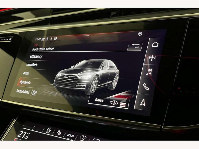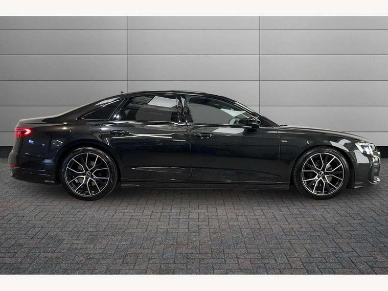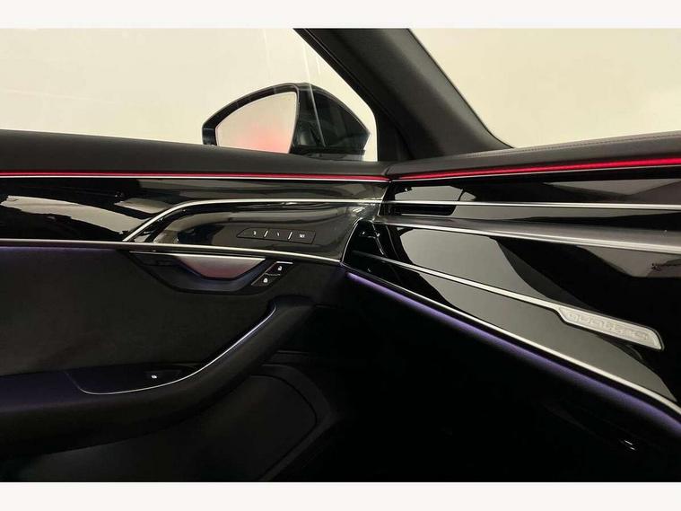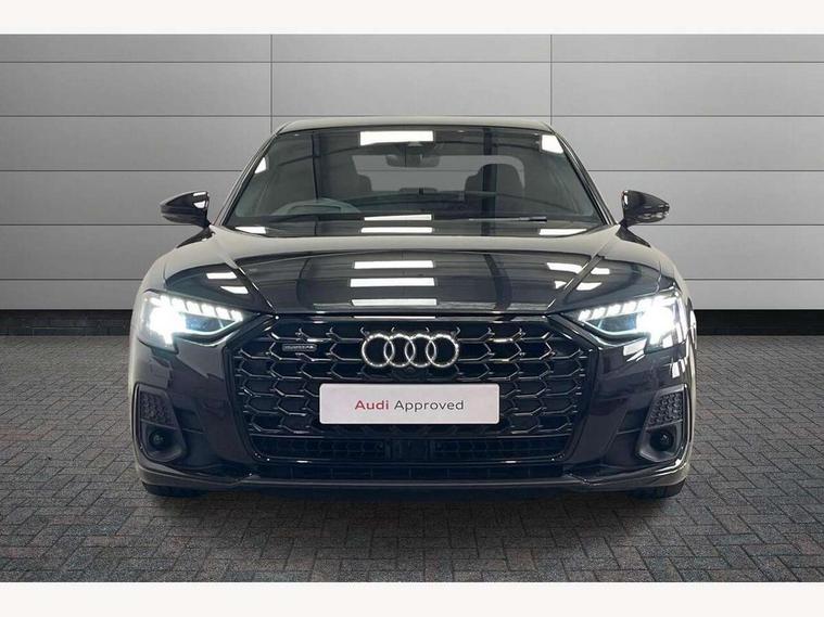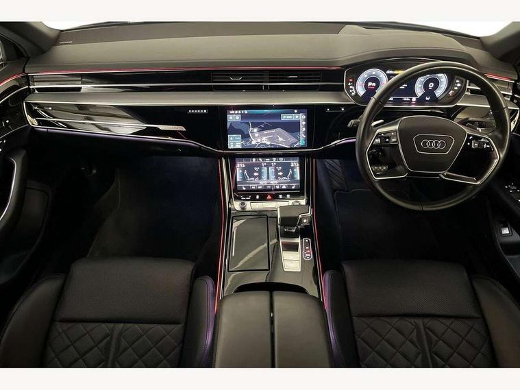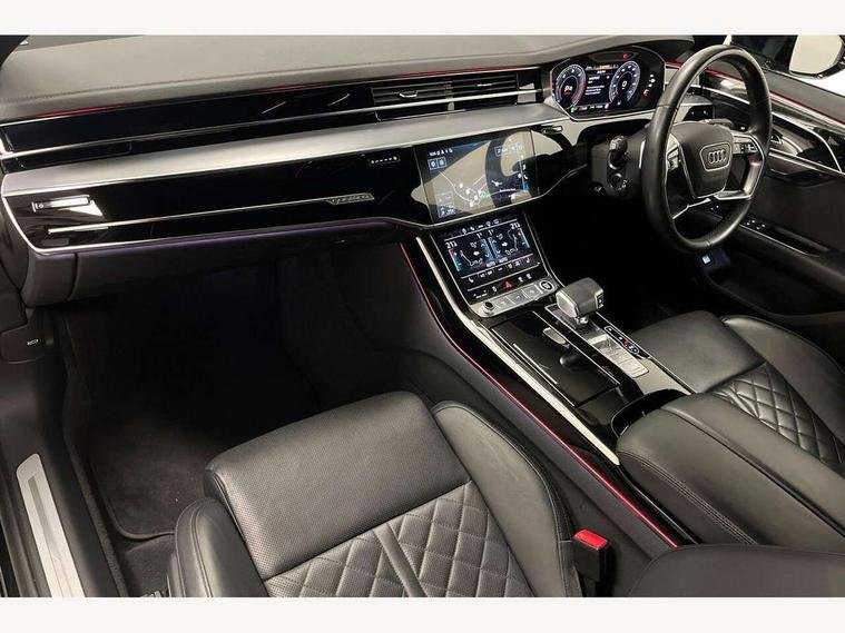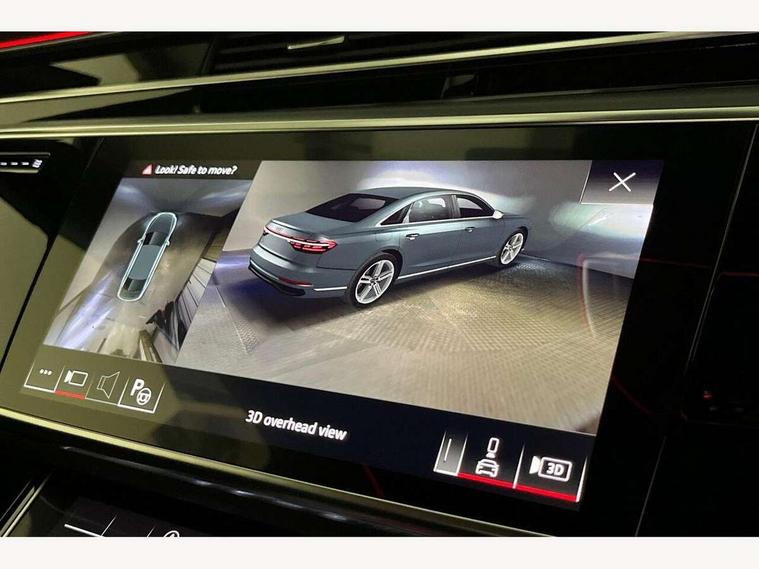 'Lights On' Reminder warning buzzer, 360 degree camera with top view, Adaptive cruise control with cruise assist, emergency assist, efficiency assist, swerve assist, turn assist and speed limiter, Audi connect safety and service (e-call), Audi drive select, Audi phone box with wireless charging, Audi virtual cockpit, Audi wireless smartphone interface, Bluetooth interface, Camera based traffic sign recognition, Convenience key, Dynamic all wheel steering, Head up Display, MMI navigation plus with MMI touch + Twin touch screens with haptic feedback, Operating buttons in black, glass look with haptic feedback including extended aluminium look, Parking assist plus with remote parking, Power door closure, Power operated tailgate, Rear central control unit, Remote fuel filler release, Service interval indicator, 24 litre AdBlue tank, 48V Mild hybrid technology, 8 speed transmission with hill hold assist, 82 litre fuel tank, Adaptive air suspension, Diesel particulate filter, Quattro all wheel drive with self locking centre differential, Audi music interface, DAB digital radio module, DVD System, MMI radio plus, USB connection, USB ports with charging function in the rear, Acoustic double glazing, Adaptive windscreen wipers with integrated washer jets, Audi high beam assist with Vorsprung illuminated text, Audi space frame, Auto dimming rear view mirror, Body colour bumpers, Body colour door handles, Body colour side protection with aluminium trim strips, Digital matrix LED headlights with highbeam assist, static cornering light, all weather lights, automatic dynamic headlight range control, Dynamic front and rear indicators, Electric front windows, Electric rear windows with isolation switch, Electric sunblinds for rear window and rear door windows, Electrically adjustable heated folding + automatically dimming exterior mirrors with memory function and integrated LED indicators, Headlight cleaning system, Heat insulating darkened glass in side and rear windows, Heat insulating glass windscreen, Heated rear window, Heated windscreen washer jets, LED brake lights, LED daytime running lights, OLED rear lights with specific rear light signature 3, Privacy glass, Rear boot, Rear side wing doors, Side skirts, Third brake light, Two part panoramic glass sunroof, 4 zone control automatic air conditioning, Centre console with cupholders, Comfort centre armrest front, Comfort rear headrests, Door armrest with storage, Door pockets with bottle holder, Driver and front passenger side sunvisors with illuminated vanity mirrors, Dust/pollen filters, Electric front seats with memory function, Front floor mats, Glove compartment cooling, Heated front seats, Heated rear seats, Height/reach electric steering column with easy exit function, Isofix child seat mounting points on outer rear seats, Leather gearknob, Massage and ventilation function for front seats, Passenger footwell storage net, Roof mounted sunglasses holder, Single front passenger seat, Valcona leather upholstery with front sports seats in diamond quilted, Air quality Pack - A8, Black exterior styling pack - A8, Chrome exterior pack - A8, City assist pack - A8, Dinamica microfibre black headlining pack - A8, Extended leather pack - A8, Extended LED Interior multi coloured light pack - A8, 3 point seatbelts on all rear seats, ABS/EBD, Active front headrest system, ASR traction control, Audi pre sense basic, Audi pre sense front, Driver/Front Passenger airbags, EDL traction control, Electromechanical parking brake, ESP, Extended pedestrian protection measures, Front and rear side airbags with head airbag system, Front brake discs, callipers painted black, Front passenger airbag deactivation, Rear brake discs, callipers painted black, Rear child proof door locks, Seatbelt reminder + electric contact in buckle + advanced safety equipment, Tyre pressure loss indicator, Warning triangle and first aid kit, Anti theft alarm tow away protection, Anti-theft wheel bolts and wheel loosening detection, Remote central locking, Dark matt brushed aluminium lower inlays, Piano black finish upper inlays,