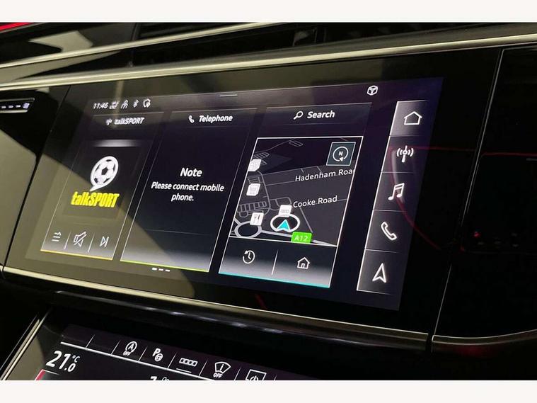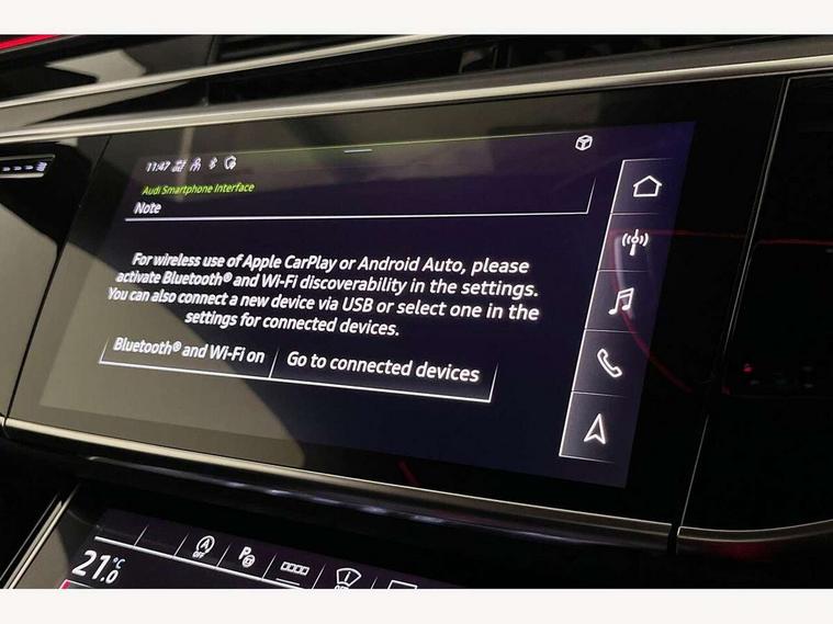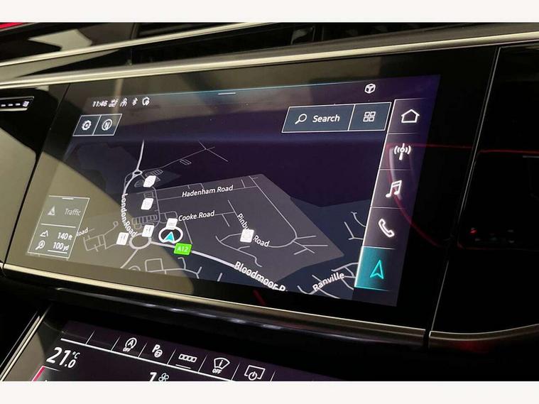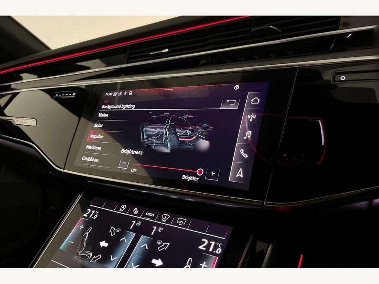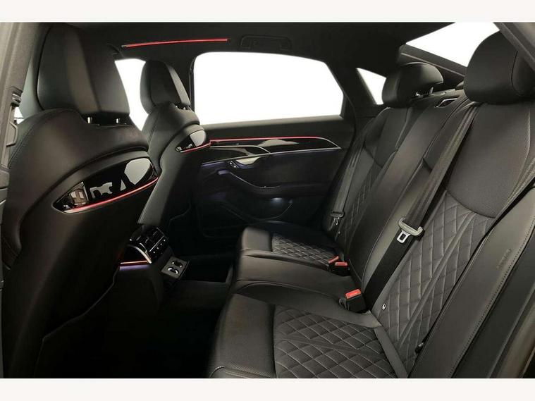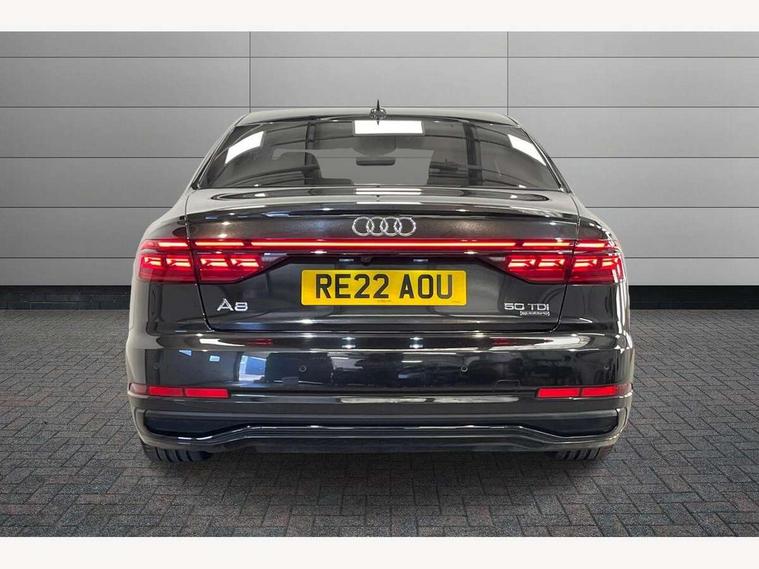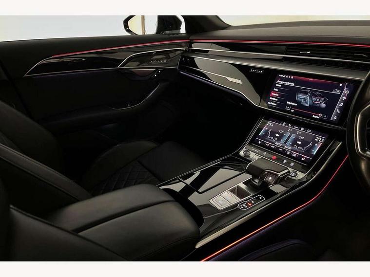 'Lights On' Reminder warning buzzer, 360 degree camera with top view, Adaptive cruise control with cruise assist, emergency assist, efficiency assist, swerve assist, turn assist and speed limiter, Audi connect safety and service (e-call), Audi drive select, Audi phone box with wireless charging, Audi virtual cockpit, Audi wireless smartphone interface, Bluetooth interface, Camera based traffic sign recognition, Convenience key, Dynamic all wheel steering, Head up Display, MMI navigation plus with MMI touch + Twin touch screens with haptic feedback, Operating buttons in black, glass look with haptic feedback including extended aluminium look, Parking assist plus with remote parking, Power door closure, Power operated tailgate, Rear central control unit, Remote fuel filler release, Service interval indicator, 24 litre AdBlue tank, 48V Mild hybrid technology, 8 speed transmission with hill hold assist, 82 litre fuel tank, Adaptive air suspension, Diesel particulate filter, Quattro all wheel drive with self locking centre differential, Audi music interface, DAB digital radio module, DVD System, MMI radio plus, USB connection, USB ports with charging function in the rear, Acoustic double glazing, Adaptive windscreen wipers with integrated washer jets, Audi high beam assist with Vorsprung illuminated text, Audi space frame, Auto dimming rear view mirror, Body colour bumpers, Body colour door handles, Body colour side protection with aluminium trim strips, Digital matrix LED headlights with highbeam assist, static cornering light, all weather lights, automatic dynamic headlight range control, Dynamic front and rear indicators, Electric front windows, Electric rear windows with isolation switch, Electric sunblinds for rear window and rear door windows, Electrically adjustable heated folding + automatically dimming exterior mirrors with memory function and integrated LED indicators, Headlight cleaning system, Heat insulating darkened glass in side and rear windows, Heat insulating glass windscreen, Heated rear window, Heated windscreen washer jets, LED brake lights, LED daytime running lights, OLED rear lights with specific rear light signature 3, Privacy glass, Rear boot, Rear side wing doors, Side skirts, Third brake light, Two part panoramic glass sunroof, 4 zone control automatic air conditioning, Centre console with cupholders, Comfort centre armrest front, Comfort rear headrests, Door armrest with storage, Door pockets with bottle holder, Driver and front passenger side sunvisors with illuminated vanity mirrors, Dust/pollen filters, Electric front seats with memory function, Front floor mats, Glove compartment cooling, Heated front seats, Heated rear seats, Height/reach electric steering column with easy exit function, Isofix child seat mounting points on outer rear seats, Leather gearknob, Massage and ventilation function for front seats, Passenger footwell storage net, Roof mounted sunglasses holder, Single front passenger seat, Valcona leather upholstery with front sports seats in diamond quilted, Air quality Pack - A8, Black exterior styling pack - A8, Chrome exterior pack - A8, City assist pack - A8, Dinamica microfibre black headlining pack - A8, Extended leather pack - A8, Extended LED Interior multi coloured light pack - A8, 3 point seatbelts on all rear seats, ABS/EBD, Active front headrest system, ASR traction control, Audi pre sense basic, Audi pre sense front, Driver/Front Passenger airbags, EDL traction control, Electromechanical parking brake, ESP, Extended pedestrian protection measures, Front and rear side airbags with head airbag system, Front brake discs, callipers painted black, Front passenger airbag deactivation, Rear brake discs, callipers painted black, Rear child proof door locks, Seatbelt reminder + electric contact in buckle + advanced safety equipment, Tyre pressure loss indicator, Warning triangle and first aid kit, Anti theft alarm tow away protection, Anti-theft wheel bolts and wheel loosening detection, Remote central locking, Dark matt brushed aluminium lower inlays, Piano black finish upper inlays,