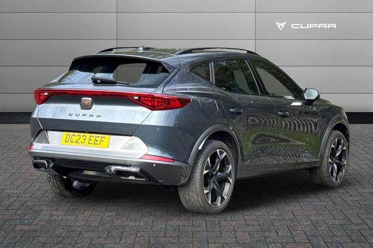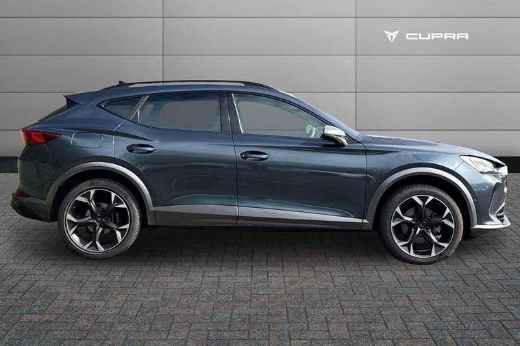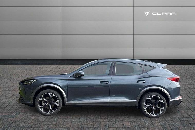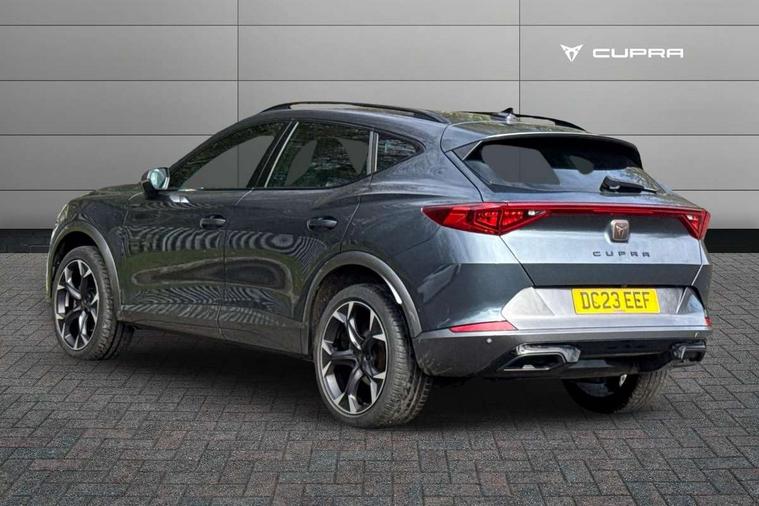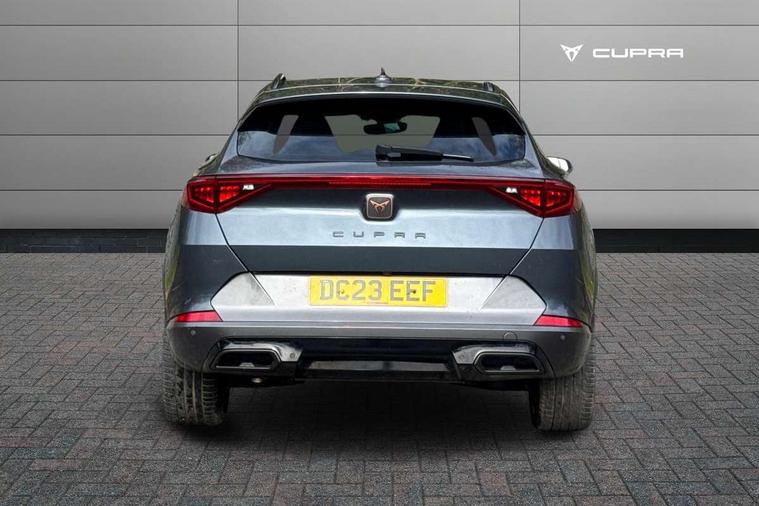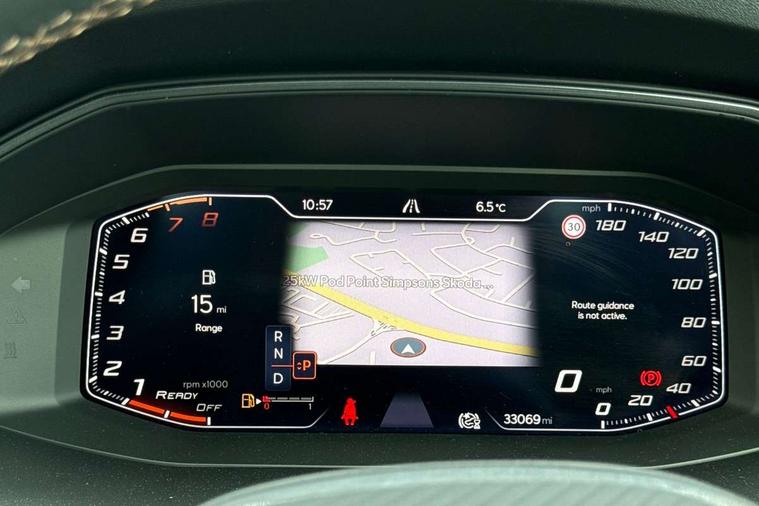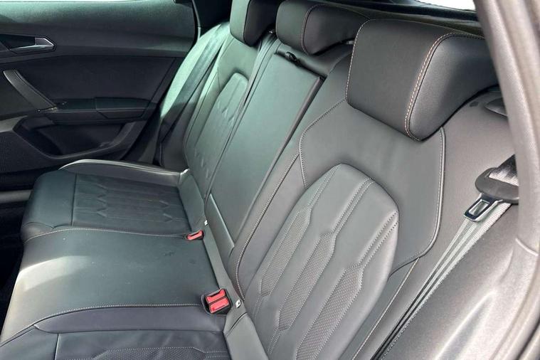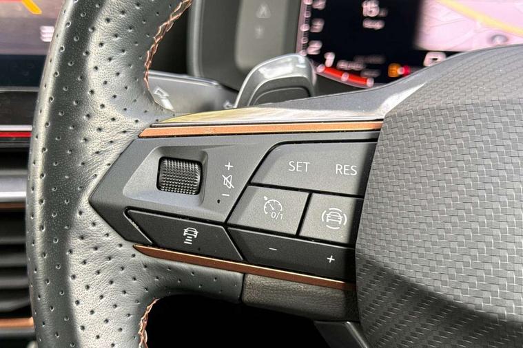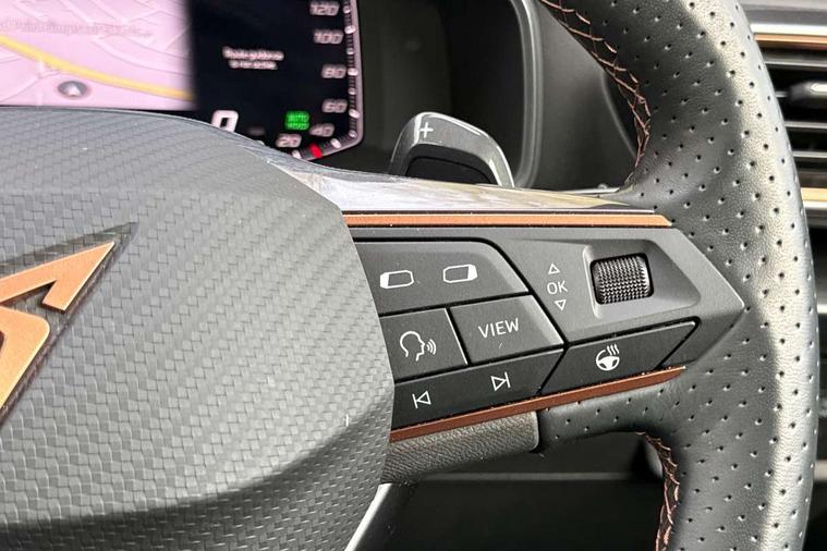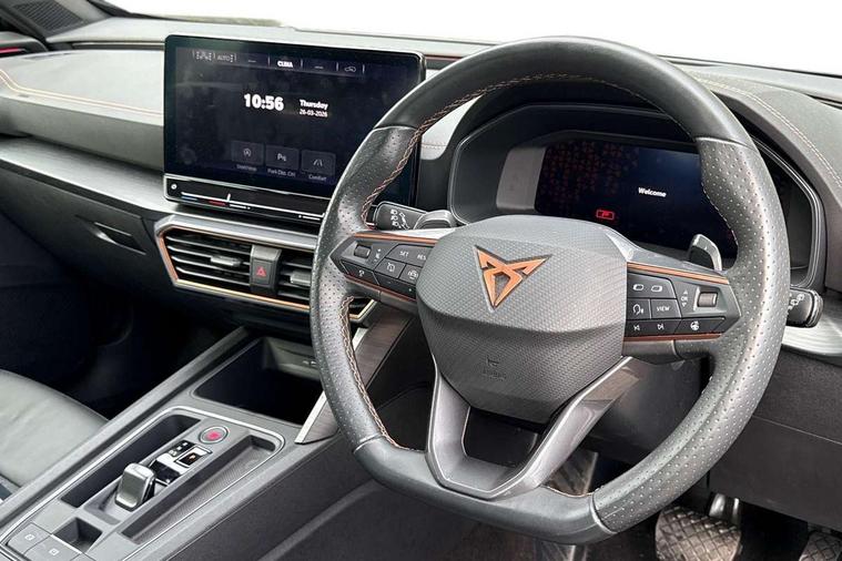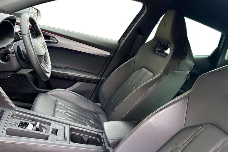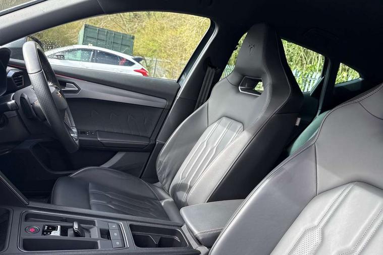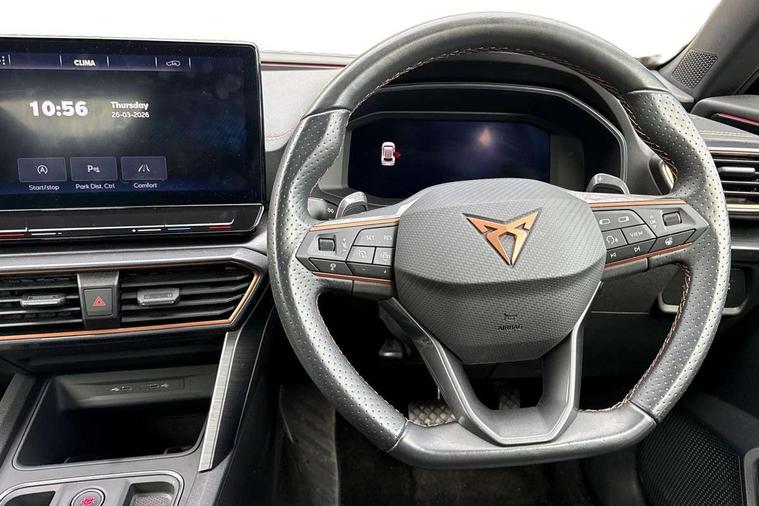 Digital cockpit and configurable dashboard, Driver alert system, Driving profile selection, Forward collision warning with automatic braking, Lane assist, Navigation system with 12'' Touchscreen Display, Park assist (inc front/rear parking sensors), PAS, Predictive adaptive cruise control with speed limiter, Rear view camera, RPM, trip computer, outside temp gauge, instrument light brightness, low fuel warning light, lights on reminder, gearshift indicator, Service interval indicator, Start/stop system with regenerative braking, Voice control system, Wired Android Auto, Wireless apple carplay, Wireless phone charger, Electronic locking differential and dynamic traction support, Standard suspension, 2 front and 2 rear USB type C sockets, Auxiliary input socket, DAB radio, Auto dimming rear view mirror, Body colour door handles, Body coloured bumpers, Dark grey wing mirror, Daytime running light with automatic headlight control and coming home feature, Dynamic headlight range control, Electric front/rear windows, Electrically adjustable heated and folding door mirrors with memory function, Front fog lamps with cornering function, Gloss black roof rails and window surrounds, LED Headlights, LED Taillights with dynamic indicator, Rain sensing wipers, Rear diffuser with black simulated exhaust pipes, Rear side wing doors, Rear wash/wipe, Third brake light, Tinted rear windows, Welcome lights, 12v power supply in centre console, 12V socket, 12v socket in loadspace, 2 front and 2 rear reading lights, 230V socket, 3 seat bench in 2nd row, 60/40 split rear bench seat with armrest and mechanical seat release, Black headlining, Dust/pollen filter, Front and rear head restraints, Front centre armrest, Height/reach adjust steering wheel, Illuminated interior front door sills, Illuminated sunvisor with mirror, Isofix, Leather multi function heated steering wheel with gear shift paddles, Luggage tie-down hooks, Single front passenger seat, Three zone climate control with control panel in rear, Variable luggage/load compartment floor, Wraparound lighting, Genuine Nappa leather Pack - Cupra, 3 point seatbelts on all rear seats, ABS, Brake control system - ESC and brake booster, Child proof door locks, Driver and front passenger airbags with front passenger airbag de-activation, Electronic parking brake, Front and rear disc brakes, Front side curtain airbags, Hill hold control, Public e-call, Seat belt reminder for front and rear seats, Tyre pressure monitoring system, Anti theft alarm system, Keyless entry and start system (KESSY), Locking wheel bolts, Copper and aluminium interior detailing, 19" 'Exclusive' machined sport matte black and silver alloy wheels,