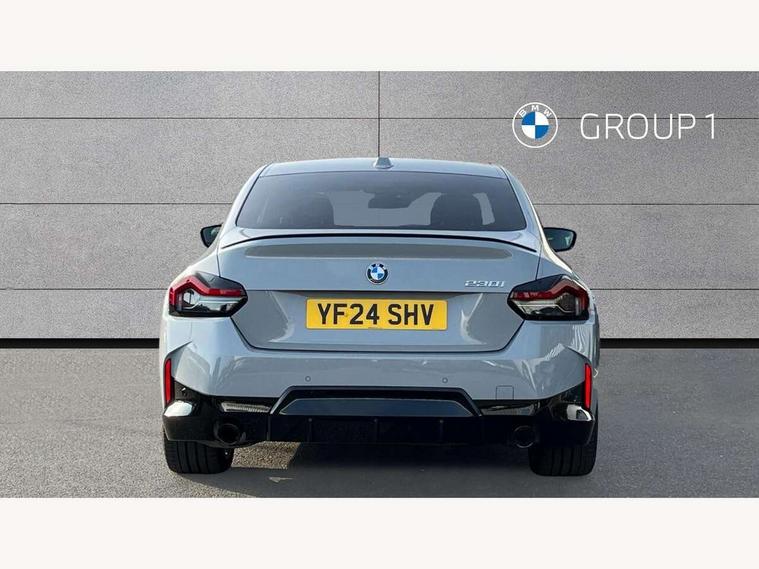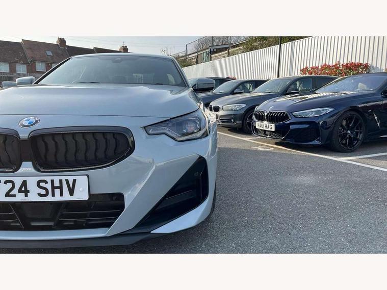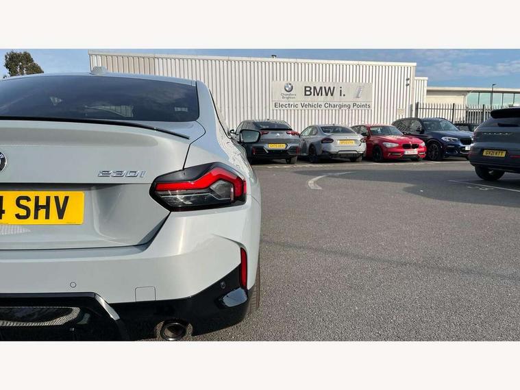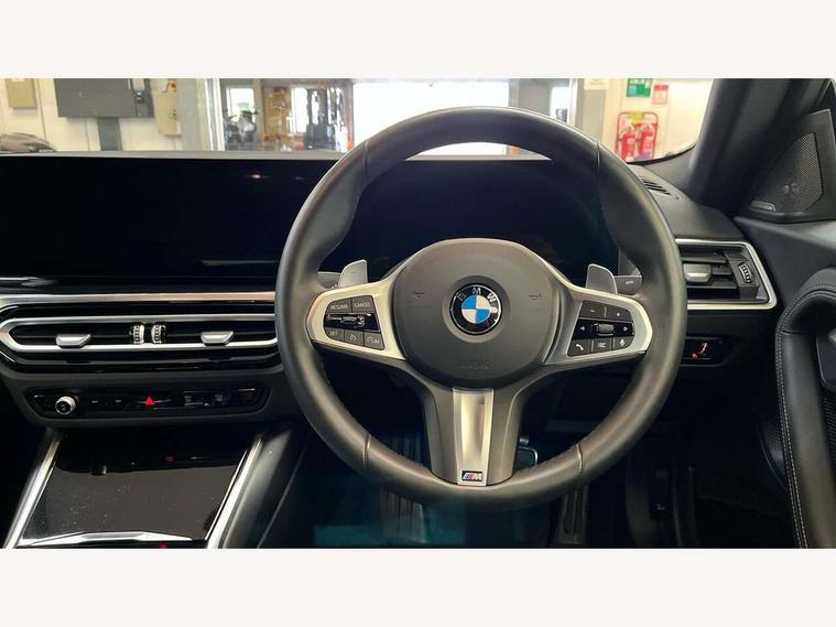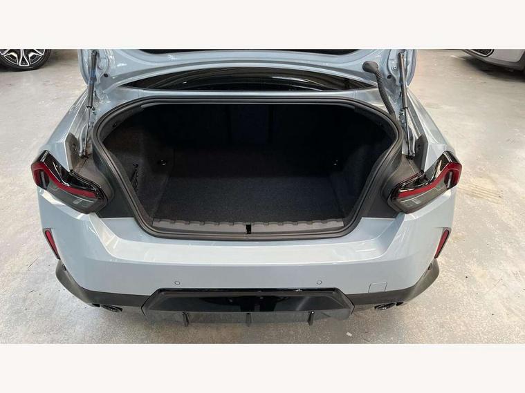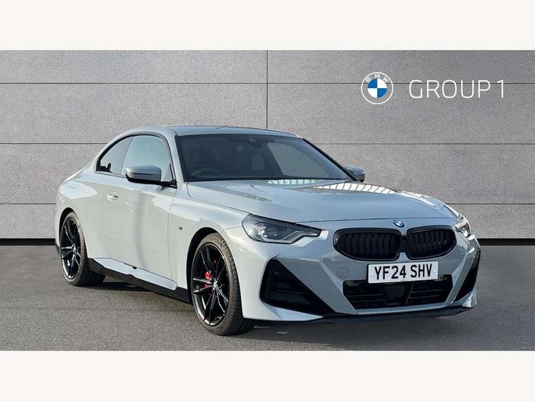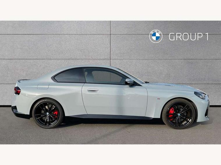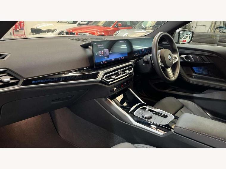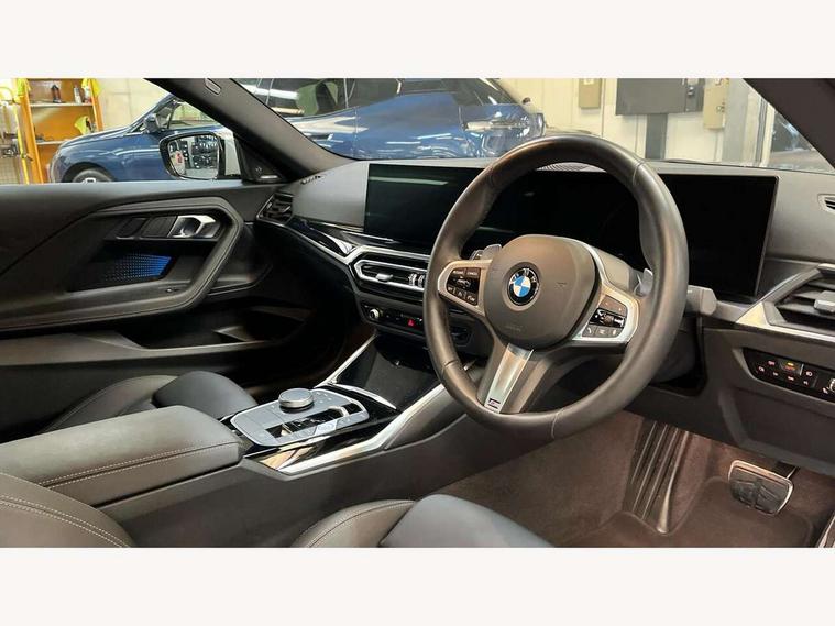2 USB connections for charging and transferring data, 4G LTE connectivity with hard wired 4G network sim card, Attentiveness assist, Bluetooth with USB, BMW ConnectedDrive online services, BMW Intelligent Personal Assistant, BMW operating system 8 with variable, configurable widgets display information in real time, BMW Teleservices, Check Control warning system for monitoring of lights and door/luggage compartment open warning, Direct selection buttons, Drive off assistant, Eco pro mode, Electric power steering, Front and rear parking sensors, Front/rear Parking distance control, iDrive controller with turn and press function, Integrated owners handbook, Intelligent functions, Live cockpit plus with nav function 12.3" instrument cluster and 14.9" centre display, Oil sensor for level and grade, Optimum shift indicator, Personal Profile, Touch operation on control display, Variable sport steering, Widescreen multi-media display, WiFi interface for wireless connection of mobile terminal devices, Aluminium lightweight construction, Balancer shaft, BMW TwinPower Turbo four-cylinder petrol engine, Double VANOS, Drive performance control with ECO PRO comfort + sport mode, Electronic differential lock, High precision injection, M sport suspension, Petrol Particulate Filter, Sport automatic steptronic transmission with gearshift paddles, manual gearshift time display, launch control, coasting idle ECO PRO/COMFORT modes, Twin scroll turbocharger with Valvetronic, DAB tuner, Acoustic windscreen wipers for reduced driving noise, Adaptive LED Headlights, Automatic windscreen wipers and automatic headlight, Automatically dimming rear view mirror, Body colour door handles flush with door surface, Body colour door mirrors, Body colour front and rear bumpers, Daytime running lights, Electric windows - front and rear, with open/close fingertip control and trap release, Exhaust tailpipes x2 - 90mm in left and right, Fading support, Front and rear bumper system with replaceable deformation elements, Front door sill finishers in black plastic with BMW designation, Front windscreen wipers with integrated washer jets, Green tinted heat protection glazing, High beam assistant, High gloss black sill, bumper trim sides and diffuser insert, High gloss shadowline exterior trim in mirror triangle cover, mirror cover panel, mirror bezel and window border, High level third brake light, Indicators integrated int mirror housing, LED registration plate light, LED technology rear tail lights, brake lights and turn indicators, Lightweight engineering, Model designation on right side of tailgate, One piece kidney grille with hight gloss chrome surround, Rear boot, Rear fog lights, Reversing light in rear light cluster, Shark fin antenna, Single part LED rear lights with smoked glass components, Trailer stabilisation logic, Visible VIN plate, 12V power socket in front centre console with blanking plug, 2 cupholders in front centre console, 2 zone automatic air conditioning, Ambient lighting, Compartment in front of cupholder, Conditioned based service, Driver seat backrest width adjustment, Front and rear side armrests integrated into door trim, Front armrest, Front door pockets, Front head restraints, Front sport seats, Heated front seats, Illuminated glove compartment with separate small compartment, M headliner Anthracite, M sport leather steering wheel, Manually adjustment steering wheel column, Rear seat backrest with manual 40:20:40 split folding, Rear seat centre foldable armrest with integrated cup holder, Single front passenger seat, Storage compartment between rear seats, Storage tray and compartment with cover in centre console, Sun visors with vanity mirrors and insert tab, Through loading system with 40/20/40 split folding 2 rear seat in 2nd row, Two folding rear seat headrests, Velour floor mats, Additional storage compartment pack without USB - 2 Series Coupe, Connected pack professional - 2 Series Coupe, Interior and exterior mirror pack - 2 Series Coupe, M Sport exterior styling aerodynamics pack - 2 Series Coupe, 2 tone horn, Anti lock braking system (ABS) with cornering brake control, Automatic Stability Control (ASC), BMW emergency call, Brake drying, Child seat ISOFIX attachment for the two outer rear seats, Crash sensor activating of airbags, Unlocking doors, hazard warning lights, interior light, safety battery terminal, Deactivation of fuel pump in the event of a crash, Driver and front passenger airbags, Driver and front passenger side airbags, integrated in the door side seat backrest bolsters for all seat variants, Dynamic brake control, Dynamic stability control + (DSC+), Dynamic Traction Control - DTC, Electrically operated hand brake including automatic hold function and automatic release when driving off, Front and rear disc brakes, Head airbags for all 4 outer seats, Manual deactivation of front passenger airbag, Seat belt security check for driver and front passenger, Seatbelt warning, Side impact protection, Three point seat belts on 4 seats including front belt stopper, pyrotechnic belt tensioners and belt force limiters, Tyre pressure sensor, Warning triangle and first aid kit, Alarm system (Thatcham 1) with remote control and electronic engine immobiliser, Central locking switch for all doors, fuel filler cap and luggage compartment, Deadlocking function system to all doors, Drive away locking system on all doors and luggage compartment, Locking wheel bolts, Start/Stop button (illuminated) in centre console with keyless engine start and Auto Start-Stop deactivation button, Two remote control key with integrated key - one button for open and close doors/fuel flap/tailgate and separate button for unlock luggage compartment, BMW mobility tyre sealing system, Electrically powered 12V compressor, Reduced rolling resistance tyres,