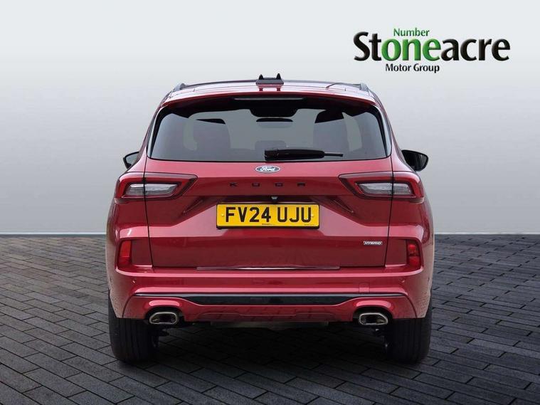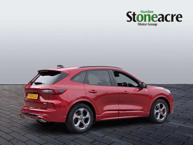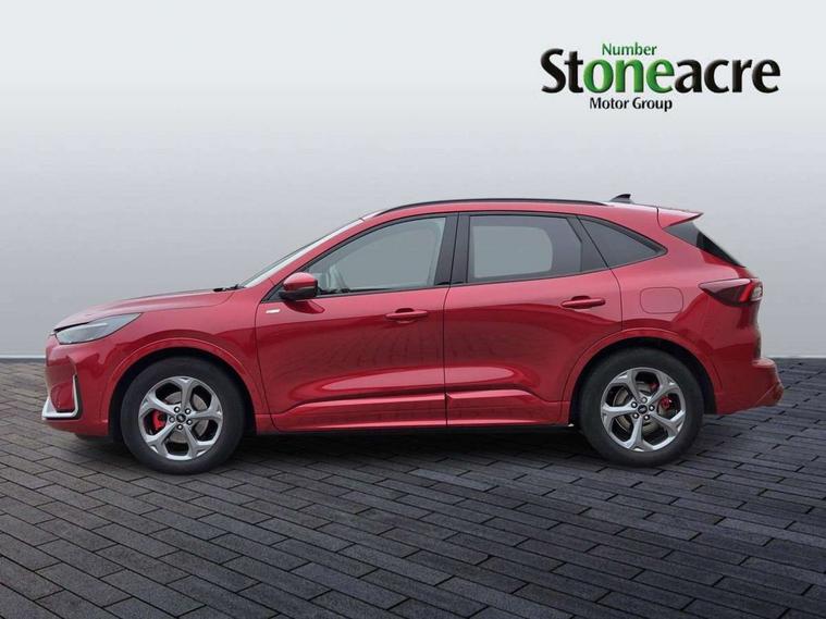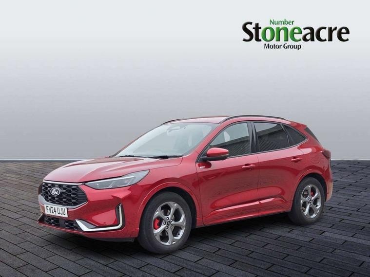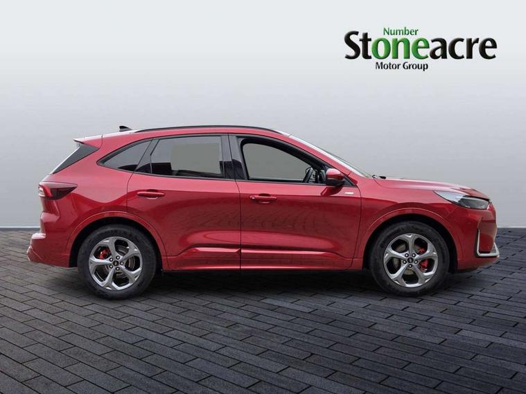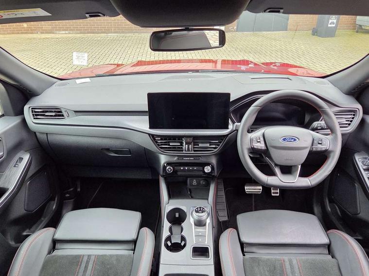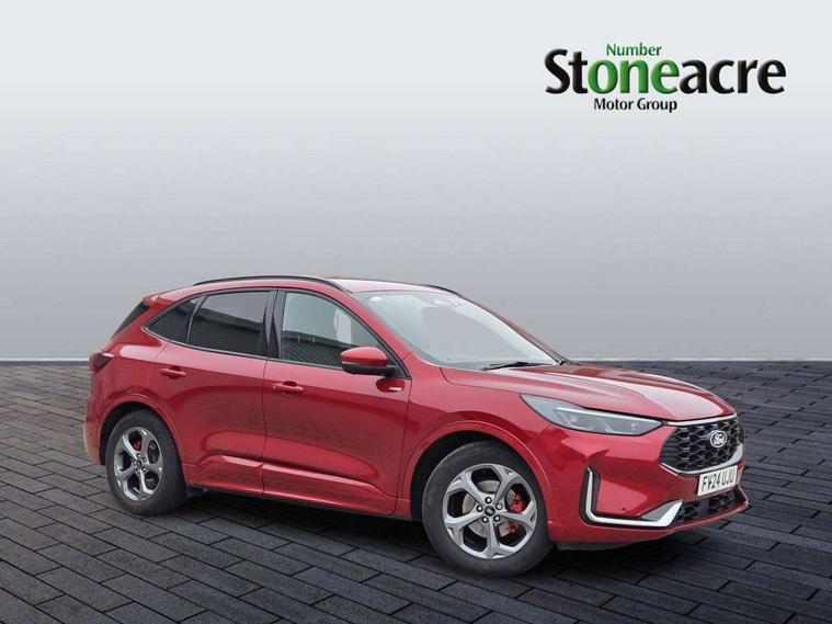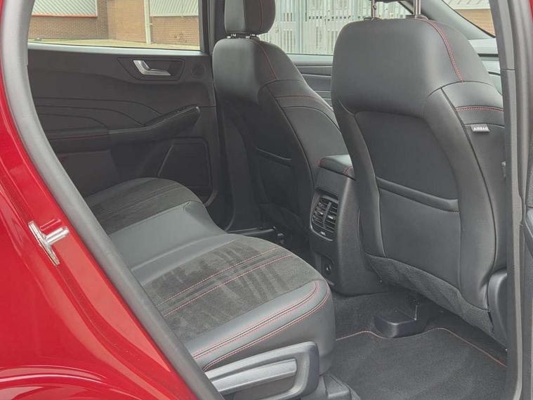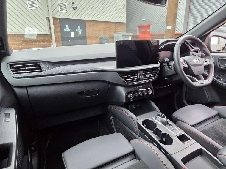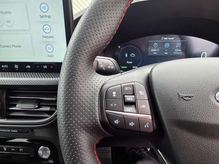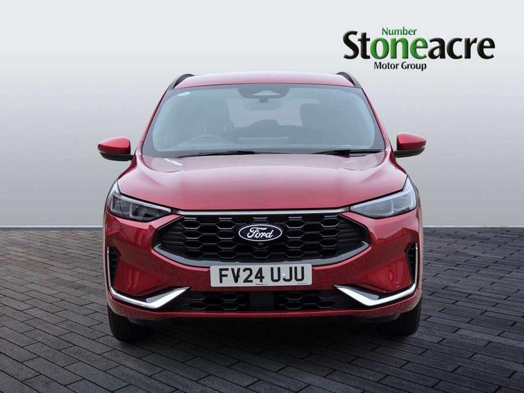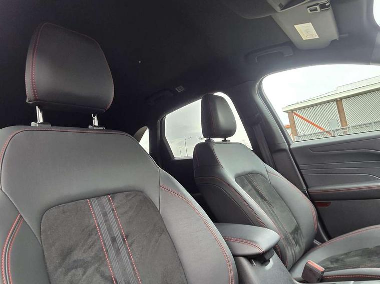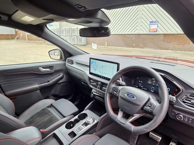 12.3" digital colour instrument cluster, 360 degree view camera, e-Call (emergency call), Ford easy fuel, Ford SYNC 4 Navigation with 13" touchscreen, DAB radio, emergency assistance, Andriod Auto/Apple CarPlay, 5G modem & Ford Pass connect, Front and rear parking sensors, Hands free power tailgate, Lane centering assist, Lane keeping aid with lane departure warning, Power assist steering, Selectable drive modes, Service interval indicator, Sports suspension, Twist beam rear suspension, B&O premium audio system with 10 speakers, subwoofer and 2 USB ports, Auto headlamps with high and low beam, Black roof rails, Body colour bumpers, Front LED fog lamps, Large rear spoiler, LED daytime running lights, LED rear lights, Pop out door edge protectors, Power front/rear windows with global close, Power heated folding door mirrors with puddle lights, memory function and camera, Quickclear heated windscreen, Rain sensing wipers, Rear privacy glass, Rear side wing doors, Rear wiper, ST-Line body styling kit, Third brake light, 12 way ergonomic power adjust driver's seat with memory (AGR certified), 12 way ergonomic power adjust passenger seat (AGR certified), 2nd row sliding seats, Electronic automatic temperature control (EATC), Front and rear head restraints, Partial premium touch sensico upholstery, Rear centre head restraint, Single front passenger seat, Sports seats, Driver assistance pack with intelligent adaptive cruise control - Kuga FHEV/PHEV, 3x3 point rear seatbelts, Airbags - front driver/passenger, front and rear curtain, Drivers knee airbag, Dynamic brake support, Electronic stability control (ESC) and ABS, Evasive steering assist, Ford MyKey Gen 2 safety system, Manual child proof rear door locks, Pre collision assist with autonomous emergency braking, Rear seat Occupancy alert, Red brake calipers, Tyre pressure monitoring system, Engine immobiliser, Keyless entry and Ford power start button (Keyless start), Locking wheel nuts, Remote powered central double locking doors, Thatcham category 1 alarm,