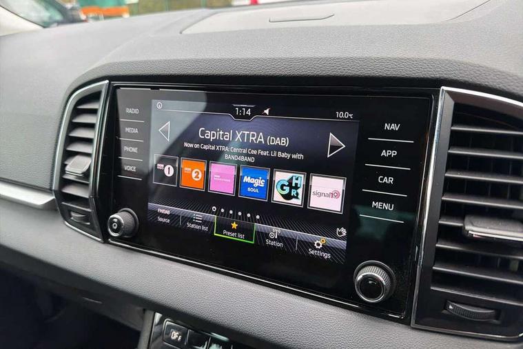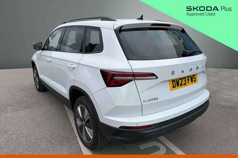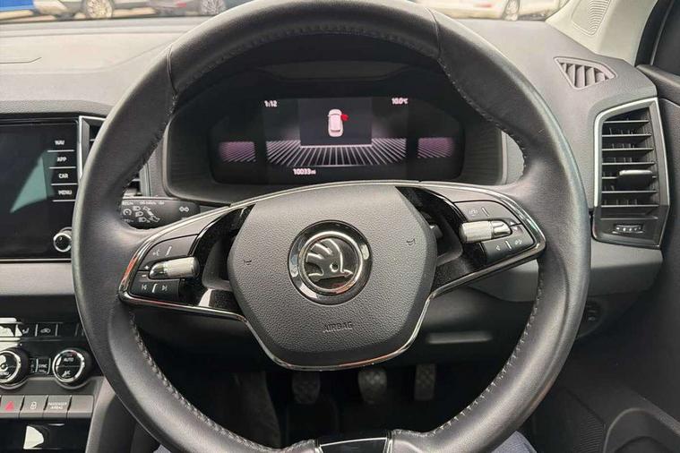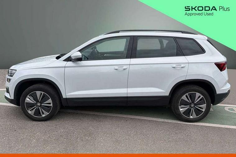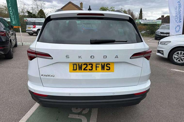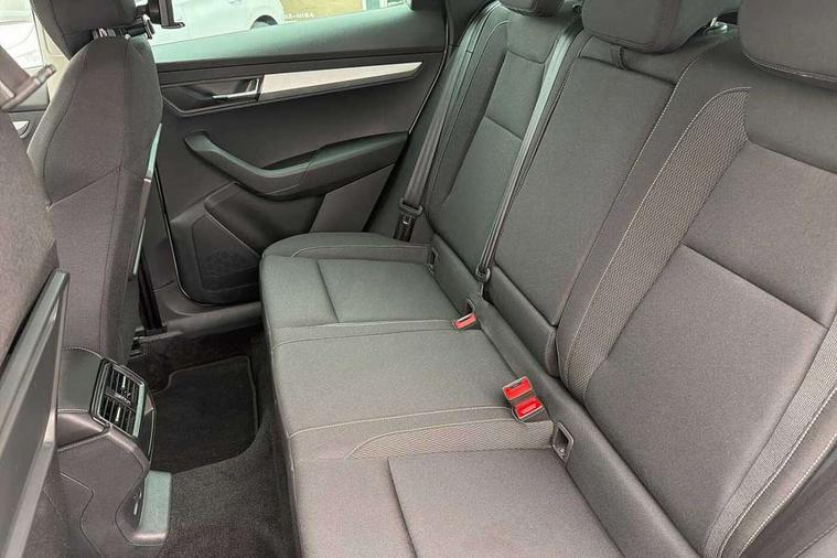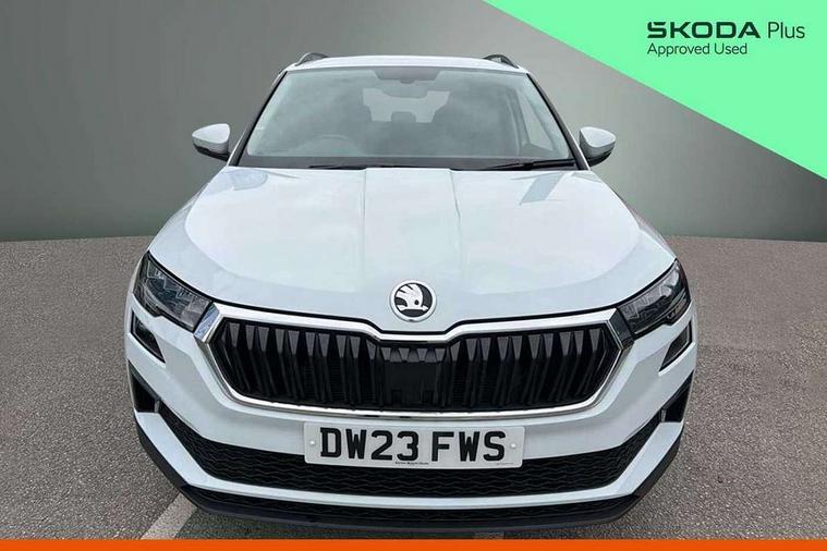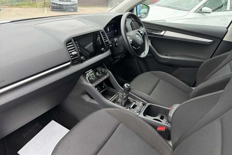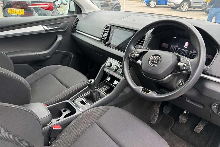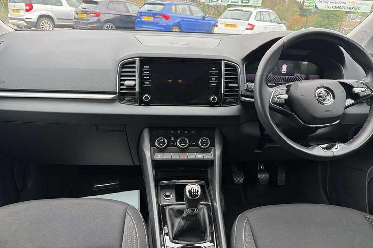 8" Digital display, Amundsen satellite navigation with 8" touchscreen display with maps Europe, WLAN and web radio, Care connect, Driver fatigue sensor, Electro-mechanical PAS, Emergency services call system, Outside temperature gauge, Service interval indicator, SmartLink wireless for Apple and wired for Android, Start/stop system with regenerative braking, USB C Port x 2 in front centre console, 8 Speakers, DAB radio with Bluetooth, USB connection, Acoustic glass, Aero front windscreen wipers with intermittent function, Auto dimming rear view mirror with light and rain sensors, Black electric window control buttons, Body colour door mirrors and handles, Dynamic headlight range control with cornering light function, Electric front and rear windows with child proof lock, Electrically adjustable heated folding and auto dimming door mirrors, Front fog lights, Heated rear windscreen, LED daytime running lights, LED Headlights, LED rear lights with high functionality welcome effect and dynamic indicators, Light assistant (coming/leaving home/tunnel light), Plastic scuff plates, Privacy glass, Rear side wing doors, Rear window wiper with washer system and intermittent control, Safety reflectors on front doors, Third brake light, 1.5 litre bottle holders in driver and front passenger door panels, 12V socket in boot, 12v socket in front centre armrest with storage compartment and rear air vents, 2 x Tablet holder, 3 rear height adjustable headrests, 3 seat bench in 2nd row, 4 foldable roof handles with rear coat hooks, Black floor carpet, Chrome inner door handles, Double sided boot floor, Driver/front passenger reading lights, Foldable hooks in the boot, Folding tables on the front seat backrests, Front head restraints, Height adjustable driver and passenger seat, Height adjustable front three point seats belts with tensioners, Height/reach adjust steering wheel, Ice scraper, Illuminated glovebox, Illuminated luggage compartment, Isofix child seat preparation for front passenger seat, Isofix child seat preparation outer rear, Manual lumbar support for front seats, Pearl grey interior ceiling, Pen holder, Pollen filter, Rear boot cover, Rear reading lights, Rubbish bin door, Safety vest holder, Single front passenger seat, Storage box in upper central dashboard closed, Sunvisors with illuminated vanity mirrors, Textile floor mats, Ticket holder, Umbrella under passenger seat, Boot pack - Karoq, Automatic door unlocking in case of crash, Automatic fuel cut off in case of crash, Child locks on rear doors, Driver airbag, Electronic parking brake with auto hold function, Emergency rear braking signal, ESC including ABS, MSR, ASR, EDS, HBA, DSR, RBS, MKB and traction control, Front side airbags, Hill hold control, Knee airbags, Passenger airbag with switch-off function, Pedestrian monitor, Seatbelt reminder signalisation and pretensioner for all seats, Three point seatbelts rear, Two tone horn, Tyre pressure display, Tyre pressure monitor, Alarm with interior monitoring, back up horn and tilt sensor with safe function, Electronic engine immobiliser, Remote central locking with 2 remote folding keys, Black centre console, Chrome framed air vents, Satin black dashboard, Satin black door trim, Anti-theft wheel bolts protection, Storage on wheel cover, Tool kit,