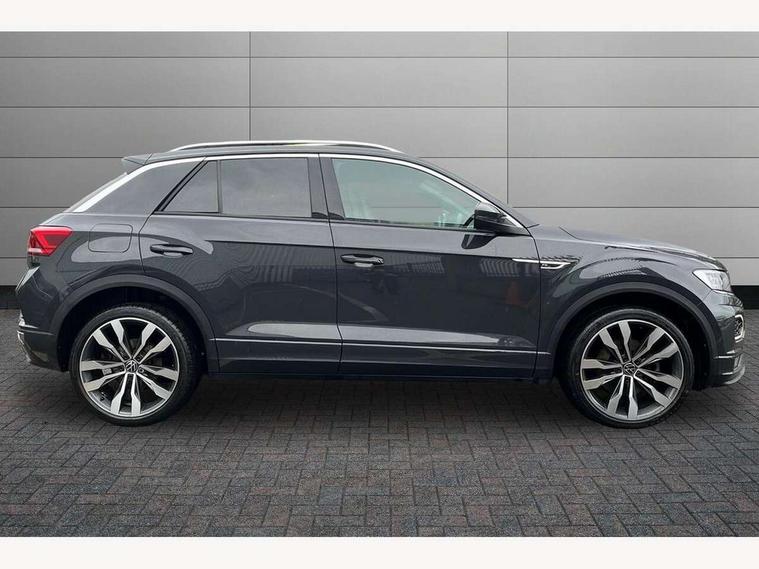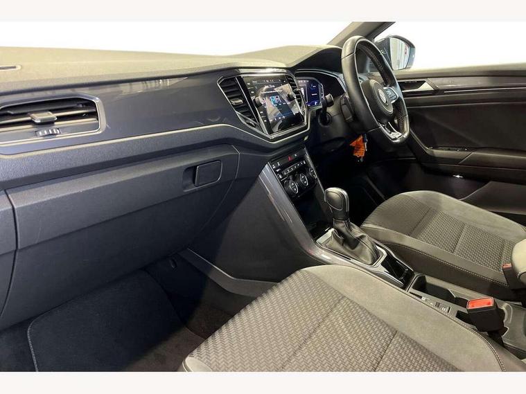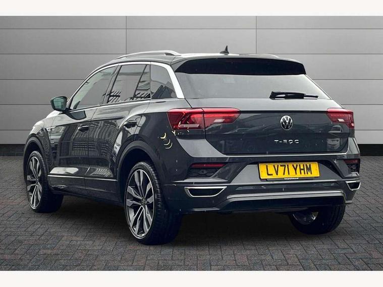 'Lights On' Reminder warning buzzer, Adaptive cruise control, Bluetooth telephone and audio connection for compatible devices, Car information display, Digital Cockpit Pro - Active info display, Driver alert system with audible and visual fatigue detection system, Driver tips and journey analysis, Emergency call service, Lane assist with warning text instrument cluster, Modified key software - reduce switch off time for key status change to Long no motion, Multifunction camera, Multifunction computer with visual gear change recommendation for fuel consumption, Navigation system discover media including streaming and internet, Service interval indicator, Think blue trainer driver tips and journey analysis, Traffic sign recognition, Voice activation, Warning sound and light for front seatbelts unfastened, Wireless app connect for apple carPlay, Battery regeneration during braking, Rear shock absorption for sports version, Start/stop function with battery regeneration, DAB Digital radio, Disk brakes in front, Diversity antenna for FM reception, Music playback - MP3, WMA and AAC files, Premium USB cable in choice of either Apple or Android smartphone compatibility, SD card slot, Simultaneous pairing of 2 compatible mobile devices, SMS functionality - read, compose and send SMS messages using touch-screen display, Storage compartment with longitudinal and height adjustable in armrest and two rear air vents, Three route options - Fast, Short, Eco, Title and cover art display, USB-C Interface and USB charging socket, Auto dimming interior rear view mirror, Automatic coming/leaving home lighting function and daytime running lights, Automatic hazard lights activation under emergency braking, Black grained lower door protectors, Body colored door lower parts, Body colour door handles, Body colour rear roof spoiler, Chrome effect left and right trapezoid exhaust tailpipe fascia surround, Chrome plated moldings, Chrome trim on upper and lower radiator grille, Dusk sensor, Dynamic headlight range control with self adjusting whilst driving, Electrically foldable, adjustable and heated door mirrors with puddle lights and reverse activated kerb-view adjustment on passenger's door mirror, External USB type C socket and charging sockets, Front and rear electric windows, Front fog lights with static cornering function, Front windscreen wiper with intermittent wipe and 4 position delay, Fully galvanised body, Heated rear window, Heated windscreen washer jets, High level 3rd brake light, LED darkened rear light clusters, LED headlamps with automatic range adjustment and unique signature LED separate daytime running lights, LED rear number plate lights, LED tail lamp rear comination lamps, Privacy glass, R-Line design body coloured bumpers, Rain sensor, Rear tinted glass from B-pillar backwards approx 65% tinted, Rear wash/wipe with intermittent wipe setting, Silver anodised roof rails, Volkswagen roundel, 12V socket in centre console storage area, 3 rear head restraints, 4 load lashing points in luggage compartment, Aluminium pedals, Black roof lining and sun visors, Branded points of interest, Carbon flag cloth upholstery, Chrome plated radiator grille inserts, air vent surrounds and light switch surrounds, Climate control - 2 zone electronic air conditioning with automatic air recirculation and allergy filter, Door and side trim panel, Door and side trim panel in foam film, insert in leatherette, Drawer under drivers seat, Front + rear carpet mats, Front centre armrest, Front cupholders x 2, Front seat back storage pockets, Front sports seats with R-Line logo on seat backrest, Glovebox, Heated front seats, Height adjustable front seats, Height/reach adjust steering wheel, Instrument lighting, white adjustable panel illumination, Interior light delay, Interior light in footwell, Isofix easy fit child seat preparation for 2 outer rear seats, Leather gearshift knob, Leather multi function sport steering wheel with gear change selection via paddle shift on steering wheel, LED interior light with switch off delay/dimmer and 2 front/rear LED reading lights, Load through provision with single cup holder when folded down, Luggage compartment cover, removable, Luggage compartment lighting, R Line badge, Scuff plates in door apertures, Split folding rear seat backrests with centre armrest, Stainless steel pedals, Storage compartment in left and right luggage area, Storage compartment in rear doors, Storage compartments in driver and front passenger doors, Sunvisors with illuminated vanity mirrors, Unique R Line door sill protectors, White ambient lighting, R line styling pack - T-Roc, Winter pack - T-Roc, 3 rear three point seatbelts, ABS, Curtain airbags, Driver and front passenger safety-optimised head restraints, Drivers and front passengers airbags with passengers deactivation switch, Drivers seatbelt reminder, Electronic parking brake with auto hold, Electronic stability control (ESC) includes ASR, EDL, EDTC and trailer stabilisation function, Front assist with city emergency braking and pedestrian monitoring, Front seat side impact airbags, Hill start assist, Predictive pedestrian protection, Rigid safety cell with front and rear crumple zones, Single tone horn, Three point height adjust front seatbelts + pretensioners, Tyre pressure loss indicator, Ventilated front and rear disc brakes, Volkswagen roadside assistance, Alarm with remote central locking and interior protection, Electronic engine immobiliser, Remote central locking with SAFELOCK, radio remote control with 2 remote control folding keys, Shadow grey decorative inserts in dash, centre console and door panel, 19" Suzuka alloy wheels with low rolling resistance tyres and anti wheel bolts,