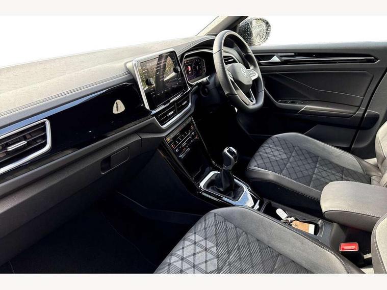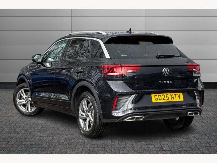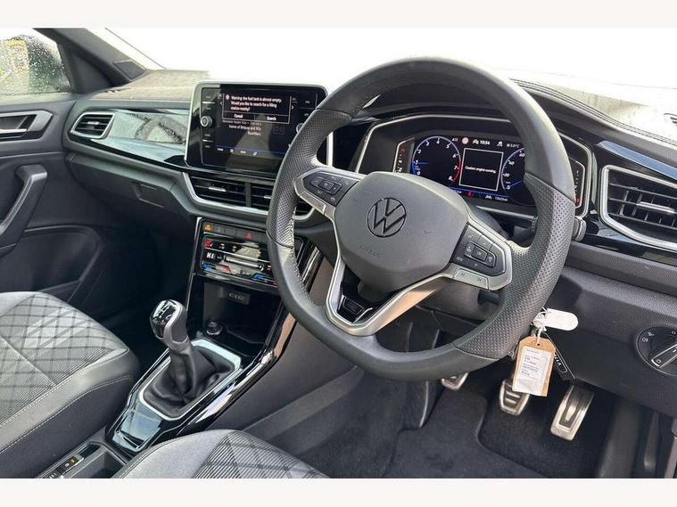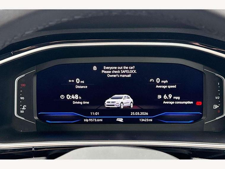10.25" Digital cockpit pro, Advanced driver attention and drowsiness monitor, Emergency call service, Lane keeping system Lane Assist, Mobile phone interface, Modified key software - reduce switch off time for key status change to Long no motion, Online services, Park assist including front and rear parking sensors, Service interval indicator, Tailgate/trunk lid release from outside, Think blue trainer driver tips and journey analysis, Warning sound and light for front seatbelts unfastened, Wireless app connect, Battery regeneration during braking, Start/stop function with battery regeneration, DAB Digital radio, Diversity antenna for FM reception, Front and rear 6 speakers, Music playback - MP3, WMA and AAC files, Premium USB cable in choice of either Apple or Android smartphone compatibility, SD card slot, Simultaneous pairing of 2 compatible mobile devices, Title and cover art display, We Connect and We Connect Plus functionality, Auto dimming interior rear view mirror, Automatic hazard lights activation under emergency braking, Automatic headlight control with LED separate daytime running lights with coming/leaving home function, Body coloured exterior mirror housings and door handles, Electrically adjustable and heated door mirrors, Extended roof spoiler, Exterior mirrors aspherical on driver side, convex on front passenger side, External USB type C socket and charging sockets, Front windscreen wiper with intermittent wipe and 4 position delay, Heated rear window, LED 3rd brake light, LED rear combination lamps, LED rear number plate lights, Power windows with comfort operation and circuit breaker, Privacy glass for rear side windows and rear window, R-Line design body coloured bumpers, Rain sensor, Rear exhaust tailpipe, Rear fog light on one side and reversing lights on both sides, Rear side wing doors, Rear wash/wipe with intermittent wipe setting, Remote electrically foldable door mirrors, puddle lights and reverse activated passenger's door mirror, 12V power socket in centre console, 3 rear head restraints, 3 seat bench in 2nd row, 4 load lashing points in luggage compartment, Air care climatronic air conditoning system with active combination filter and 2-zone temperature control, Black roof lining, Chrome plated decorative trims, Chrome plated radiator grille inserts, air vent surrounds and light switch surrounds, Door and side trim panel with leatherette insert, Front + rear carpet mats, Front centre armrest, Front cupholders x 2, Front footwell illumination, Front reading light, Front scuff plates with R Line logo, Front seat back storage pockets, Glove compartment door with light, Instrument lighting, white adjustable panel illumination, Interior ambient lighting and surround lighting, Interior light delay, Isofix child seat preparation, Leather gearshift handle, Load-through provision with cup holder when folded down ('Unsplit rear seat bench, split folding backrest, with centre armrest), Luggage compartment lighting, Single front passenger seat, Stainless steel pedals, Storage compartment in left and right luggage area, Storage compartment in rear doors, Storage compartments in driver and front passenger doors, Sunvisors with illuminated vanity mirrors, Variable boot floor, height adjustable and removable, Driver assistance pack without proactive passenger protection - T-Roc, 3 point height adj front seatbelts + pretensioners, 3 point seatbelts in outer rear with ECE label, ABS, Child locks on rear doors, City emergency braking and pedestrian monitoring, Driver and front passenger airbag with front passenger airbag deactivation, Driver and front passenger safety-optimised head restraints, Drivers seatbelt reminder, Electronic parking brake, Electronic Stability Control (ESC) inc EDL (Electronic Differential Lock) and ASR (Traction Control), Front and rear passengers curtain airbag system including front side airbags, Hill start assist, Predictive pedestrian protection, Rear disc brakes, Two tone horn, Tyre pressure loss indicator, Volkswagen roadside assistance, Piano black decorative inserts in dashboard and front door trim panels, Trims for alloy wheels,