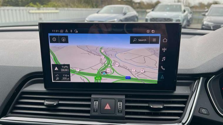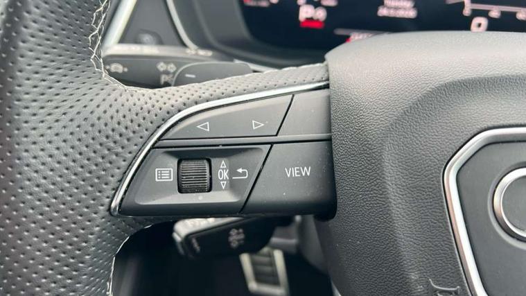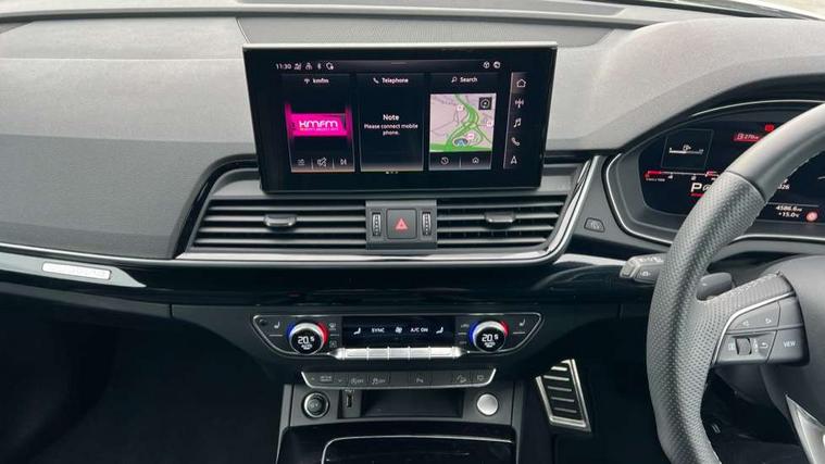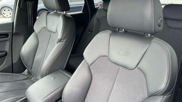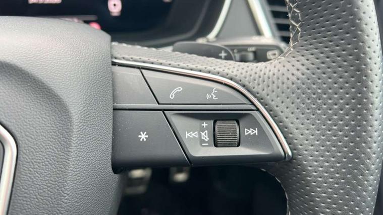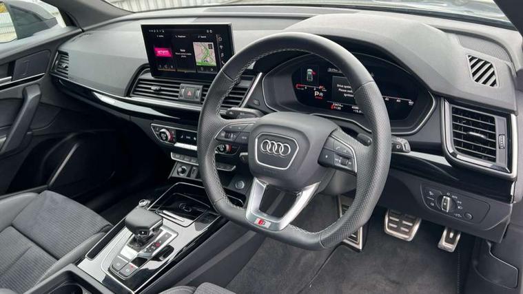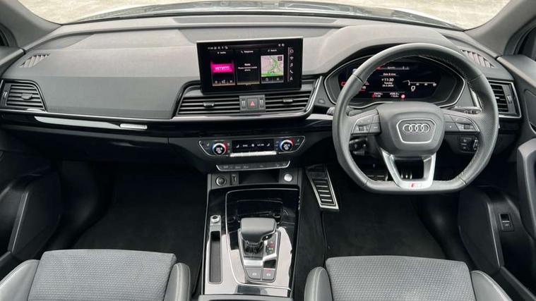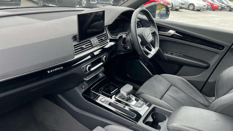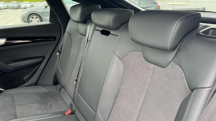 Acoustic front and rear parking sensor, Audi connect safety and service (e-call), Audi drive select, Audi virtual cockpit plus with 12.3" screen and three different layout designs, Audi wireless smartphone interface, Automatic start-stop system with coasting functionality and efficiency programme, Bluetooth interface, Camera based traffic sign recognition, Electro - mechanical power assisted steering, Lane departure warning, MMI navigation plus with 10.1" touch screen, Power tailgate, Reversing camera, Service interval indicator, Voice control system with Audi hotword activation "Hey Audi", Diesel particulate filter, Quattro on demand, S line sports suspension, 8 loudspeakers, DAB Digital radio, Acoustic windscreen, Auto dimming door mirrors, Auto dimming frameless rear view mirror, Automatic headlight adjustment, Automatic headlights and windscreen wipers, Black roof rails, Black styling with black rings, Body colour bumpers, Body colour rear diffuser with matt aluminium silver surrounds, Body colour underbody protection, Chrome plated exhaust trims, Daytime running lights, Door sills in Selenite silver, Electric adjustable/heated/folding door mirrors, Front air inlet surrounds in aluminium, Front and rear electric windows, Front radiator grille in honeycomb design, LED 3rd brake light, LED headlights and LED tail lights, Lower bumpers painted in contrast Manhattan grey, Rear chrome trim strip below lights, Rear privacy glass and rear side windows, Rear side wing doors, Rear wiper, Roof bars, S Line badges on the front wing panels, S Line front and rear bumpers, S Line rear spoiler, S Line side skirts, 2 x USB charging port with aux input socket, 3 rear headrests, Black cloth headlining, Comfort front centre armrest, Contrast stitching on seats, steering wheel and gear lever gaiter, Deluxe 3 zone electronic climate control, Front head restraints, Front sport seats with S embossed logo, Front/rear floor mats, Gear lever in black leather, Heated front seats, Height/reach adjustable steering column, Illuminated door sill trims with S logo, Loading edge protection in stainless steel, Luggage compartment cover, Manual seat adjustment with 4-way electric lumbar support, Single front passenger seat, Stainless steel pedals, Sunvisors with vanity mirrors, Tool kit, Top surface of the rear centre armrest in artificial leather, High gloss pack - Q5, LED interior light pack - Q5, 3 point seatbelts on all seats, 6 airbags - Driver, front passenger, curtain and side airbags, Attention and drowsiness assist, Electrically operated child locks on rear doors, Electromechanical parking brake, Electronic stabilisation control including ABS, ASR and EDL, First aid kit with warning triangle and vests, Front passenger airbag deactivation, Hill descent control, Hill hold assist, ISOFIX child seat mounting for front passenger seat and ISOFIX child seat mounting with Top Tether for outer rear seats, Multi collision brake assist, Pop-up bonnet for pedestrian protection, Pre sense city, Seatbelt monitoring, Tyre pressure warning, Anti theft alarm, Anti-theft wheel bolts, Remote central locking, Remote control key with SAFELOCK and keyless go, Air vents inserts and centre console in gloss black, Tyre repair kit,