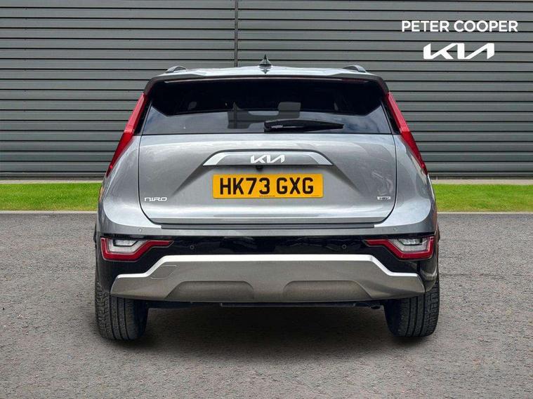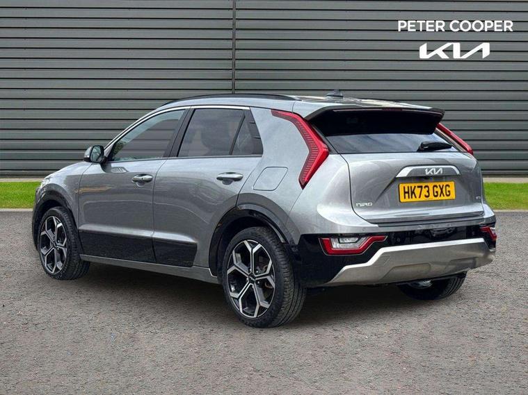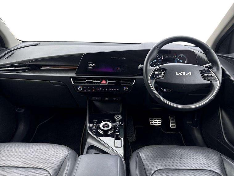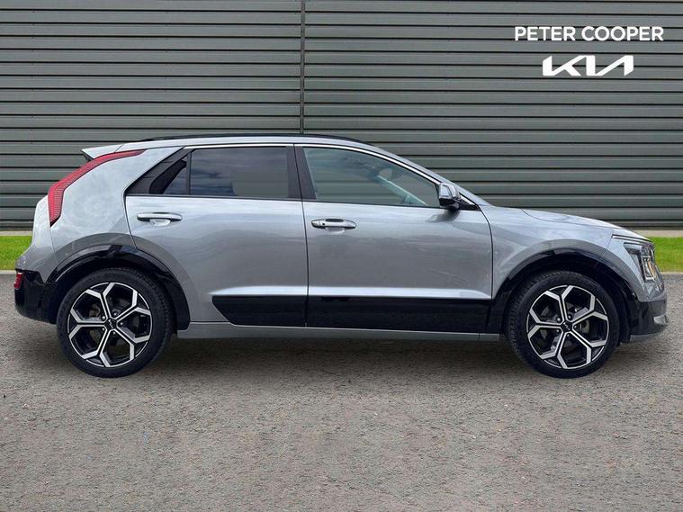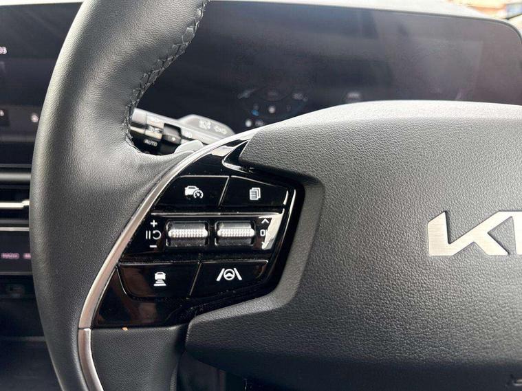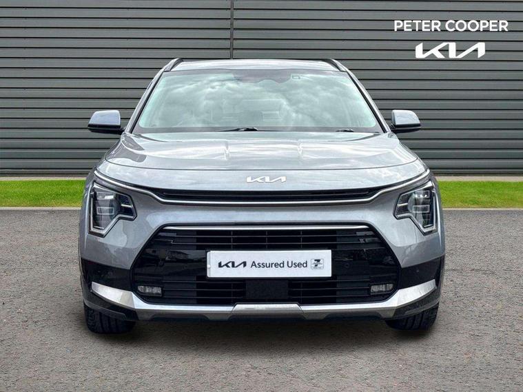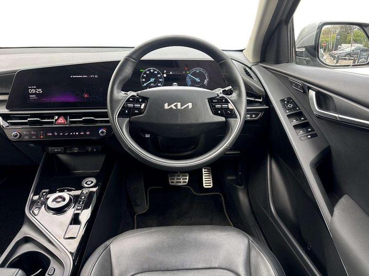 10.25" Supervision colour cluster display, 10.25" touchscreen satellite navigation, Adaptive smart cruise control function (SCC) with stop and go, Apple car play/Android Auto with voice control, Blind spot collision avoidance assist, Drive mode select (Eco, sport), E-call, Emergency stop signalling system, Forward Collision-Avoidance Assist (FCA) 1.5 - City/Pedestrian/Cyclist/Junction turning, Front parking sensors, Head up Display, Highway Driving Assist (HDA), Kia Connect (UVO), Lane Following Assist (LFA), Lane keep assist, Motor driven power steering, Parking collision avoidance assist (PCA), Power opening/closing tailgate, Rear cross traffic alert, Rear parking sensors, Remote smart parking assist, Reversing camera with dynamic guide lines, Safe exit warning (SEW), Speed limit assist, Trip computer with distance/fuel consumption/average speed, Wireless Smartphone charger, 220v AC Inverter, 'Shark fin' mobile antenna, 2 Front USB Charge port (one for C-type/one for USB), 2 type C USB ports on front seats, 6 speakers, Bluetooth with music streaming, DAB Digital radio, Steering wheel mounted controls, Acoustic windshield, All round electric windows with drivers and front passenger auto up/down and safety function, Auto dimming rear view mirror, Automatic defog system, Automatic headlight control system, Black grille with chrome surround, Body colour bumpers, Body colour exterior door handles, Deluxe door scuff plates, Dual LED headlights (low and high projection), Electric heated door mirrors, Electrically folding door mirrors, Front and rear chrome skid plates, Front fog lights, Heated rear window with timer, High gloss black cladding, High gloss black door mirrors, LED daytime running lights, LED rear combination lights, LED third brake light, One touch single tilting/sliding power sunroof, Privacy glass - Rear windows and tailgate, Rain sensing front wipers, Rear fog lights, Rear side wing doors, Rear spoiler, Rear wiper, Roof rails, Solar glass windscreen, Welcome and follow-me home light functionality, Windscreen Washer Level Warning, 12V socket in front, 12V socket in luggage compartment, 3 seat bench in 2nd row, 60:40 split remote folding rear seats, All-round height adjustable headrests, Aluminium pedals, Artificial leather centre console storage box, Artificial leather steering wheel, Centre console cupholder, Chrome coating interior door handles, Driver and front passenger power adjusted seat, Driver power adjusted memory seat, Driver/passenger sunvisors with illuminated vanity mirrors, Drivers seat power lumbar support, Dual zone automatic air conditioning, Front and rear door storage, Heated front seats, Heated outer rear seats, Heated steering wheel, Illuminated glovebox, Interior door lock/unlock function, ISOFIX Child seat top tethers and anchor fixings, LED overhead console, 2nd row and luggage lamp, Luggage area load cover, Luggage board, Paddle shifts, Passenger premium relaxation seat, Power adjustable lumbar support on front passenger seat, Rear armrest, Seatback pocket - driver, Seatback pocket - front passenger, Shift by wire SBW, Single front passenger seat, Tilt/telescopic adjustable steering wheel, Vegan leather upholstery, Ventilated front seats, Ventiliation ducts to rear compartment, Towing pack - Niro, 3 point seatbelts on all seats, ABS, Automatic unlocking of doors in case of impact, Centre side front airbags, Curtain and side airbags, Drivers knee airbag, Dual shell horn, Electric parking brake with auto hold function, Electronic stability control, Front passenger airbag deactivation, Height adjustable front seatbelts, Hill start assist control (HAC), Manual rear child locks, Rear seat alert system, Traction control, Tyre pressure monitoring system, Alarm system and engine immobiliser, Deadlocks, Engine Start/Stop Button with Smart Entry System, Locking wheel nuts, Visible vehicle identification number, Warranty - 7 Years/ 100, 000 miles, Centre fascia chopped carbon, 18" Alloy wheels, Tyre mobility kit,