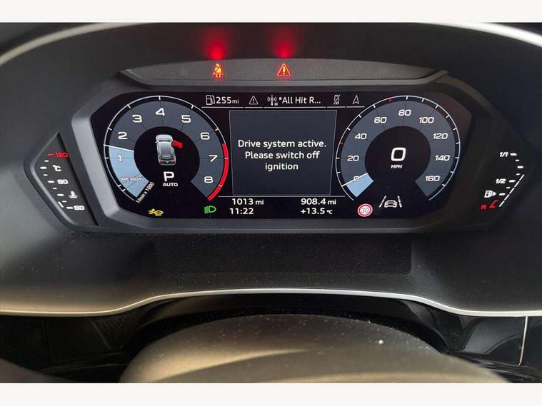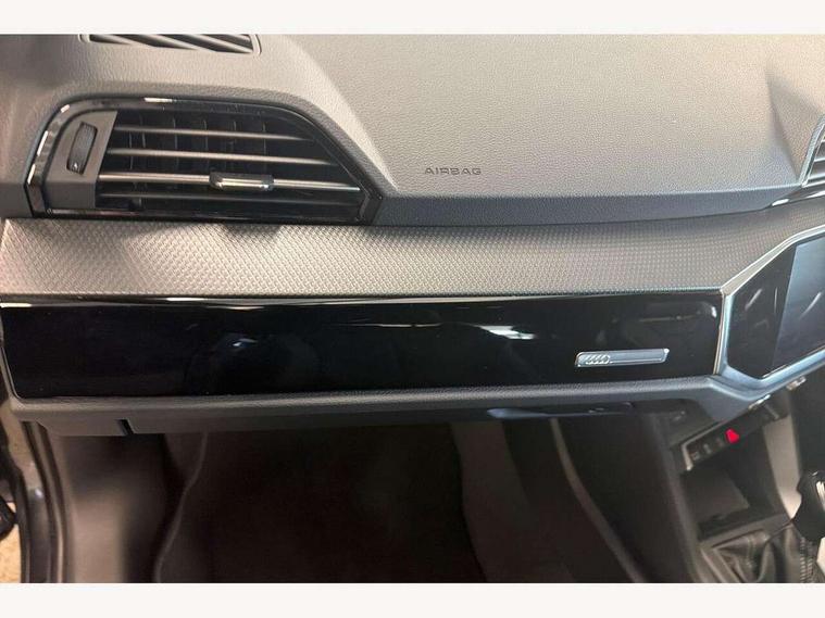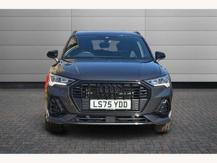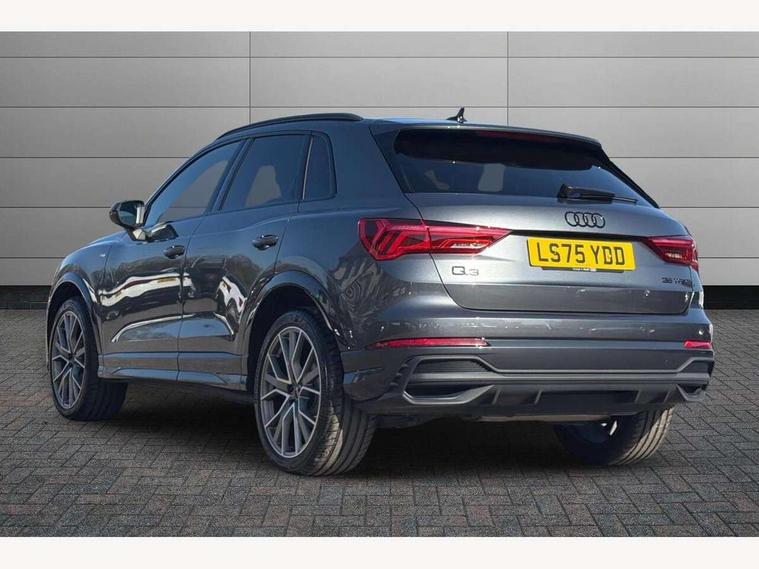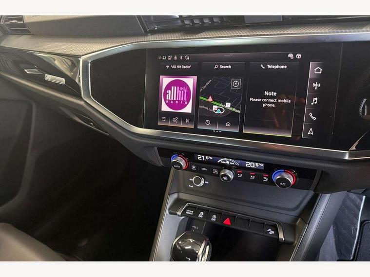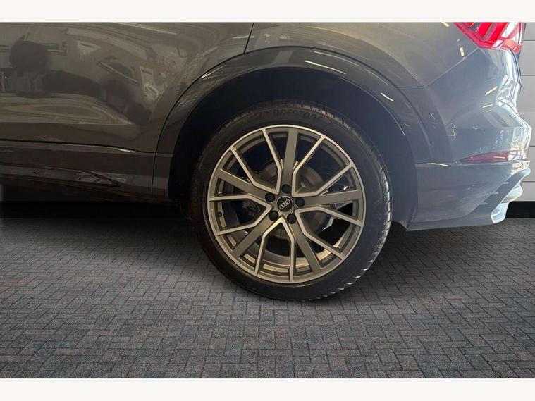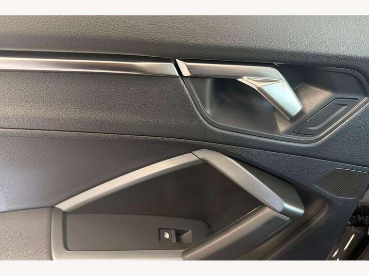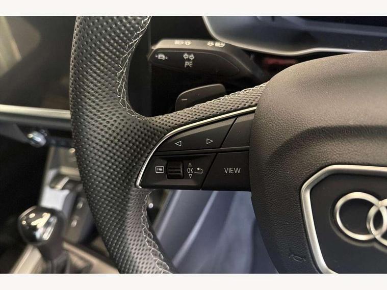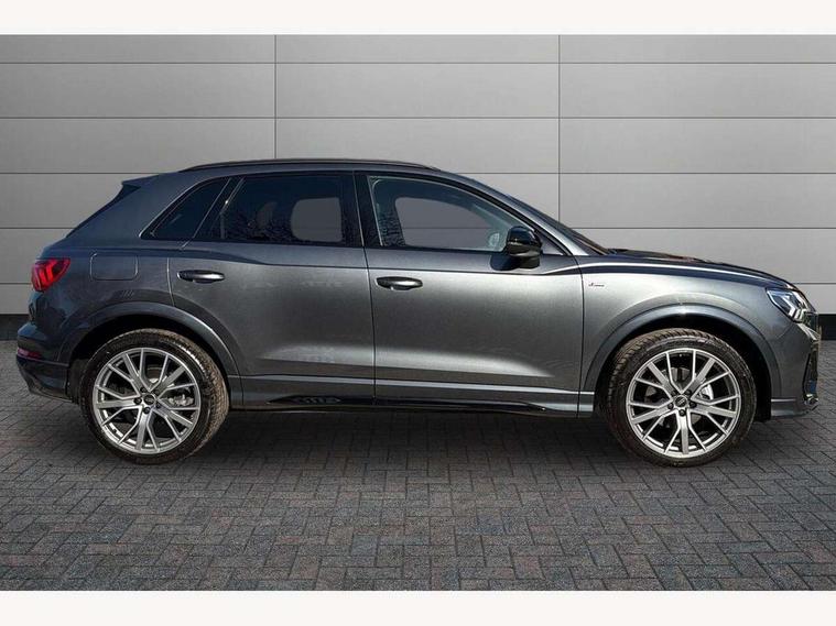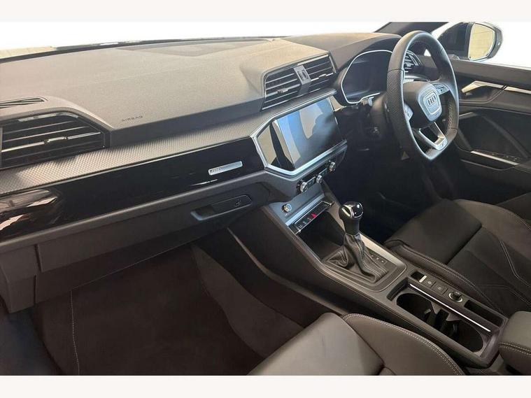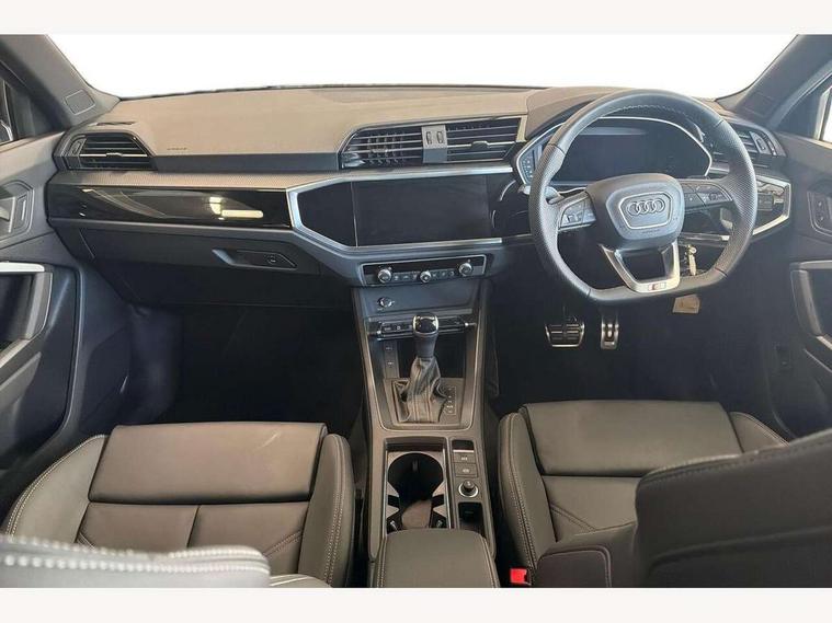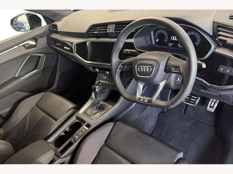 360 degree view camera, Audi connect safety and service, Audi drive select, Audi lane departure warning, Audi Virtual Cockpit - 10.25" display, Bluetooth interface, Camera based traffic sign recognition, Distraction and Fatigue warning, Legal emergency call, MMI Navigation Plus with high resolution 10.1 inch touchscreen colour display, Phonebox light with wireless charging, Power operated tailgate, Progressive steering, Service interval indicator, Smartphone interface includes wireless Apple carplay/Android Auto, Start stop system with recuperation, Voice control system with natural language interaction, Sports suspension, 2 USB-C ports with charge and data functions, DAB digital radio module, SONOS premium sound system, Acoustic windscreen, Audi Beam uses LEDs to project the Audi logo onto the ground as you exit your Q3, Auto dimming door mirrors, Auto dimming frameless rear view mirror, Electrically folding, adjustable and heated door mirrors with integrated LED side indicators and kerb view function for passenger side, Front and rear electric windows, Front fog lights, Front underbody protection in manhattan grey paint finish, High gloss black finish B and C pillars, Honeycomb design radiator grille in matt anthracite black, LED Dynamic rear indicators, LED rear lights, LED third brake light, Matrix LED headlights with LED daytime running lights, Panoramic glass sunroof, Privacy glass dark tinted rear and rear-side windows (from B-pillar backwards), Rain and light sensors, Rear diffuser grille in grained matt black, Rear diffuser strip in matt anthracite black, Rear side wing doors, Rear underbody protection in matt black, Rear wiper, S line front and rear bumpers and side skirts in contrasting Manhattan grey paint finish, Variable front intermittent wipers, 12V socket in rear centre console, 3 seat bench in 2nd row, 40:20:40 folding with manual adjustment for 60:40 forwards/backwards position and backrest angle, Adjustable rear seat bench/backrest with centre armrest and cupholder, Black carpet mats, Black cloth headlining, Dual zone electronic climate control, Electric lumbar support, Electrically adjustable front seats, Front and rear black floor mats with contrast stitching in rock grey, Front and rear headrests, Front centre armrest, Heated front seats, Height and reach adjustable steering wheel, Illuminated door sill trims with S logo, ISOFIX child seat mounting for front passenger with airbag deactivation and outer rear seat including top tether attachment point for outer rear seats, Luggage compartment sill protection in stainless steel, Perforated leather gearknob, Single front passenger seat, Stainless steel pedals, Twin leather upholstery with front sport seats + S embossing, Black styling pack - Q3, Non smoking pack - Q3, 3x3 point rear seatbelts, 6 airbags - Driver, front passenger, curtain and side windows, Audi pre-sense front with pedestrain and cyclist recognition, Electrically operated child locks on rear doors, Electromechanical parking brake, Electronic stabilisation control including ABS, ASR and EDL, Front seatbelt reminder, Hill descent control, Hill hold assist, Pre sense basic, Seatbelt monitoring, Tyre pressure warning, Warning triangle and first aid kit, Advanced key, Anti theft wheel bolts, Immobiliser, Remote central locking, Thatcham approved category 1 anti theft alarm, Aluminium look interior elements, Detail dashboard around MMI touch colour display in glass look, black with surround in aluminium look, Leatherette door armrest, Piano black inlay,