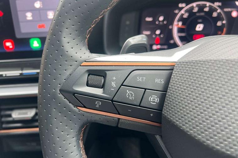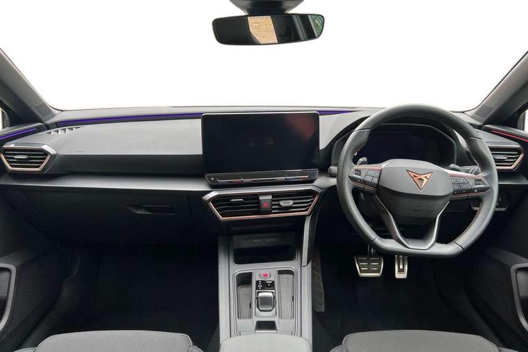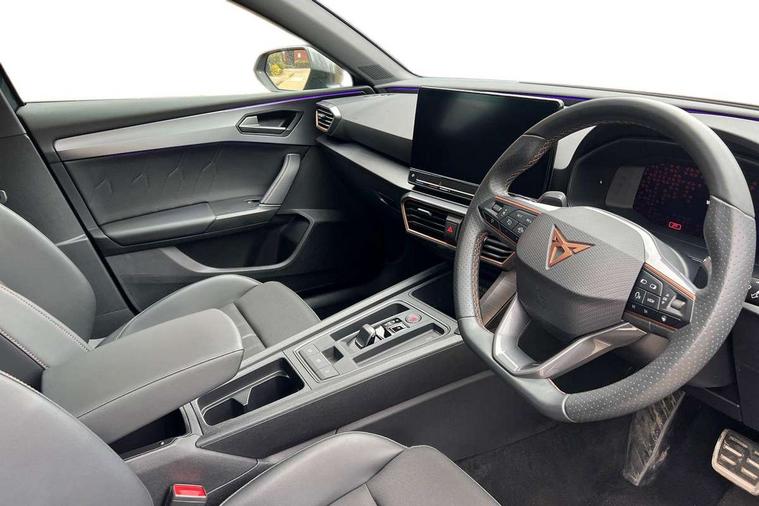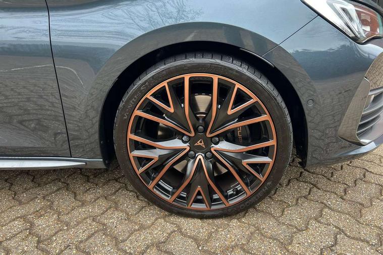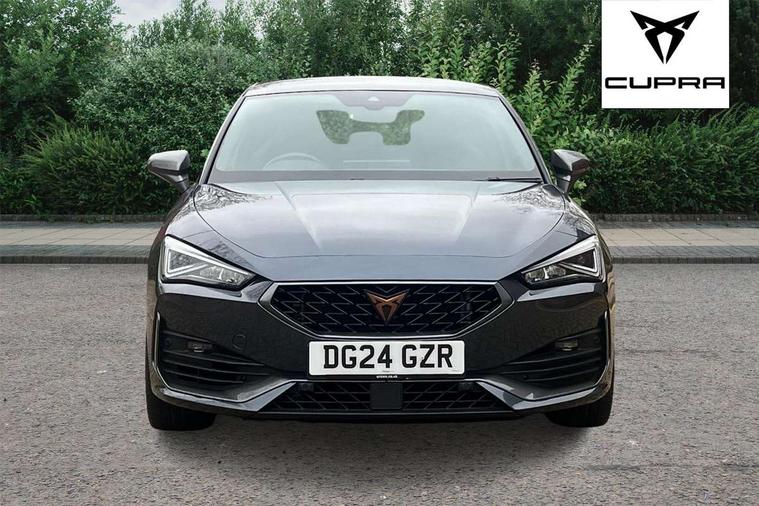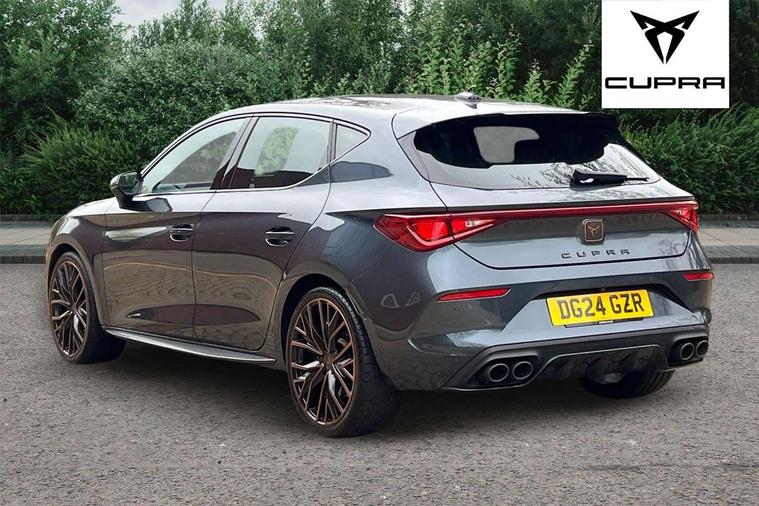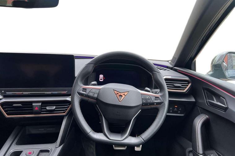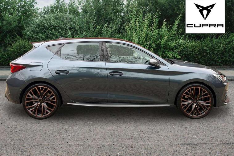 CUPRA drive profile selection with 4 modes (Comfort/Cupra/Sport/Individual), throttle response and gearshift mode, Digital cockpit, E-call, Front assist with forward collision warning braking reaction to vehicles, pedestrians and cyclists, Full link smartphone integration with Mirror Link, wireless Apple CarPlay and wired Google Android Auto, Lane assist, Lockable tailgate, Park assist (inc front/rear parking sensors), Rear view camera, RPM, trip computer, outside temp gauge, instrument light brightness, low fuel warning light, lights on reminder, gearshift indicator, Service interval indicator, Start/stop system with regenerative braking, Wireless phone charger, Standard suspension, XDS electronic differential lock and dynamic traction support, Auxiliary input socket, Auto dimming rear view mirror, Body colour door handles, Body coloured bumpers, Cupra sports bumpers, Dark tinted rear windows, Electric front/rear windows, Electrically adjustable, heated and folding door mirrors, LED front fog lamps with cornering function, LED headlights with dynamic turn signals, tail lights, rear fog lights with rear coast to coast lighting, Panoramic sunroof, Rain sensing wipers, Rear diffuser with splitter and oval quad exhaust pipes, Rear side wing doors, Rear wash/wipe, Separate daytime running light with automatic headlight control and coming home feature, Third brake light, 12v power supply in centre console, 3 seat bench in 2nd row, 5 headrests, 60/40 split rear bench seat with armrest, Ambient lighting (glovebox, footwell, ambient lighting multicoloured), Black headlining, CUPRA Leather flat bottomed, heated, perforated steering and gearshift paddles, Cupra sports pedals, Driver/passenger manual seat height adjustment, Dust/pollen filter, Folding boot cover, Four x USB Type C ports (2 in front and 2 in rear), Front and rear reading lights X 4, Front centre armrest, Front seats manual lumbar adjustment, Height/reach adjust steering wheel, Illuminated interior front door sills, Interior wraparound lighting, ISOFIX points in outer rear seats with top tether anchorage points, Jack and tool kit, Luggage tie-down hooks, PVC/Cloth upholstery with copper stitching + Cupra embossed logo on headrest, Single front passenger seat, Sports bucket seats, Storage pockets on rear of front seats, Sunvisors with illuminated mirror, Three zone climate control, Design pack - Cupra Leon, Dynamic and comfort pack - Leon Cupra, Media system plus with navigation pack - Leon Cupra, 3 point seatbelts on all rear seats, ABS, Brake control system - ESC and brake booster, Child proof door locks, Cupra black brake calipers, Driver and front passenger airbags with front passenger airbag de-activation, front side and curtain airbags, Electronic parking brake, Extended safety system - seat belt tensioner, window closure and hazard lights, Hill hold control, Rear disc brakes, Seat belt reminder for front and rear seats, Tiredness recognition system, Tyre pressure monitoring system, Anti theft alarm system with interior monitoring in cab, backup horn and towing protection, KESSY Advanced - Keyless start, keyless entry, Locking wheel bolts, Chrome and copper interior detailing, 19" Performance satin black and copper alloy wheels with 91Y tyres, Space saver spare wheel,