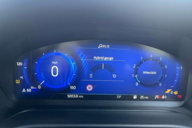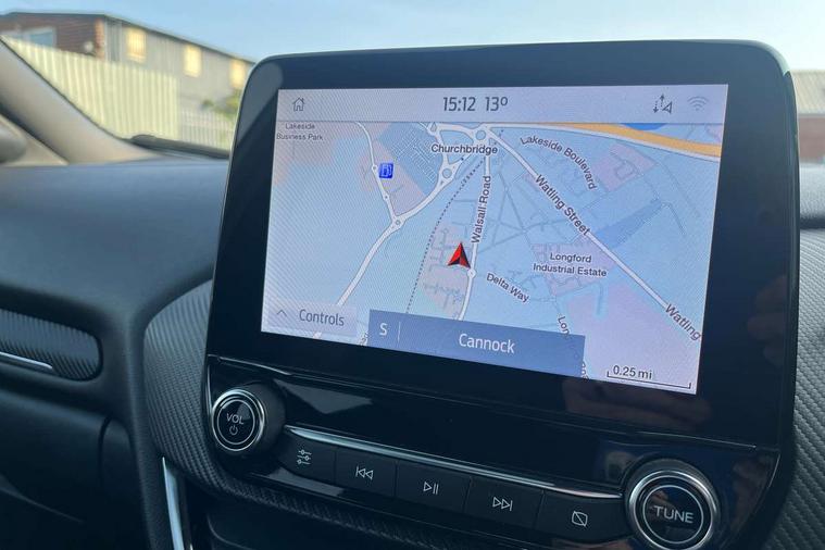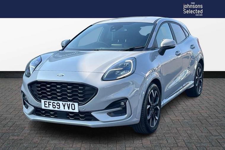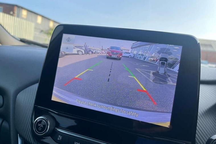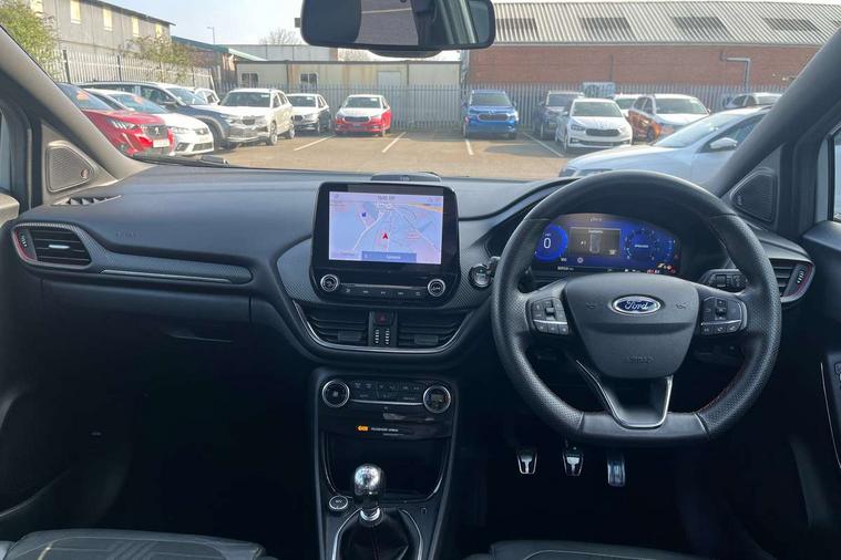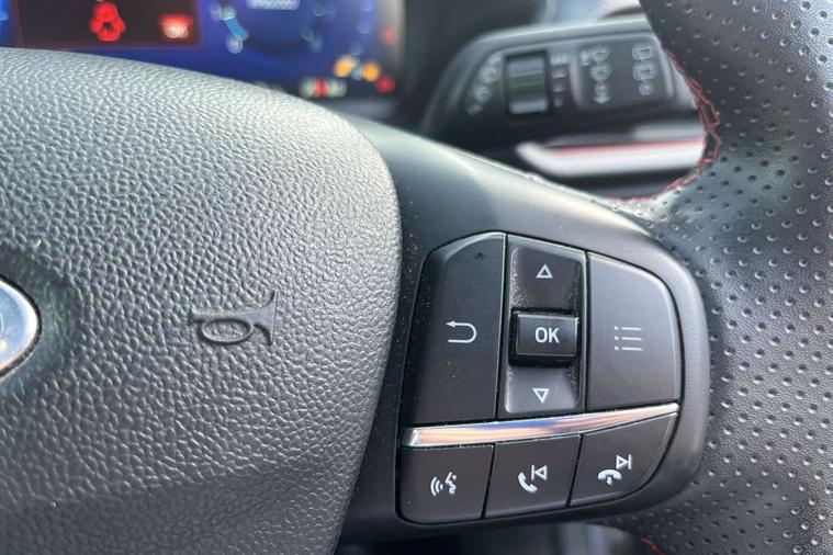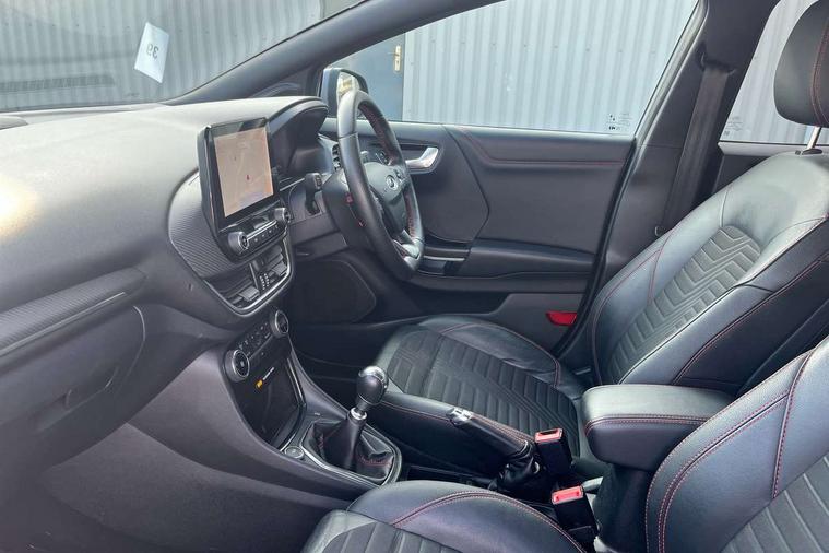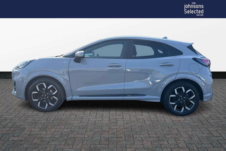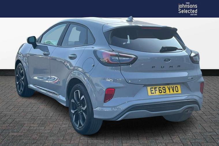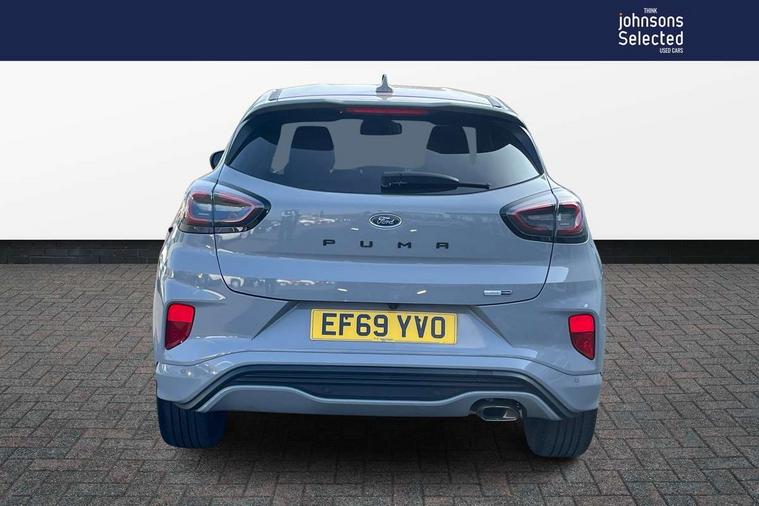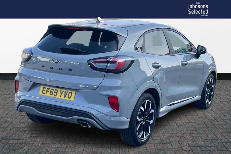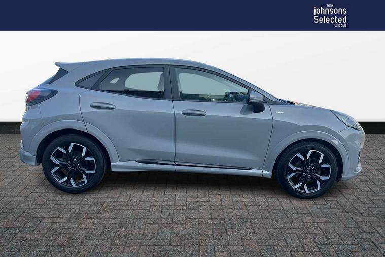 Ford easy fuel, Full digital 12.3" instrument cluster, Lane keeping aid with lane departure warning, Power liftgate hands free including keyless start + entry, motion sensing key fob, Rear parking sensor, Selectable drive modes(Normal, Eco, Sport, Slippery and Trail), Wireless charging pad, Automatic headlights with rain sensing wipers and auto high beam, Fixed LED headlamps, Front fog lights with cornering lights and LED rear lamps, Power foldable heated door mirrors with puddle lamps, Privacy glass to side rear windows and tailgate glass, Quickclear heated windscreen, ST-Line body kit with large rear spoiler wth sports suspension, Alloy sports pedals, Casual partial leather upholstery with salerno bolster, Centre console with armrest and stowage, Driver and passenger seat lumbar and height adjust, EATC - Electronic Auto Temperature control, Ford megabox extended bootspace, Front and rear floor mats, ST-Line flat bottomed leather steering wheel with leather handbrake and aluminium gear knob, B&O Premium Audio system + Ford SYNC 3 navigation pack - Puma, Driver assistance pack - Puma, 3 rear seatbelts, Electronic stability control (ESC) and hill start assist, Pre-collision assist with autonomous emergency braking, pedestrian/cyclist detection & post-collision braking, Tyre pressure monitoring system (TPMS), Thatcham alarm, Carbon look interior deco spears, 18" 5 spoke matt black machined finish alloy wheels, Tyre inflation kit,