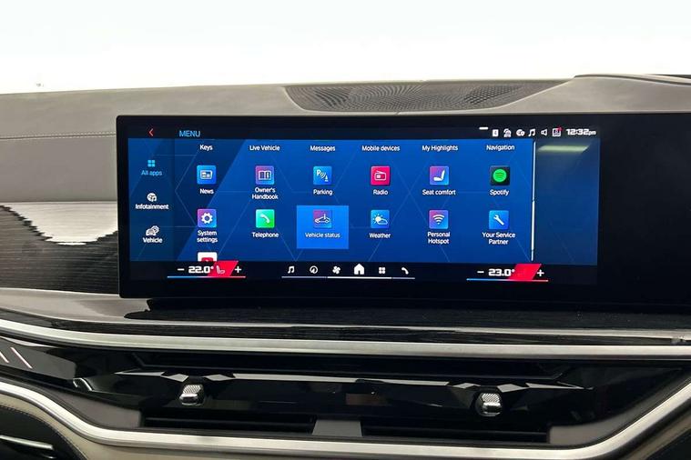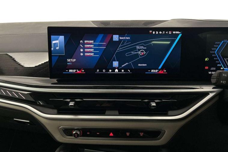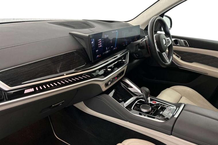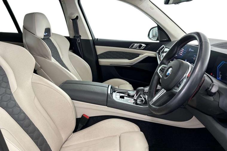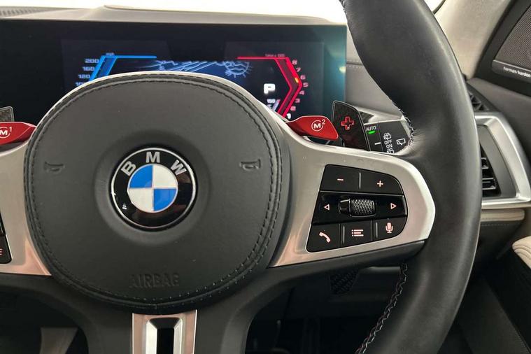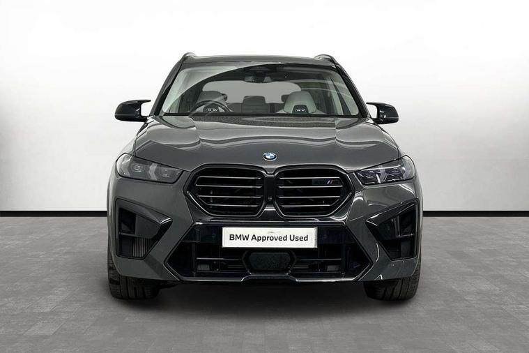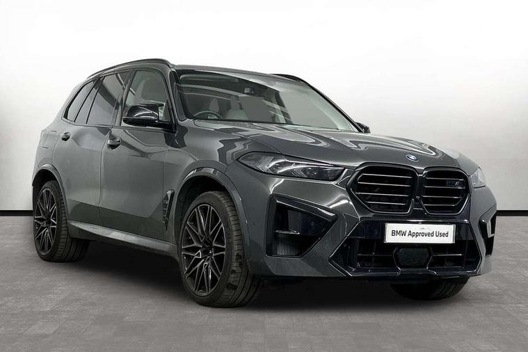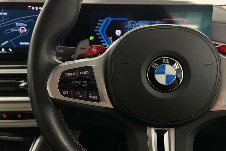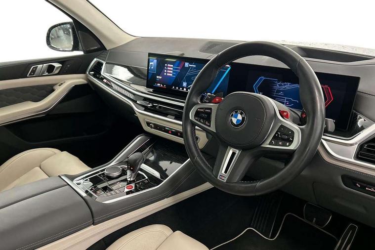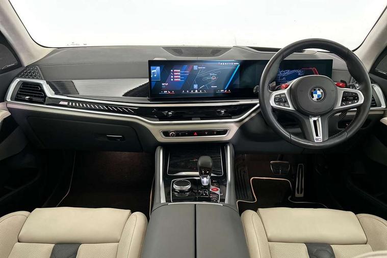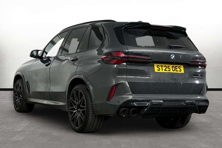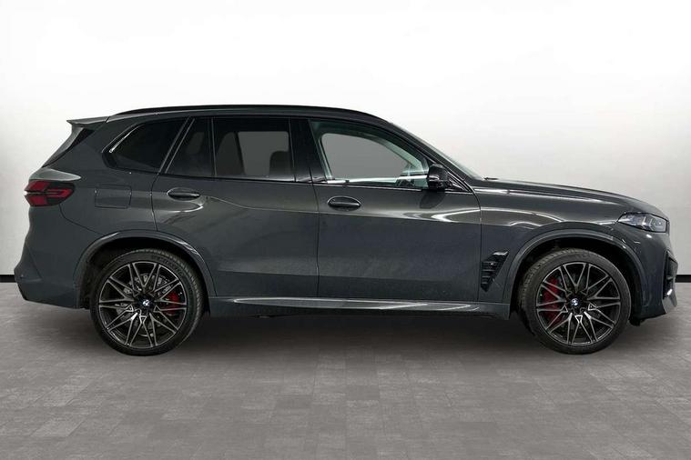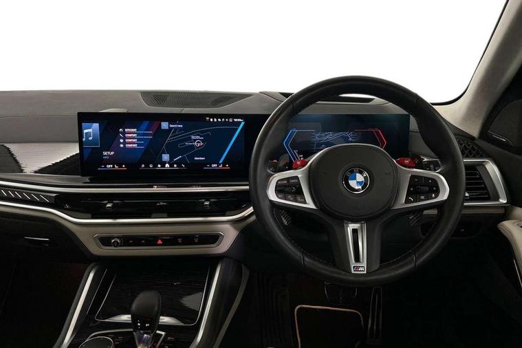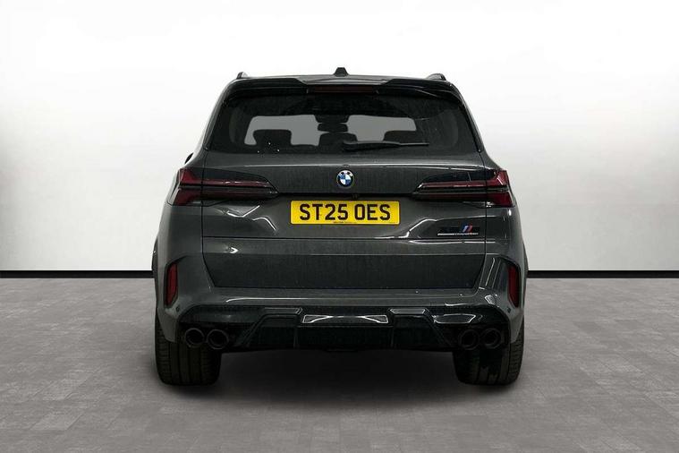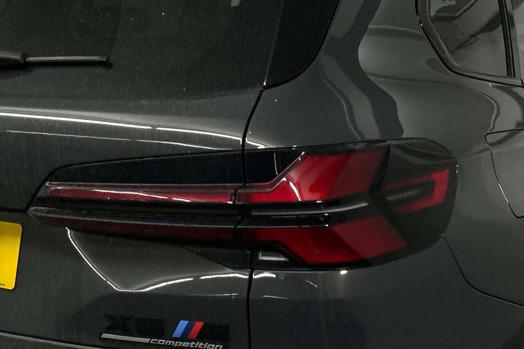 32GB hard disc drive (HDD) memory, Attentiveness assist, Automatic tailgate with seperately opening top hinged section, BMW ConnectedDrive online services, BMW Drive recorder, BMW gesture control, BMW legal emergency call, BMW Live Cockpit Pro with Head up display including 12.3" instrument display and 14.9" high resolution control display with navigation function, BMW Recovery system, BMW Teleservices, Brake force display, Brake pad wear indicator warning light, Condition based service - BMW service history, electronic service booklet, integrated owner's handbook, Electric power steering, Enhanced bluetooth hands free facility with Telephony wireless charging, Front/rear park distance control (PDC), iDrive controller with shortcut buttons, Infinity symbol with line graphic on reset of average consumption, Language version English, M drive buttons, M servotronic, Oil sensor for level and grade, On board computer inc. average speed, fuel consumption, liquid crystal Info display, journey computer, outside temperature display, personal profile, Recovery braking system, Run flat indicator, Service interval indicator, Stop/start button, Storage for wireless charging, Wi-Fi hotspot, 8 speed automatic with steptronic transmission including launch control and gearshift paddles on the steering wheel, Active M differential, BMW M TwinPowerTurbo 8 cylinder petrol engine, Double VANOS, High precision injection, M Adaptive suspension pro, M Sport differential, M xDrive system, Petrol Particulate Filter, Safety battery terminal clamp, Turbocharger with Valvetronic, BMW Personal eSim, DAB Tuner enables digital radio reception, Favourite buttons, USB connection, USB type A 1.5A in cupholder, USB Type C 3A in centre armrest, Adaptive LED Headlights, Automatically dimming rear view mirror, BMW Individual high gloss shadow line exterior trim, BMW Individual high gloss shadow line with extended contents, BMW individual lights shadow line, Body color M rear spoiler, Body colour bumpers, Body colour door handles, Body colour roof spoiler, Brake lights illuminate under normal braking, Door locking - after driving off to secure vehicle, Dynamic brake lights with LED technology, Exterior mirror base in black matt, Follow me home headlight function, Front and rear bumper system, Front and rear door sill strips, Front and rear electric windows with open and close fingertip control, anti trap facility and comfort closing, Heated windscreen washer jets, High beam assistant, High gloss black shadow line roof rails, Integrated direction indicators, LED daytime running lights, LED fog lights, LED Rear light with tail light, brake light and turn indicators, LED Reflectors, left and right, integrated in tailgate, M Sport exhaust system, M strake element with model designation, integrated in the Air Breather, M-specific Exterior mirrors, Rain sensor with automatic headlight activation and windscreen wiper control, Rear side wing doors, Rear wiper, Roller shutter, Sun protection glazing, Third brake light in rear spoiler, Trailer stabilisation logic, Under severe vehicle deceleration, Variable intermittent rear wash/wipe, Welcome light carpet, X5 M competition badging on tailgate high gloss black right finished, 12V - Power sockets with 2x centre console and 1x luggage compartment, 3 rear headrests, 3 seat bench in 2nd row, 4 Lashing eyes in boot, 4 zone control automatic air conditioning, 40:20:40 split folding rear seats, BMW ID, Child seat ISOFIX attachment with rear outer seats includes top tether, Compartment in front of cupholder, Driver + front passenger lumbar support, Electric adjustment of the upper section of the backrest with Illuminated M logo on the head restraint, Electrical steering column with adjustable height and length with activation and control on the steering column, Front and rear cupholders x 2, Front and rear door pockets, Front and rear side armrest integrated into door trim, Front footwell lights, Front reading lights, Gear selector lever and operation, Left and right bag hooks in luggage compartment, Light inside glove compartment, Lockable glove compartment, Luggage compartment floor panel with integral storage tray, Luggage compartment lighting, Luggage net, Lumbar support with height and depth adjustment in backrest, M Electric front sport seats with memory function, M sport leather steering wheel, M steering wheel with gearshift paddle switches made of CFC, Multifunction controls for leather steering wheel, Multifunctional hooks, Seat back with flap pocket, Securing rings in luggage compartment, Single front passenger seat, Storage bins on all doors, Storage space underneath the floor insert in luggage compartment, Storage tray and compartment with cover in centre console, Sunvisors with illuminated vanity mirrors, Toolkit located in luggage compartment, Vanity mirror lights, Velour floormats, Ambient light interior pack - X5 M/ X6M, Connected Package Professional - X5 M, Driving Assistant Professional Pack - X5 M, Expanded exterior mirror pack - X5 M/X6 M, Parking Assistant Professional Pack - X5M&X6M, Airbags - driver/front passenger, rear and side, first and second row seats head airbags, front passenger seat airbag deactivation + knee airbag, Anti-lock braking system (ABS), Automatic Stability Control (ASC), Black M sports seatbelts with coloured M seam for all seats, Brake drying, Brake energy regeneration, Brake fade compensation, Braking pre-tensioning, Child proof locking system in rear door, Cornering brake control (CBC), Crash sensor activating central locking release, hazard warning lights, fuel cut off, interior lighting + activation of safety battery terminal clamp, Deformation zones - front and rear with door reinforcements and bumpers up to 2.5 mph, DSC - Dynamic Stability Control, Dynamic brake control, Dynamic Traction Control - DTC, Electromechanical parking brake with automatic drive away release and auto hold function, Electronic brake force distribution, Front and rear 