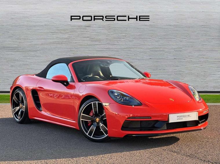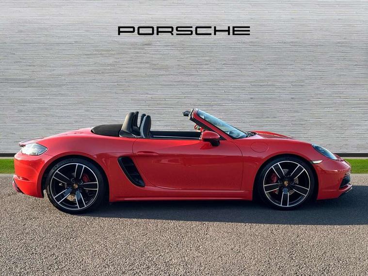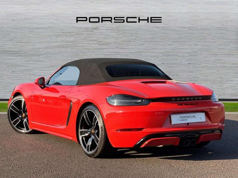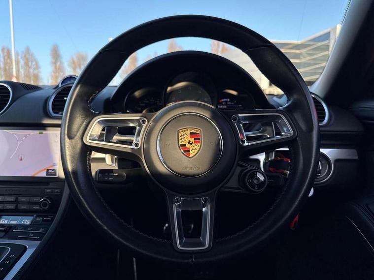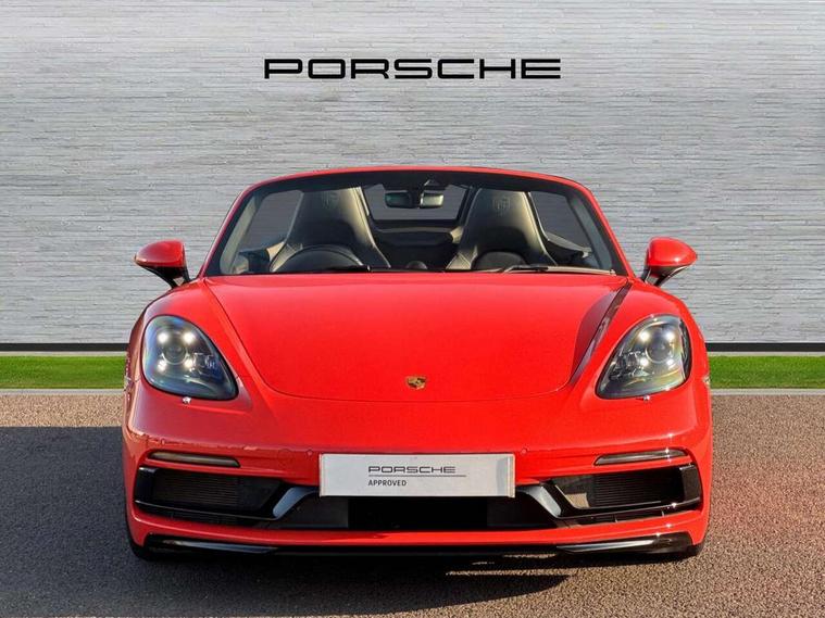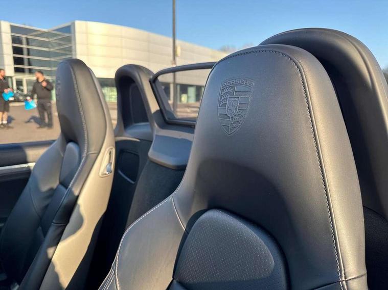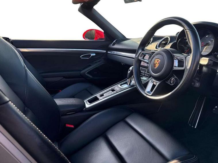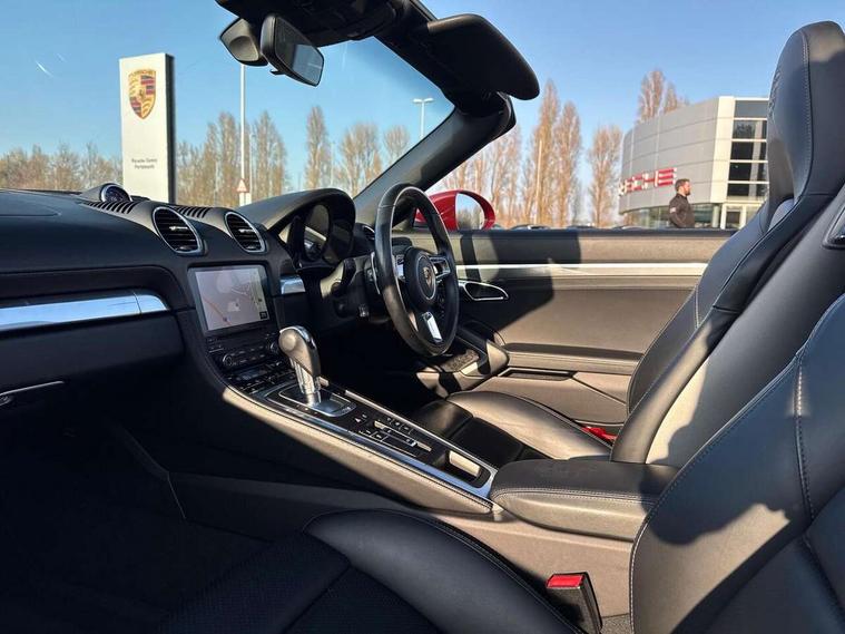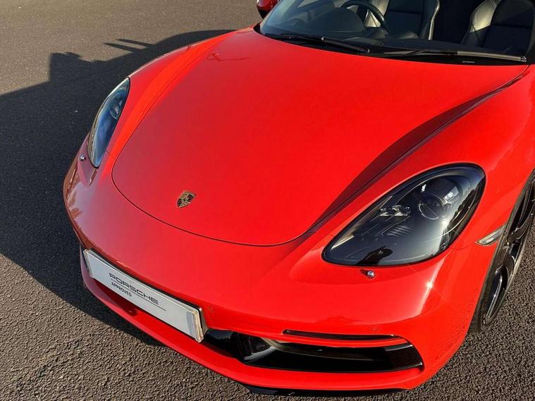 Auto start and stop system, Digital displays for vehicle speed, chosen gear, odometer, trip odometer and clock, Instrument cluster with central rev counter and high-resolution 4.6 inch colour display, Porsche Communication Management (PCM) including online navigation module, mobile phone preparation, audio interfaces and voice control system, 3-way catalytic converters and on-board diagnostics for monitoring emission control system and coated particulate filter, 4 valves per cylinder, 64 litre fuel tank, Aluminium block and cylinder heads, Direct fuel injection (DFI), Gasoline particulate filter, Integrated dry-sump lubrication with an on-demand oil pump, Porsche Doppelkupplung (PDK), Porsche Stability Management (PSM) with ABS, advanced brake functions, Rear wheel drive, Turbocharger with variable turbine geometry (VTG) and intercooler, Two seater vehicle with mid mounted engine, VarioCam Plus variable valve timing and switchable valve lift, Water cooled with thermal management, DAB Digital radio, Integrated 4G/LTE compatible SIM including data for the Porsche Connect Services, Integrated compatible SIM including Porsche Connect Services, Navigation incl porsche + Apple Carplay, connect module, wireless internet access, carfinder, remote vehicle status, remote service and vehicle track, Wifi and music streaming, Automatic headlight activation including welcome home lighting, Automatically extending rear spoiler, Body colour bumpers, Body colour door handles, Electrically adjustable heated exterior mirrors on door waist rails, aspherical on driver's side, Fully automatic fabric hood, electrically operated/heatable rigid glass rear screen, operable approx 31 mph and convenient operation by key remote, Green tinted heat insulating glass, Grey top tinted windscreen, Heated rear windscreen, Intelligent lightweight body in Aluminium/Steel composite construction, Net wind deflector, Power windows with one touch operation and door seal protection, Separate auxiliary lights in the front end with LED indicators and position lights, Twin tract sports exhaust system with central twin tailpipe in stainless steel, Windscreen washer system with two wiper speeds and washer jets, 12V sockets in passenger footwell and centre console storage compartment, 718 logo on gear lever, Additional smooth finish leather with door panel armrest and centre console main storage compartment, Adjustable fan with air recirculation and defroster functions, Ascending centre console with uncovered storage compartment and closed storage compartment, Clothes hooks on front seat backrests, Footwell illumination, Front and rear luggage compartments, Front headrests, Heated seats, Hood lining in black fabric, LED reading lights, orientation, ignition lock, additionally luggage compartment and glove compartment lighting, Lockable glovebox, Seat centres in race tex, side bolsters and headrests in leather, Smooth finish leather on steering wheel rim, gear lever and door handles, SPORT button to activate dynamic driving settings for engine, transmission (with PDK), Storage compartments in each doors, Two individual cup holders (Passenger side, integrated into dashboard trim strip), 3 point automatic seatbelts, ASR, Electrically controlled parking brake, Front and rear lightweight spring strut axle, Front seatbelt pretensioners + load limiters, Full size driver and passenger airbags, Passenger airbag deactivate switch, Porsche side impact protection doors with thorax airbag in outer backrest side bolster and head airbag for driver/passenger in door panel, Tyre pressure monitoring system, Alarm system with interior surveillance, Anti-theft wheel bolts, Engine immobiliser with in key transponder, central locking and remote control,